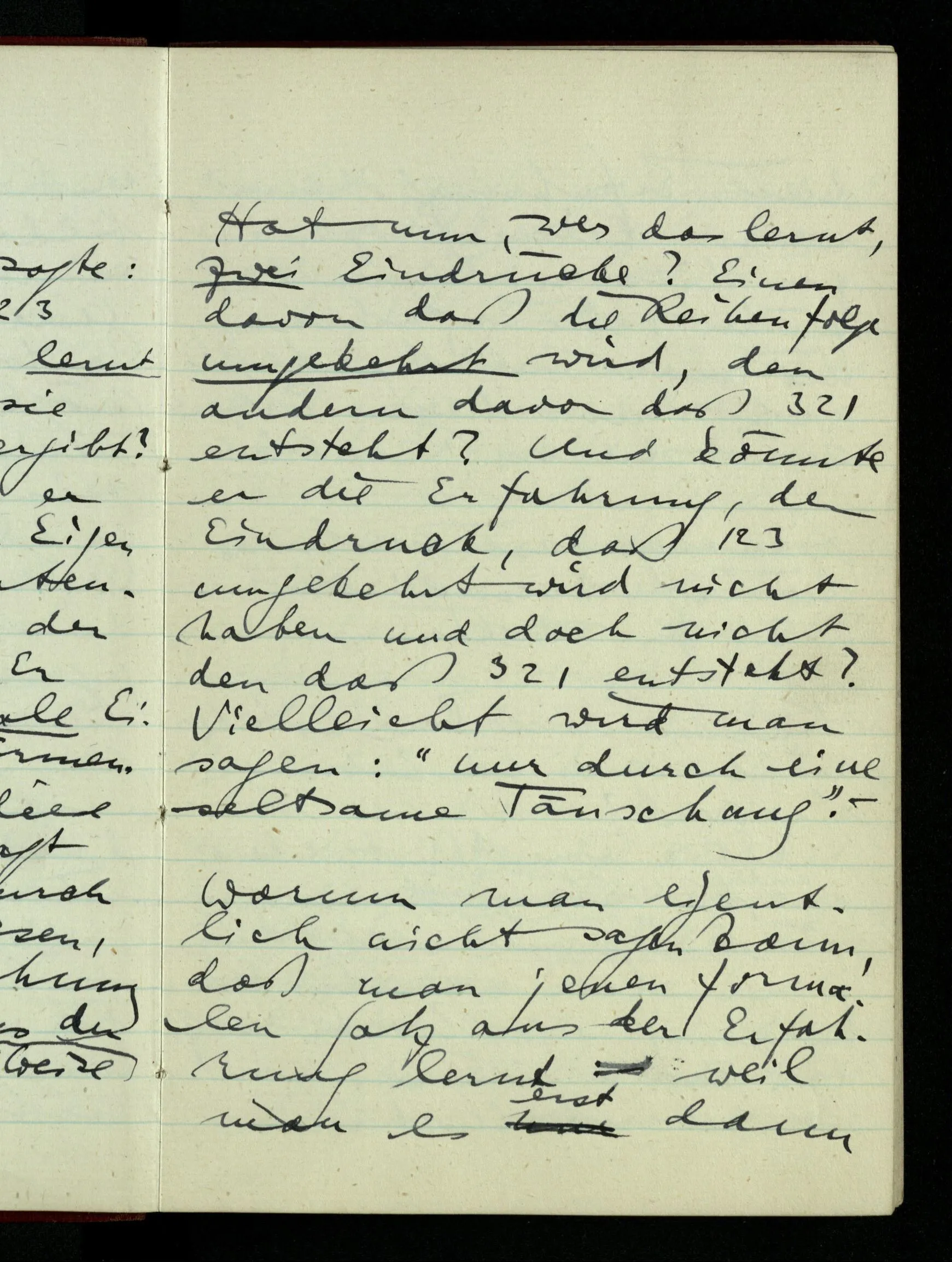 Hat nun, wer das lernt, zwei Eindrücke? Einen davon daß die Reihenfolge umgekehrt wird, den andern davon daß 3 2 1 entsteht? Und könnte er die Erfahrung, den Eindruck, daß 1 2 3 umgekehrt wird nicht haben und doch nicht den daß 3 2 1 entsteht? Vielleicht wird man sagen: “nur durch eine seltsame Täuschung”. –