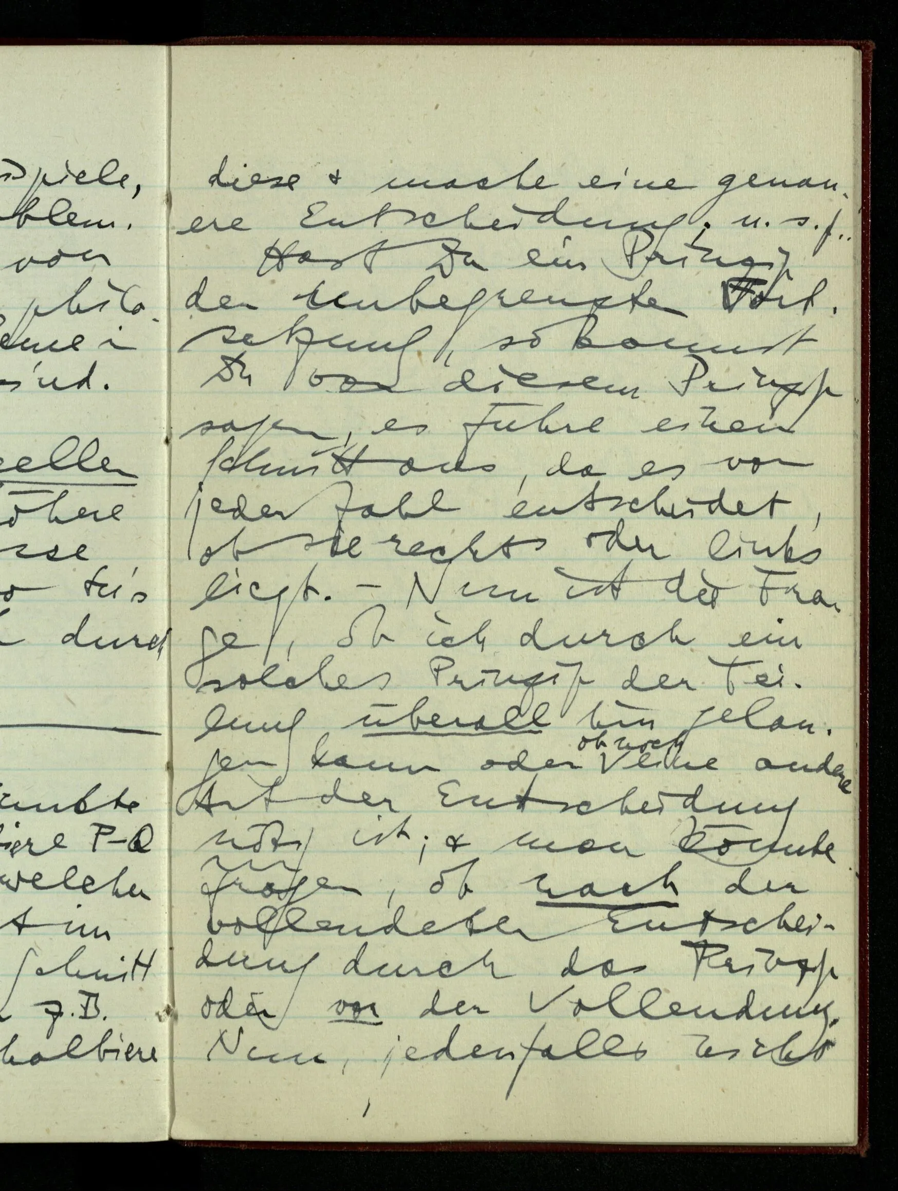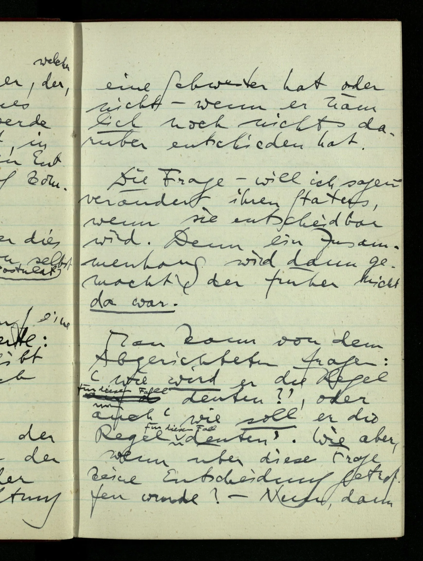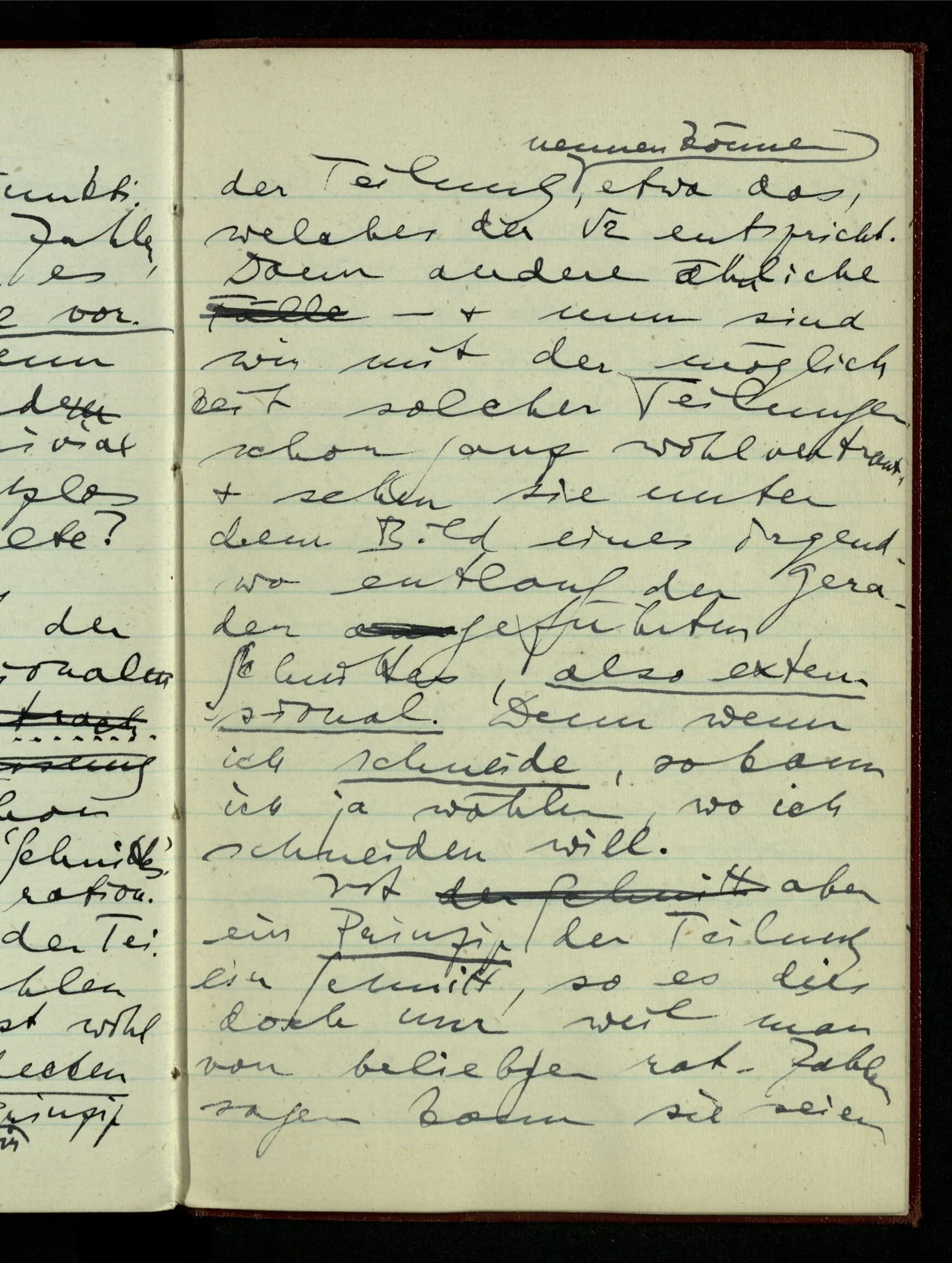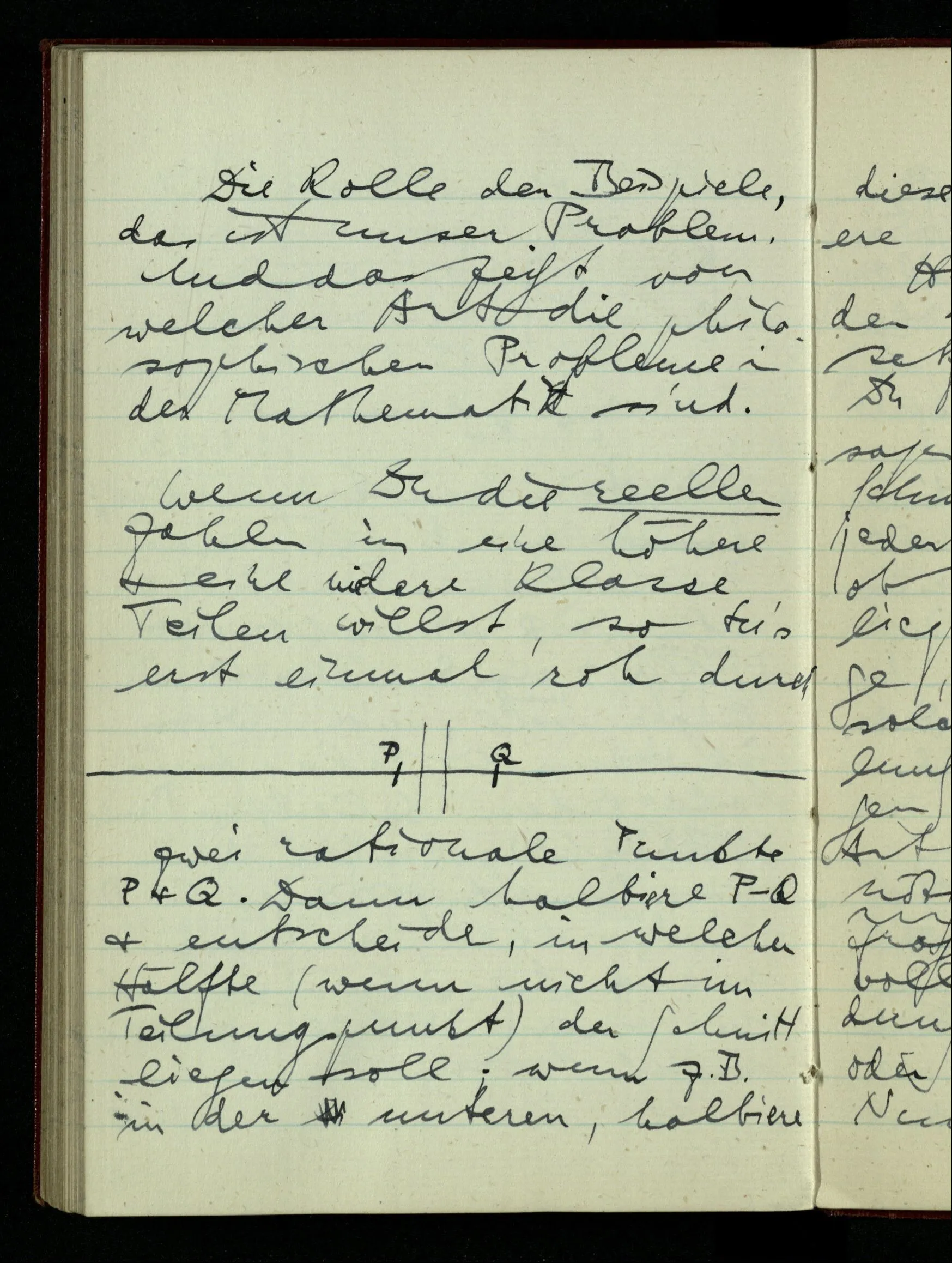 zwei rationale Punkte P & Q. Dann halbiere P – Q & entscheide, in welcher Hälfte (wenn nicht im Teilungspunkt) der Schnitt liegen soll; wenn z.B. in der unteren, halbiere diese & mache eine genauere Entscheidung; u.s.f.. Hast Du ein Prinzip der unbegrenzten Fortsetzung, so kannst Du von diesem Prinzip sagen, es führe einen Schnitt aus, da es von jeder Zahl entscheidet, ob sie rechts oder links liegt. – Nun ist die Frage, ob ich durch ein solches Prinzip der Teilung überall hin gelangen kann oder ob noch eine andere Art der Entscheidung nötig ist; & man könnte fragen, ob nach der vollendeten Entscheidung durch das Prinzip oder vor der Vollendung. Nun, jedenfalls nicht vor der Vollendung; denn solange noch die Frage ist in welchem endlichen Stück der Geraden der Punkt liegen soll, kann die weitere Teilung entscheiden. – Aber nach der Entscheidung durch ein Prinzip ist noch Raum für eine weitere Entscheidung?