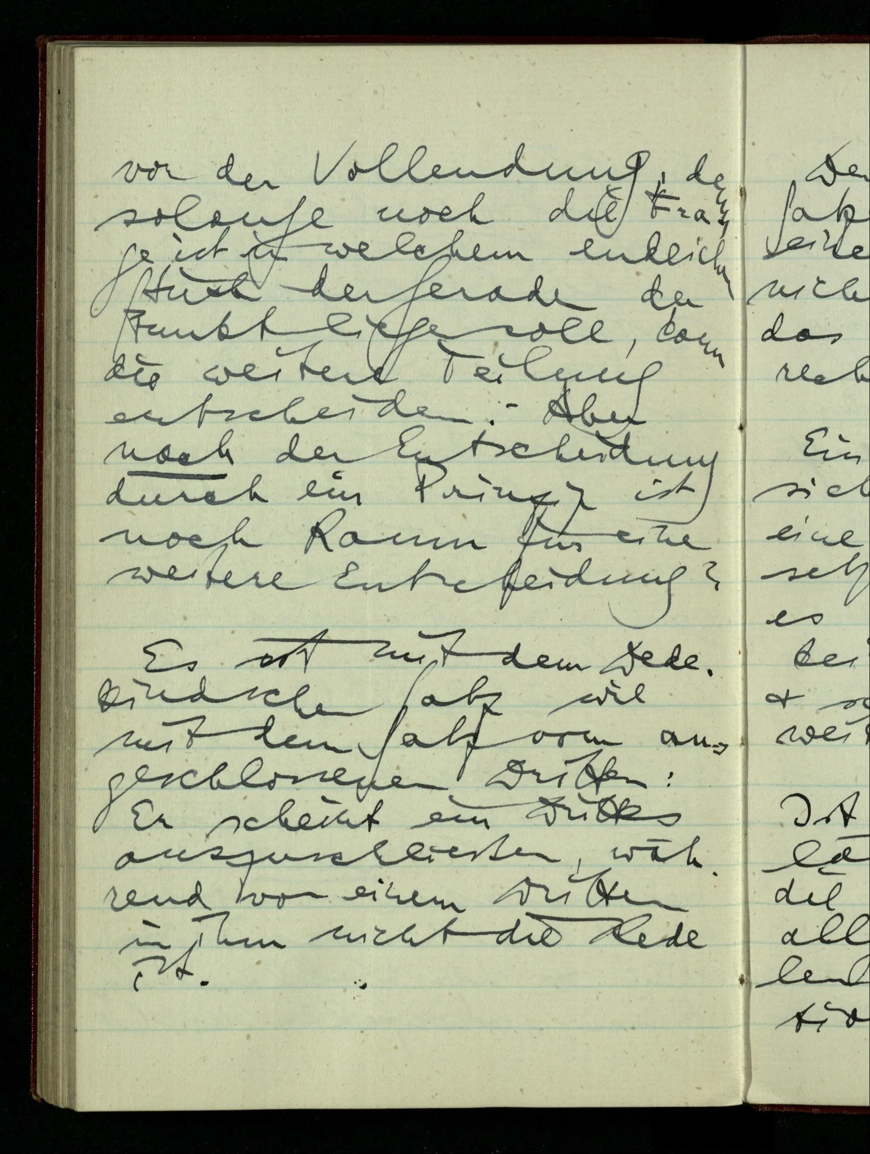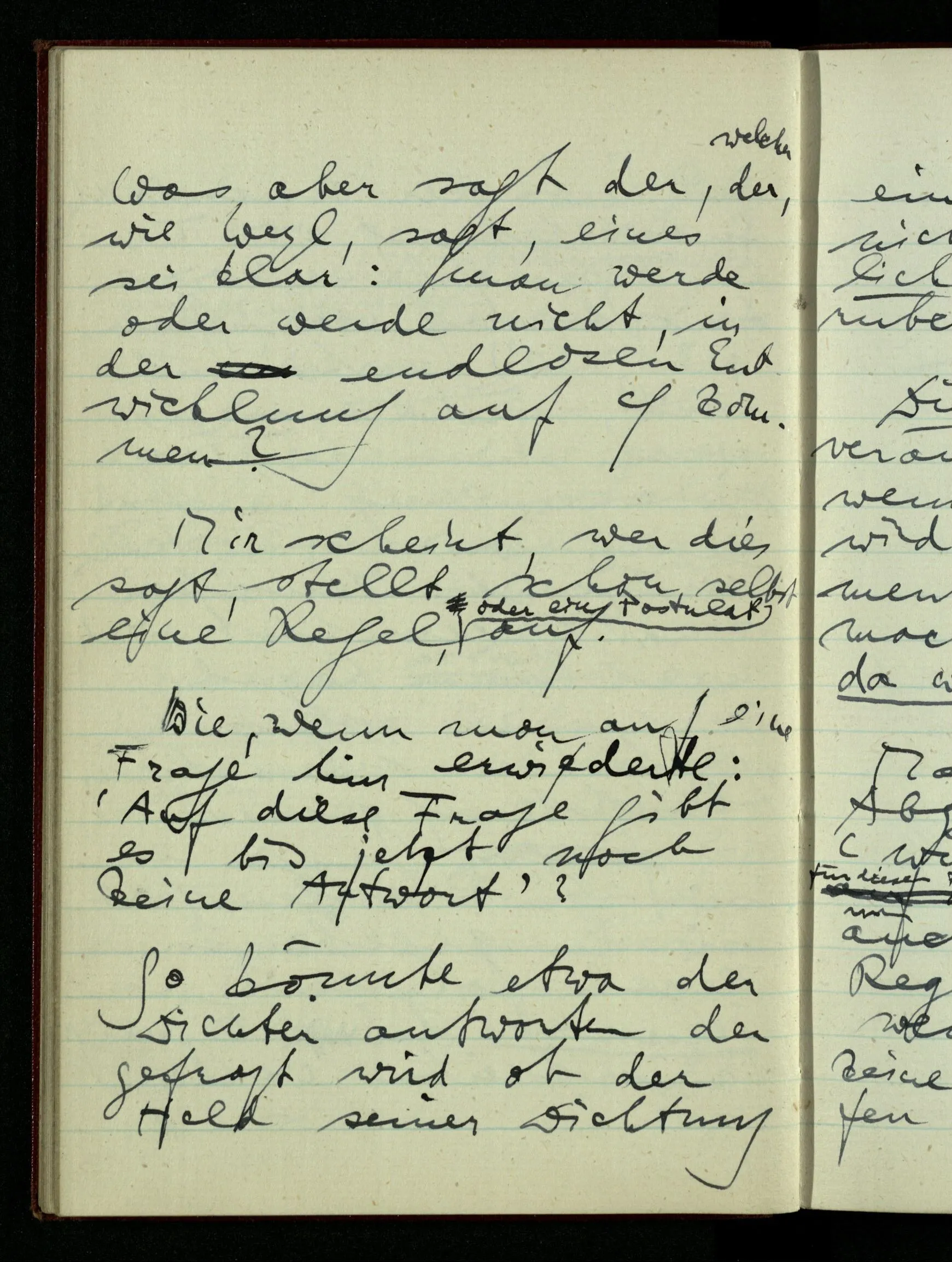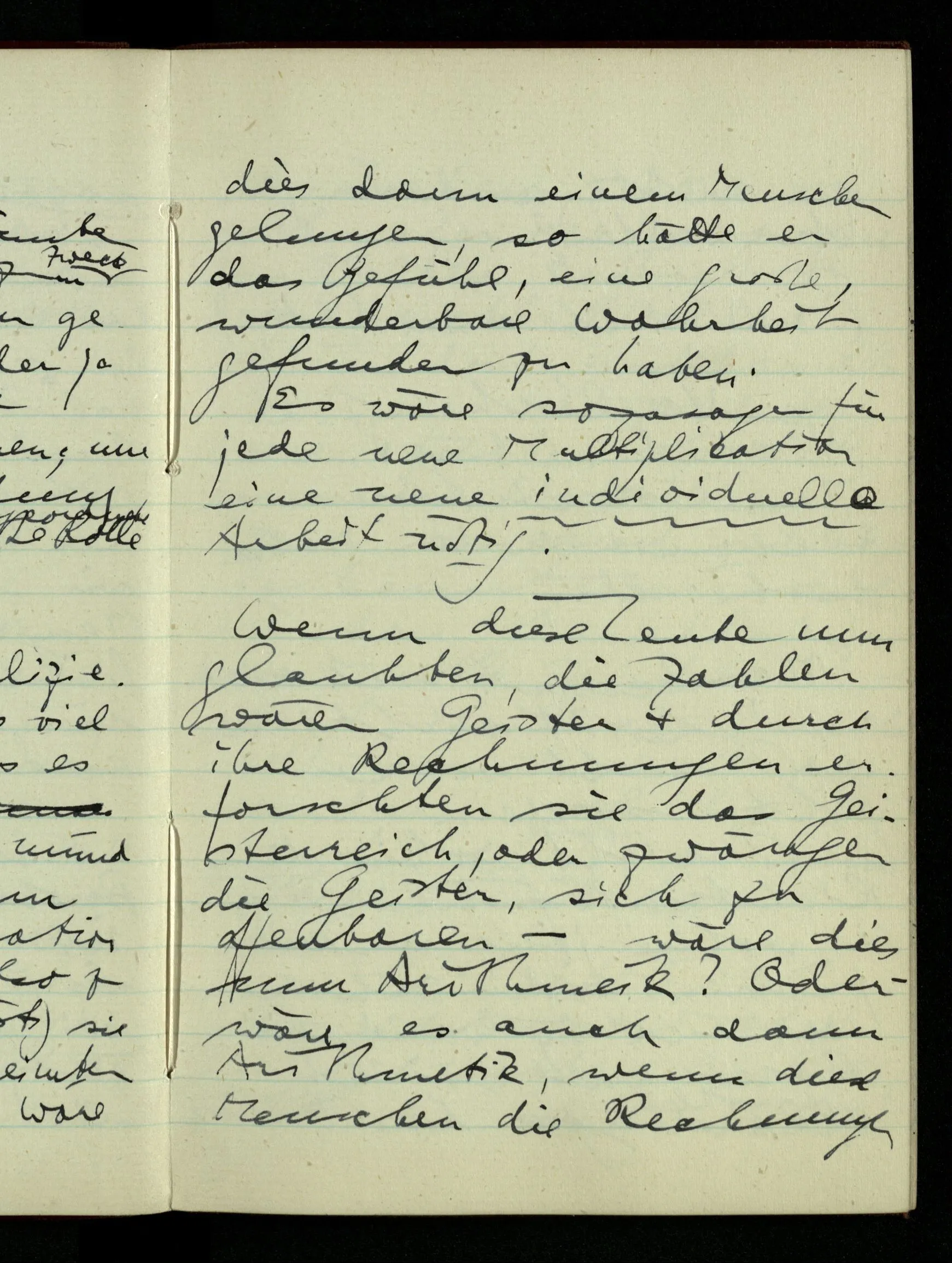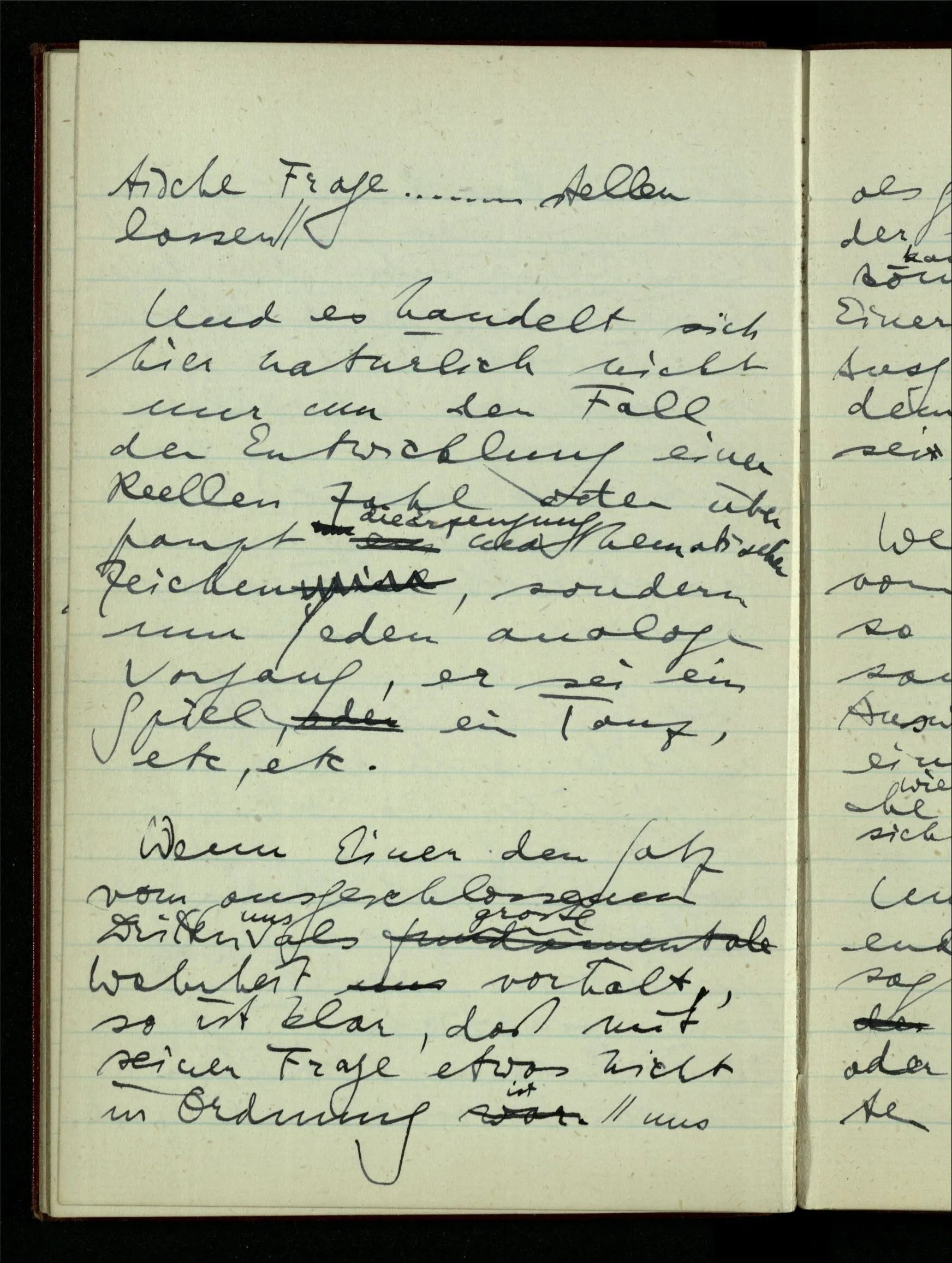 zwei rationale Punkte P & Q. Dann halbiere P – Q & entscheide, in welcher Hälfte (wenn nicht im Teilungspunkt) der Schnitt liegen soll; wenn z.B. in der unteren, halbiere diese & mache eine genauere Entscheidung; u.s.f.. Hast Du ein Prinzip der unbegrenzten Fortsetzung, so kannst Du von diesem Prinzip sagen, es führe einen Schnitt aus, da es von jeder Zahl entscheidet, ob sie rechts oder links liegt. – Nun ist die Frage, ob ich durch ein solches Prinzip der Teilung überall hin gelangen kann oder ob noch eine andere Art der Entscheidung nötig ist; & man könnte fragen, ob nach der vollendeten Entscheidung durch das Prinzip oder vor der Vollendung. Nun, jedenfalls nicht vor der Vollendung; denn solange noch die Frage ist in welchem endlichen Stück der Geraden der Punkt liegen soll, kann die weitere Teilung entscheiden. – Aber nach der Entscheidung durch ein Prinzip ist noch Raum für eine weitere Entscheidung?