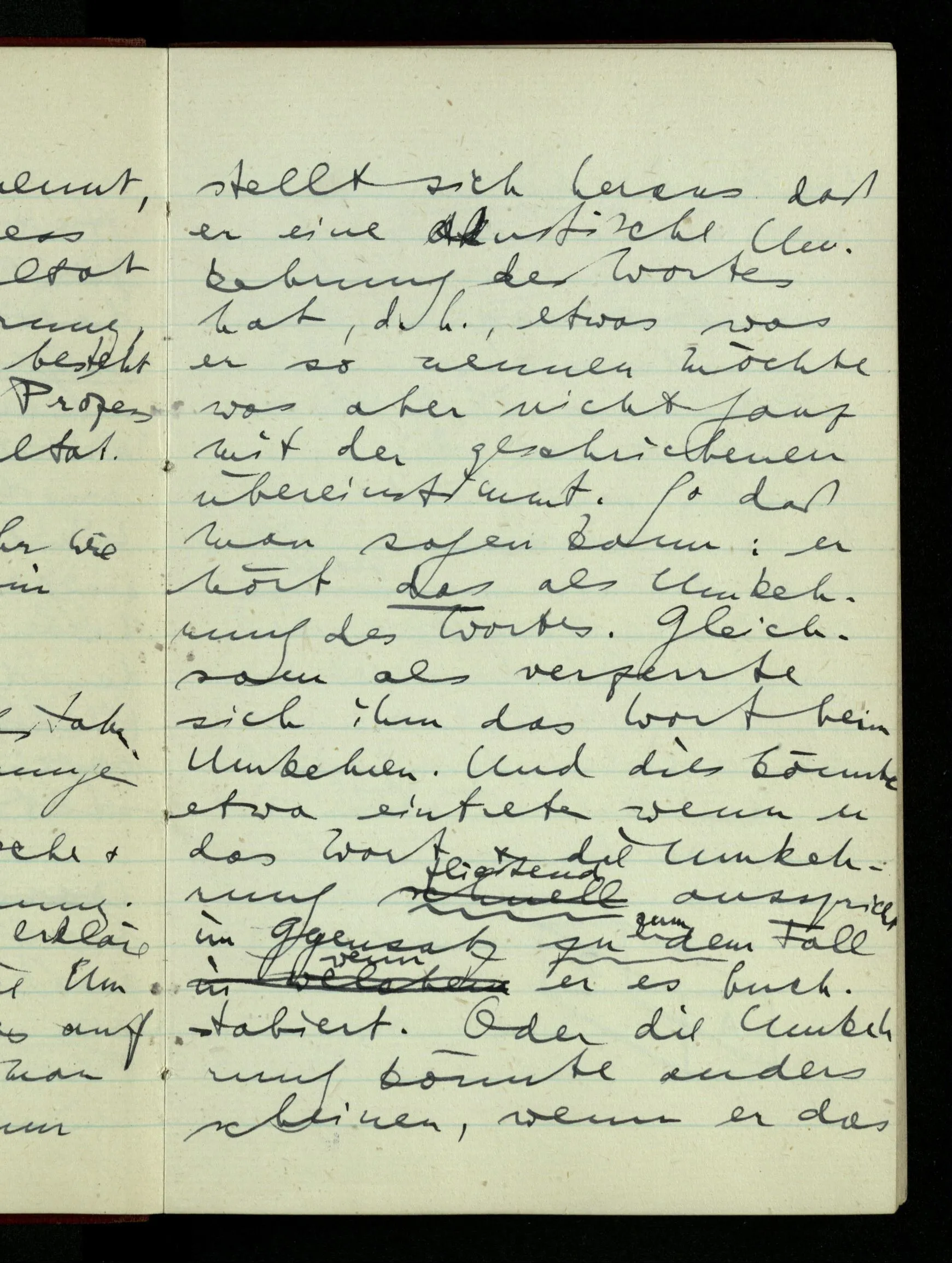 Kann eine Buchstabenreihe zwei Umkehrungen haben? Etwa eine akustische & eine andere optische Umkehrung. Angenommen ich erkläre jemandem was die Umkehrung eines Wortes auf dem Papier ist, was man so nennt. Und nun stellt sich heraus daß er eine akustische Umkehrung des Wortes hat, d.h., etwas was er so nennen möchte was aber nicht ganz mit der geschriebenen Buchstabenreihe übereinstimmt. So daß man sagen kann: er hört das als Umkehrung des Wortes. Gleichsam als verzerrte sich ihm das Wort beim Umkehren. Und dies könnte etwa eintreten wenn er das Wort & die Umkehrung fließend ausspricht im Gegensatz zu dem Fall wenn er es buchstabiert. Oder die Umkehrung könnte anders scheinen, wenn er das Wort in einem Zuge vor- & rückwärts spricht.