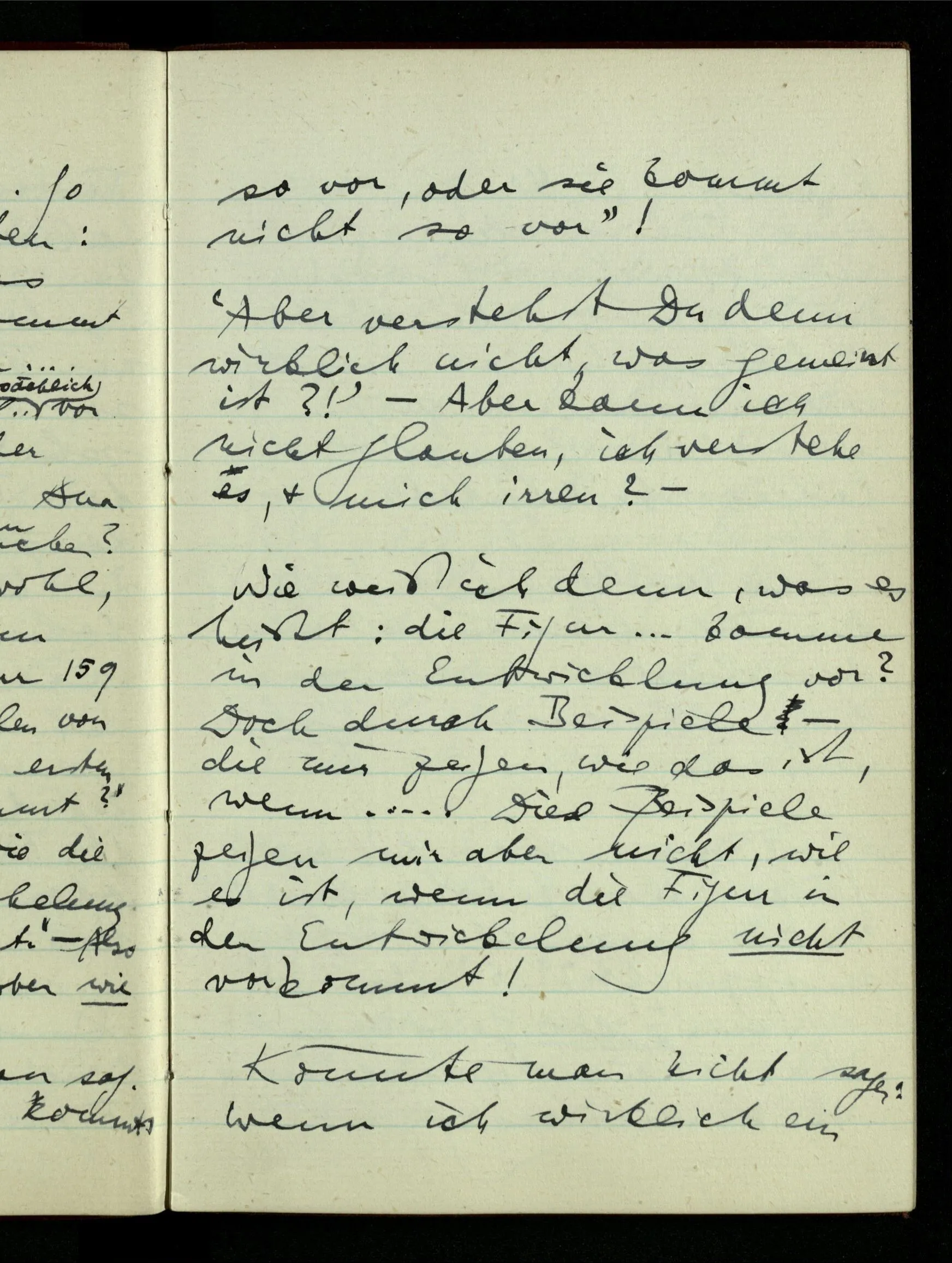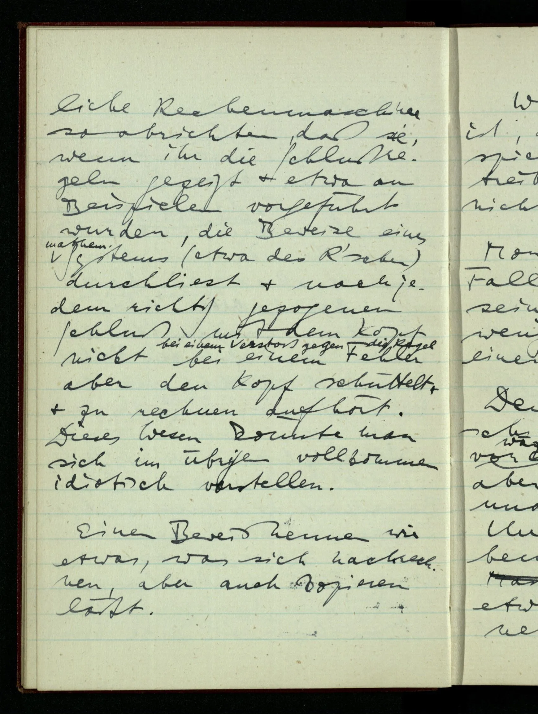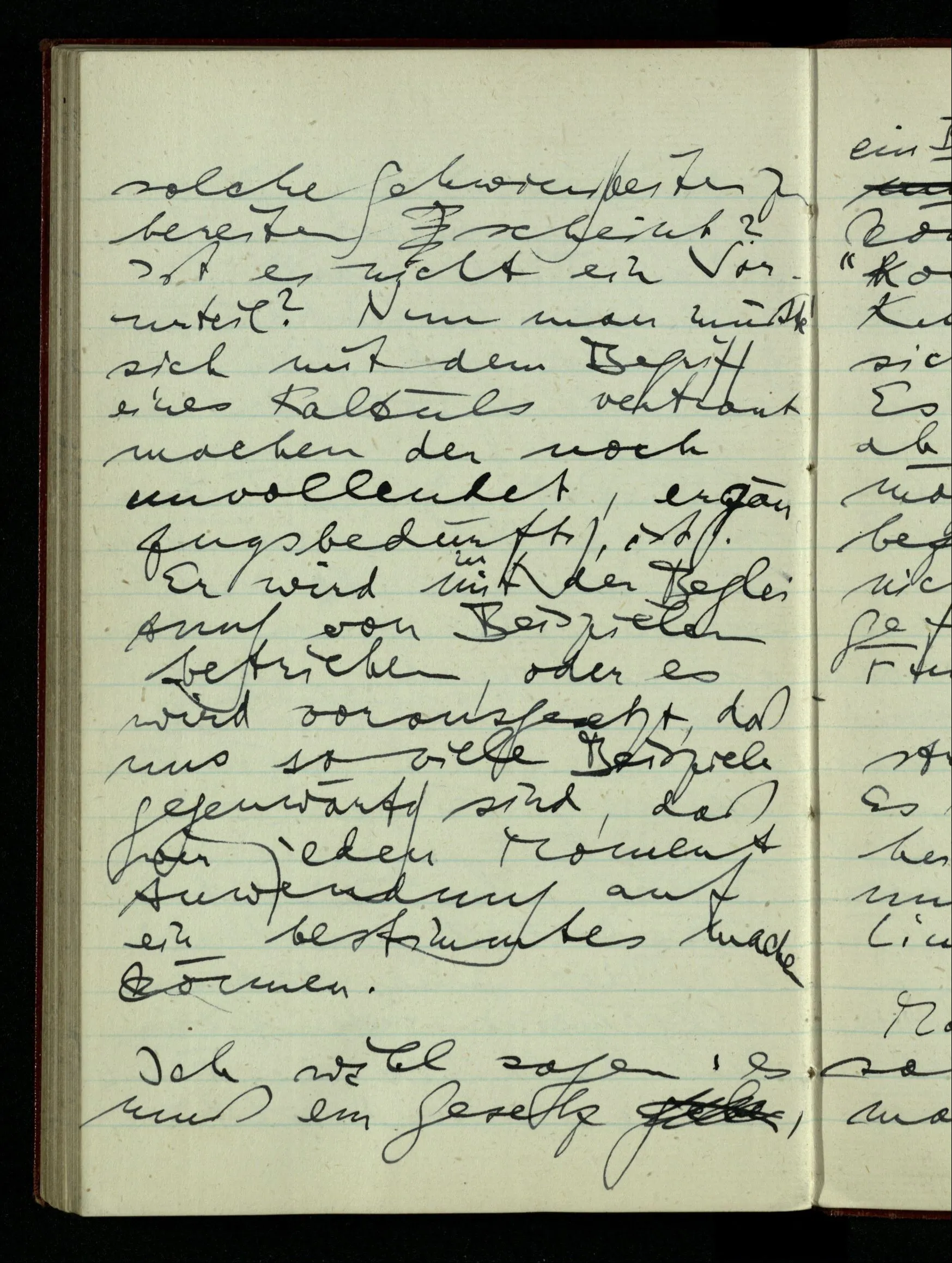 Ist es aber nicht lächerlich, daß mir die Idee eines allgemeinen intentionalen Kalküls der Funktionen & Konstruktionen solche Schwierigkeiten zu bereiten scheint? Ist es nicht ein Vorurteil? Nun man müßte sich mit dem Begriff eines Kalküls vertraut machen der noch unvollendet, ergänzungsbedürftig, ist. Er wird mit der Begleitung von Beispielen betrieben, oder es wird vorausgesetzt, daß uns so viele Beispiele gegenwärtig sind, daß wir jeden Moment Anwendung auf ein bestimmtes machen können.