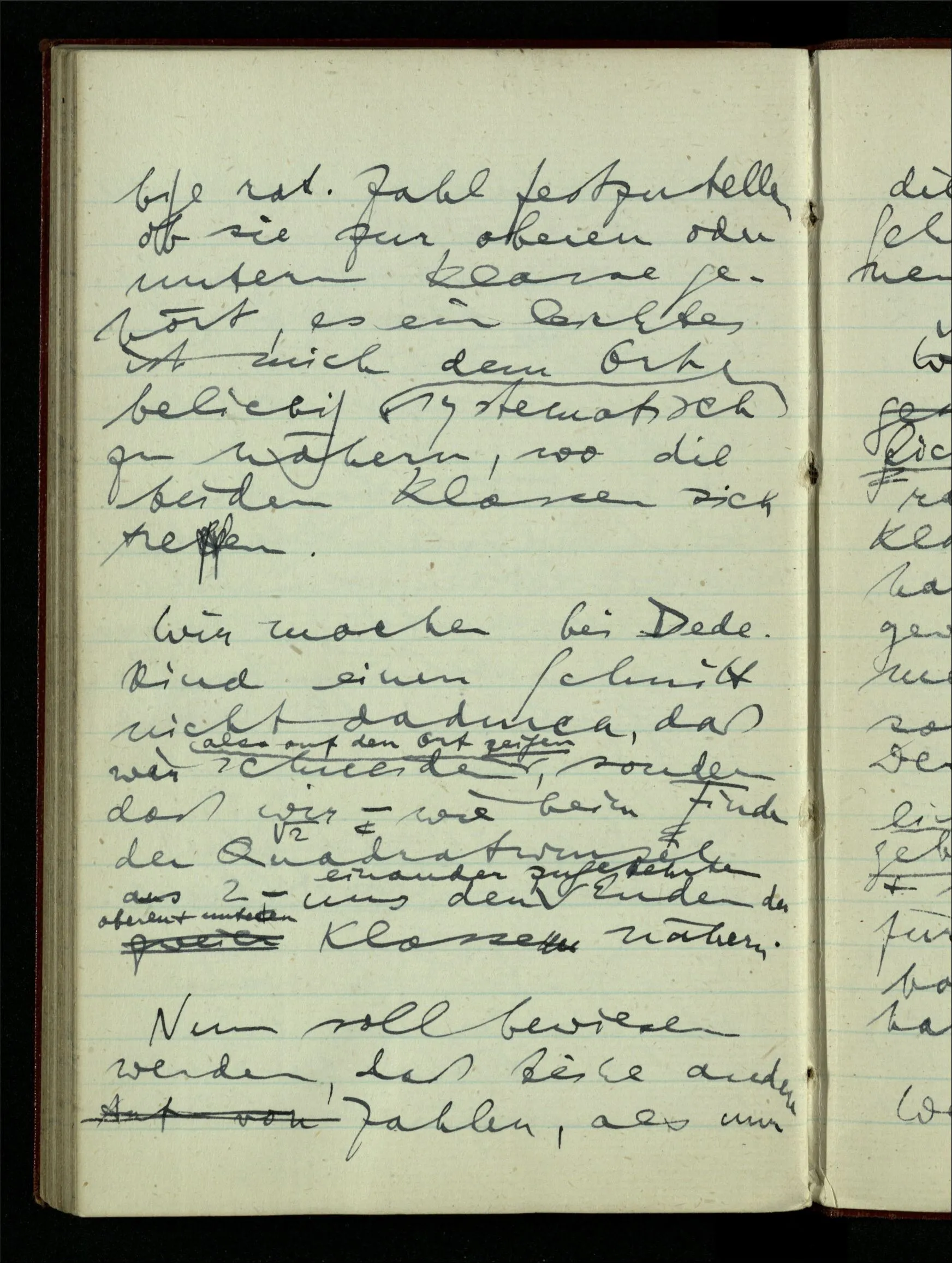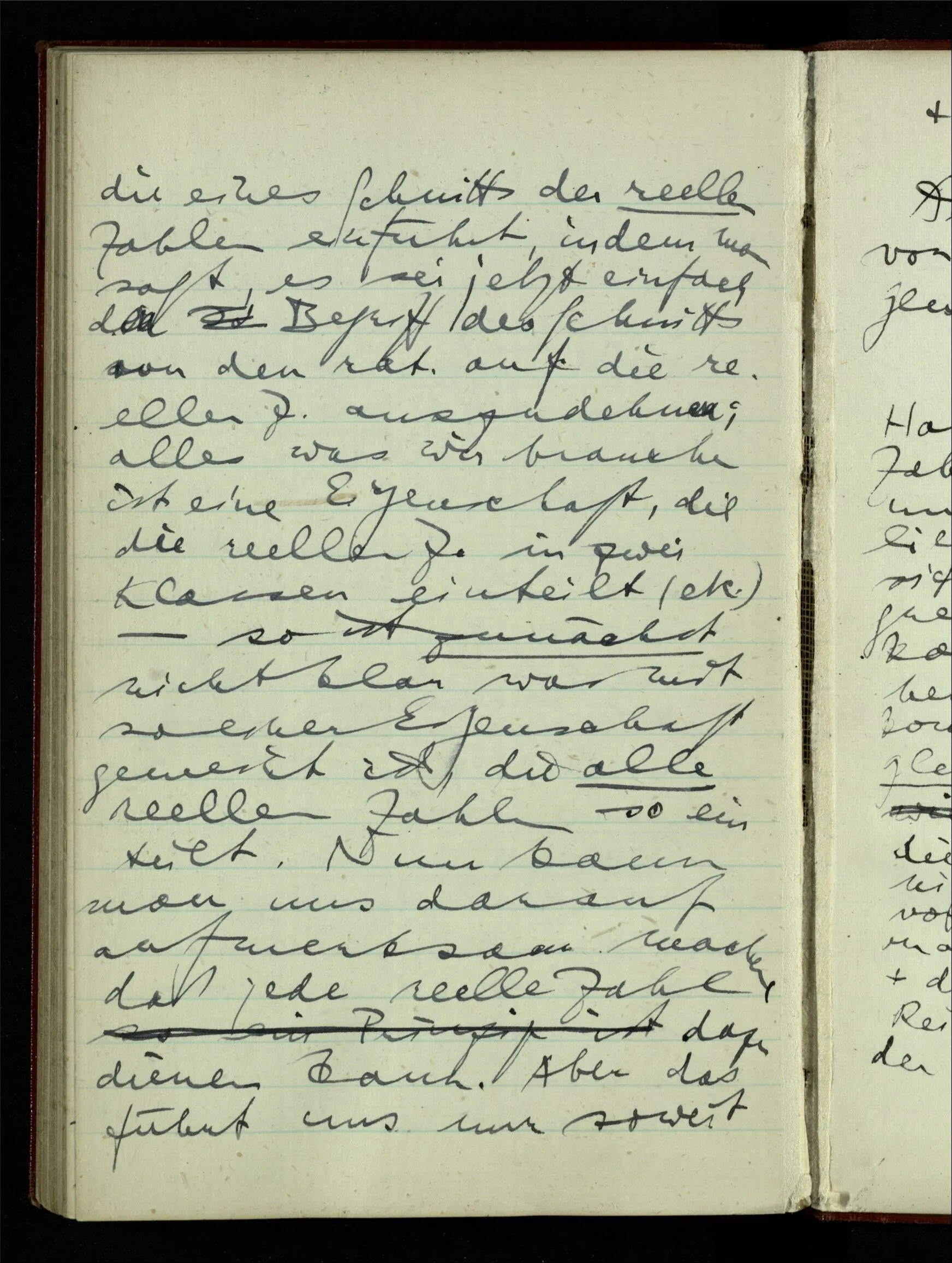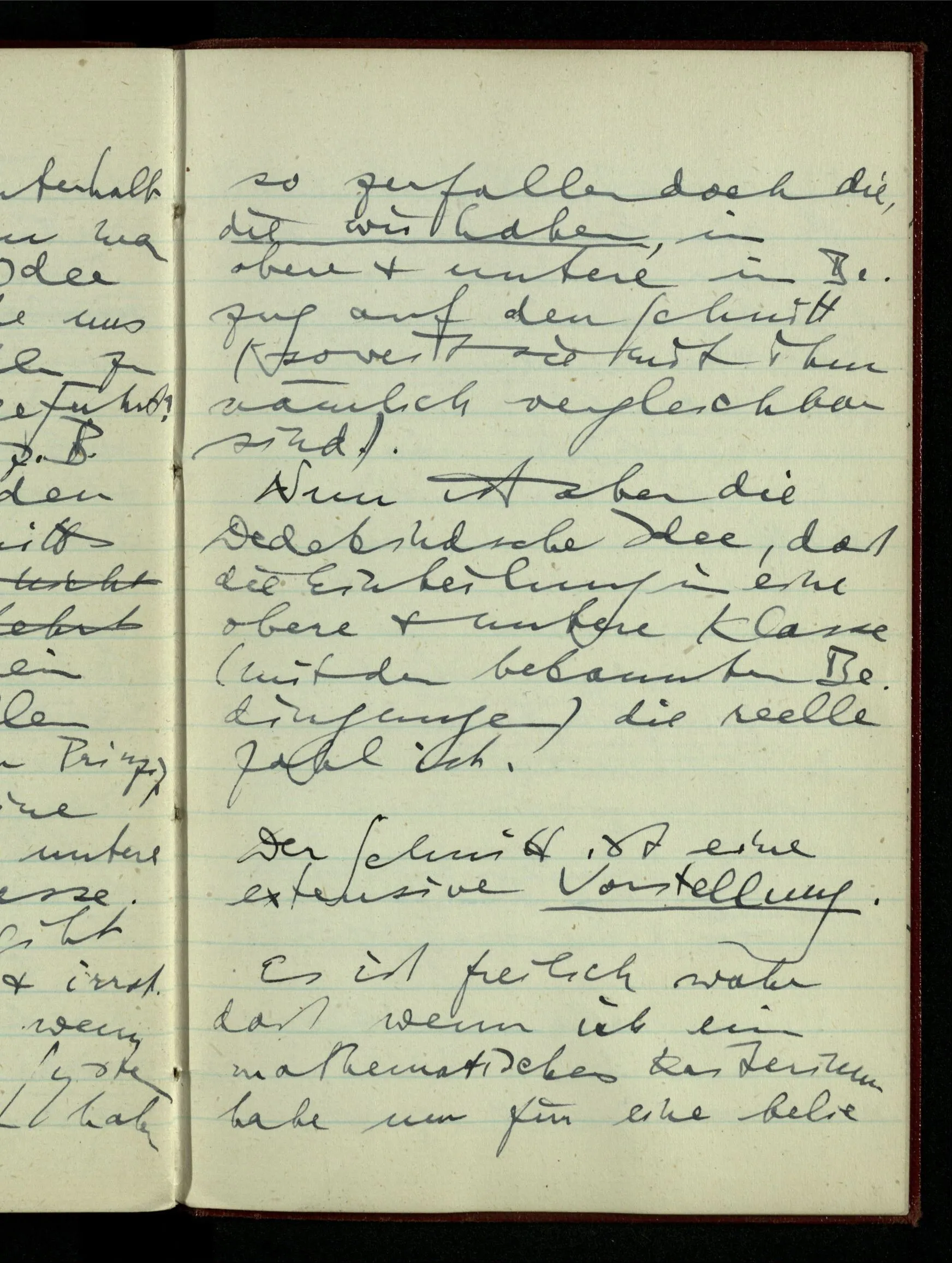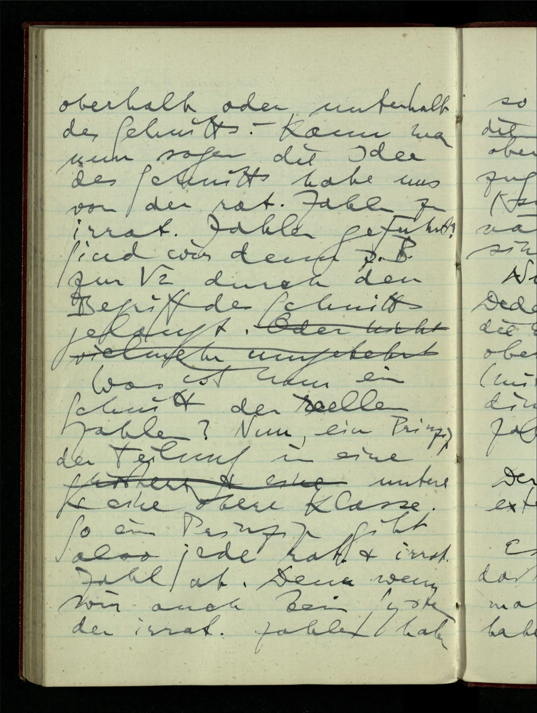 Die Schwierigkeit der bald intensionalen bald wieder extensionalen Betrachtungsweise beginnt schon beim Begriff des ‘Schnittes’. Daß man jede rationale Zahl ein Prinzip der Teilung der rationalen Zahlen nennen kann ist wohl klar. Nun entdecken wir etwas anderes was wir Prinzip der Teilung nennen können, etwas das, welches der √2 entspricht. Dann andere ähnliche – & nun sind wir mit der Möglichkeit solcher Teilungen schon ganz wohlvertraut, & sehen sie unter dem Bild eines irgendwo entlang der Geraden geführten Schnittes, also extensional. Denn wenn ich schneide, so kann ich ja wählen, wo ich schneiden will. Ist aber ein Prinzip der Teilung ein Schnitt, so ist es dies doch nur weil man von beliebigen rationalen Zahlen sagen kann sie seien oberhalb oder unterhalb des Schnitts. – Kann man nun sagen die Idee des Schnitts habe uns von den rationalen Zahlen zu irrationalen Zahlen geführt? Sind wir denn z.B. zur √2 durch den Begriff des Schnitts gelangt. Was ist nun ein Schnitt der reellen Zahlen? Nun, ein Prinzip der Teilung in eine untere & eine obere Klasse. So ein Prinzip gibt also jede rationale & irrationale Zahl ab. Denn wenn wir auch kein System der irrationalen Zahlen haben so zerfallen doch die, die wir haben, in obere & untere in Bezug auf den Schnitt (soweit sie mit ihm nämlich vergleichbar sind). Nun ist aber die Dedekindsche Idee, daß die Einteilung in eine obere & untere Klasse (mit den bekannten Bedingungen) die reelle Zahl ist.