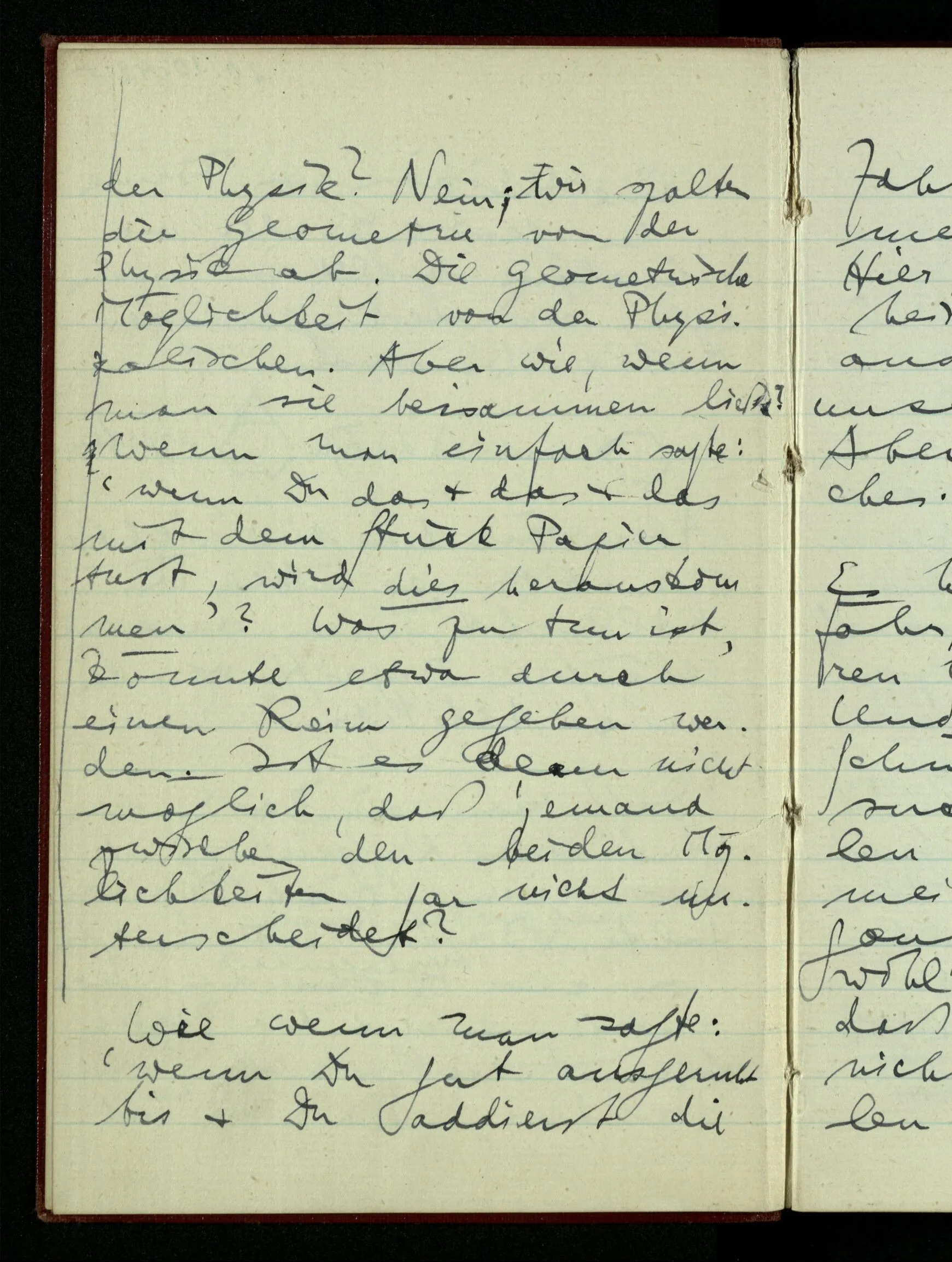 Daß man ein Boot, einen Hut, einen Katzenkopf etc. aus einem Stück Papier nach gewissen Regeln falten kann betrachten wir als Sache der Geometrie, nicht der Physik. Aber ist die Geometrie, so verstanden, nicht ein Teil der Physik? Nein; wir spalten die Geometrie von der Physik ab. Die geometrische Möglichkeit von der physikalischen. Aber wie, wenn man sie beisammen ließe? Wenn man einfach sagte: ‘wenn Du das & das & das mit dem Stück Papier tust, wird dies herauskommen’? Was zu tun ist, könnte etwa durch einen Reim gegeben werden. Ist es denn nicht möglich, daß jemand zwischen den beiden Möglichkeiten gar nicht unterscheidet?