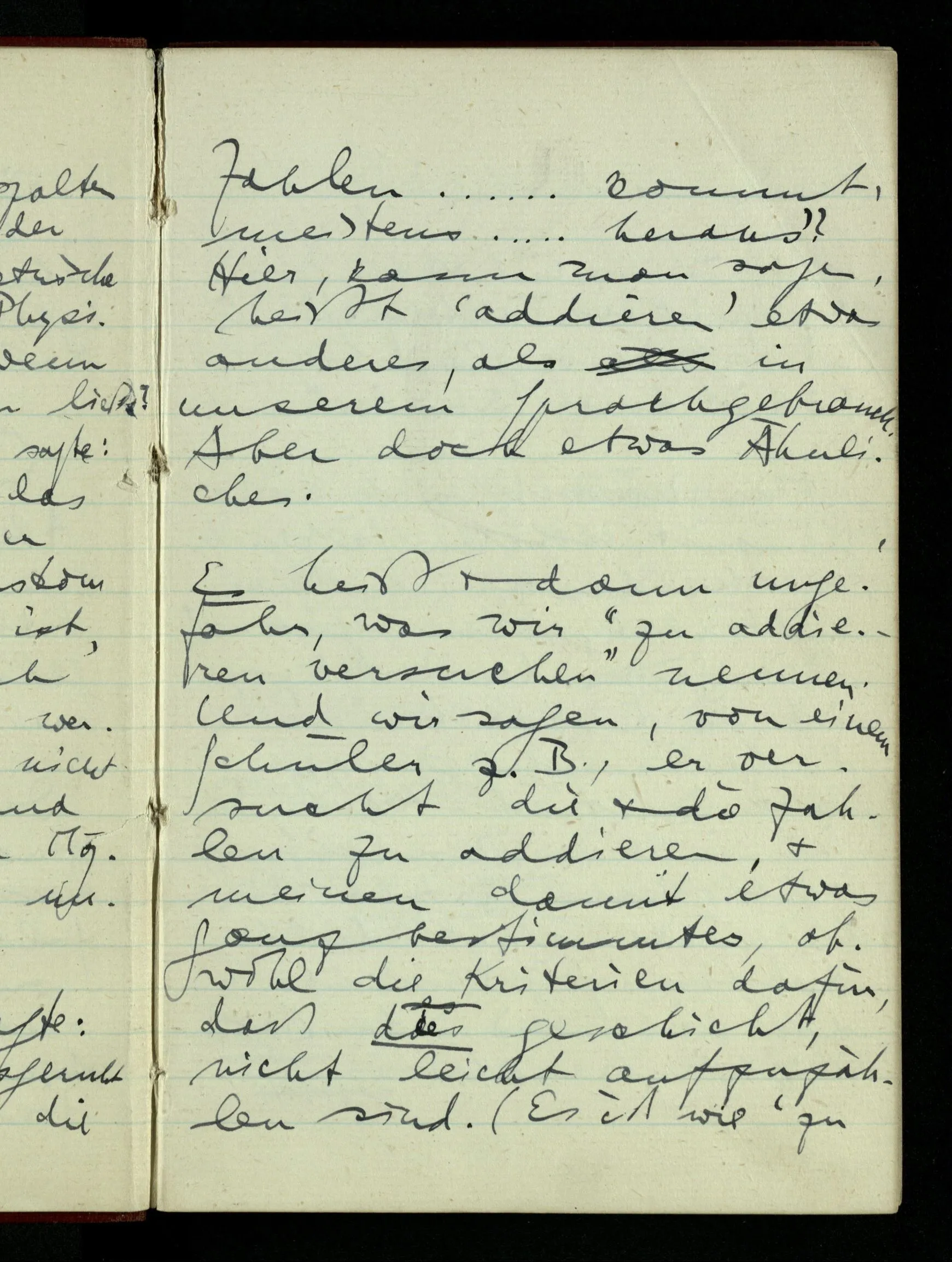 Es heißt dann ungefähr, was wir “zu addieren versuchen” nennen. Und wir sagen, von einem Schüler z.B., er versucht die & die Zahlen zu addieren, & meinen damit etwas ganz bestimmtes, obwohl die Kriterien dafür, daß das geschieht, nicht leicht aufzuzählen sind. (Es ist wie ‘zu lesen versuchen’.)