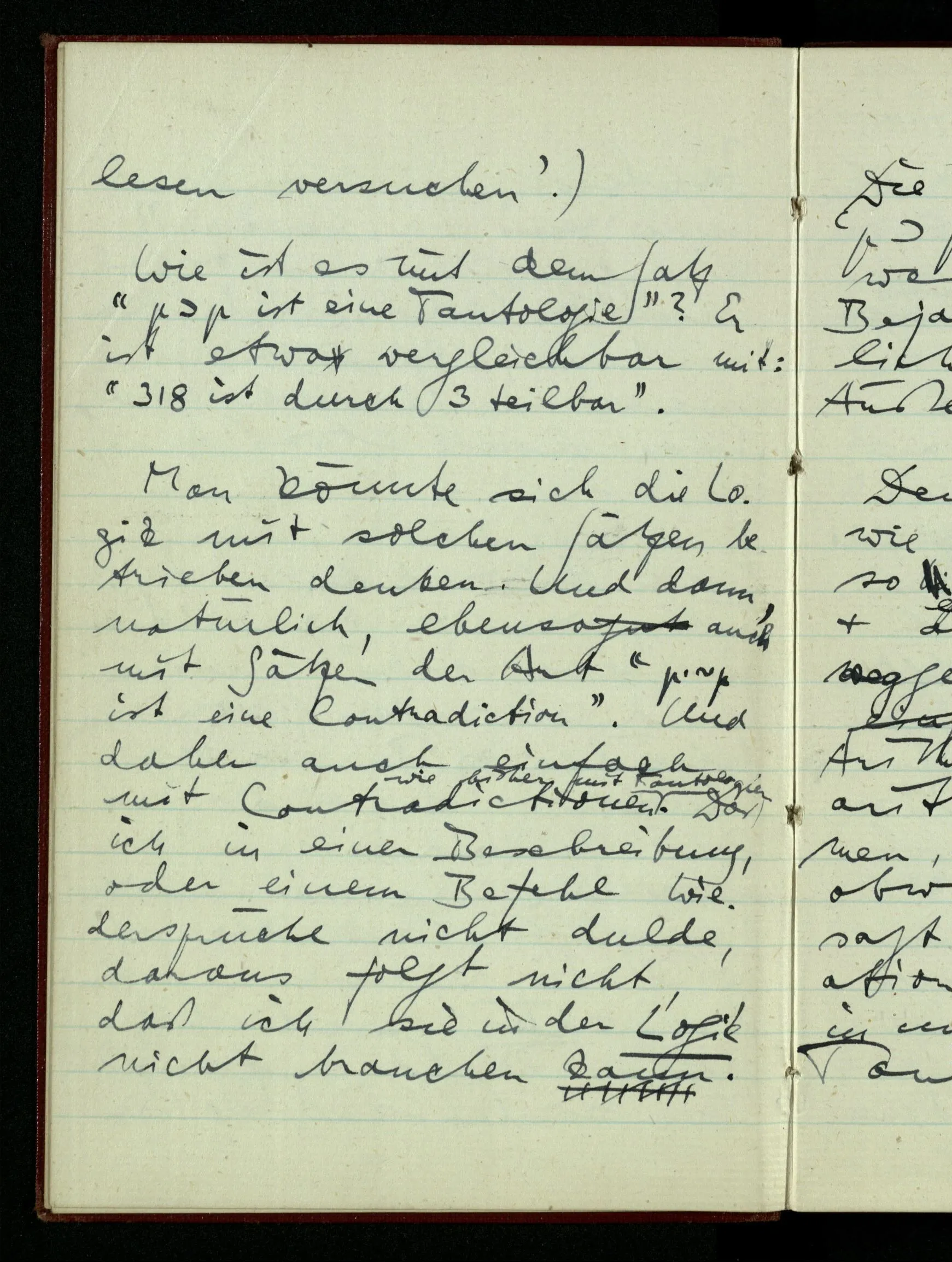 Man könnte sich die Logik mit solchen Sätzen betrieben denken. Und dann, natürlich, ebenso auch mit Sätzen der Art “p ∙ ~p ist eine Kontradiktion”. Und daher auch einfach mit Kontradiktionen wie bisher mit Tautologien. Daß ich in einer Beschreibung, oder einem Befehl Widersprüche nicht dulde, daraus folgt nicht, daß ich sie in der Logik nicht brauchen kann.