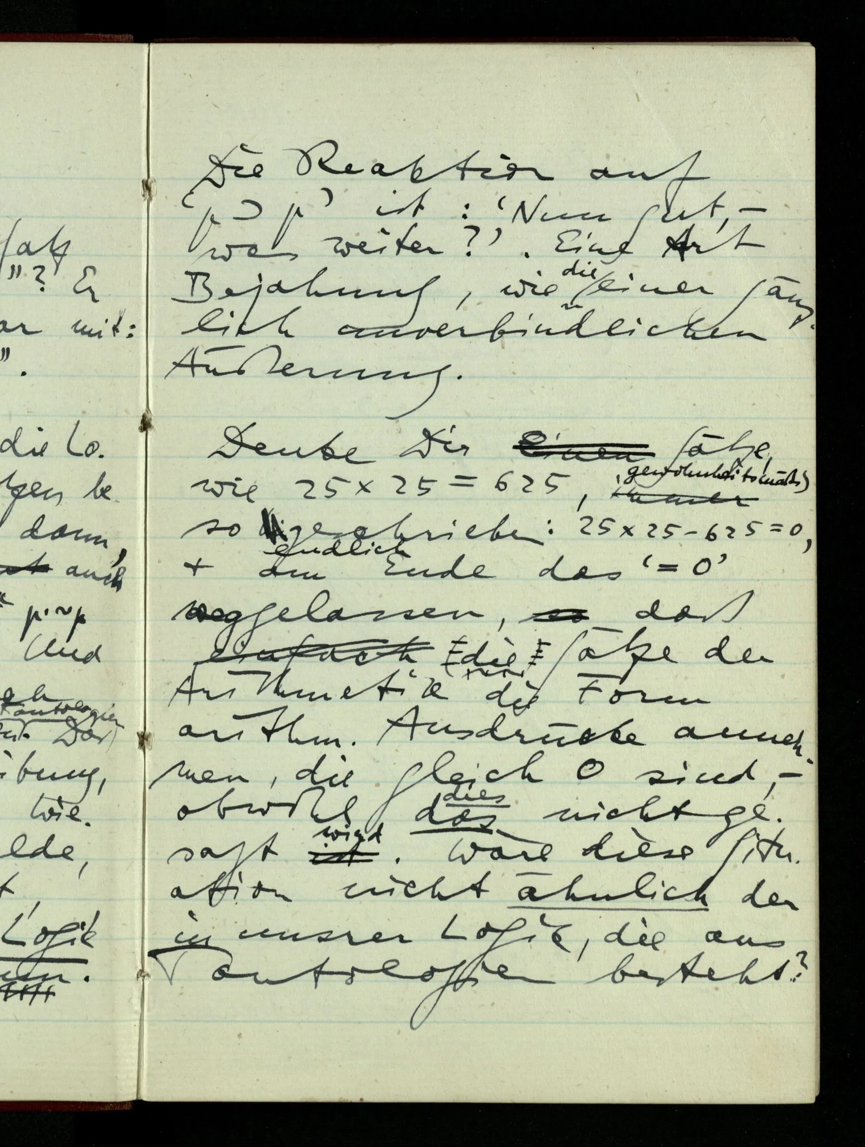 Denke Dir Sätze, wie 25 × 25 = 625, gewohnheitsmäßig so geschrieben: 25 × 25 ‒ 625 = 0, & am Ende das ‘ = 0’ weggelassen, daß die Sätze der Arithmetik die Form arithm. Ausdrücke annehmen, die gleich 0 sind, – obwohl das nicht gesagt wird. Wäre diese Situation nicht ähnlich der in unsrer Logik, die aus Tautologien besteht?