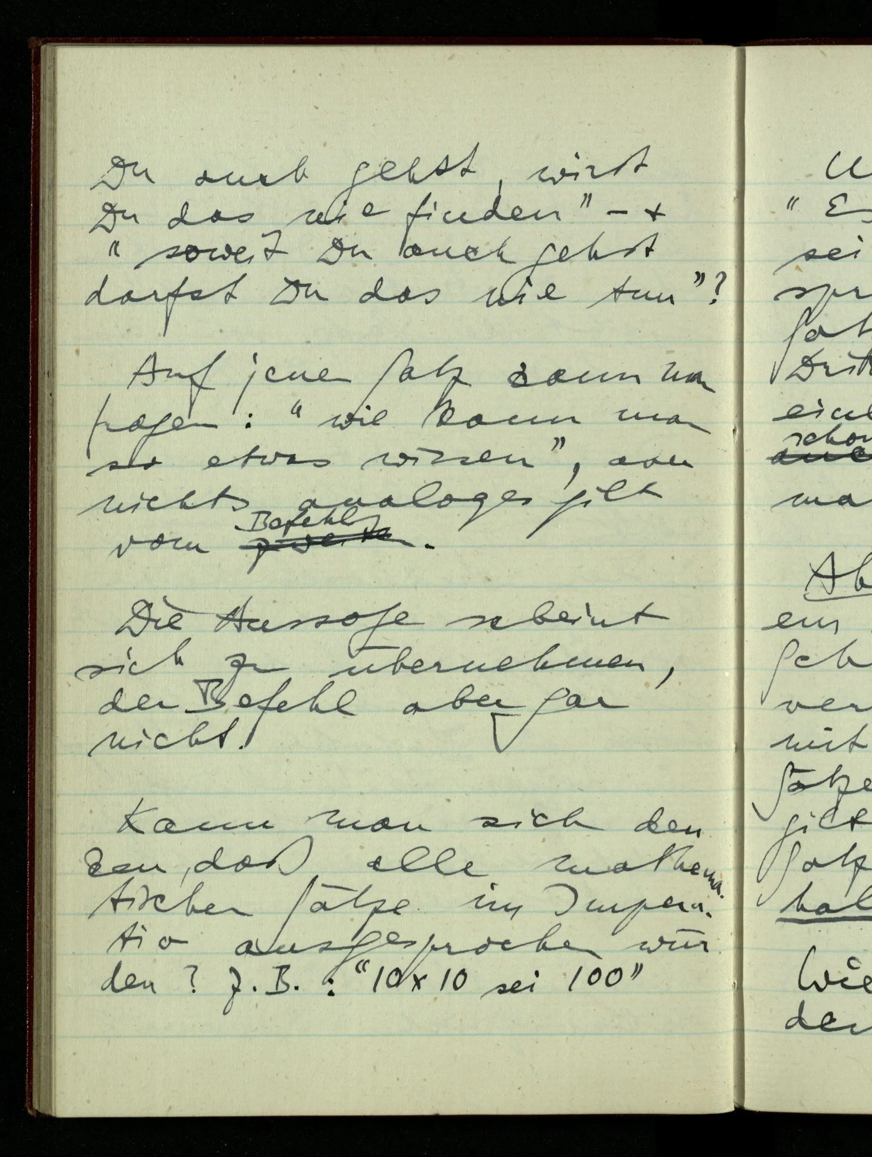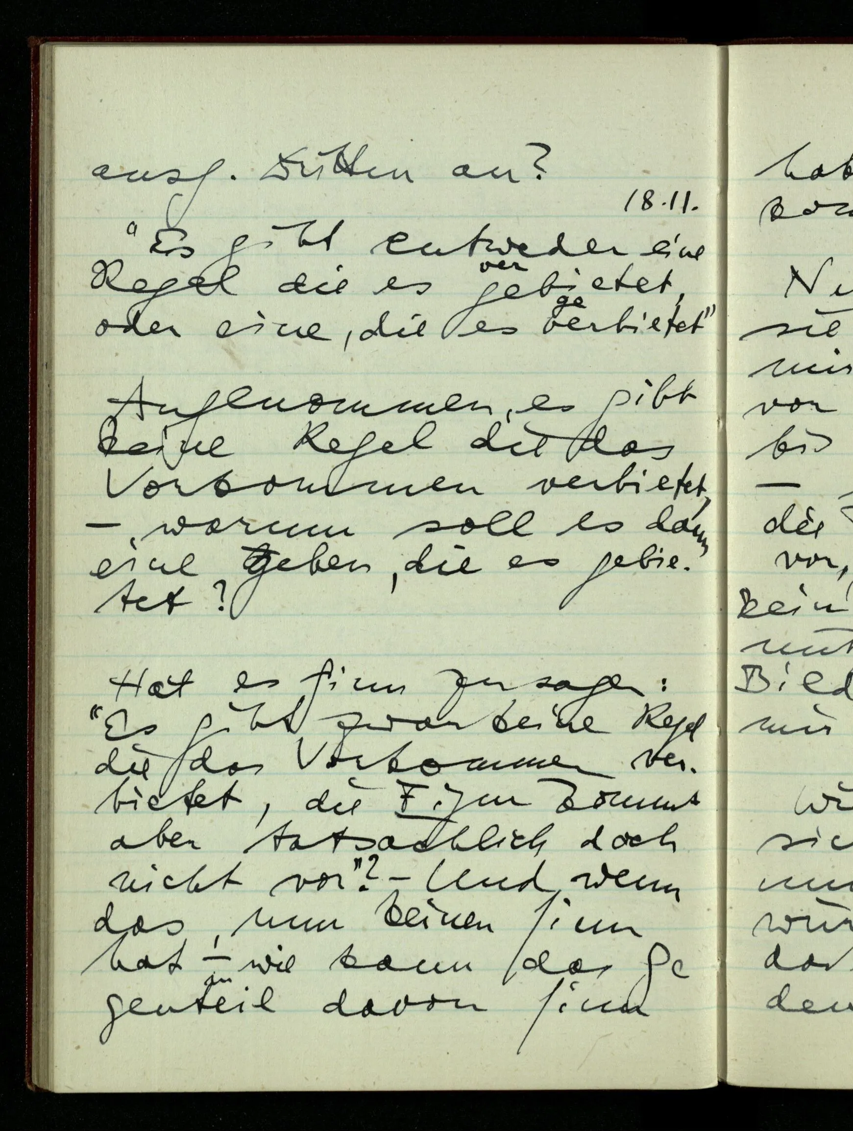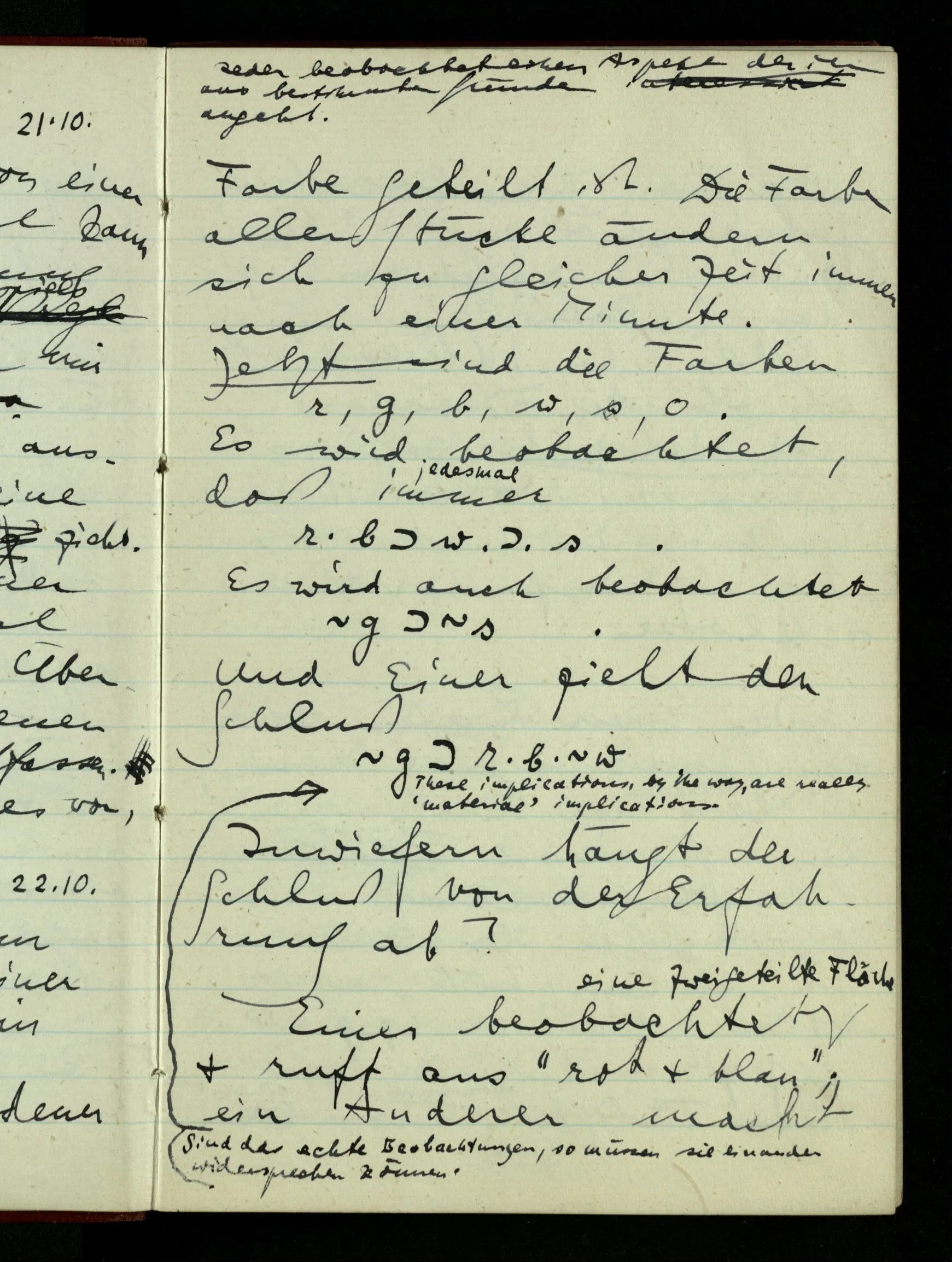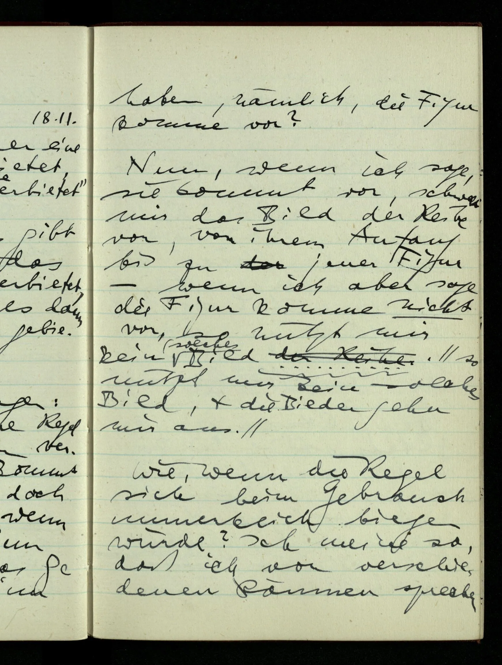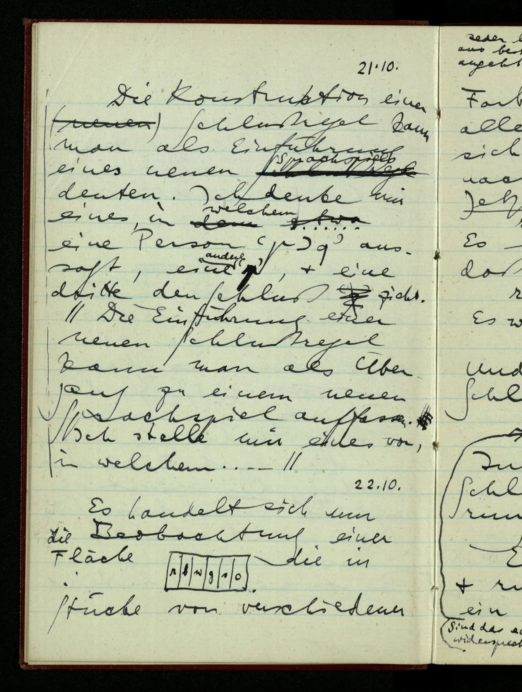 21.10.1942 Die Konstruktion einer Schlußregel kann man als Einführung eines neuen Sprachspiels deuten. Ich denke mir eines, in welchem etwa eine Person ‘p ⊃ q’ aussagt, eine andere ‘p’, & eine dritte den Schluß zieht.