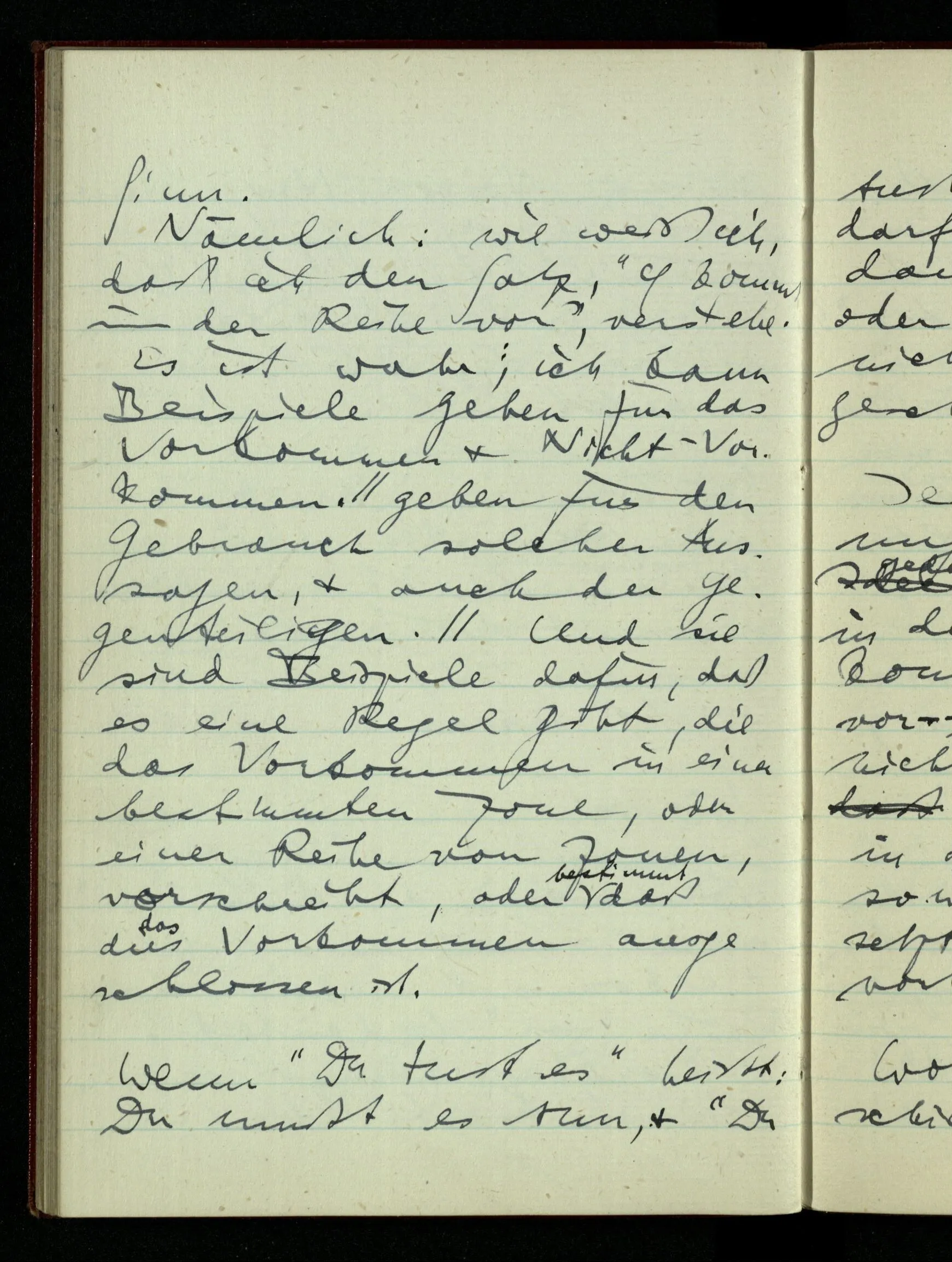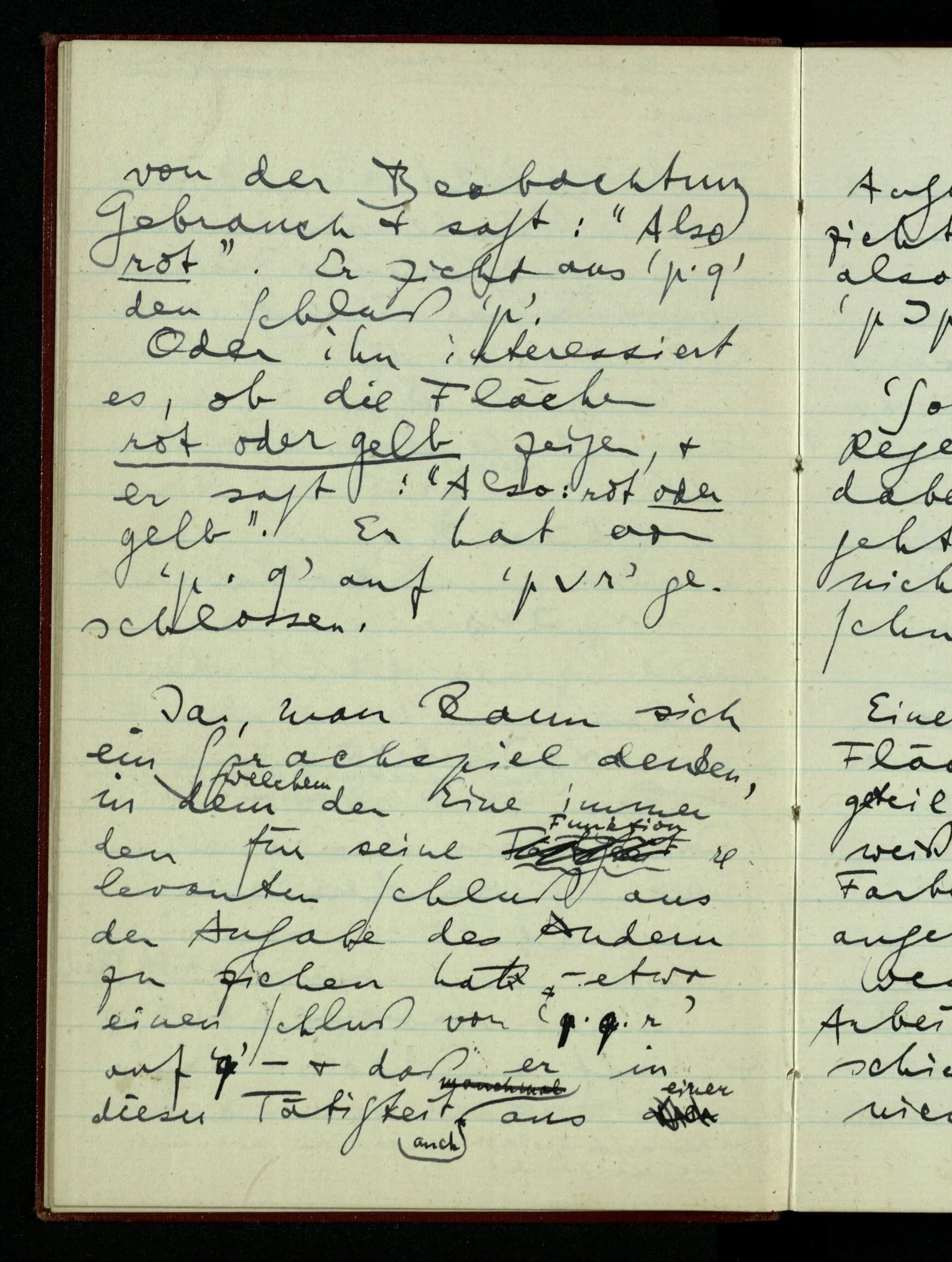 Ja, man kann sich ein Sprachspiel denken, in dem der Eine immer den für seine Funktion relevanten Schluß aus der Angabe des Andern zu ziehen hat – etwa einen Schluß von ‘p ∙ q ∙ r’ auf ‘q’ – & daß er in dieser Tätigkeit auch aus einer Angabe ‘p’ den Schluß zieht: “also ‘p’”, daß er also nach der Formel ‘p ⊃ p’ schließt.