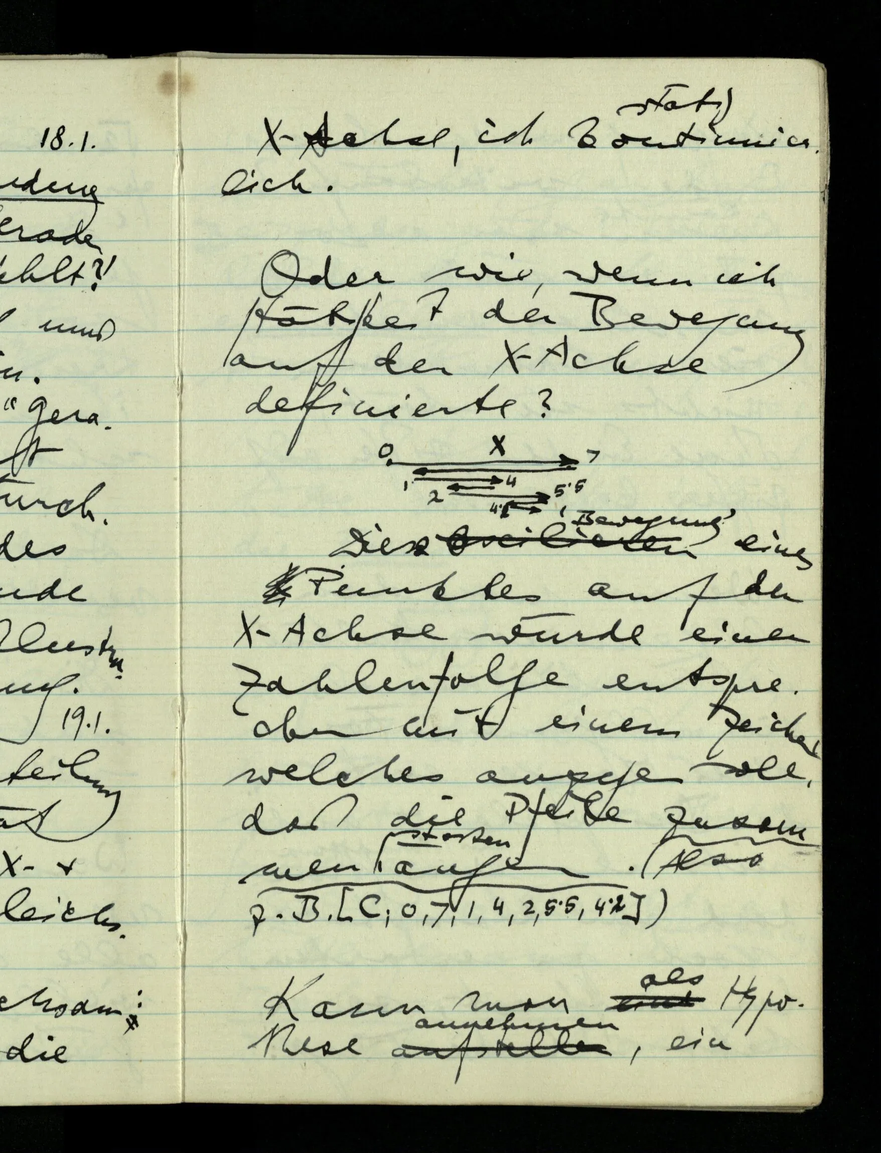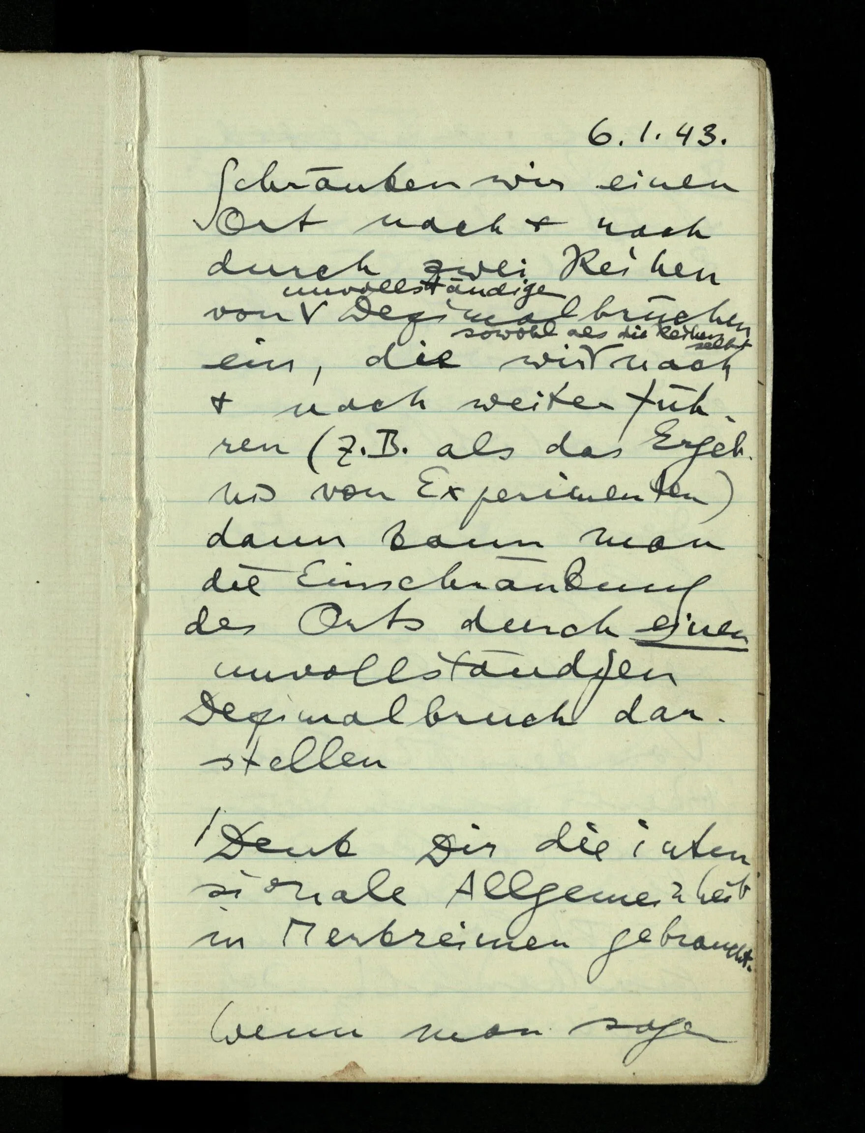 06.01.1943 Schränken wir einen Ort nach & nach durch zwei Reihen von unvollständigen Dezimalbrüchen ein, die wir sowohl als die Reihung selbst nach & nach weiter führen (z.B. als das Ergebnis von Experimenten) dann kann man die Einschränkung des Orts durch einen unvollständigen Dezimalbruch darstellen.
