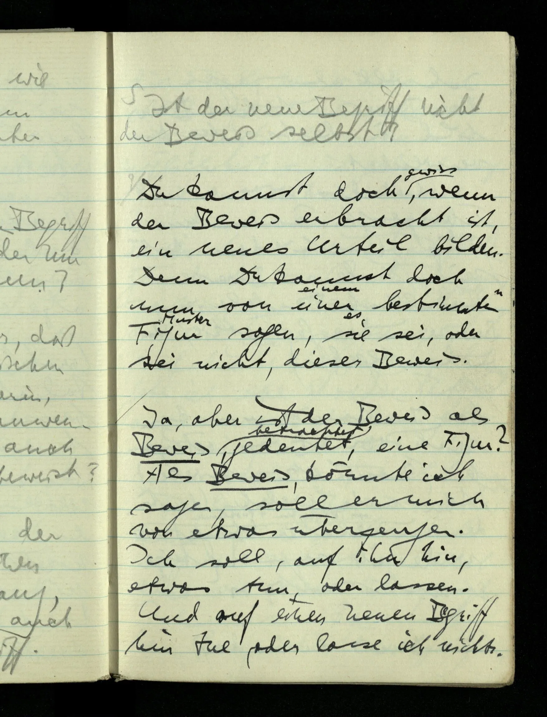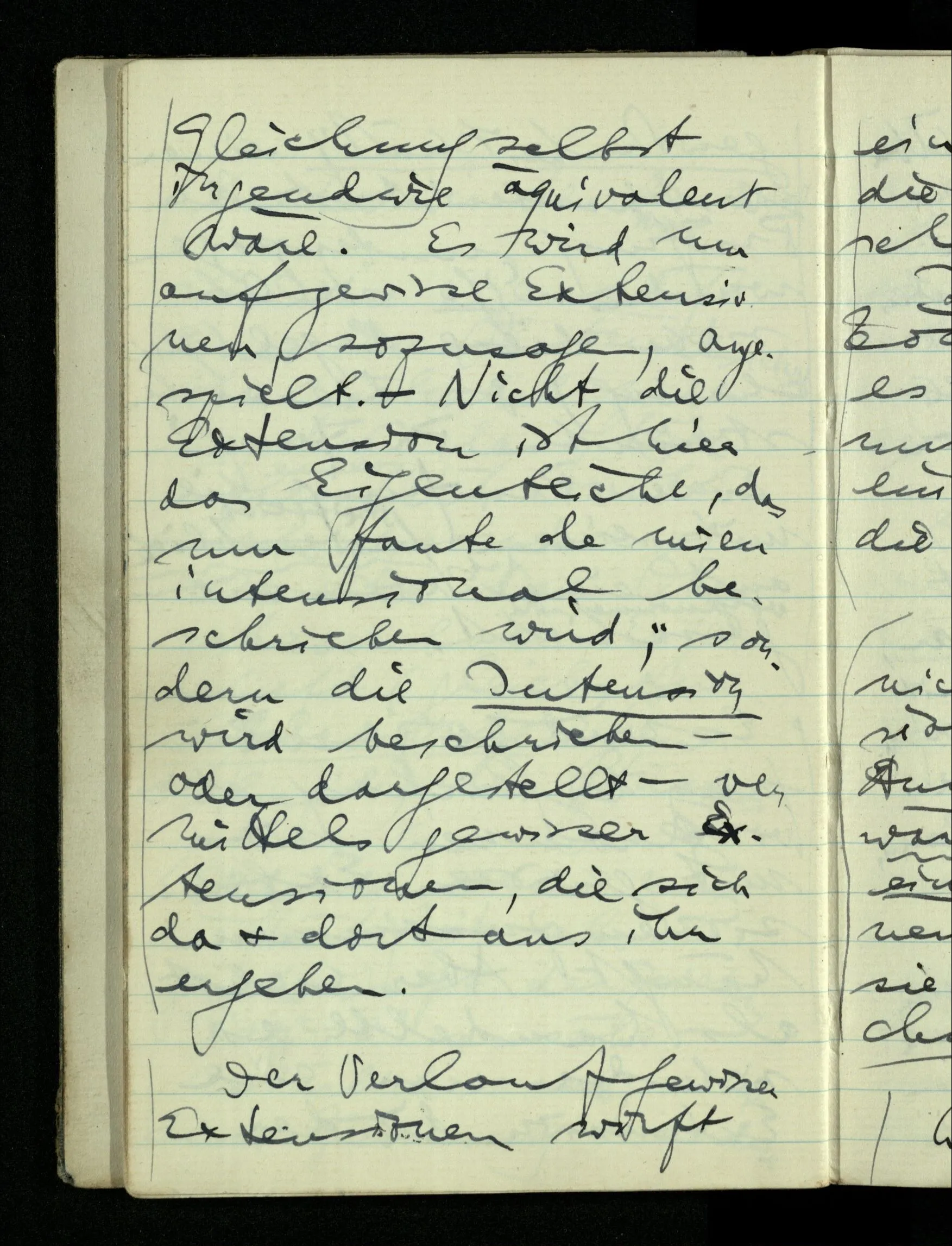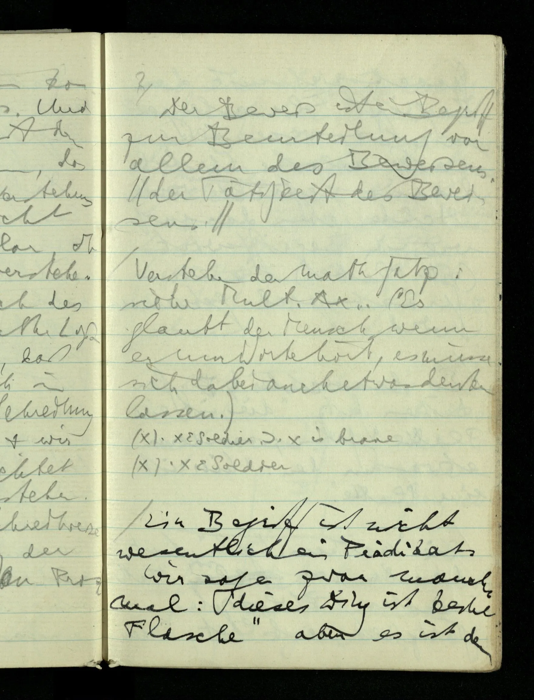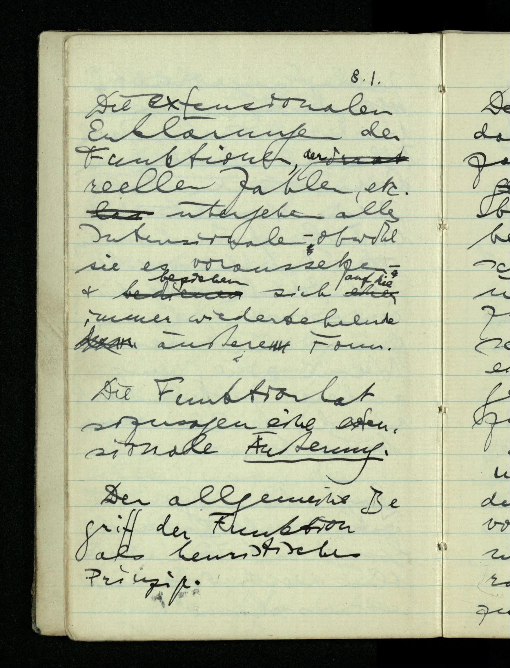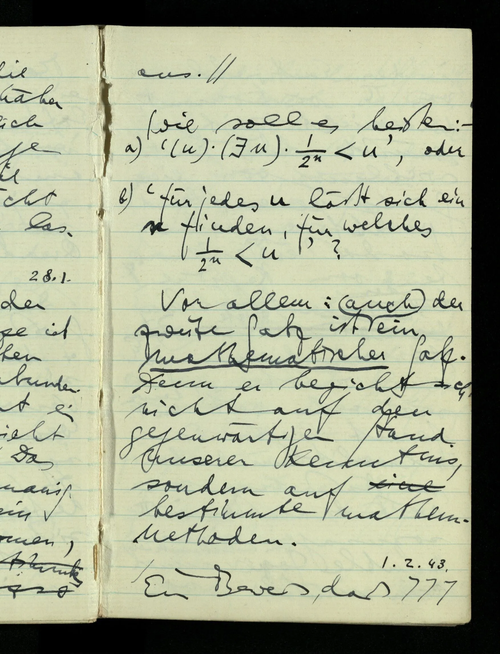 08.01.1943 Die extensionalen Erklärungen der Funktionen, der reellen Zahlen, etc. übergehen alles Intensionale – obwohl sie es voraussetzen – & beziehen sich auf die immer wiederkehrende äußere Form.
