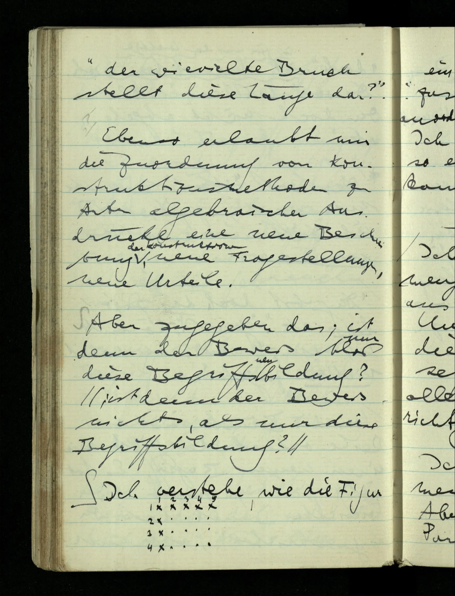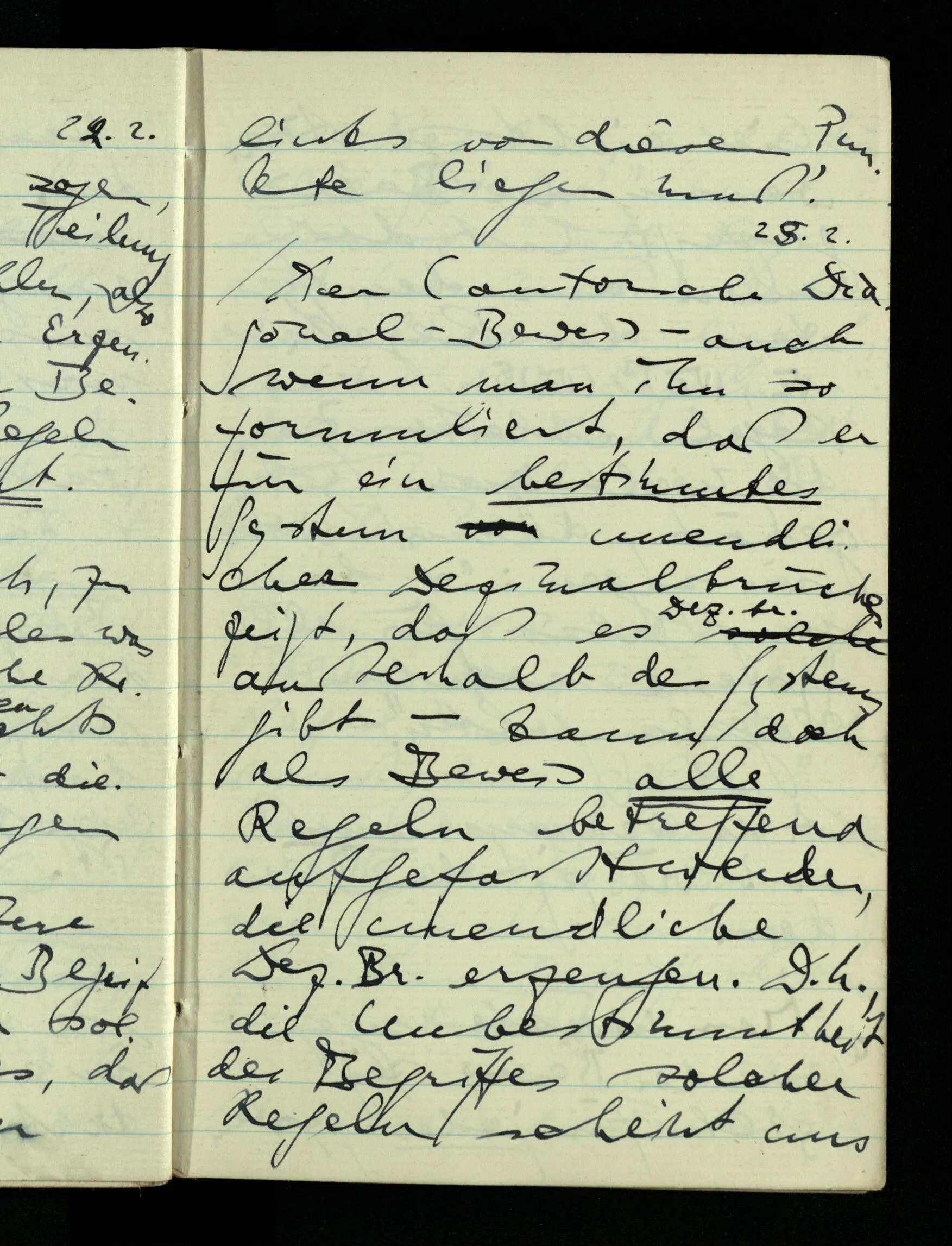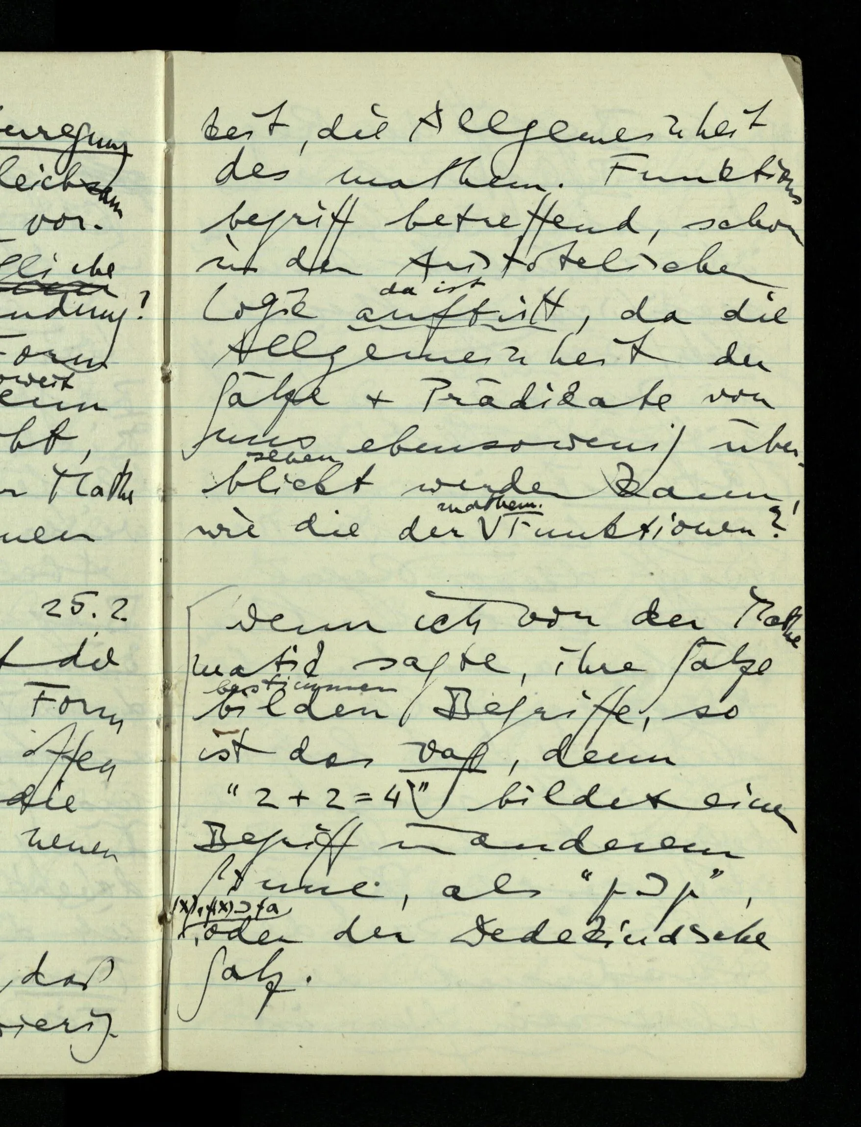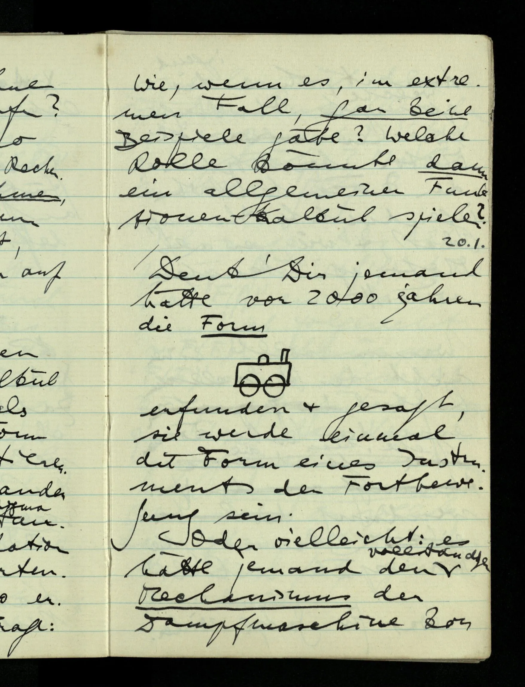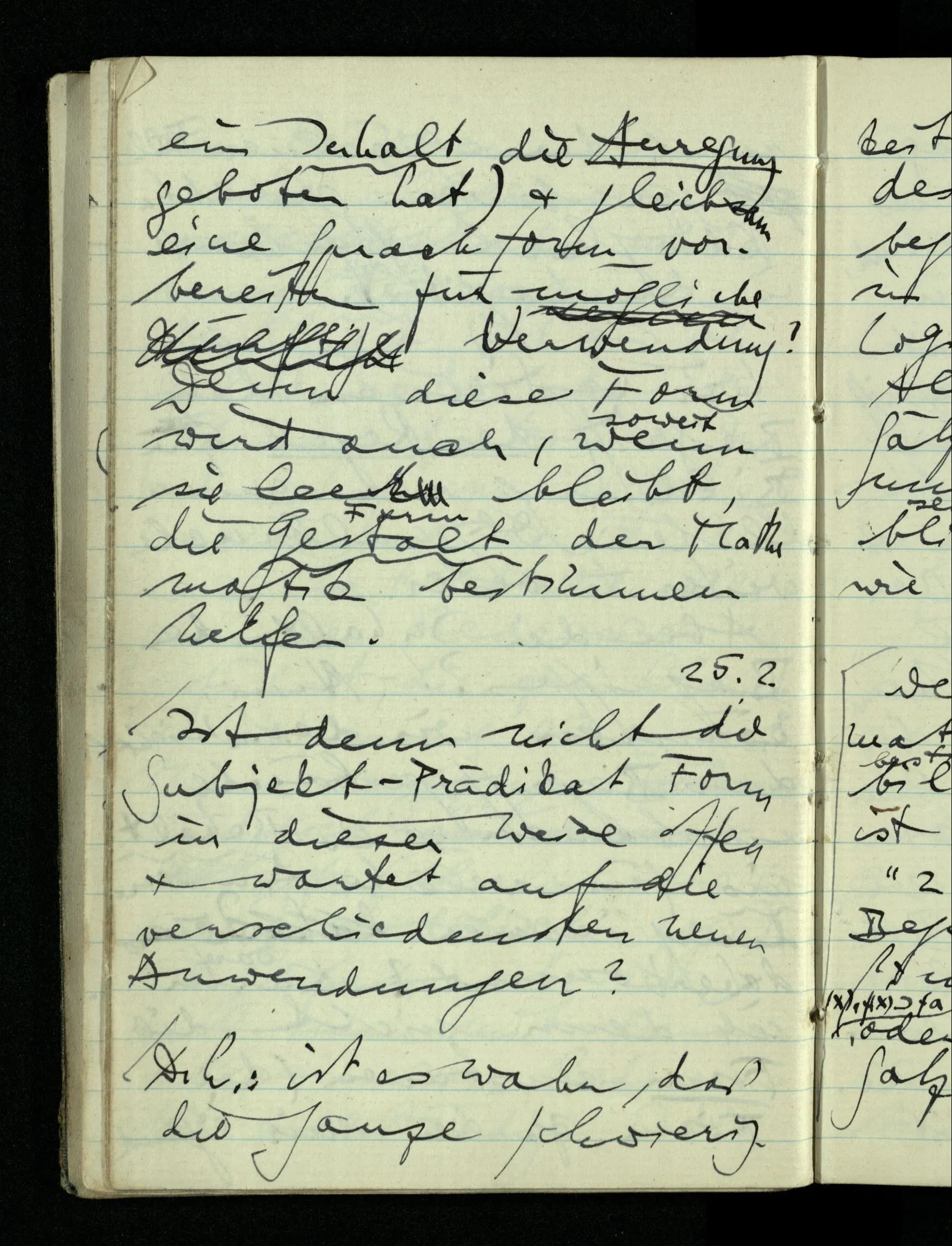 08.01.1943 Die extensionalen Erklärungen der Funktionen, der reellen Zahlen, etc. übergehen alles Intensionale – obwohl sie es voraussetzen – & beziehen sich auf die immer wiederkehrende äußere Form.