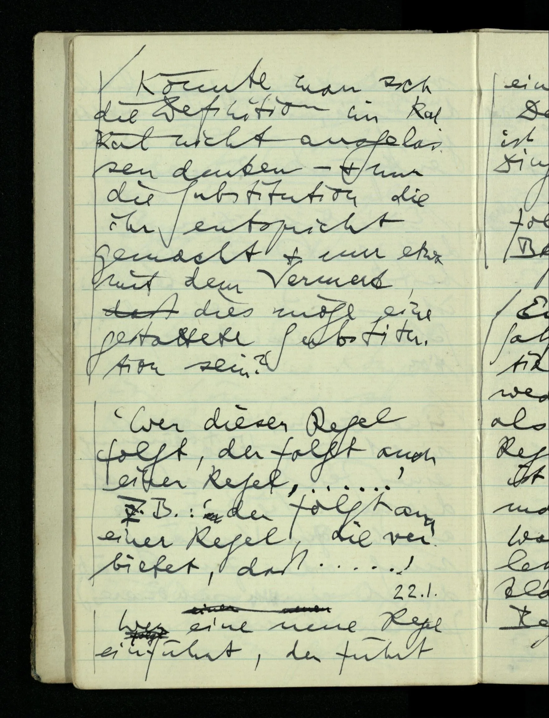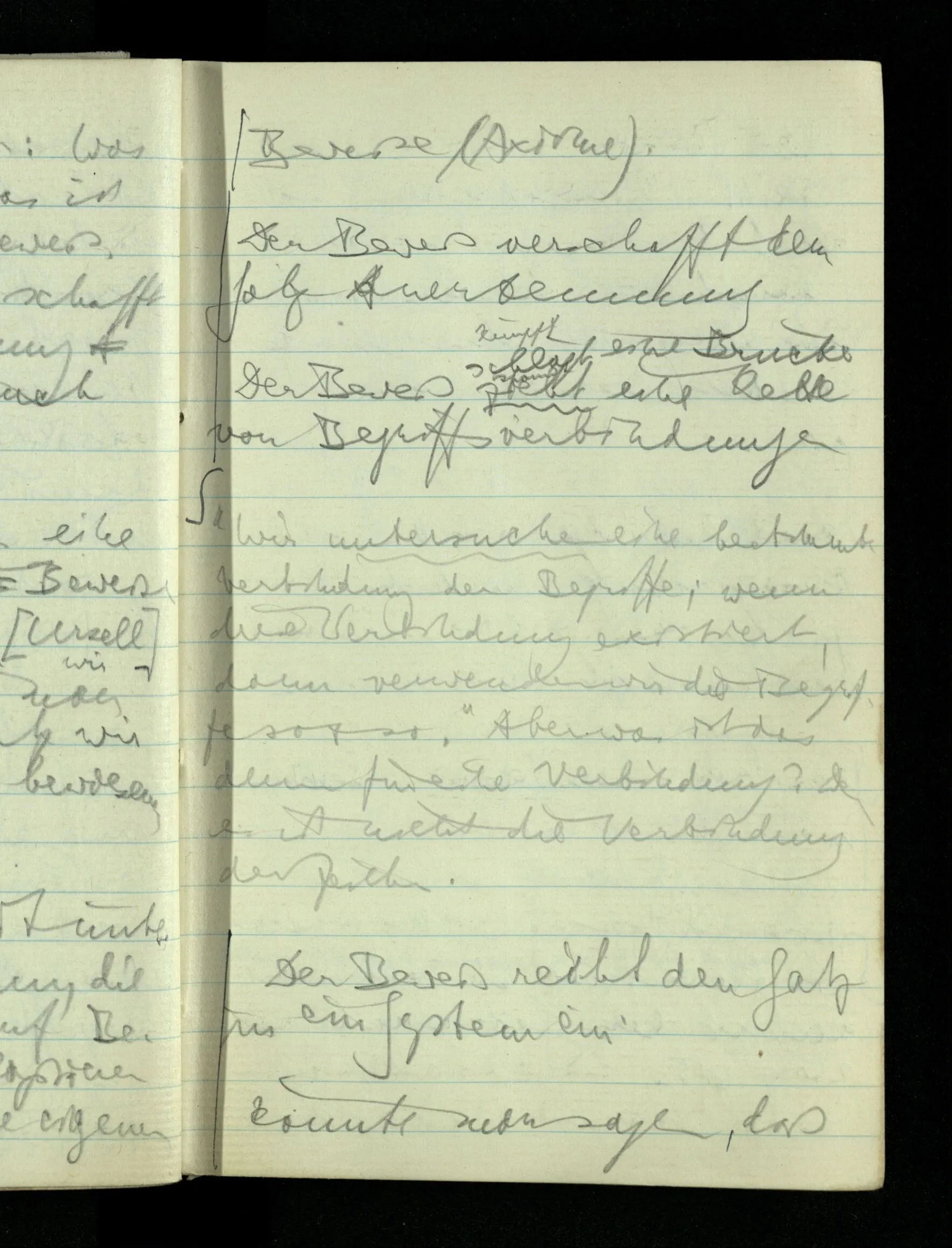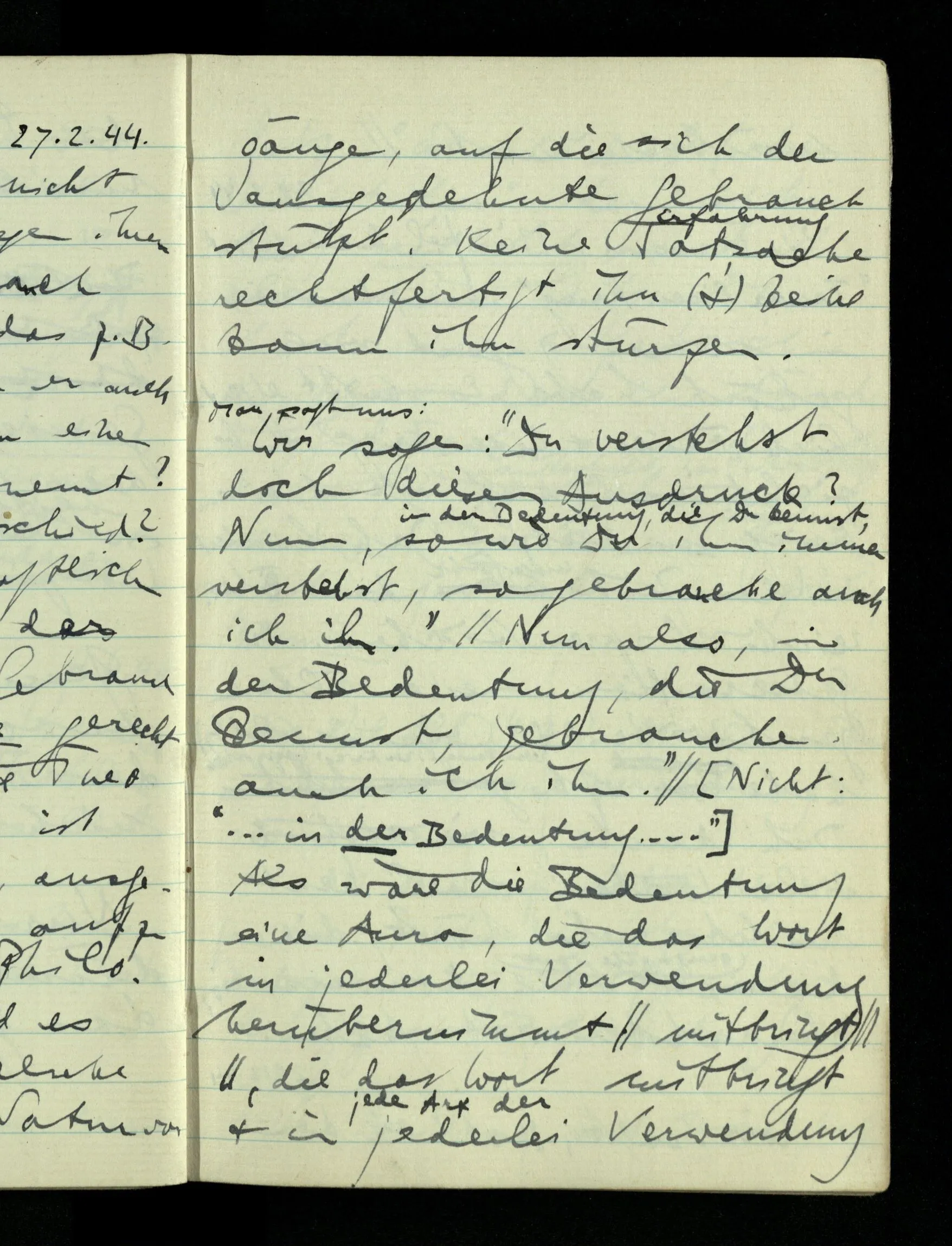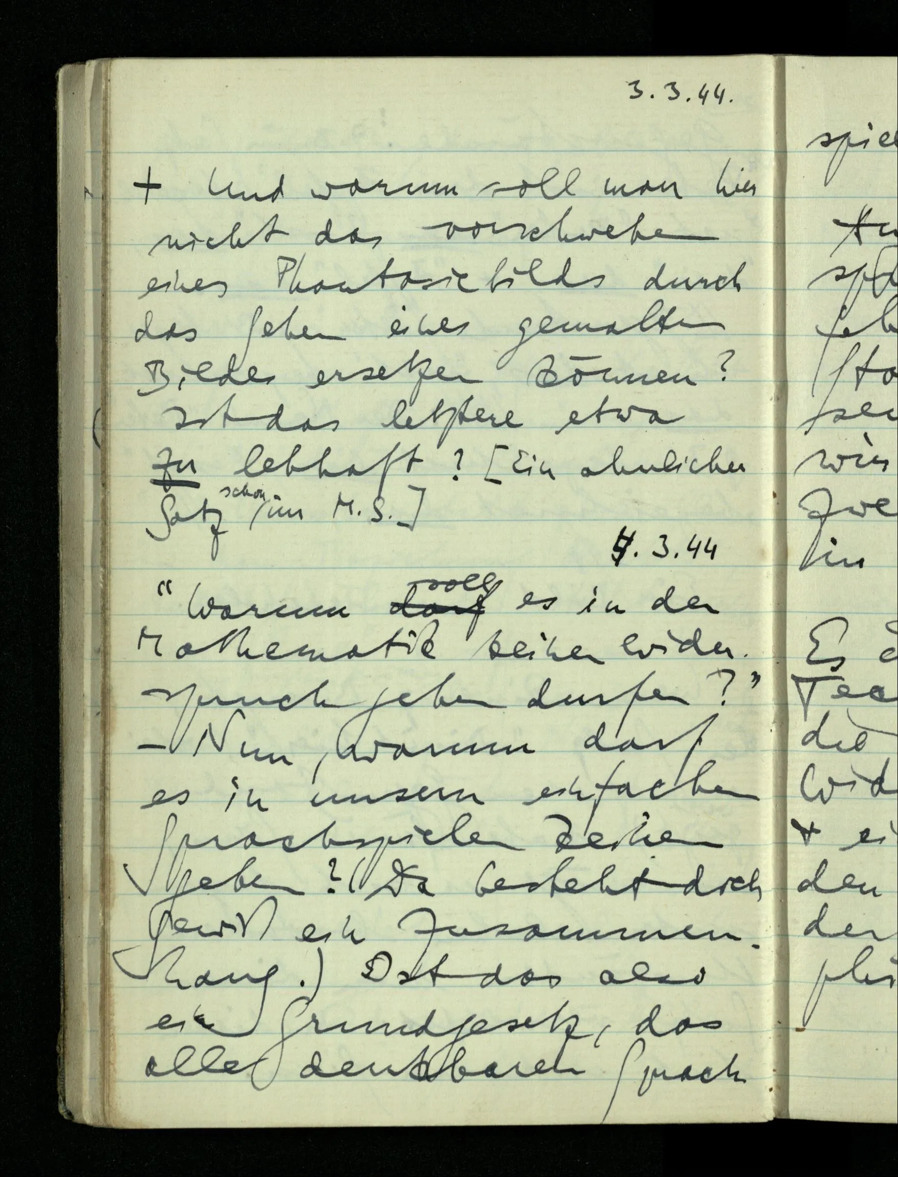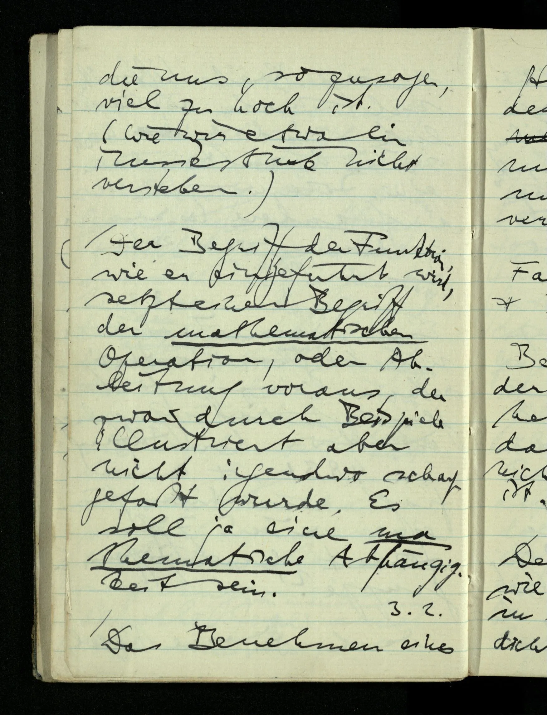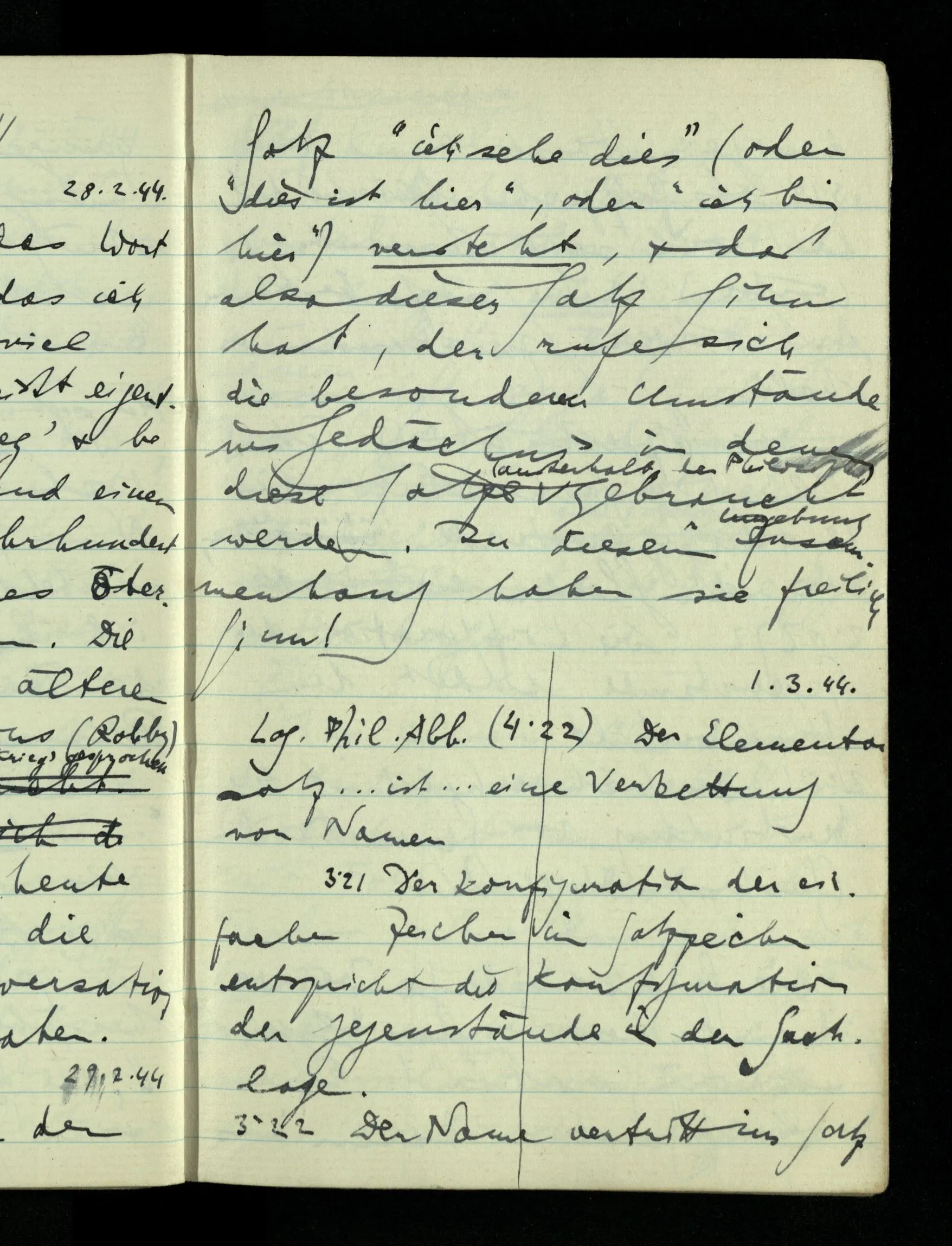 08.01.1943 Die extensionalen Erklärungen der Funktionen, der reellen Zahlen, etc. übergehen alles Intensionale – obwohl sie es voraussetzen – & beziehen sich auf die immer wiederkehrende äußere Form.