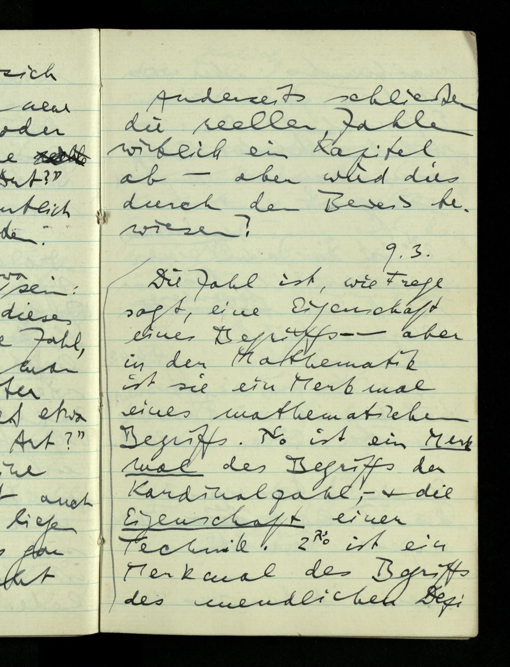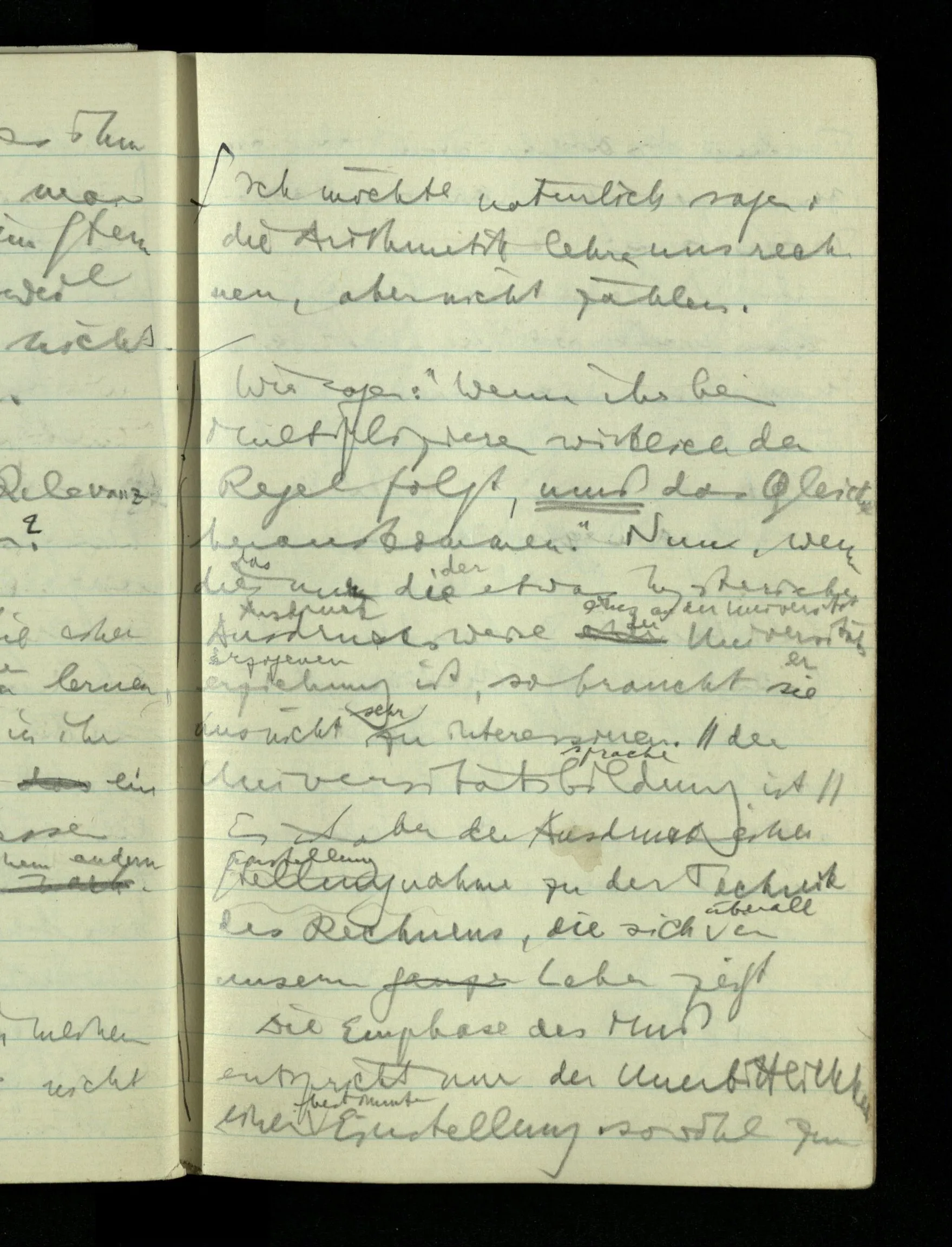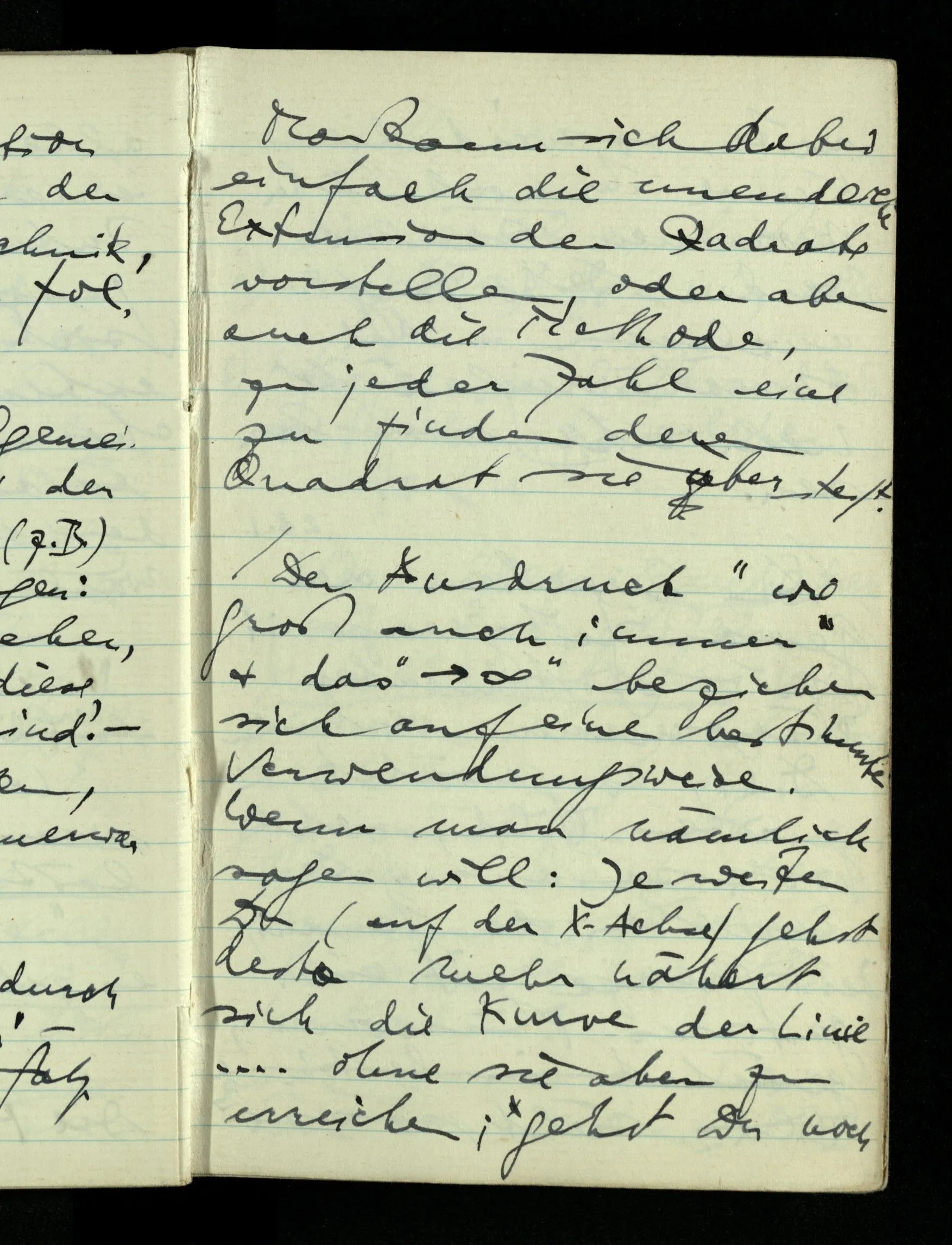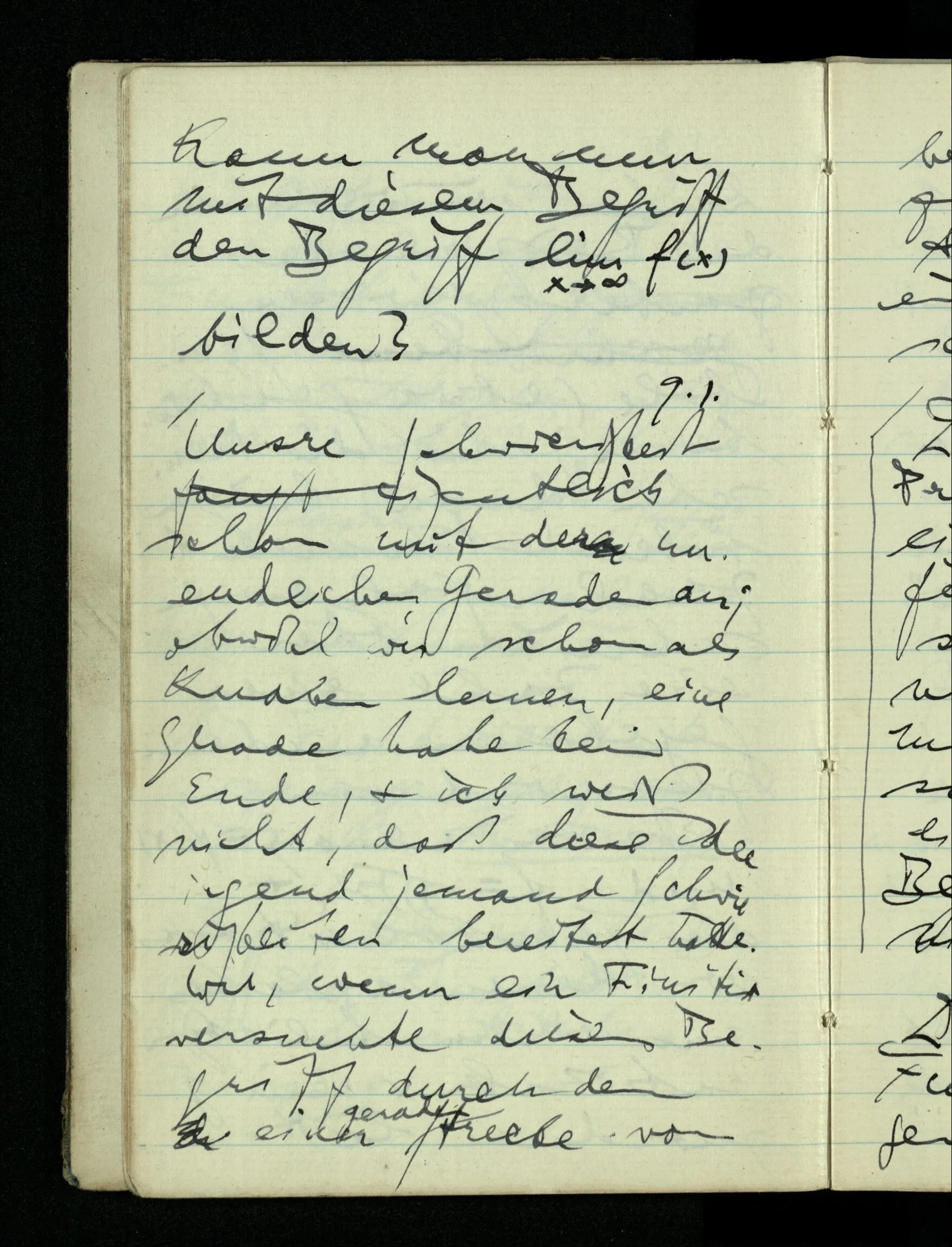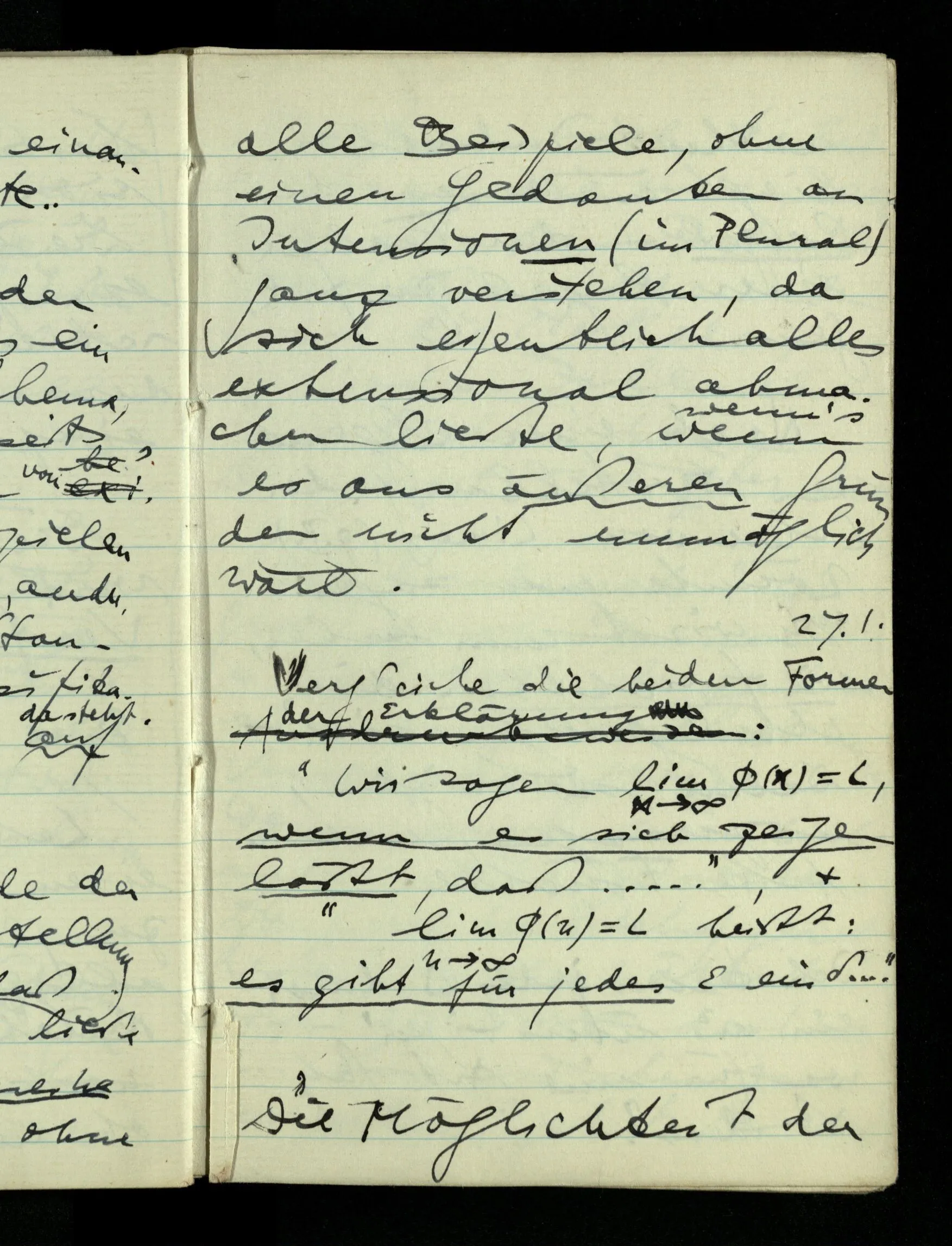 09.01.1943 Unsre Schwierigkeit fängt eigentlich schon mit der unendlichen Geraden an; obwohl wir schon als Knaben lernen, eine Gerade habe kein Ende, & ich weiß nicht, daß diese Idee irgend jemand Schwierigkeiten bereitet hätte. Wie, wenn ein Finitist versuchte diesen Begriff durch den einer geraden Strecke von bestimmter Länge zu ersetzen?!