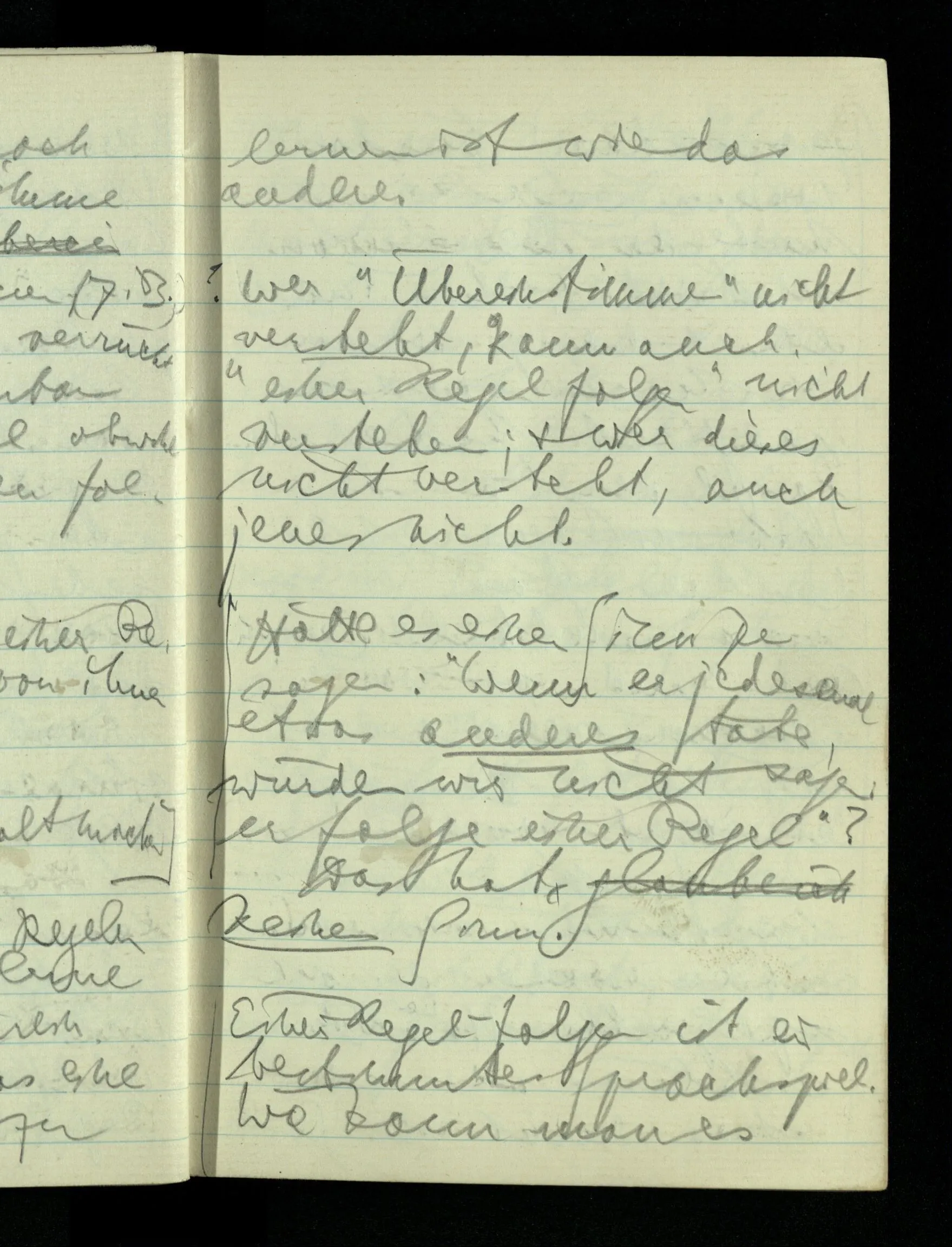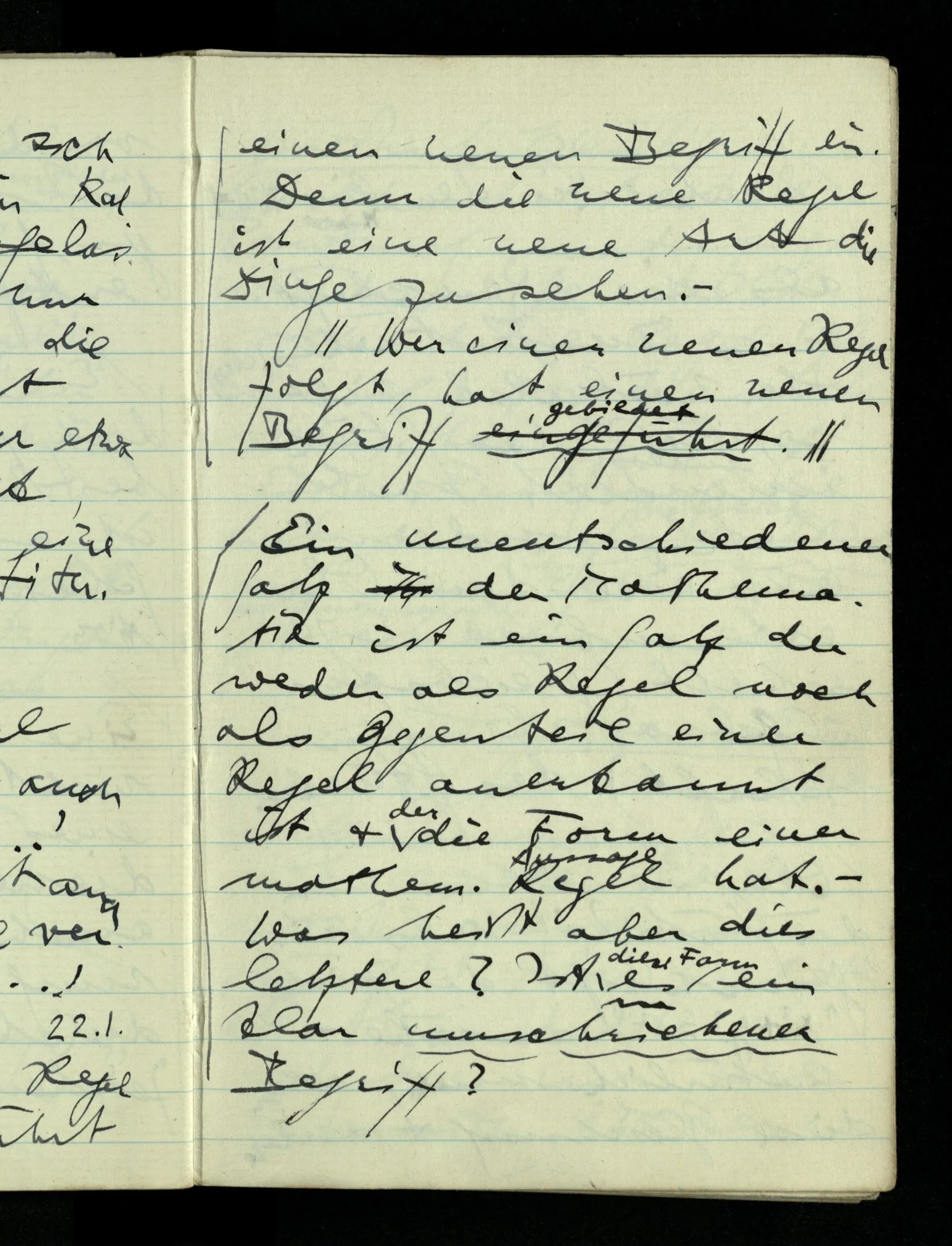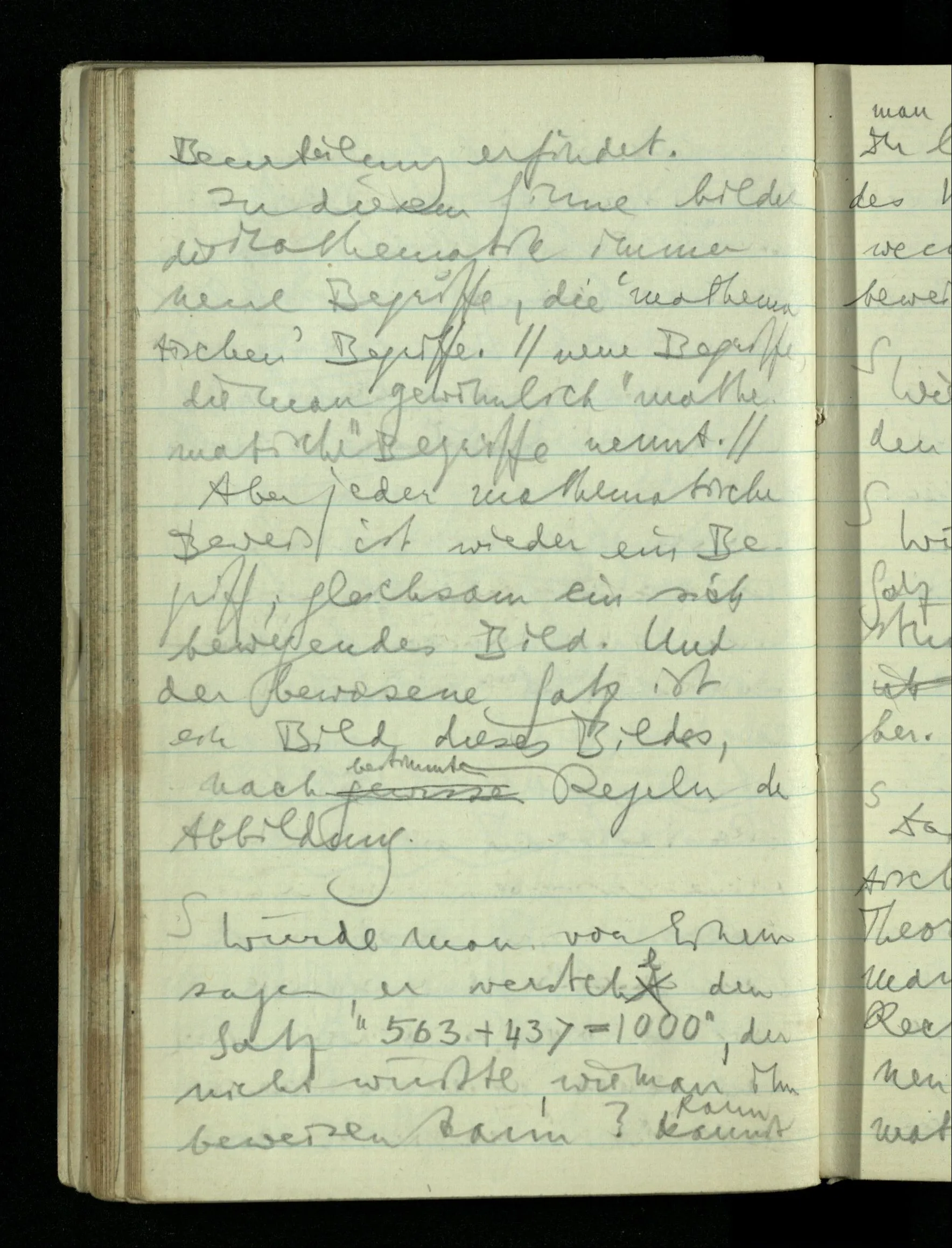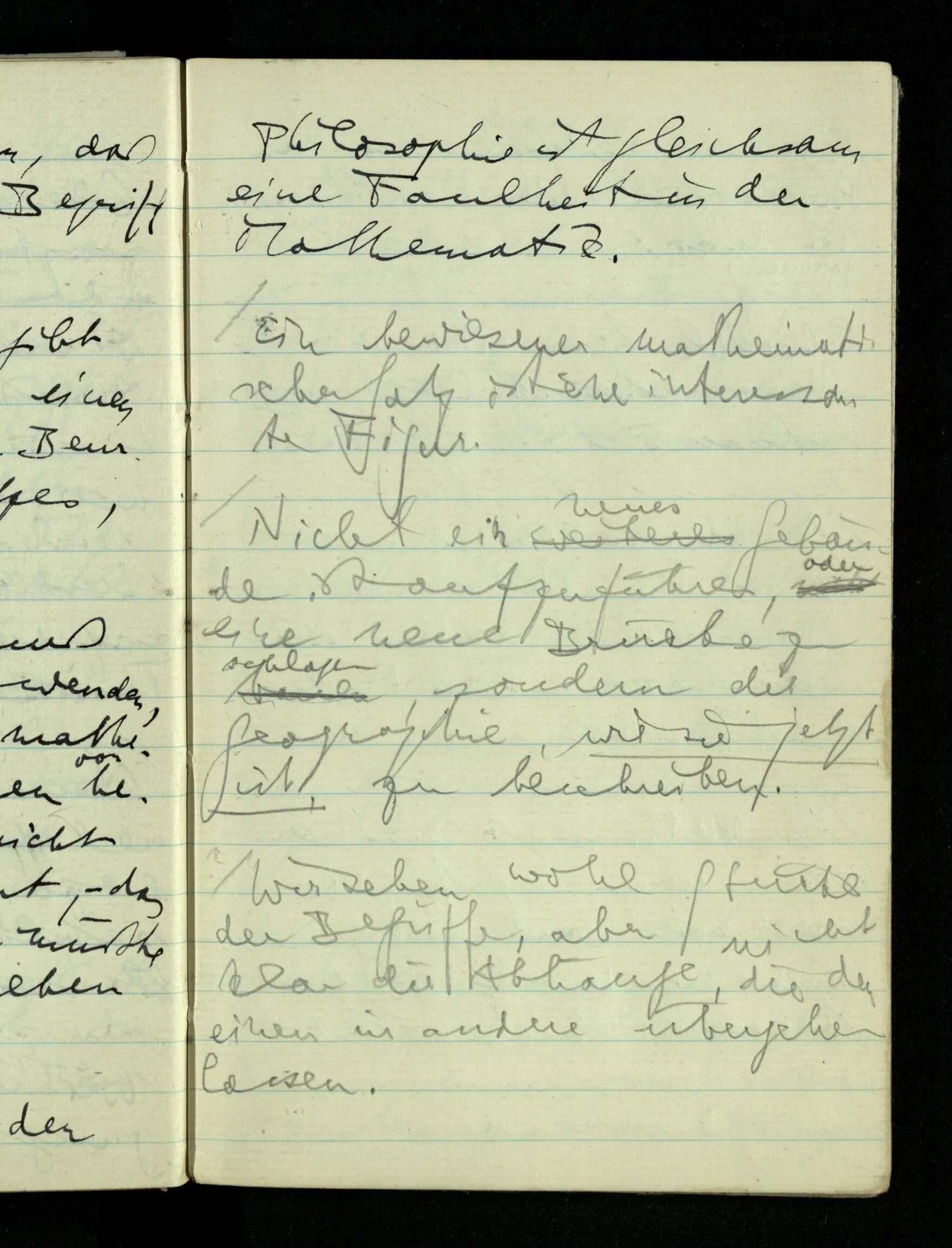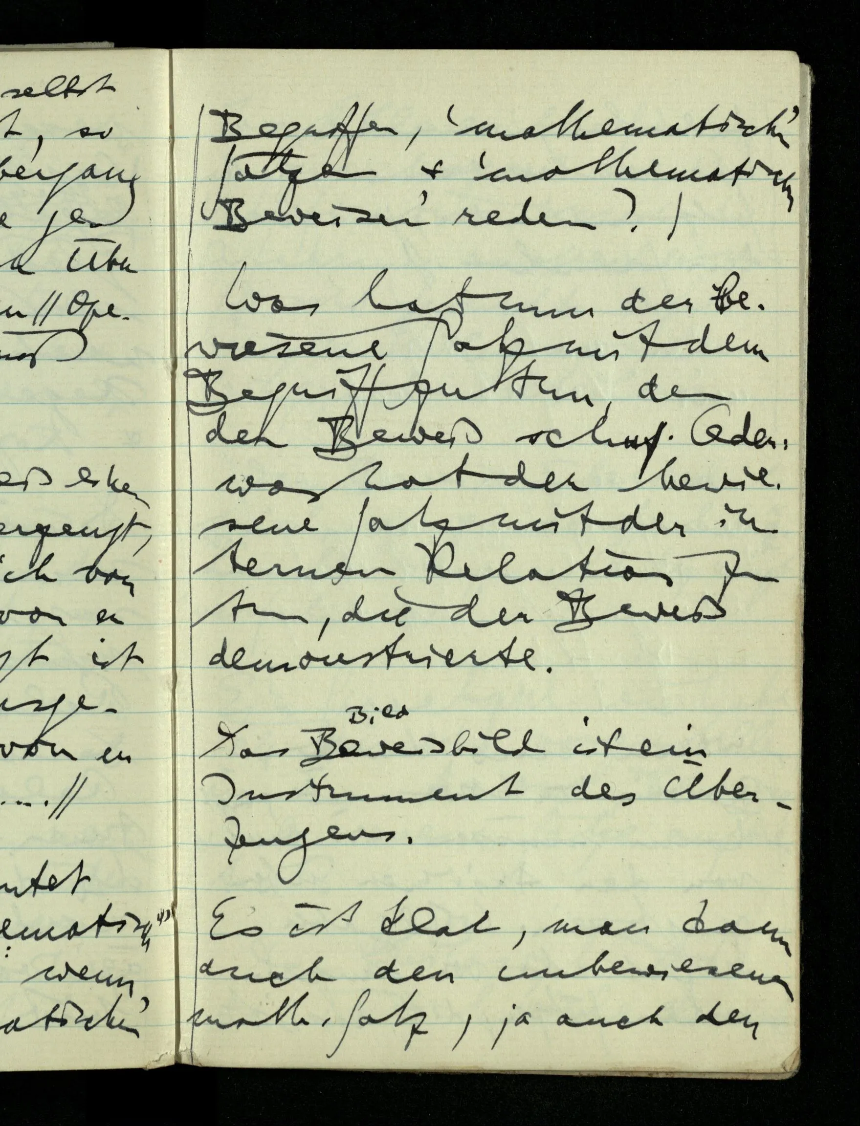 09.01.1943 Unsre Schwierigkeit fängt eigentlich schon mit der unendlichen Geraden an; obwohl wir schon als Knaben lernen, eine Gerade habe kein Ende, & ich weiß nicht, daß diese Idee irgend jemand Schwierigkeiten bereitet hätte. Wie, wenn ein Finitist versuchte diesen Begriff durch den einer geraden Strecke von bestimmter Länge zu ersetzen?!