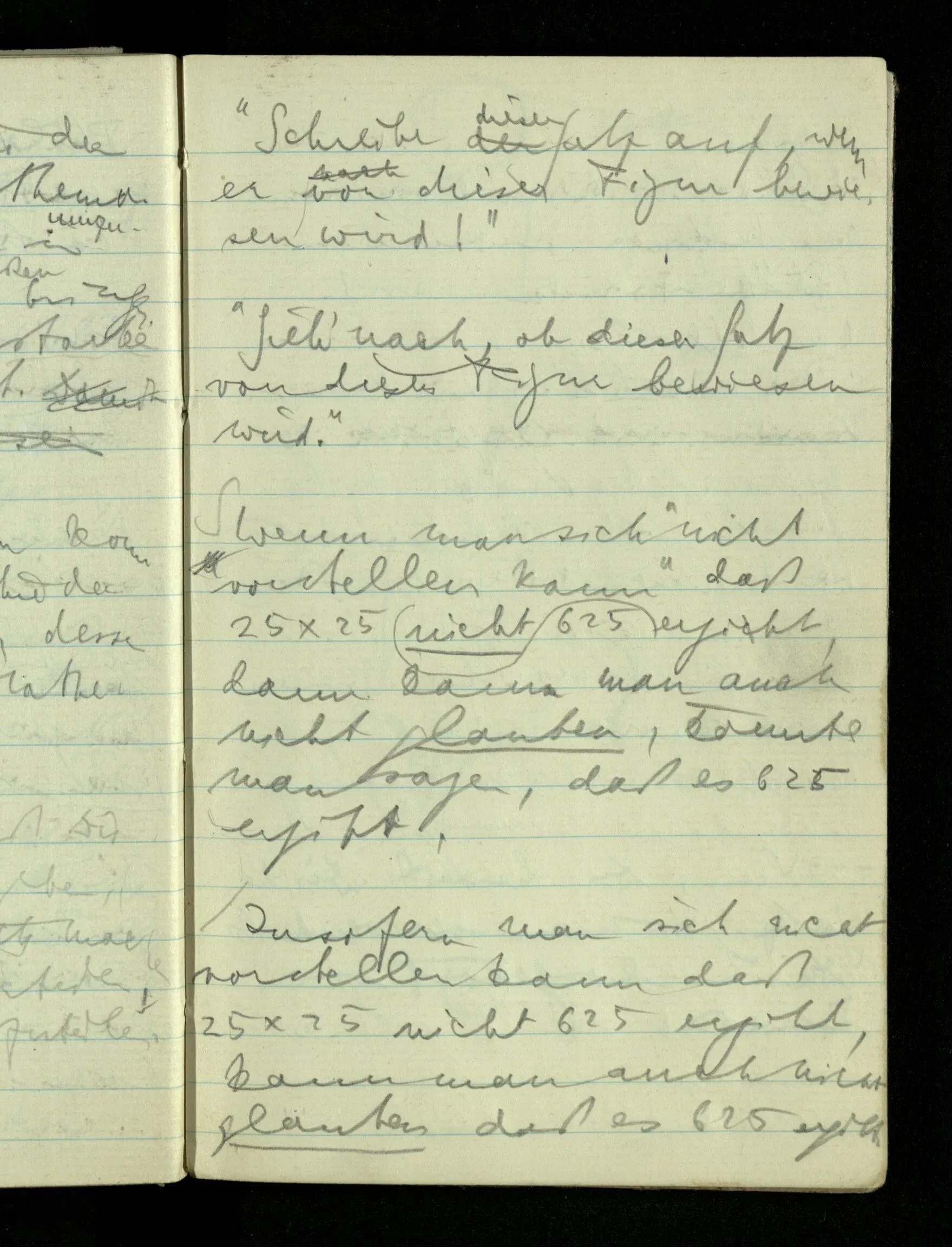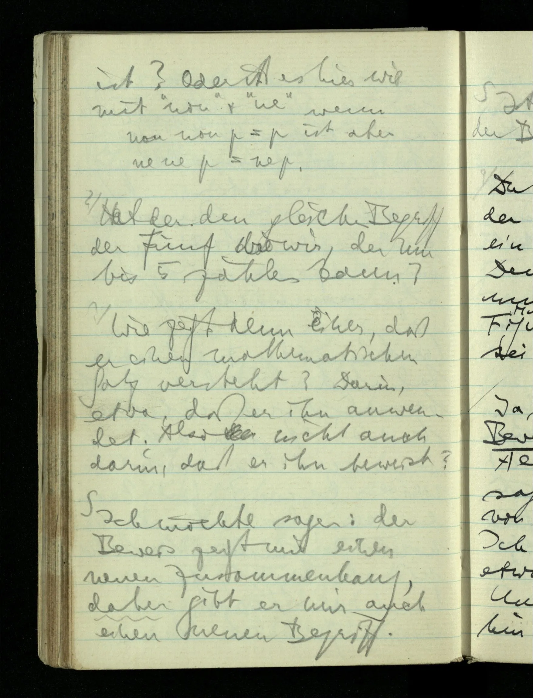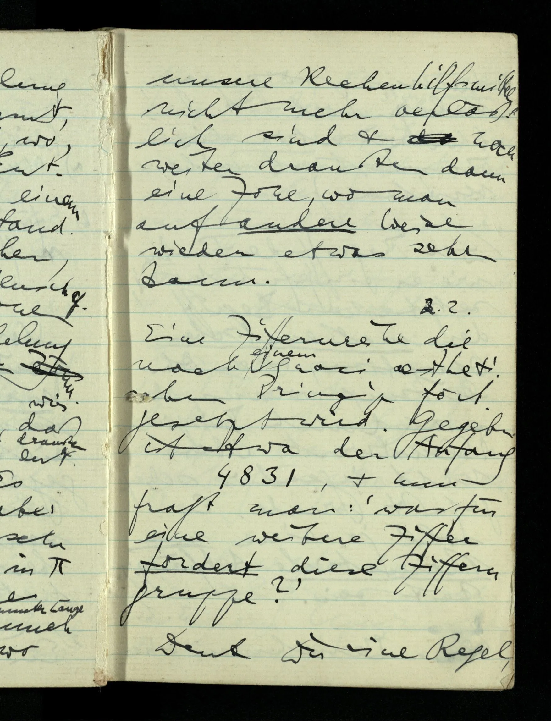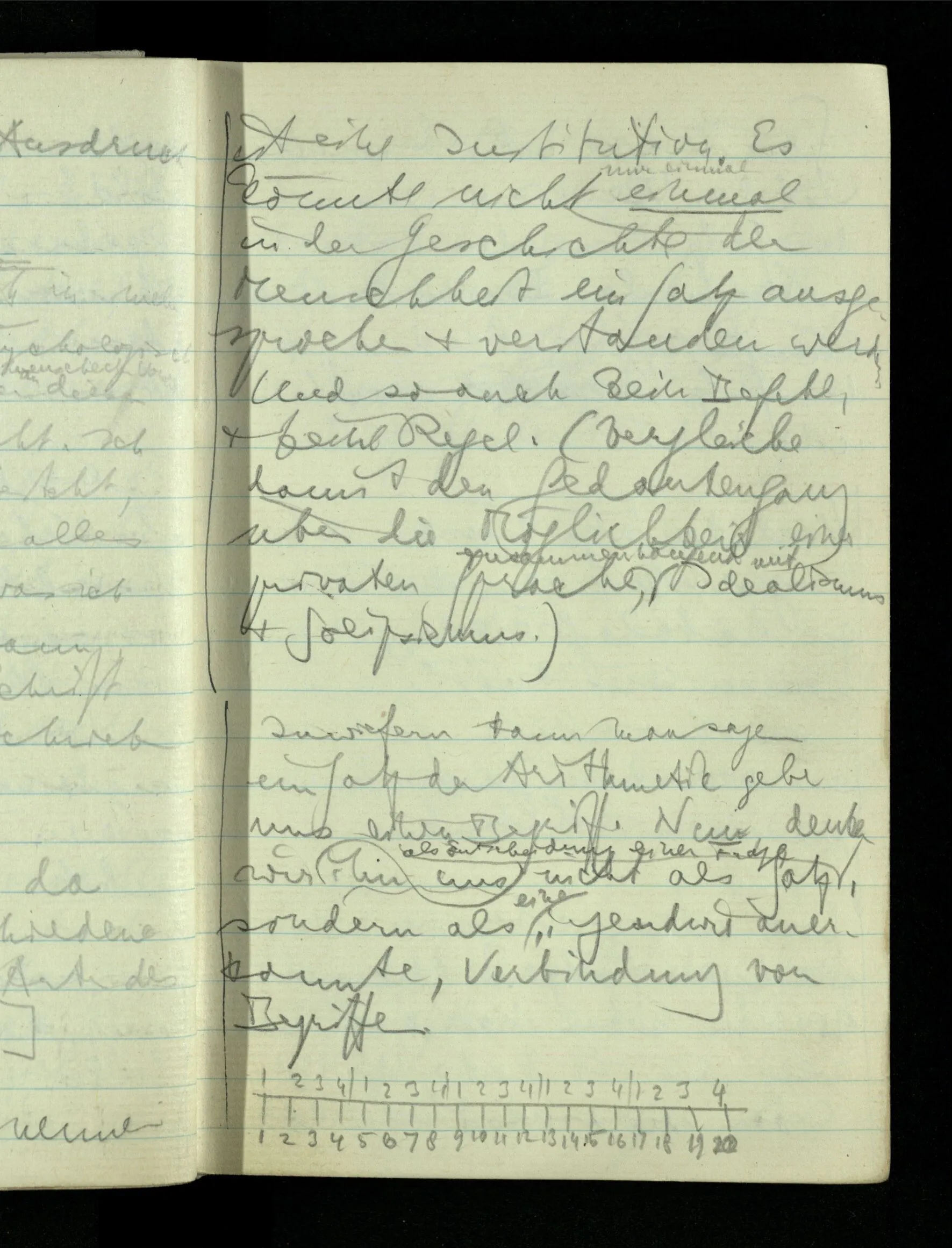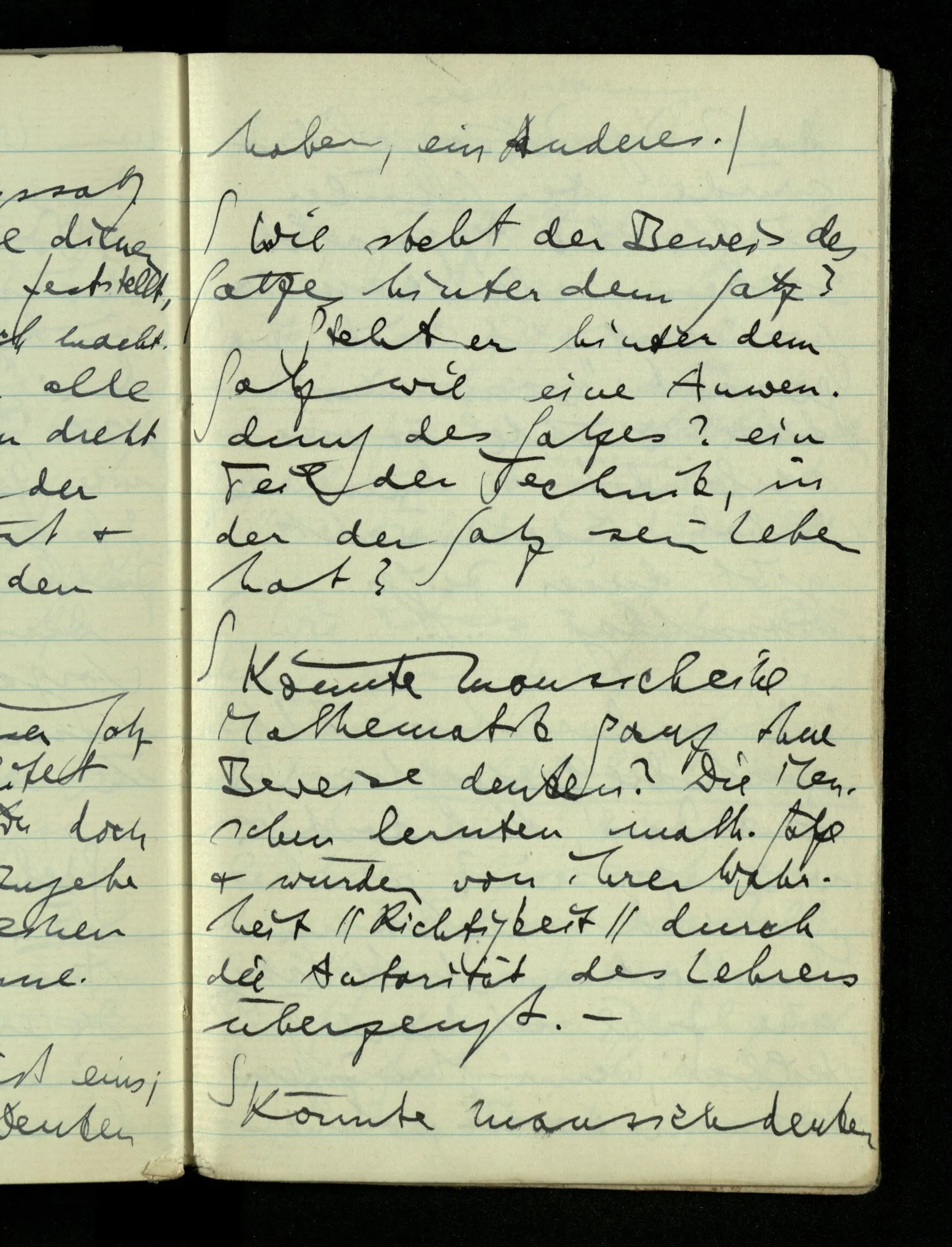 09.01.1943 Unsre Schwierigkeit fängt eigentlich schon mit der unendlichen Geraden an; obwohl wir schon als Knaben lernen, eine Gerade habe kein Ende, & ich weiß nicht, daß diese Idee irgend jemand Schwierigkeiten bereitet hätte. Wie, wenn ein Finitist versuchte diesen Begriff durch den einer geraden Strecke von bestimmter Länge zu ersetzen?!