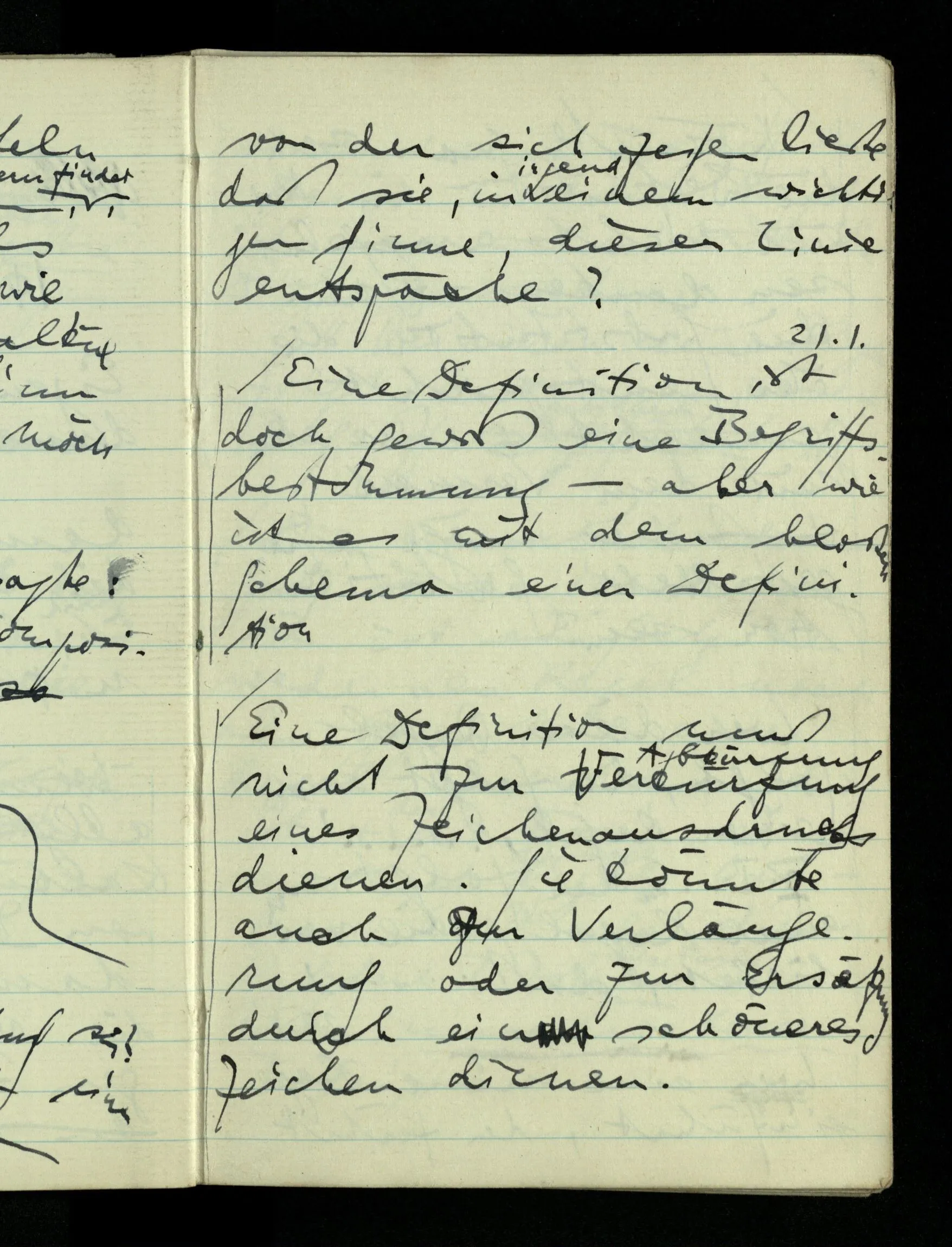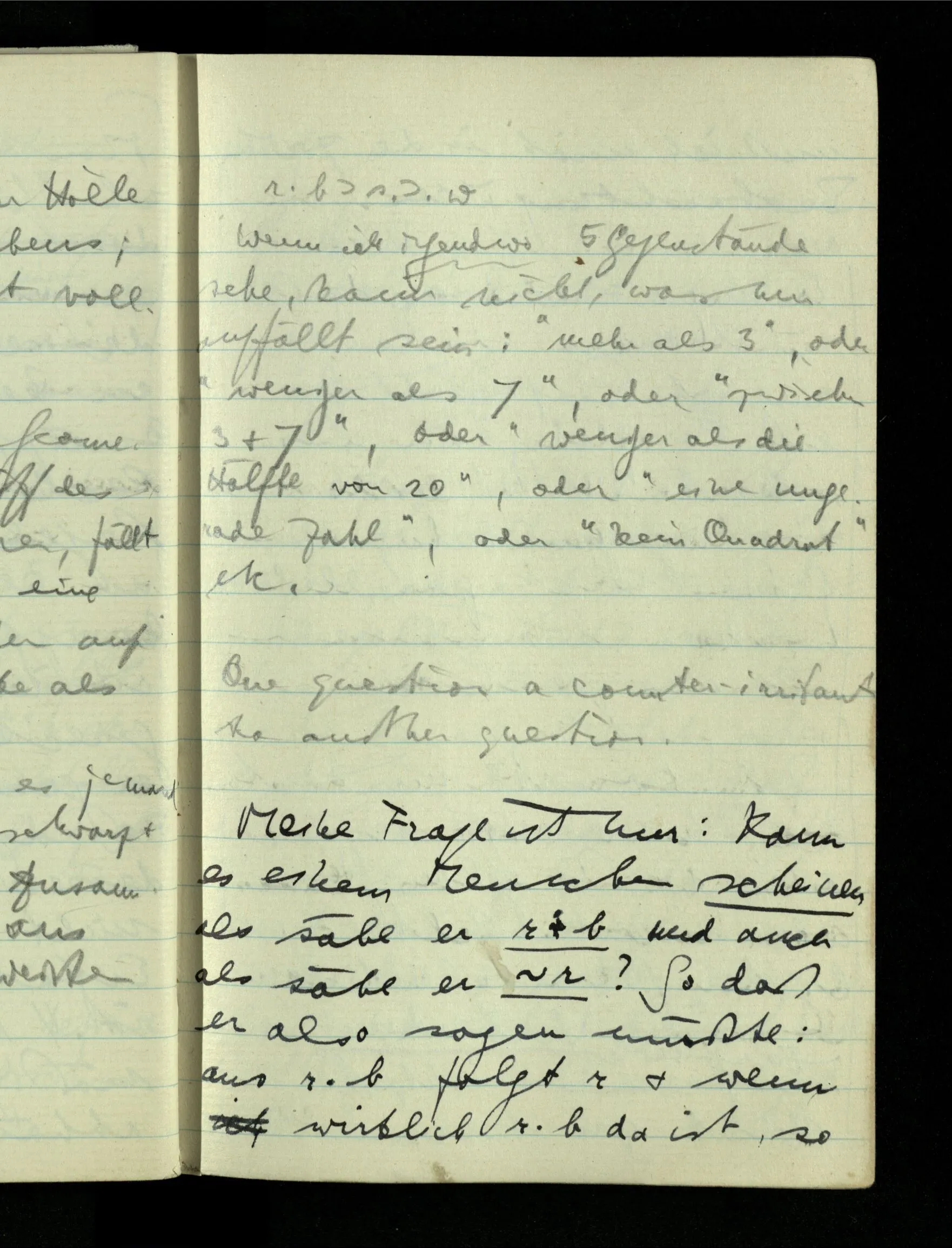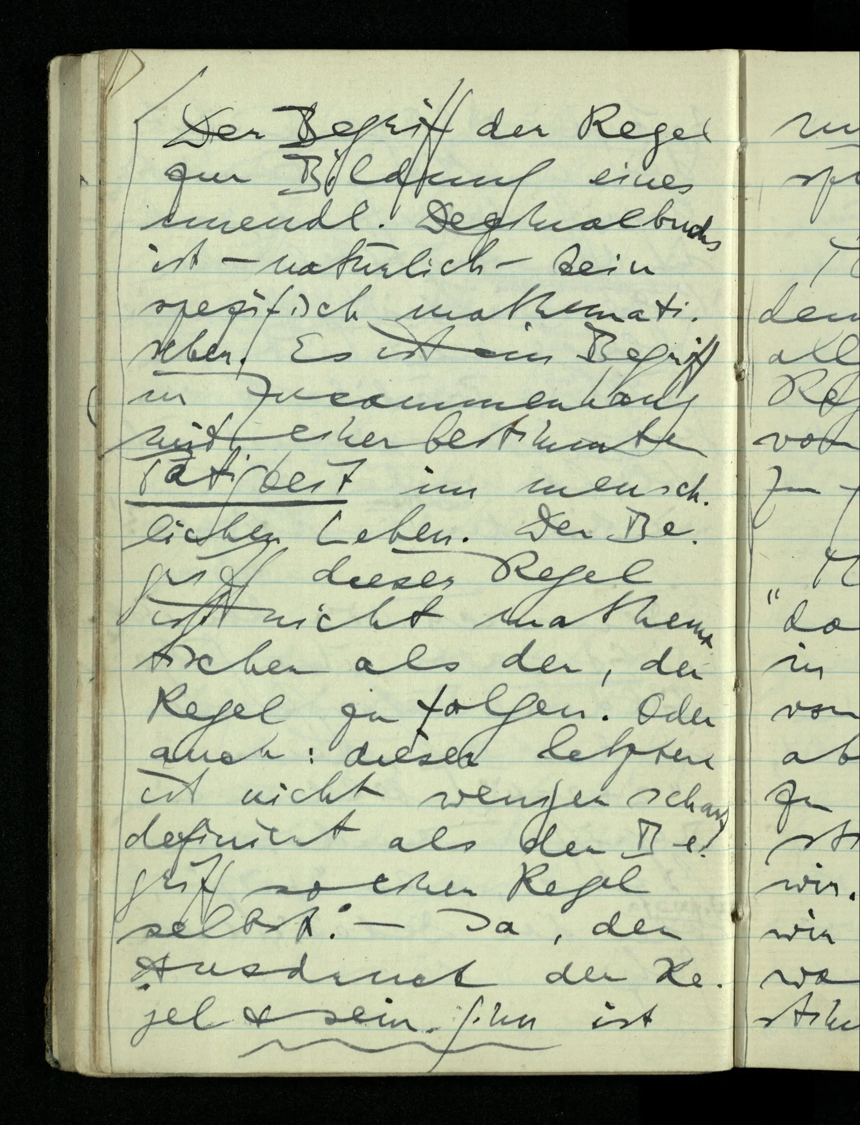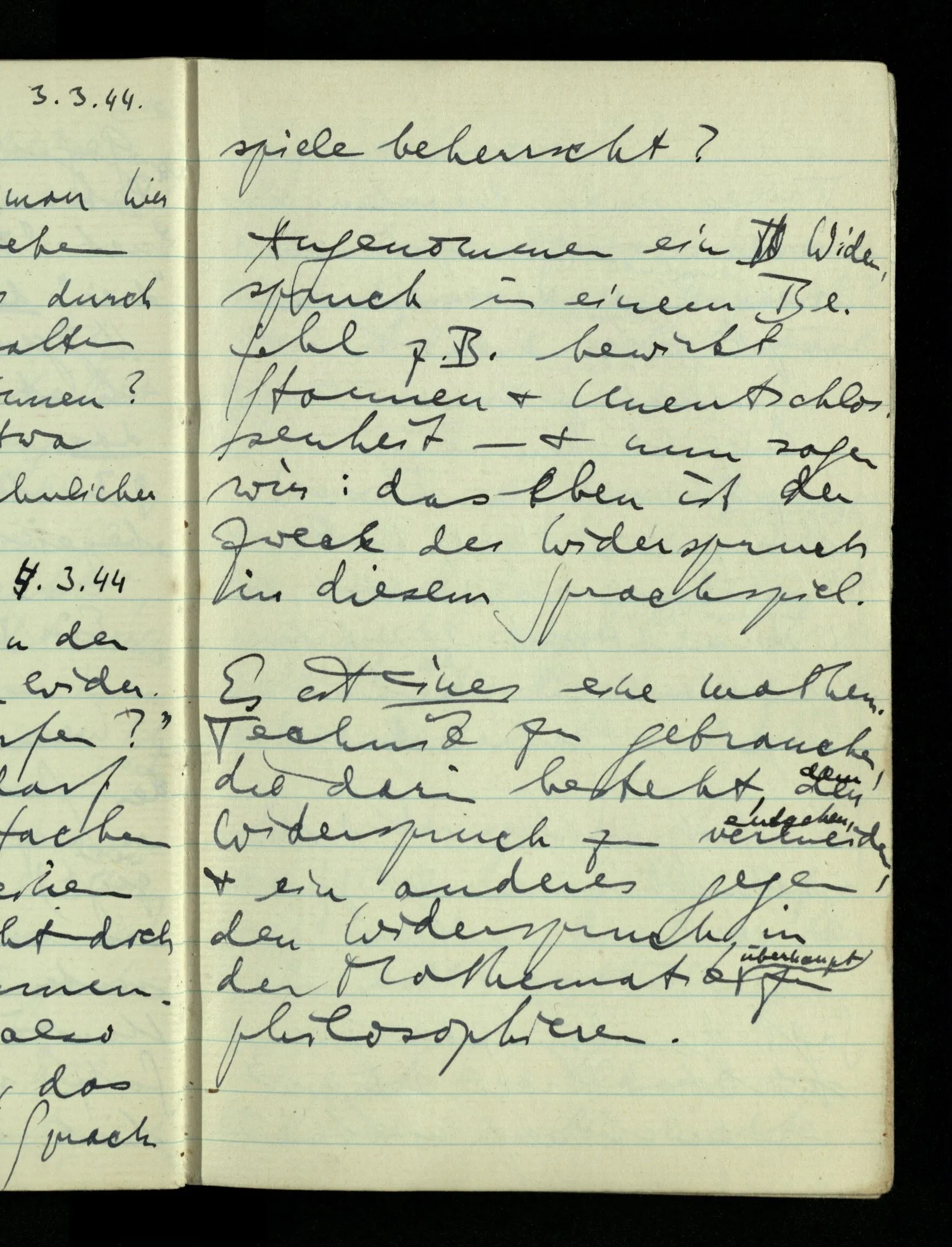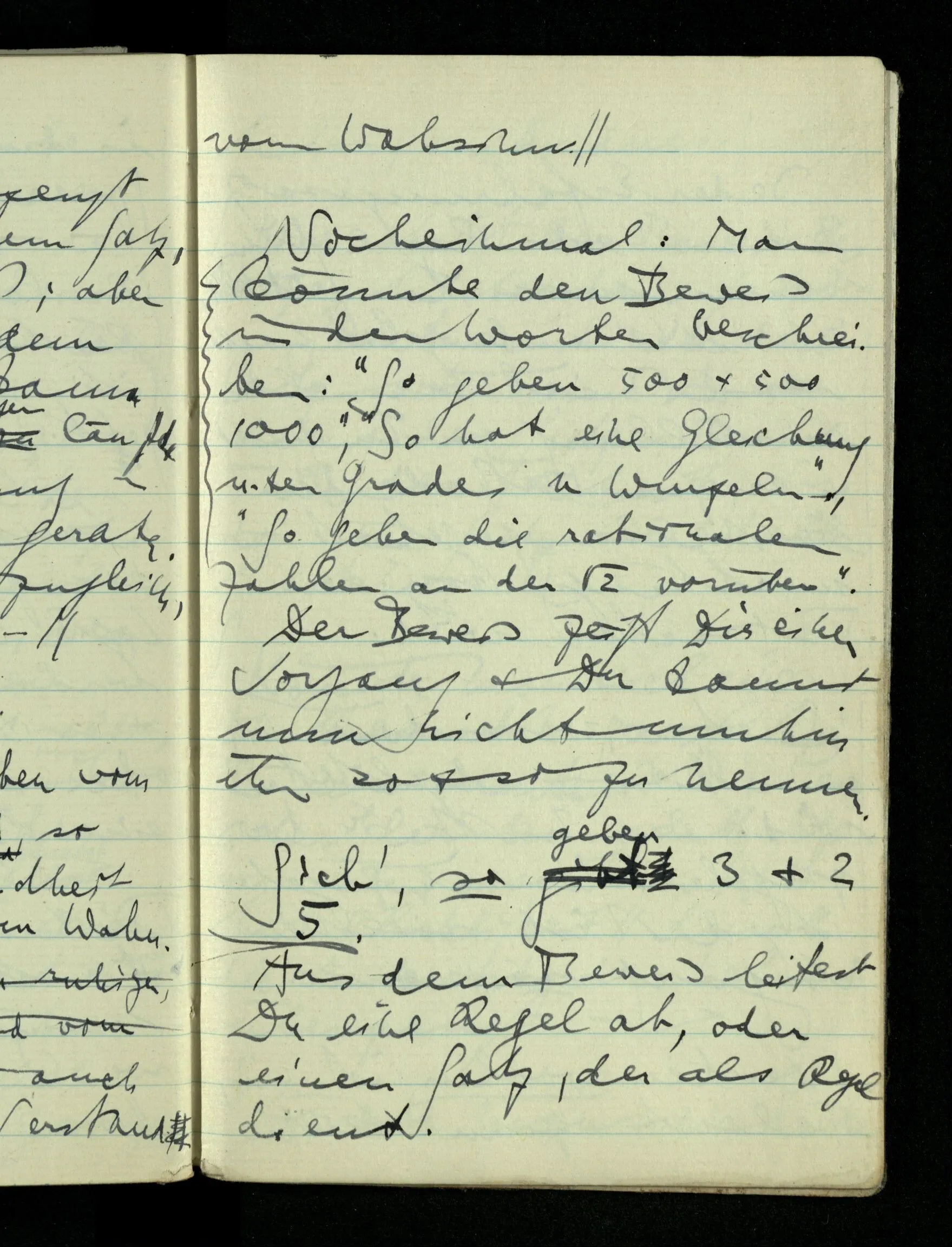 09.01.1943 Unsre Schwierigkeit fängt eigentlich schon mit der unendlichen Geraden an; obwohl wir schon als Knaben lernen, eine Gerade habe kein Ende, & ich weiß nicht, daß diese Idee irgend jemand Schwierigkeiten bereitet hätte. Wie, wenn ein Finitist versuchte diesen Begriff durch den einer geraden Strecke von bestimmter Länge zu ersetzen?!