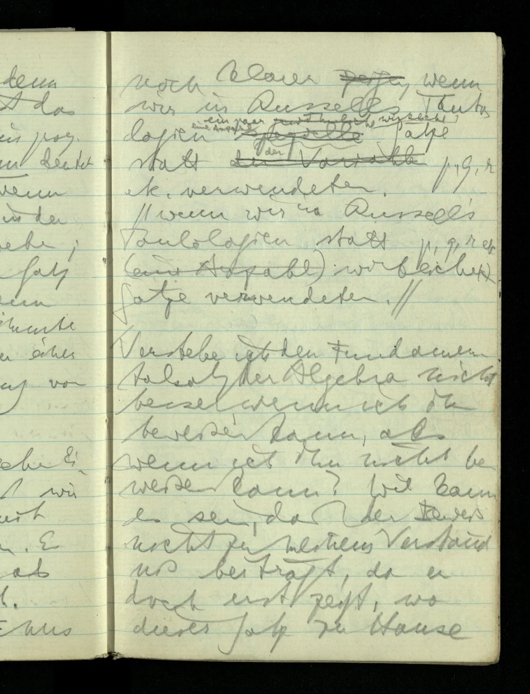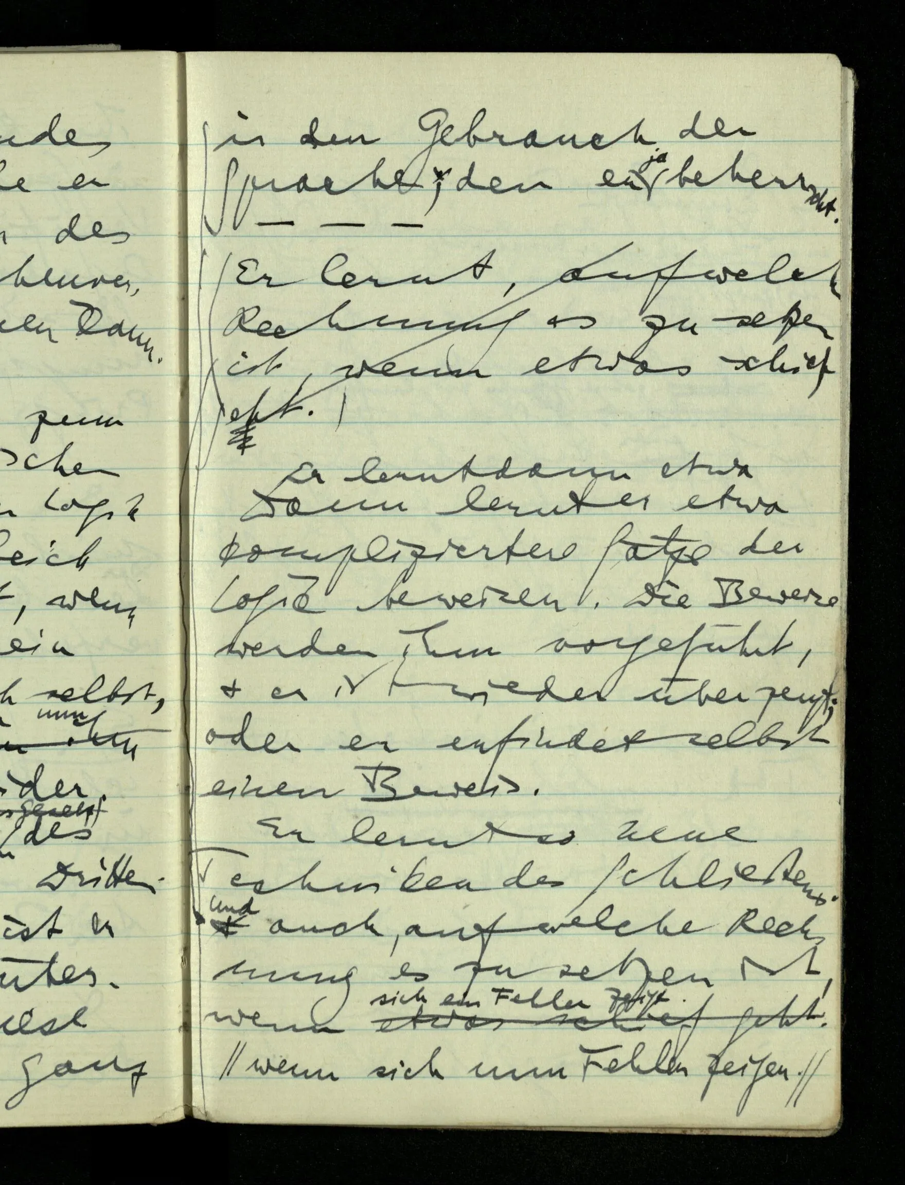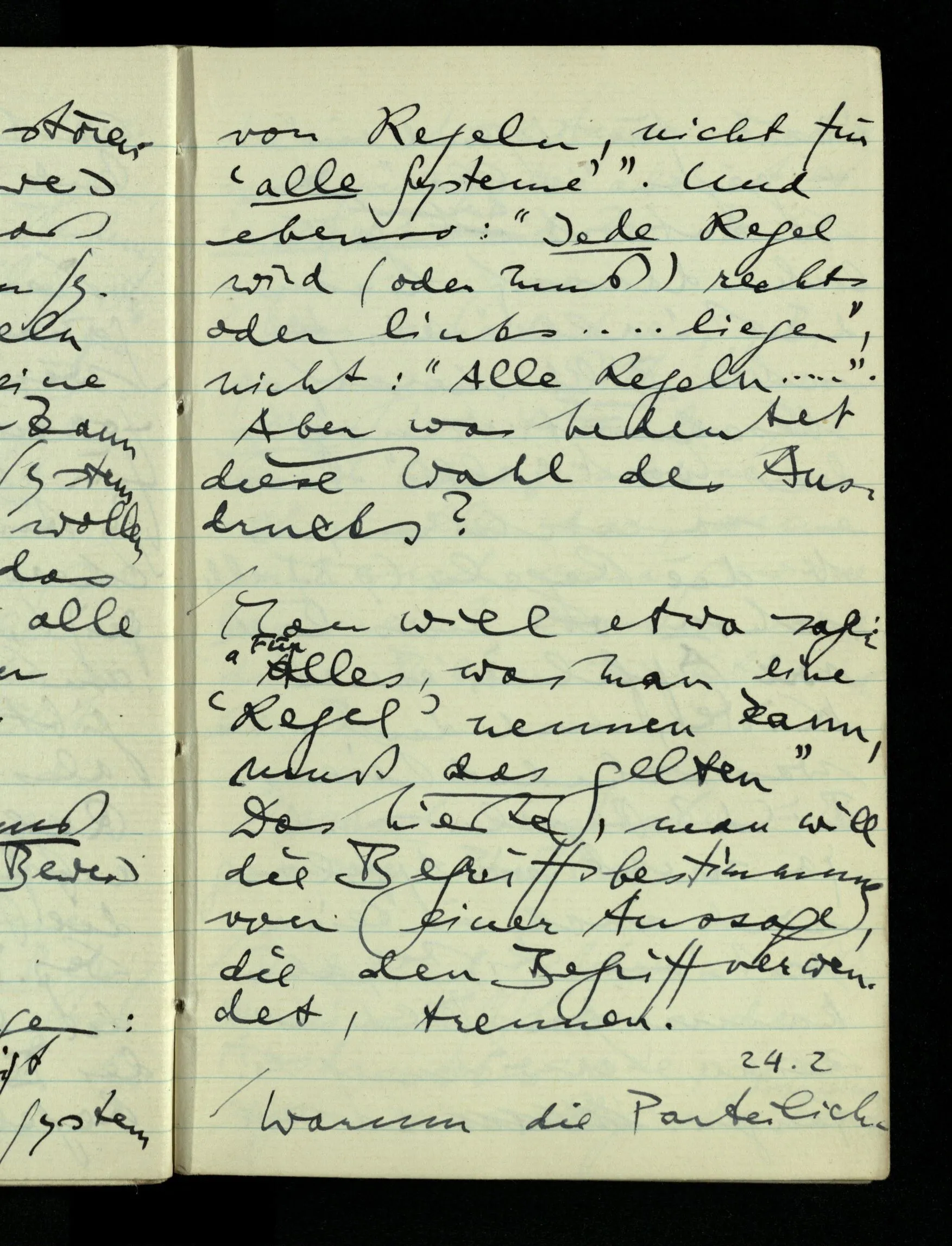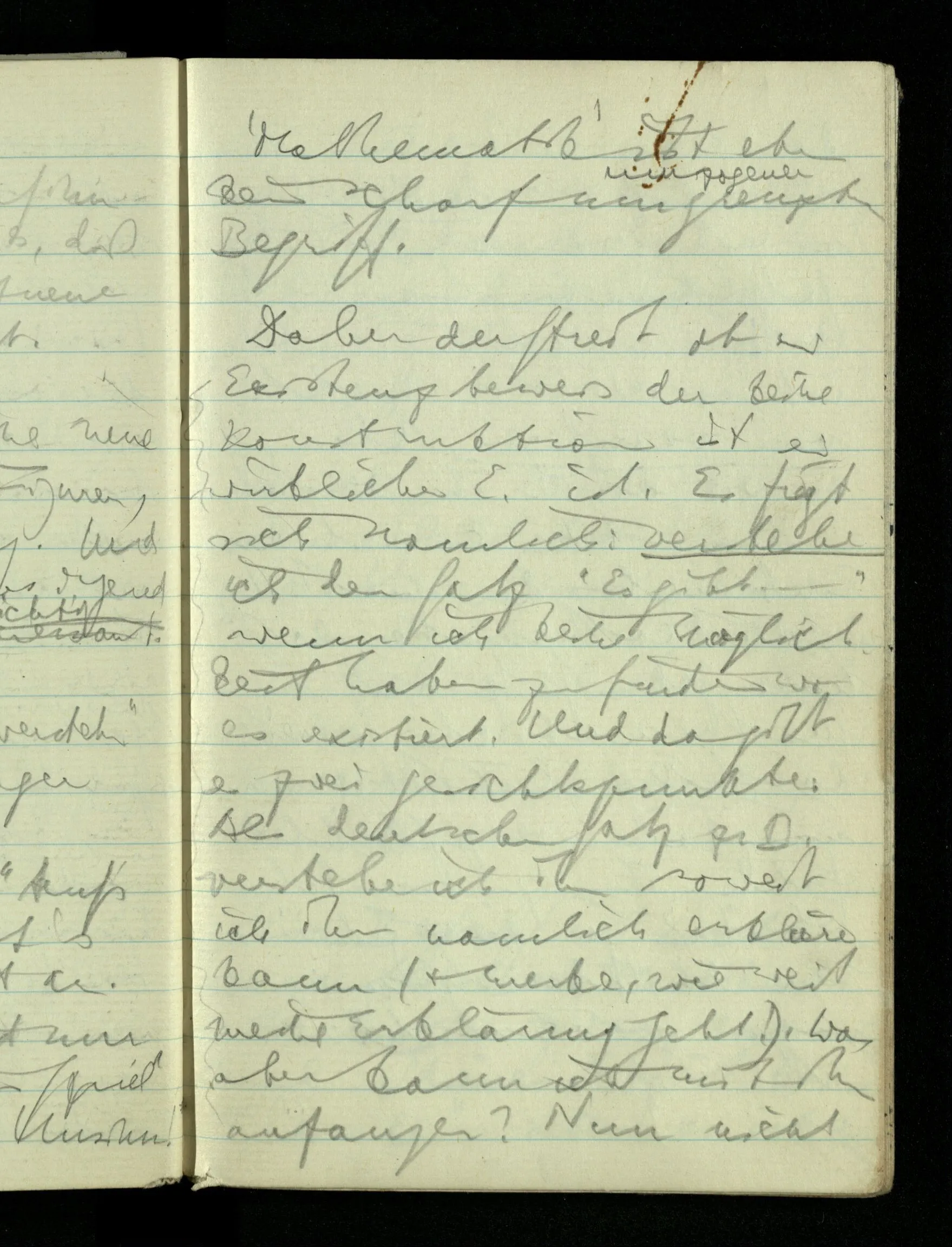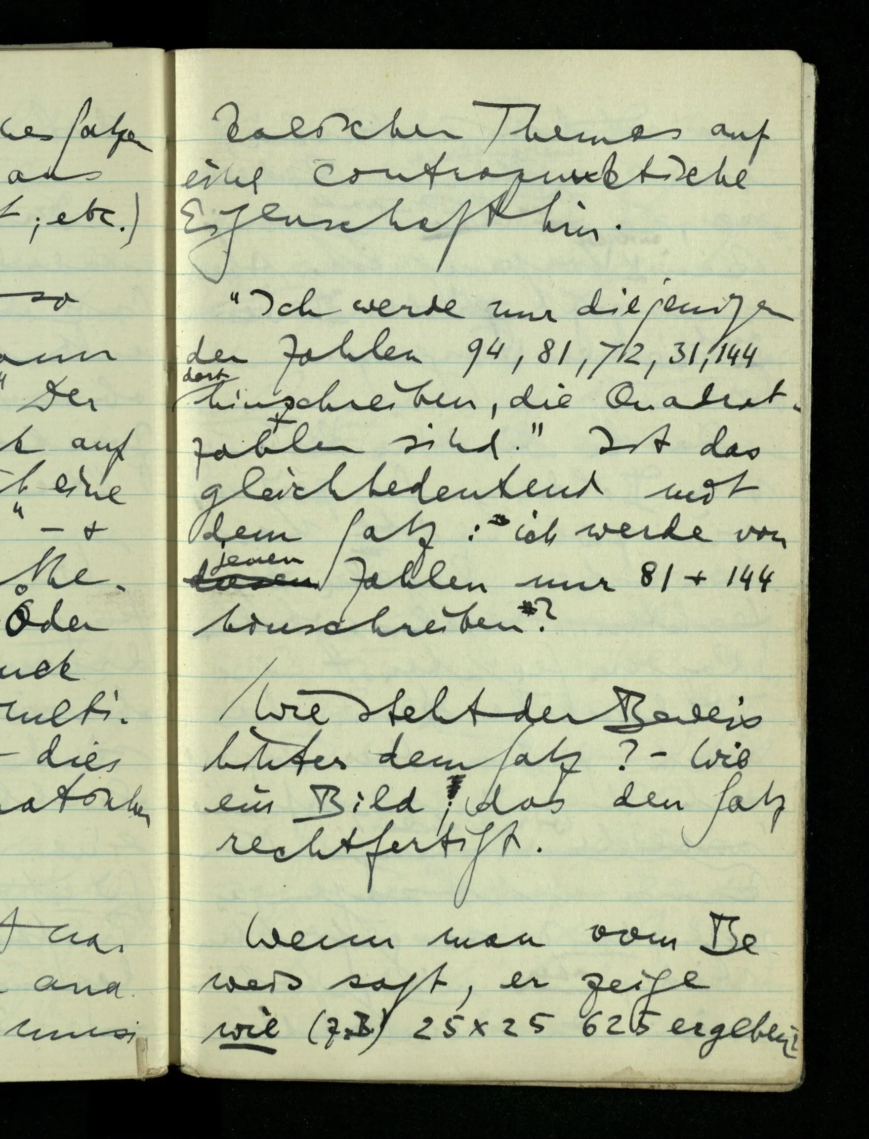 09.01.1943 Unsre Schwierigkeit fängt eigentlich schon mit der unendlichen Geraden an; obwohl wir schon als Knaben lernen, eine Gerade habe kein Ende, & ich weiß nicht, daß diese Idee irgend jemand Schwierigkeiten bereitet hätte. Wie, wenn ein Finitist versuchte diesen Begriff durch den einer geraden Strecke von bestimmter Länge zu ersetzen?!