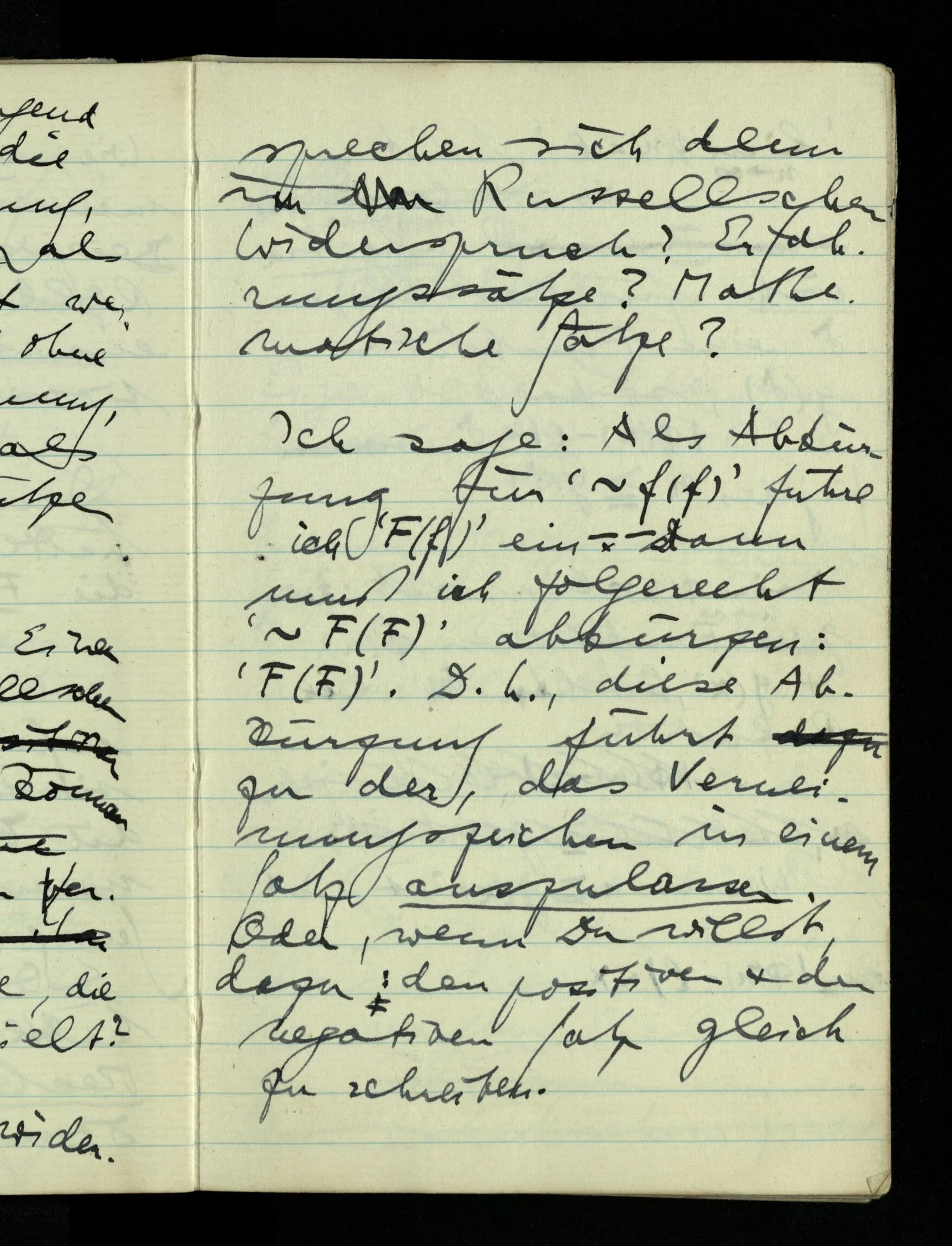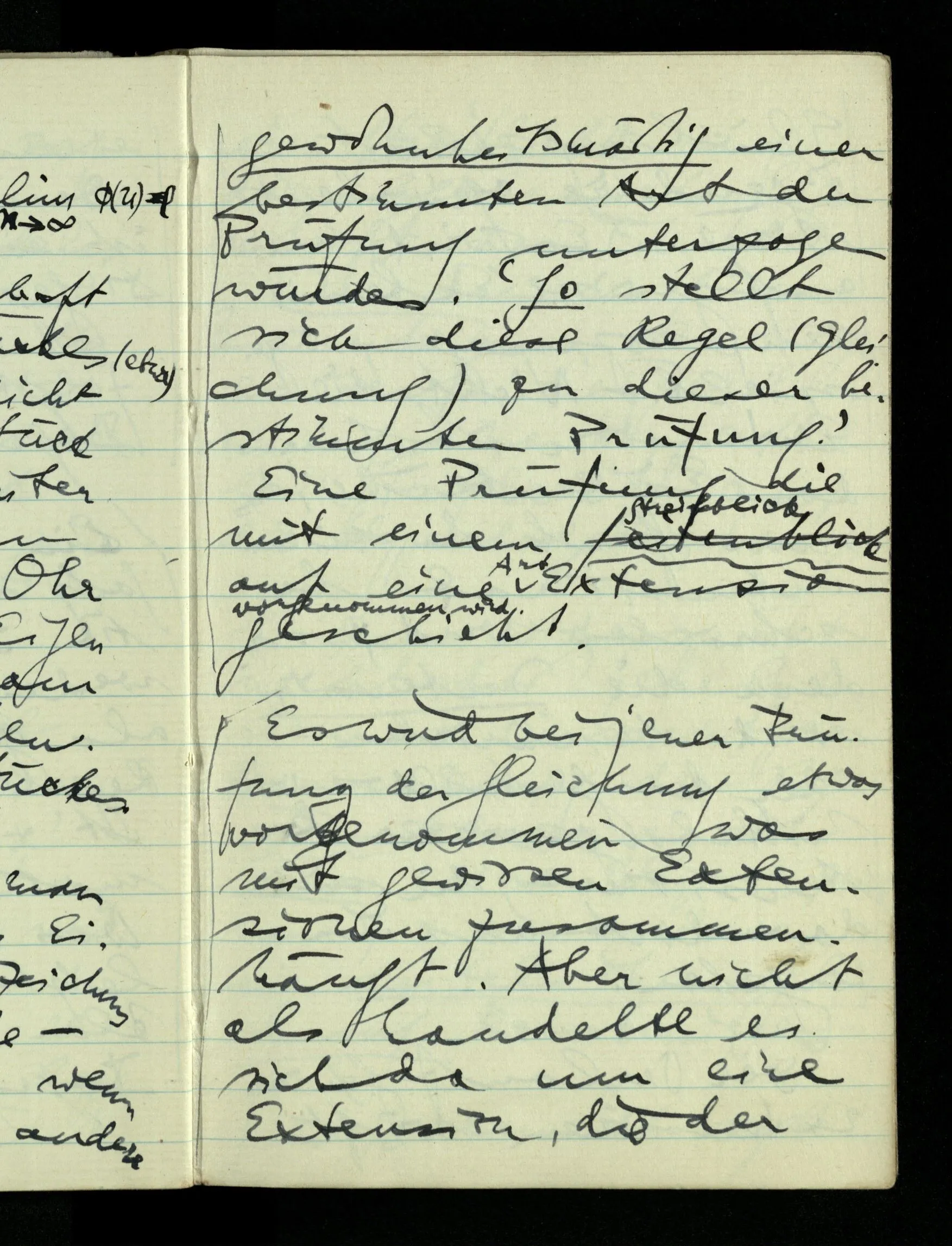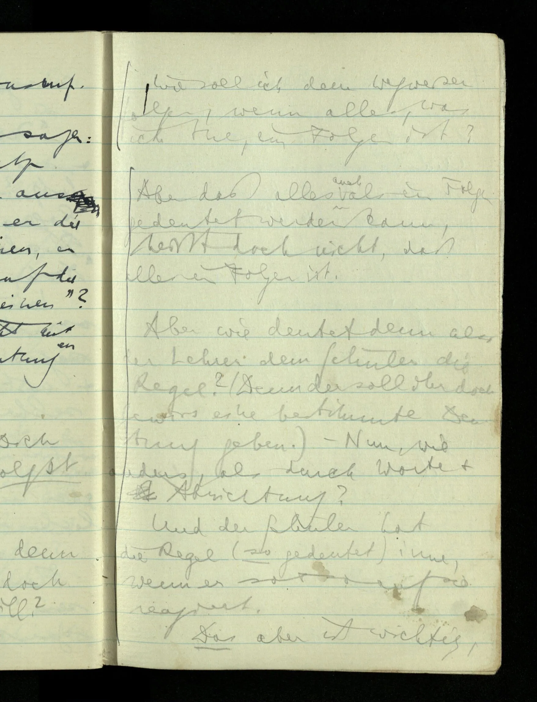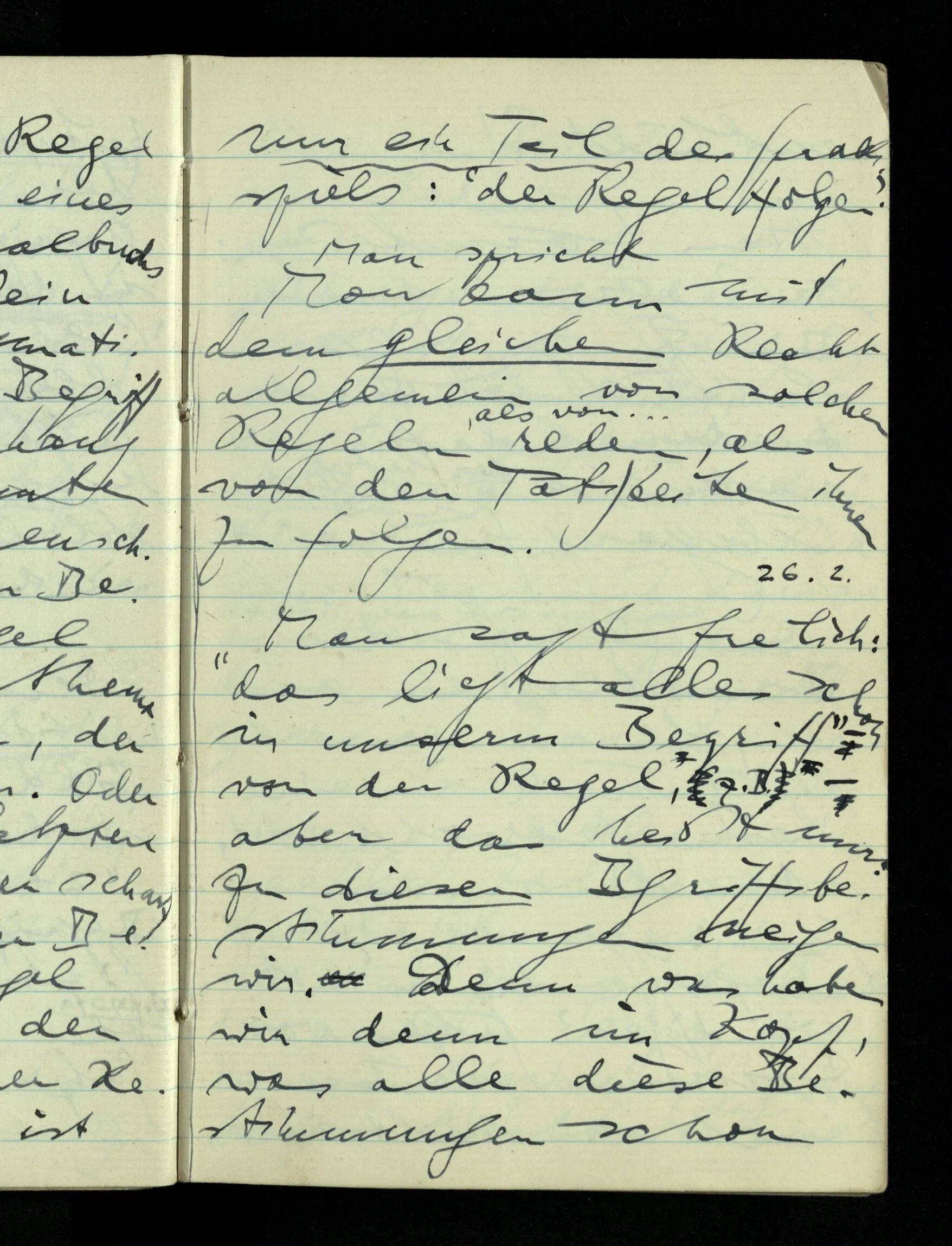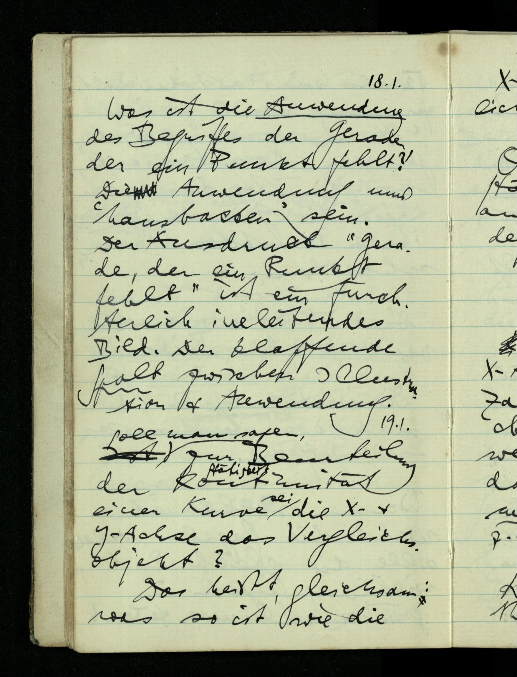 09.01.1943 Unsre Schwierigkeit fängt eigentlich schon mit der unendlichen Geraden an; obwohl wir schon als Knaben lernen, eine Gerade habe kein Ende, & ich weiß nicht, daß diese Idee irgend jemand Schwierigkeiten bereitet hätte. Wie, wenn ein Finitist versuchte diesen Begriff durch den einer geraden Strecke von bestimmter Länge zu ersetzen?!