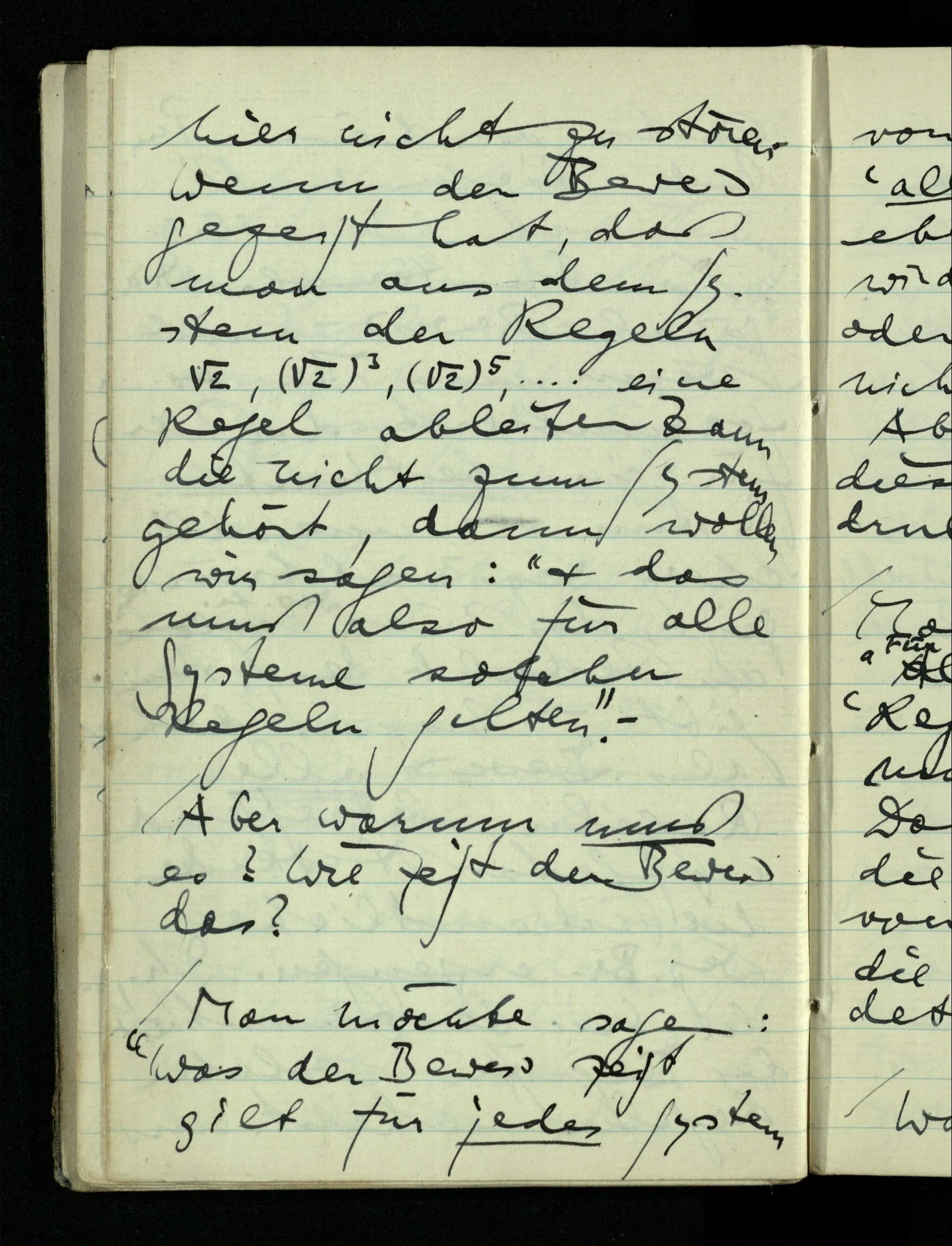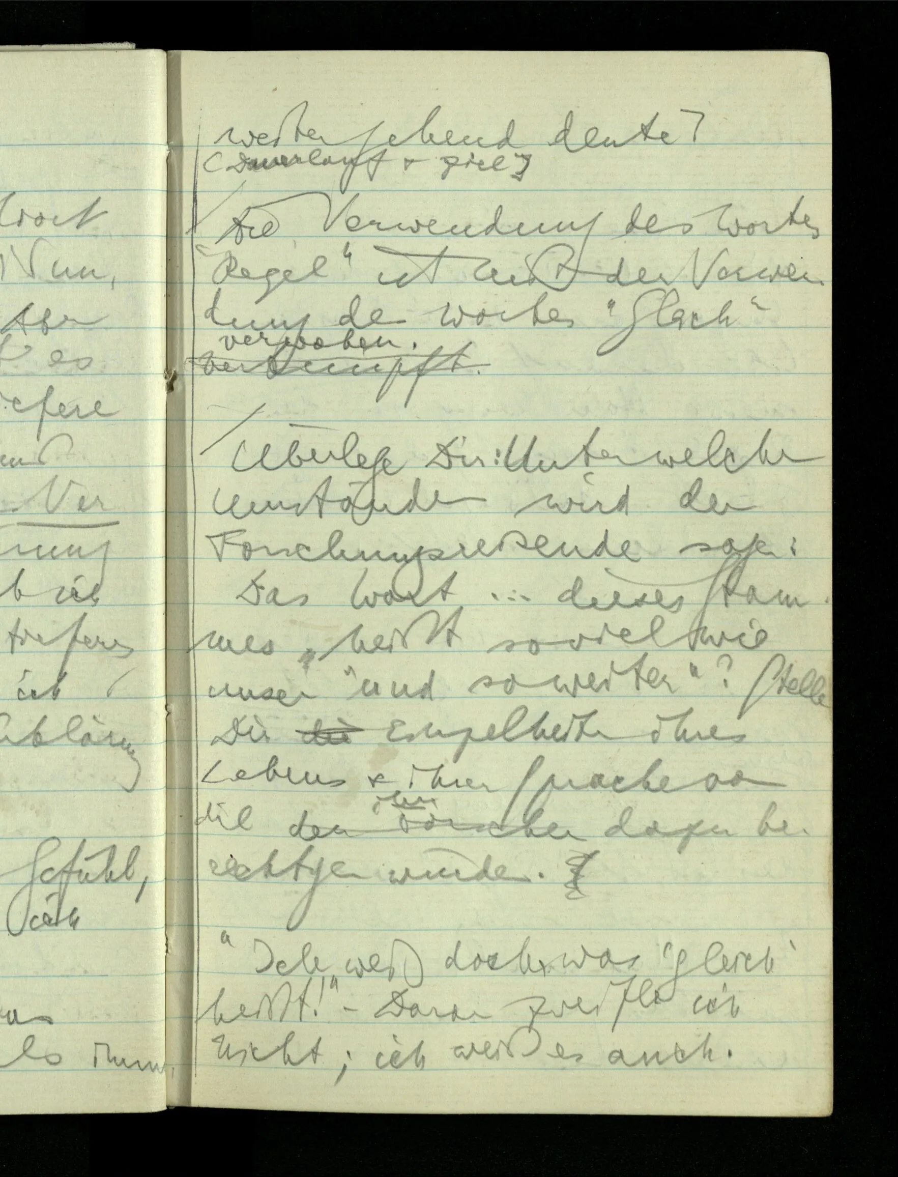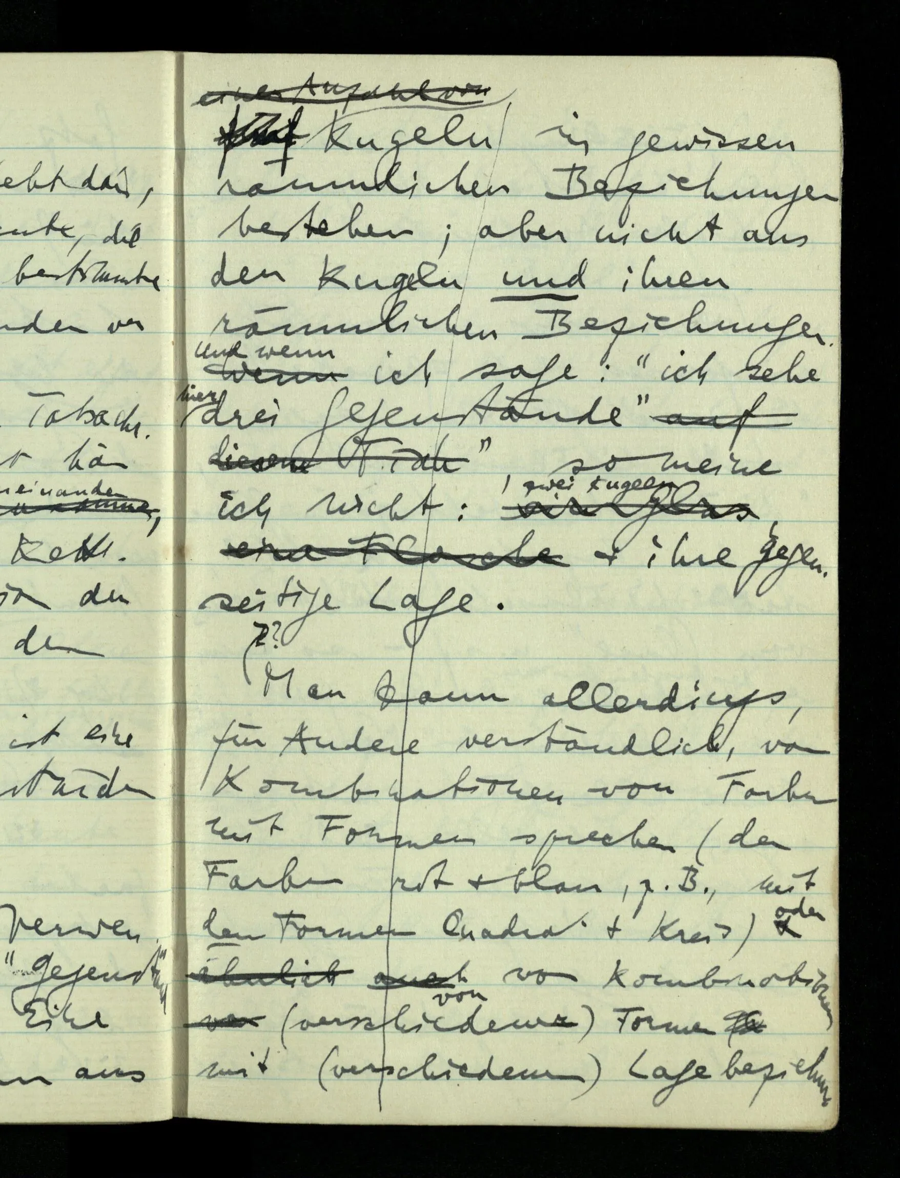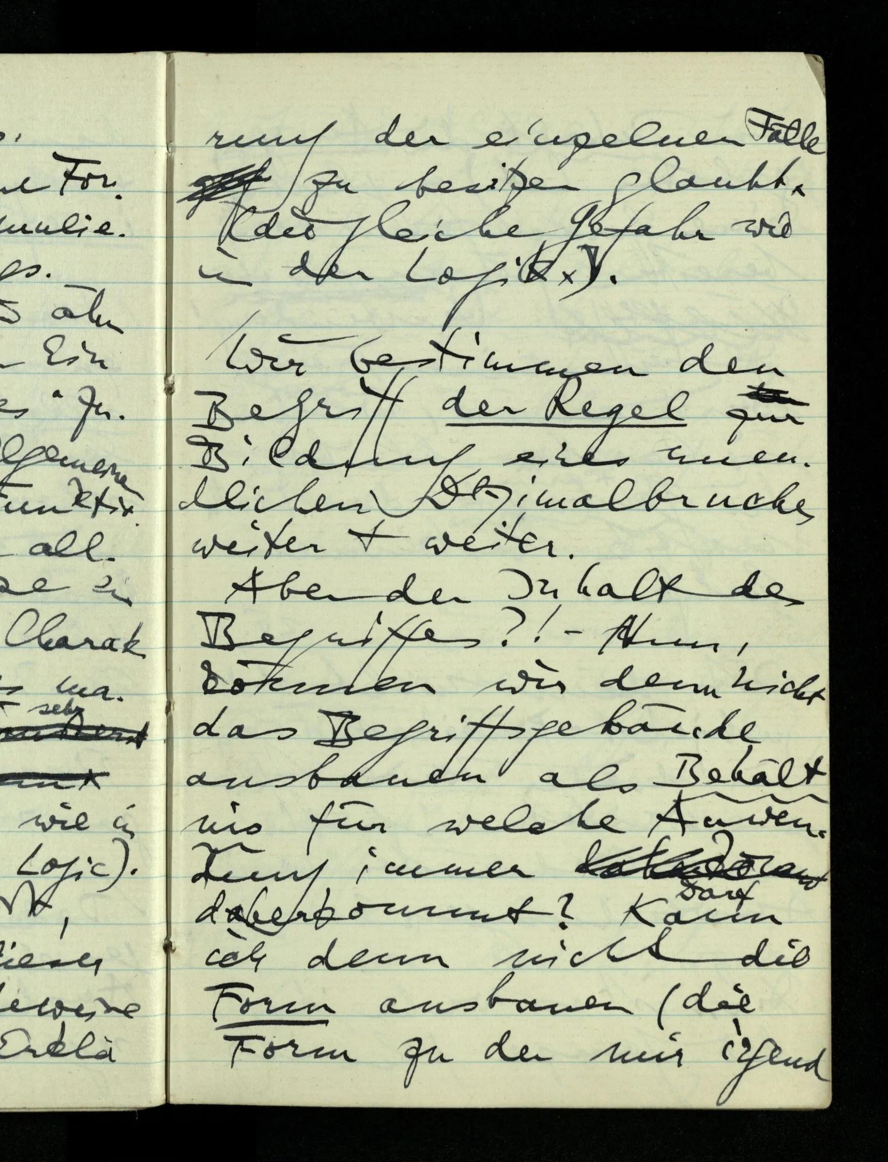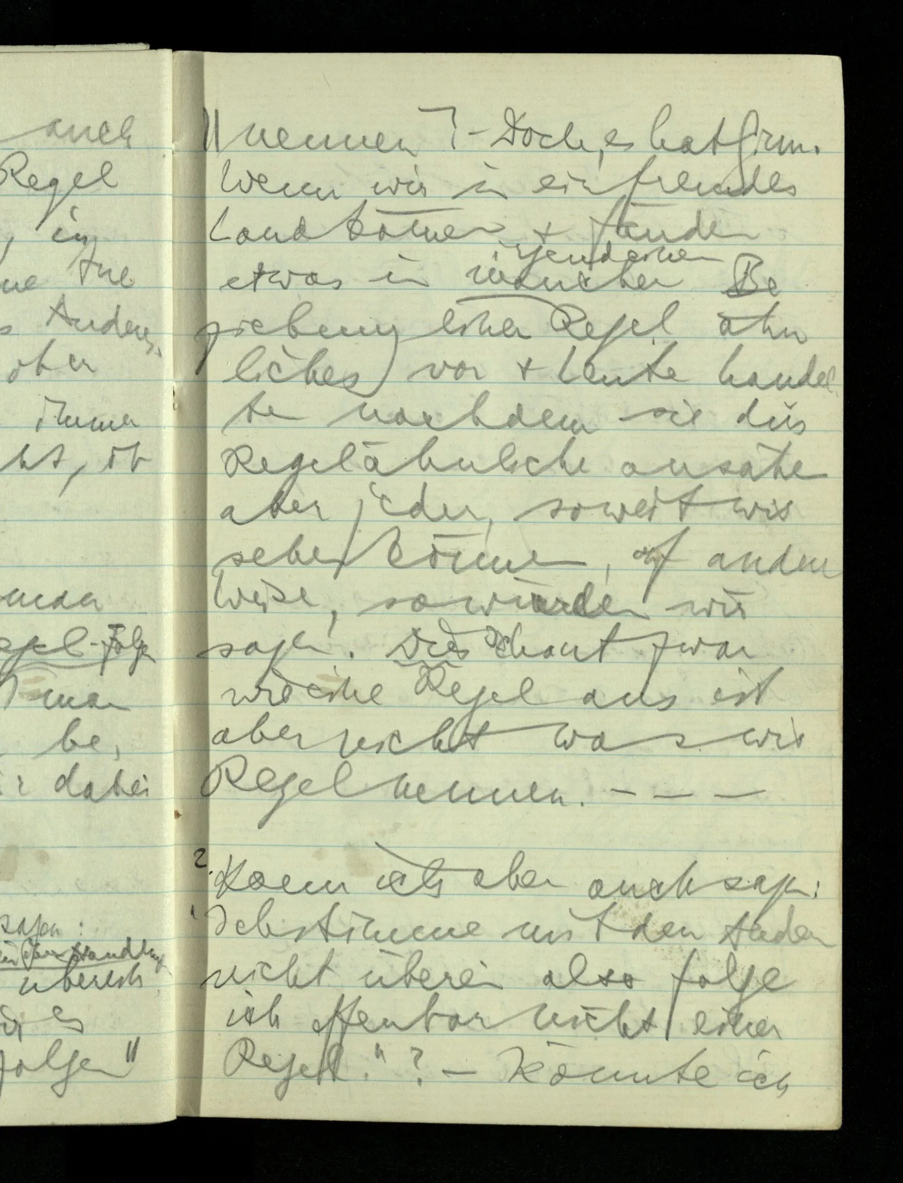 09.01.1943 Unsre Schwierigkeit fängt eigentlich schon mit der unendlichen Geraden an; obwohl wir schon als Knaben lernen, eine Gerade habe kein Ende, & ich weiß nicht, daß diese Idee irgend jemand Schwierigkeiten bereitet hätte. Wie, wenn ein Finitist versuchte diesen Begriff durch den einer geraden Strecke von bestimmter Länge zu ersetzen?!
