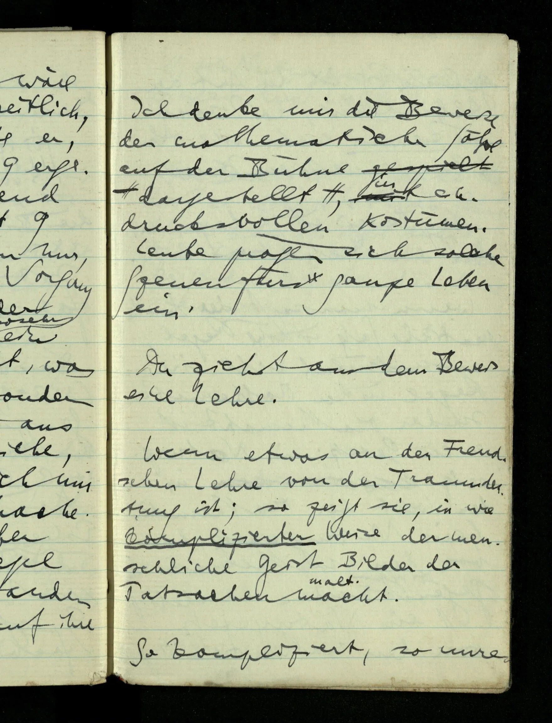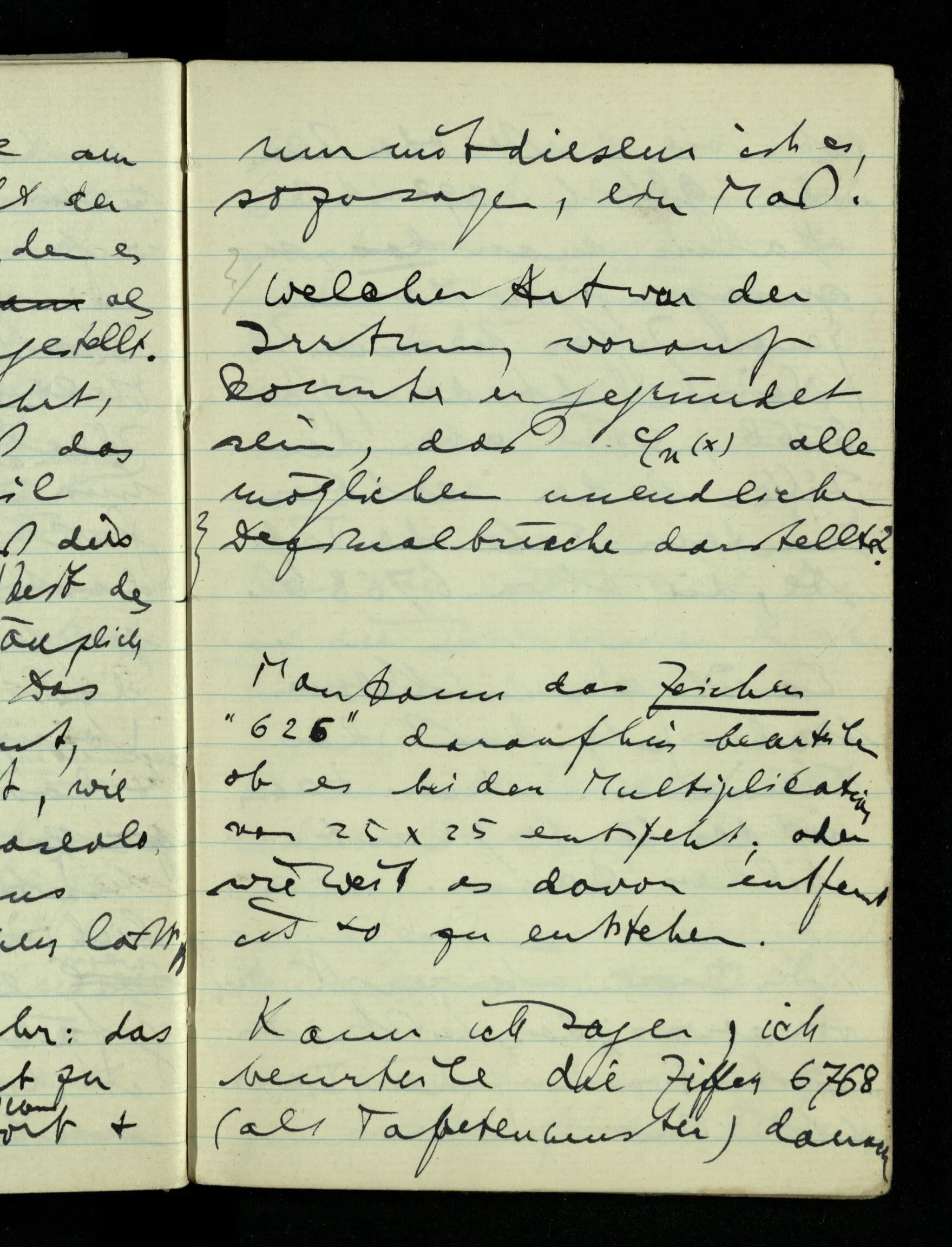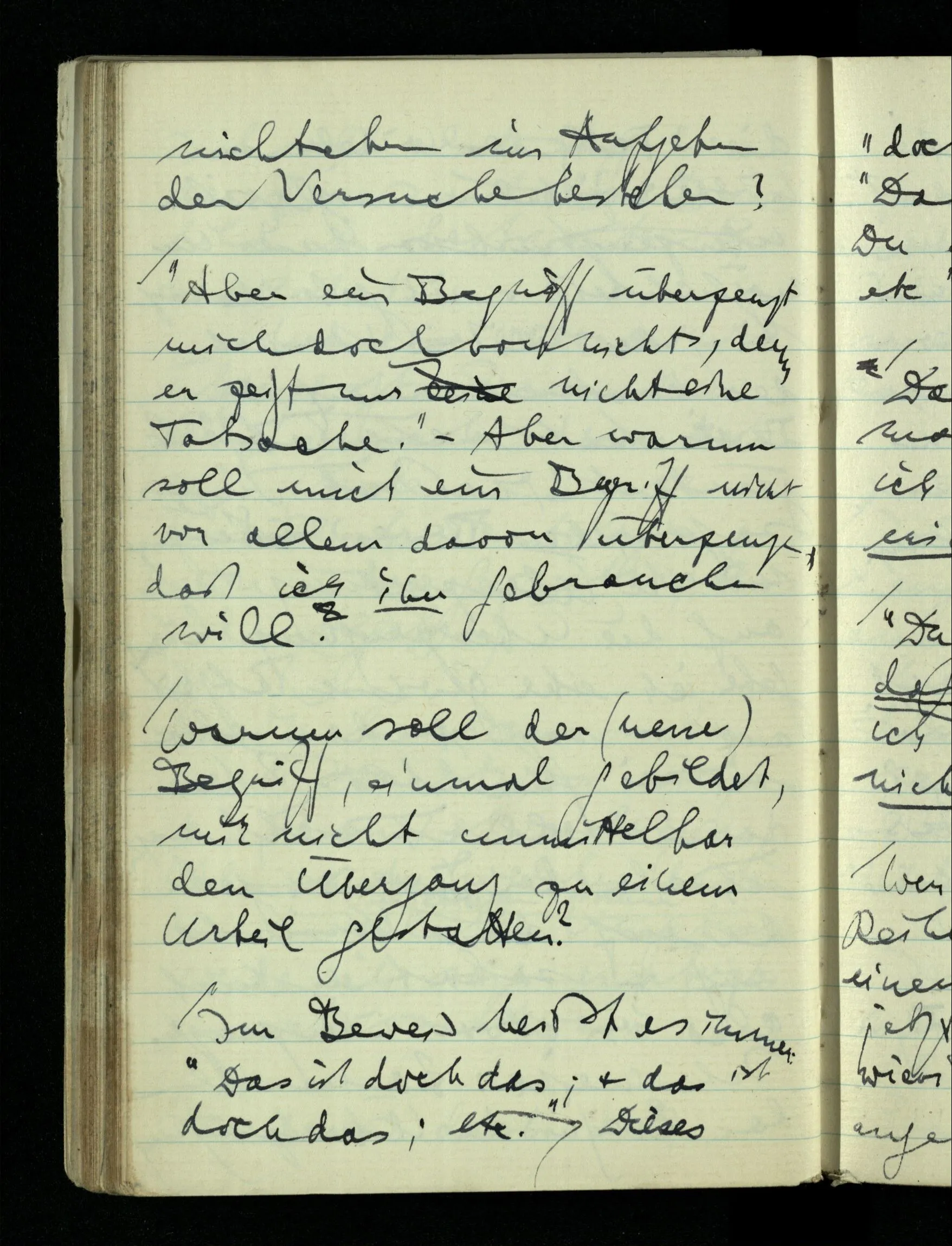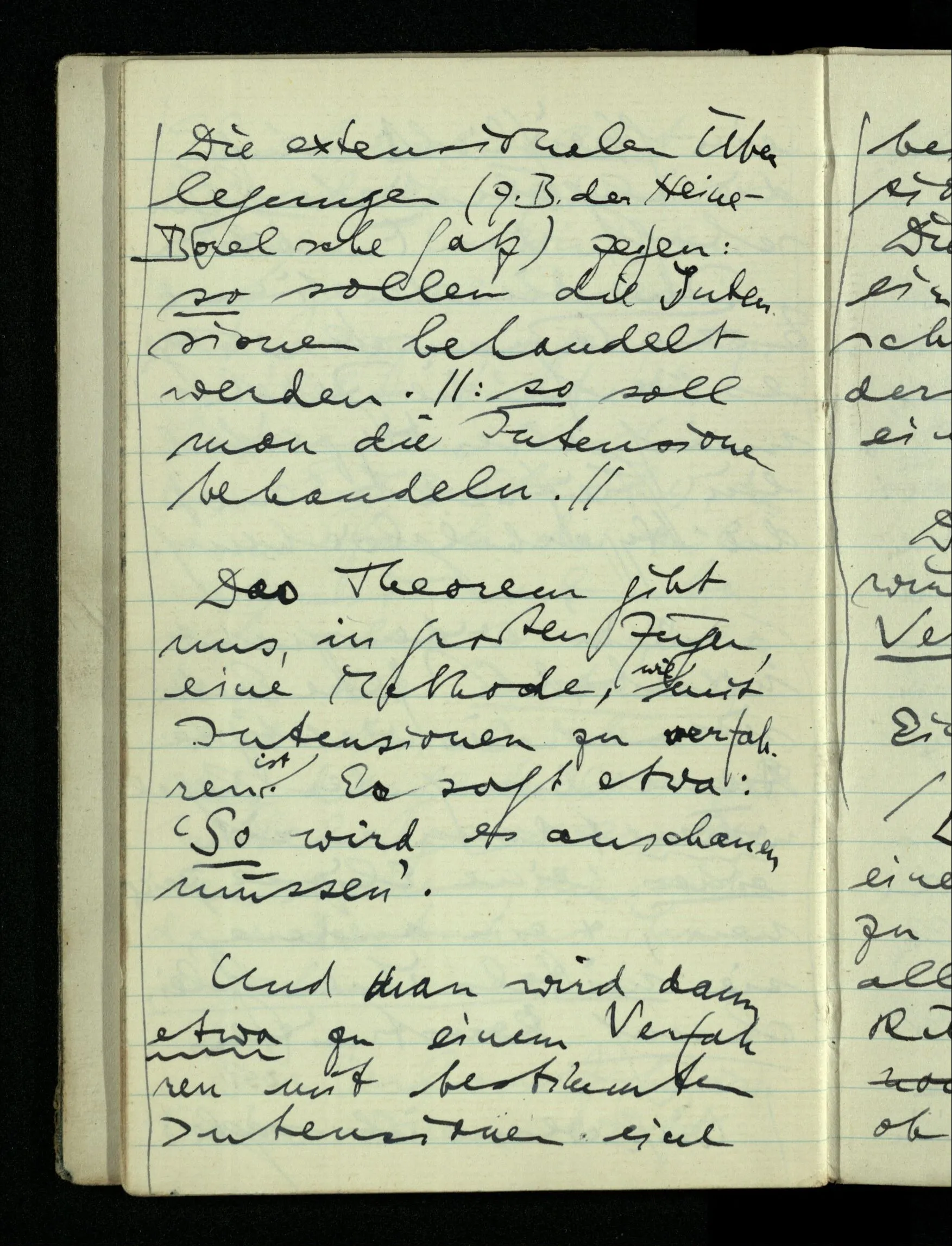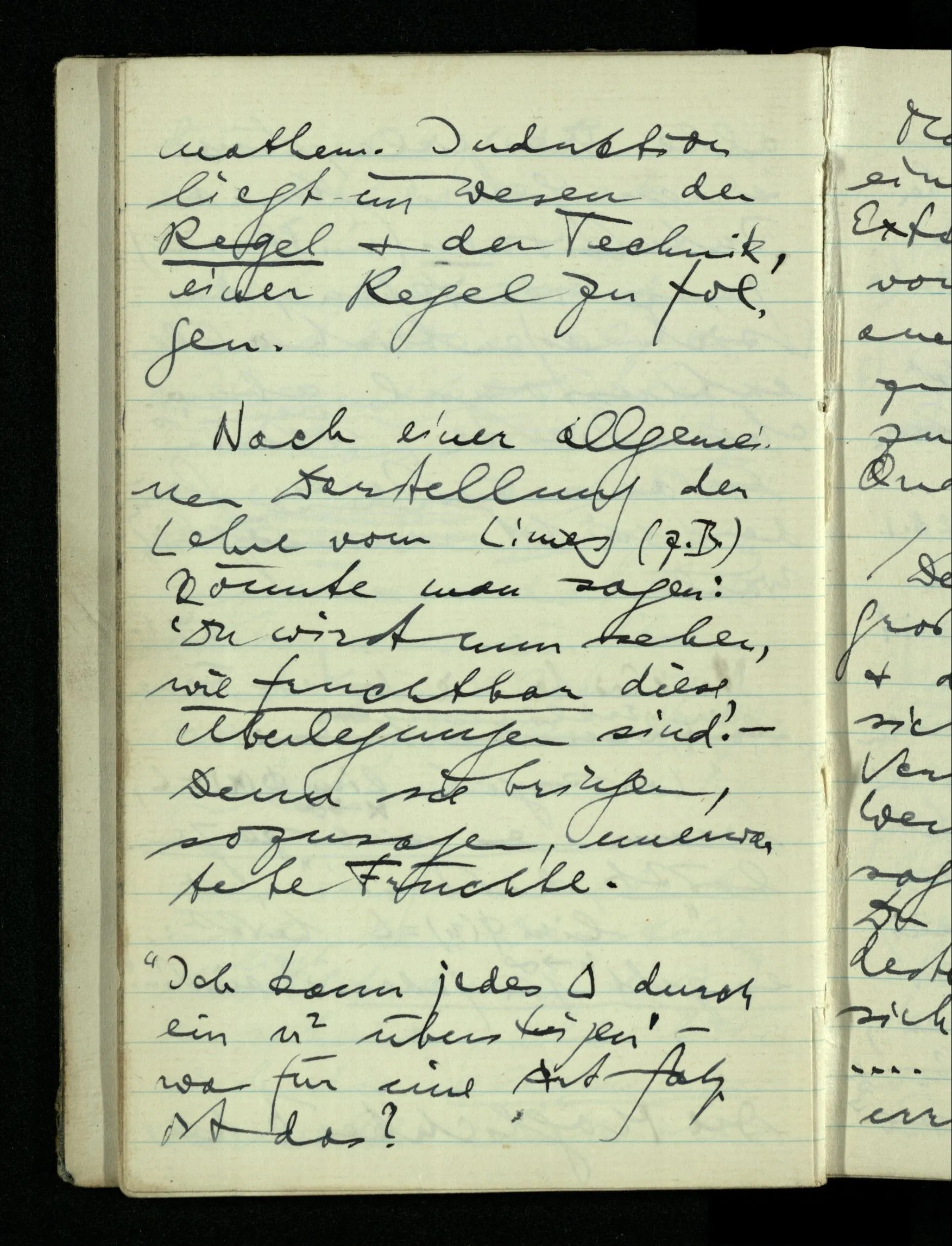 09.01.1943 Unsre Schwierigkeit fängt eigentlich schon mit der unendlichen Geraden an; obwohl wir schon als Knaben lernen, eine Gerade habe kein Ende, & ich weiß nicht, daß diese Idee irgend jemand Schwierigkeiten bereitet hätte. Wie, wenn ein Finitist versuchte diesen Begriff durch den einer geraden Strecke von bestimmter Länge zu ersetzen?!