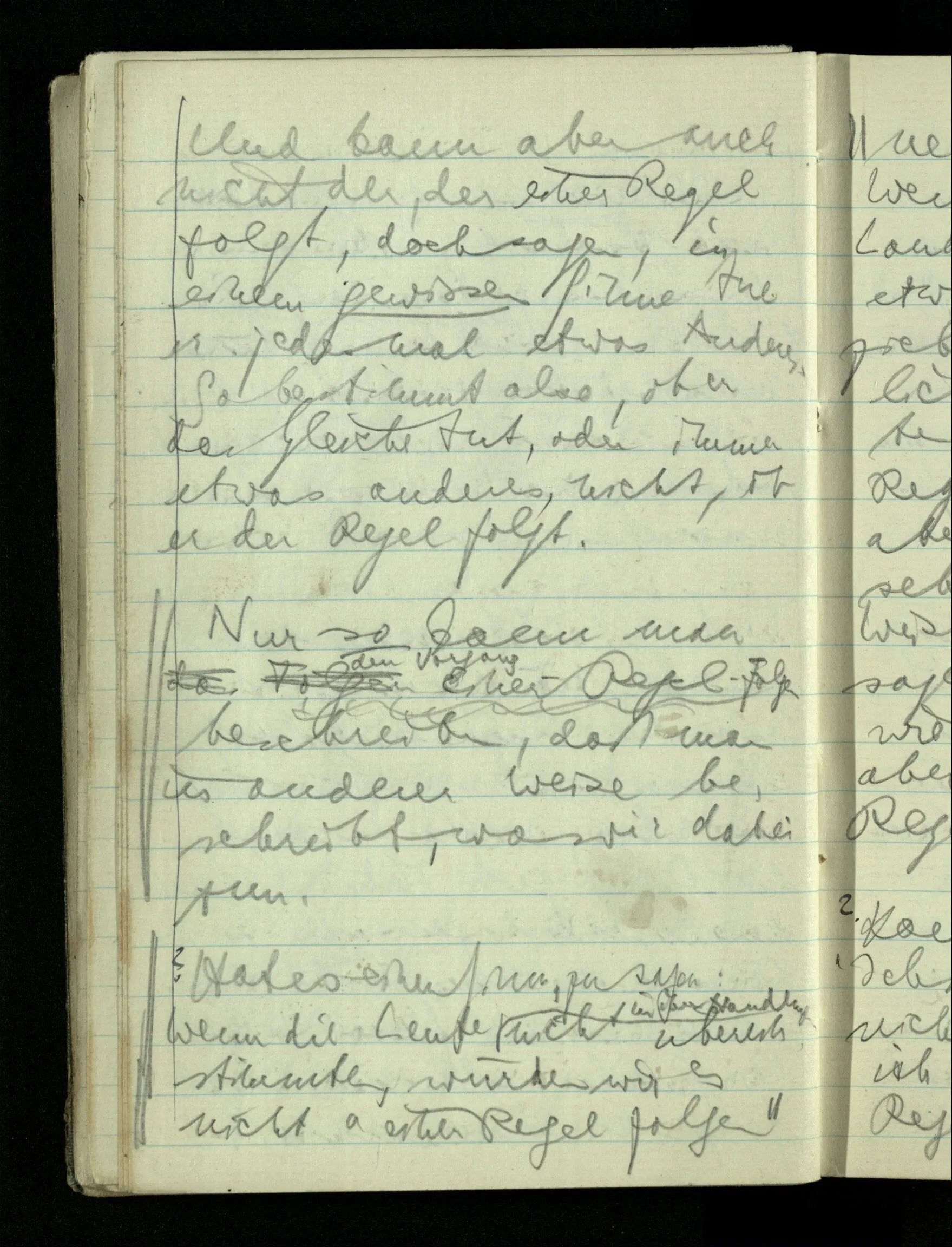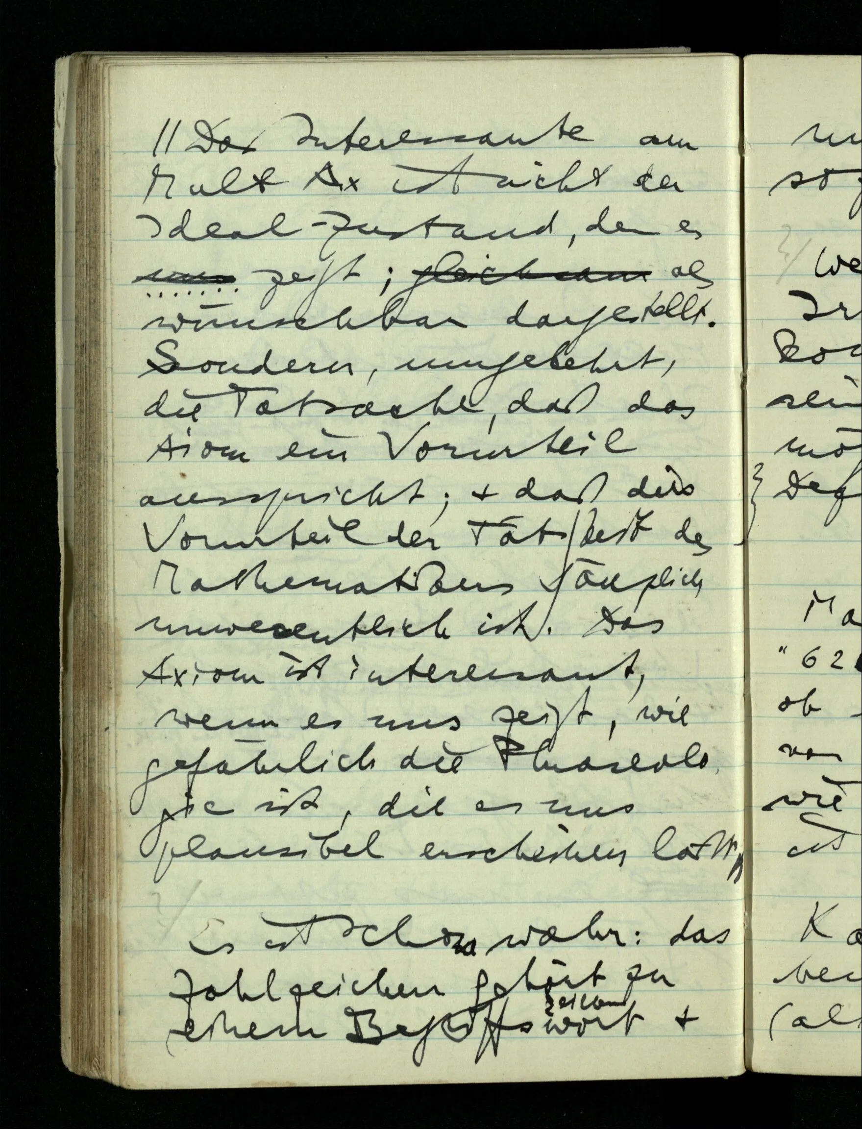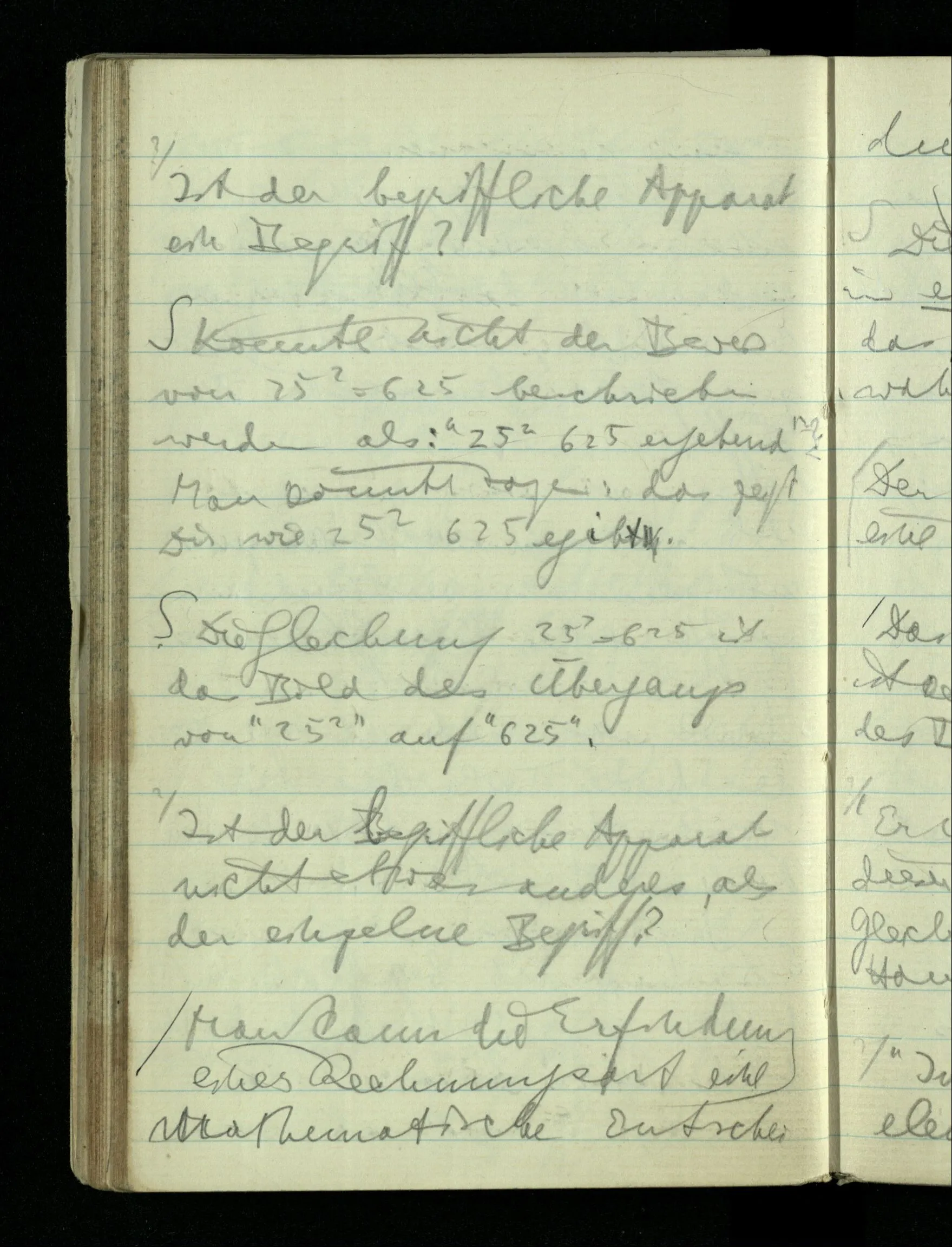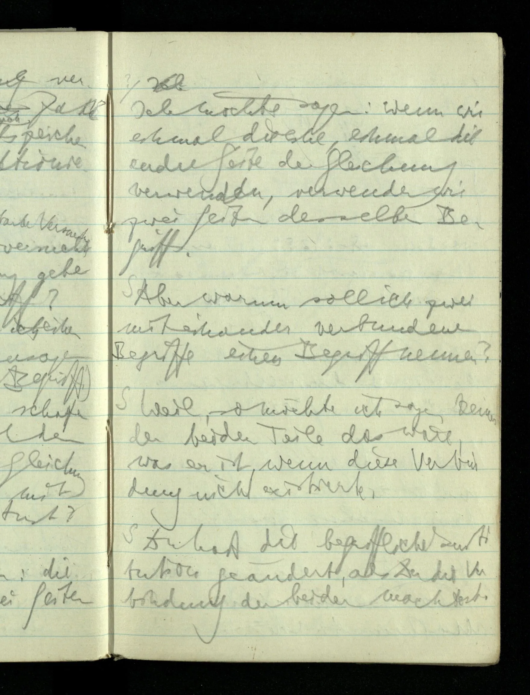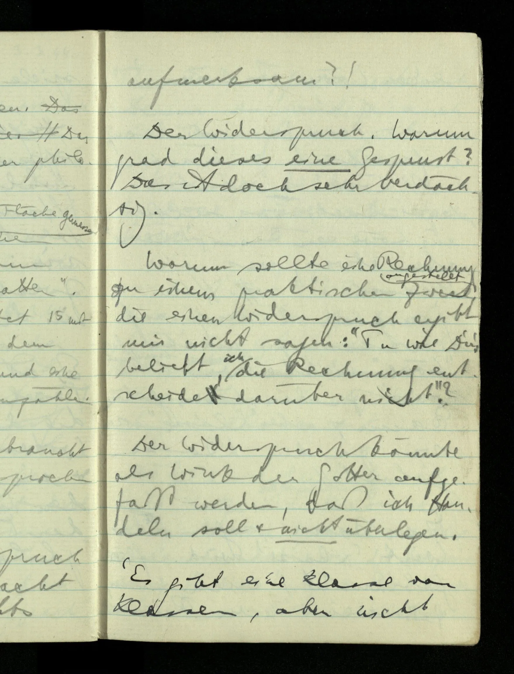 09.01.1943 Unsre Schwierigkeit fängt eigentlich schon mit der unendlichen Geraden an; obwohl wir schon als Knaben lernen, eine Gerade habe kein Ende, & ich weiß nicht, daß diese Idee irgend jemand Schwierigkeiten bereitet hätte. Wie, wenn ein Finitist versuchte diesen Begriff durch den einer geraden Strecke von bestimmter Länge zu ersetzen?!