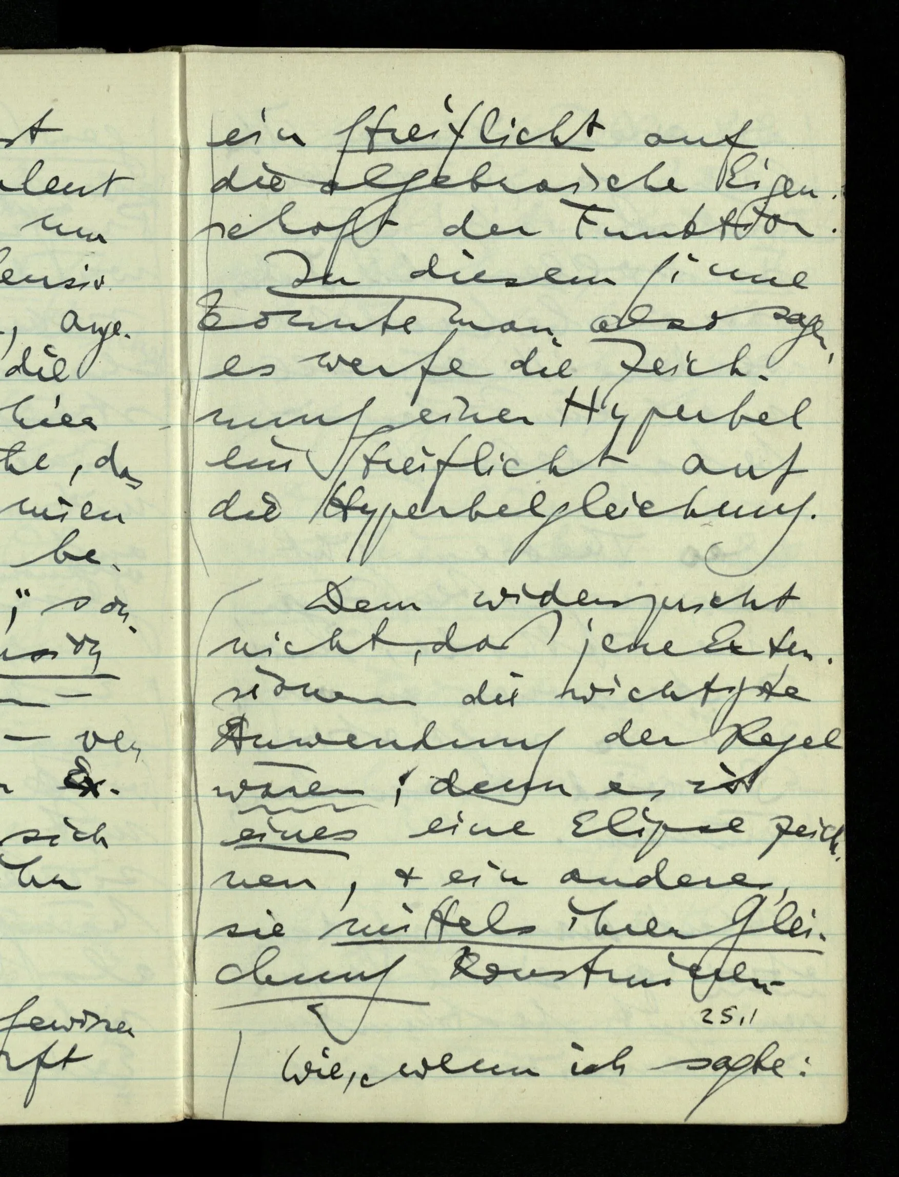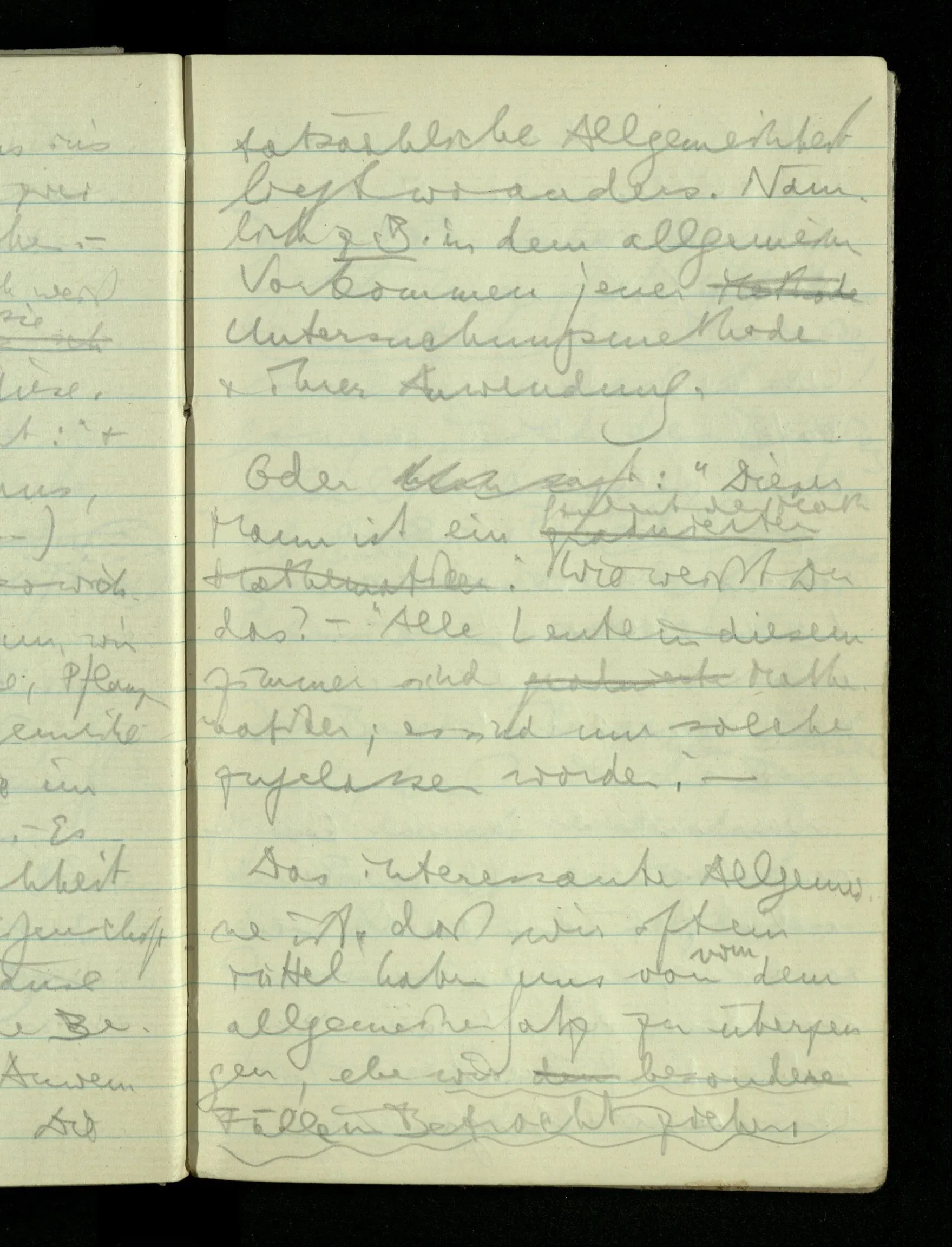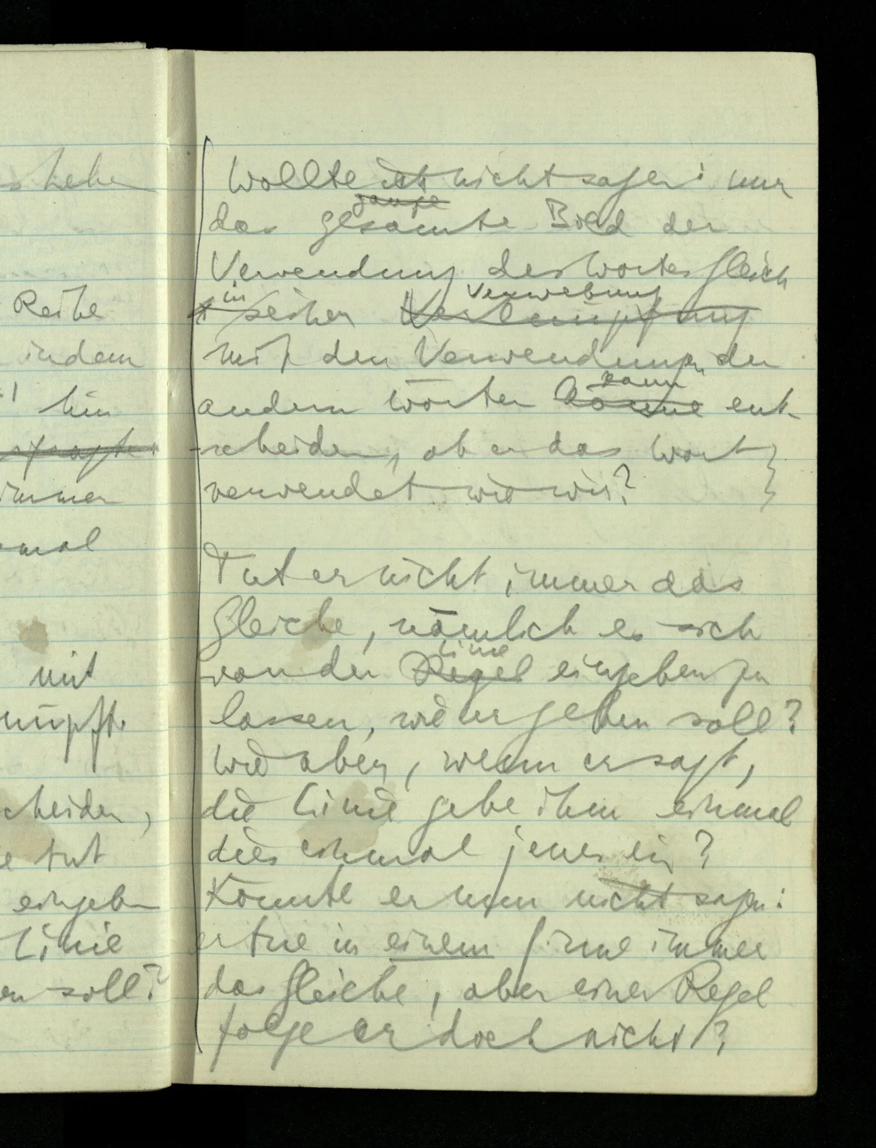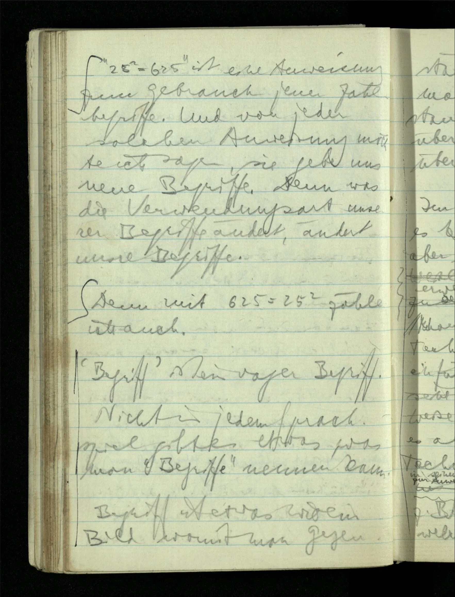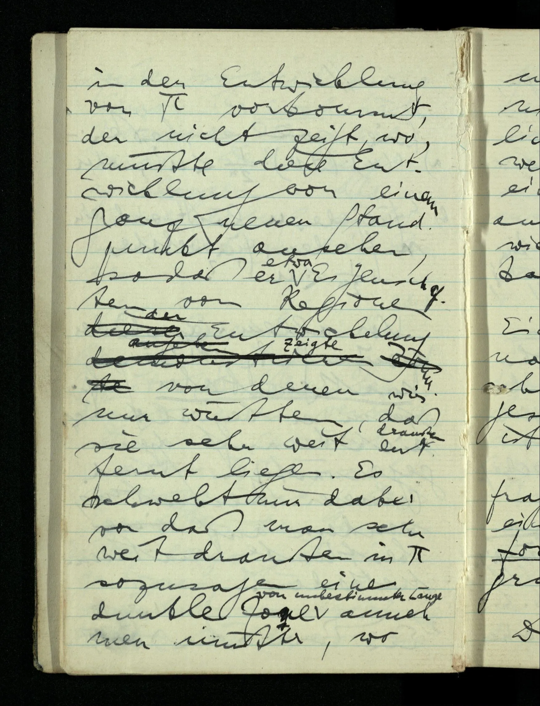 09.01.1943 Unsre Schwierigkeit fängt eigentlich schon mit der unendlichen Geraden an; obwohl wir schon als Knaben lernen, eine Gerade habe kein Ende, & ich weiß nicht, daß diese Idee irgend jemand Schwierigkeiten bereitet hätte. Wie, wenn ein Finitist versuchte diesen Begriff durch den einer geraden Strecke von bestimmter Länge zu ersetzen?!