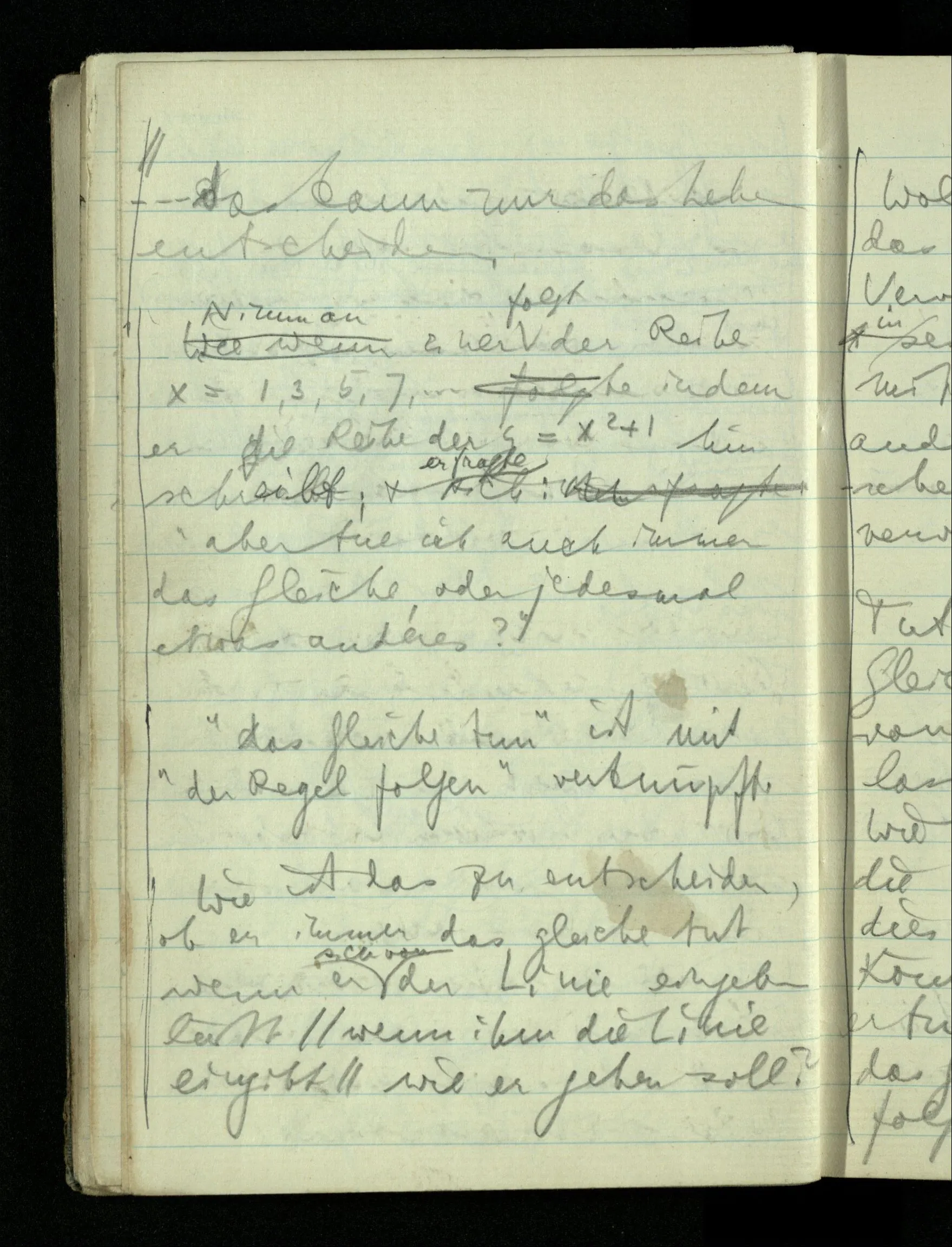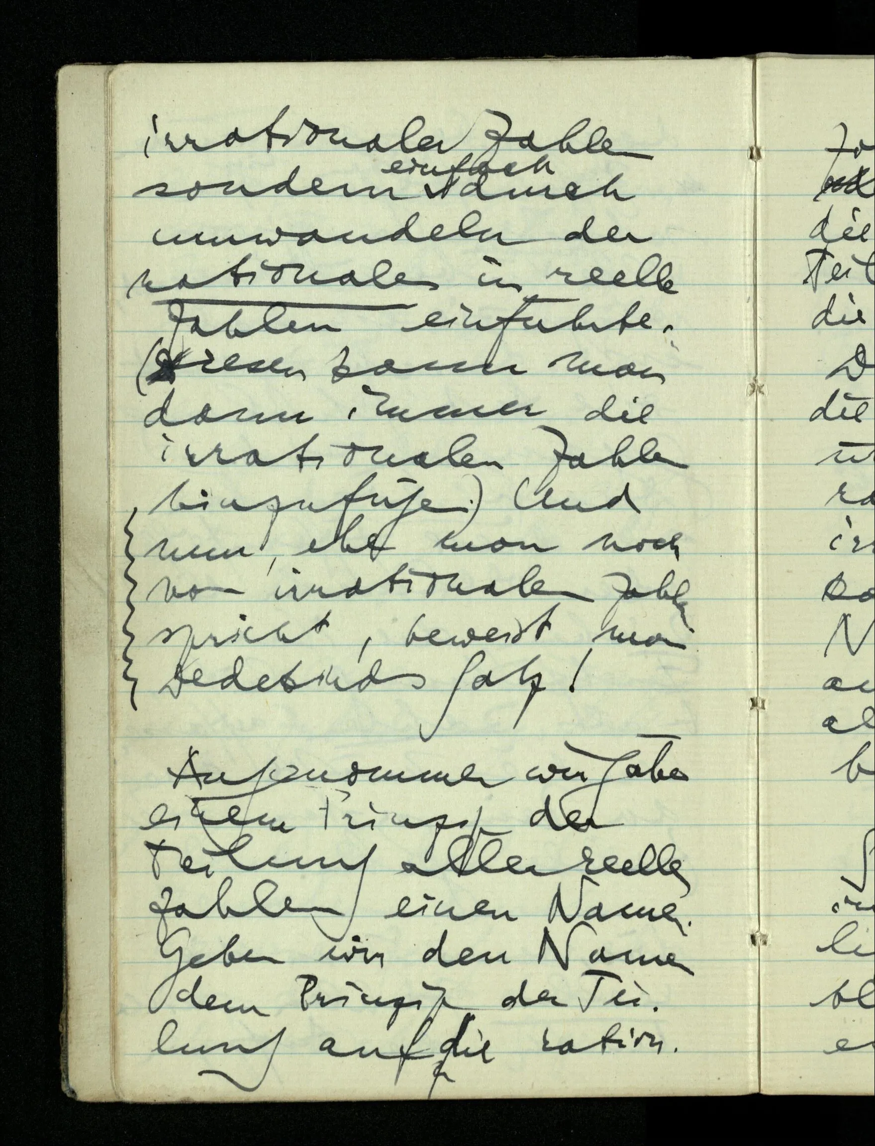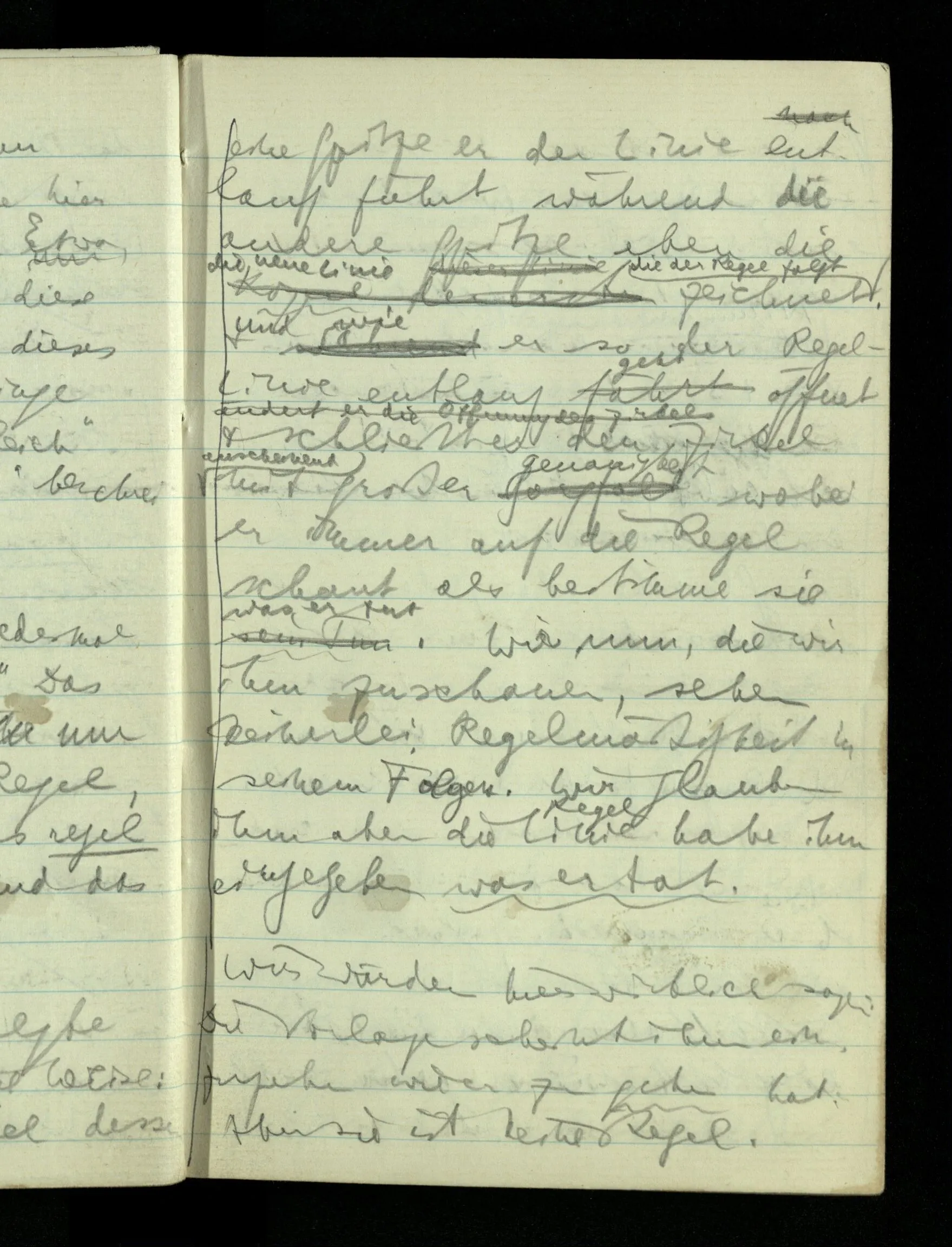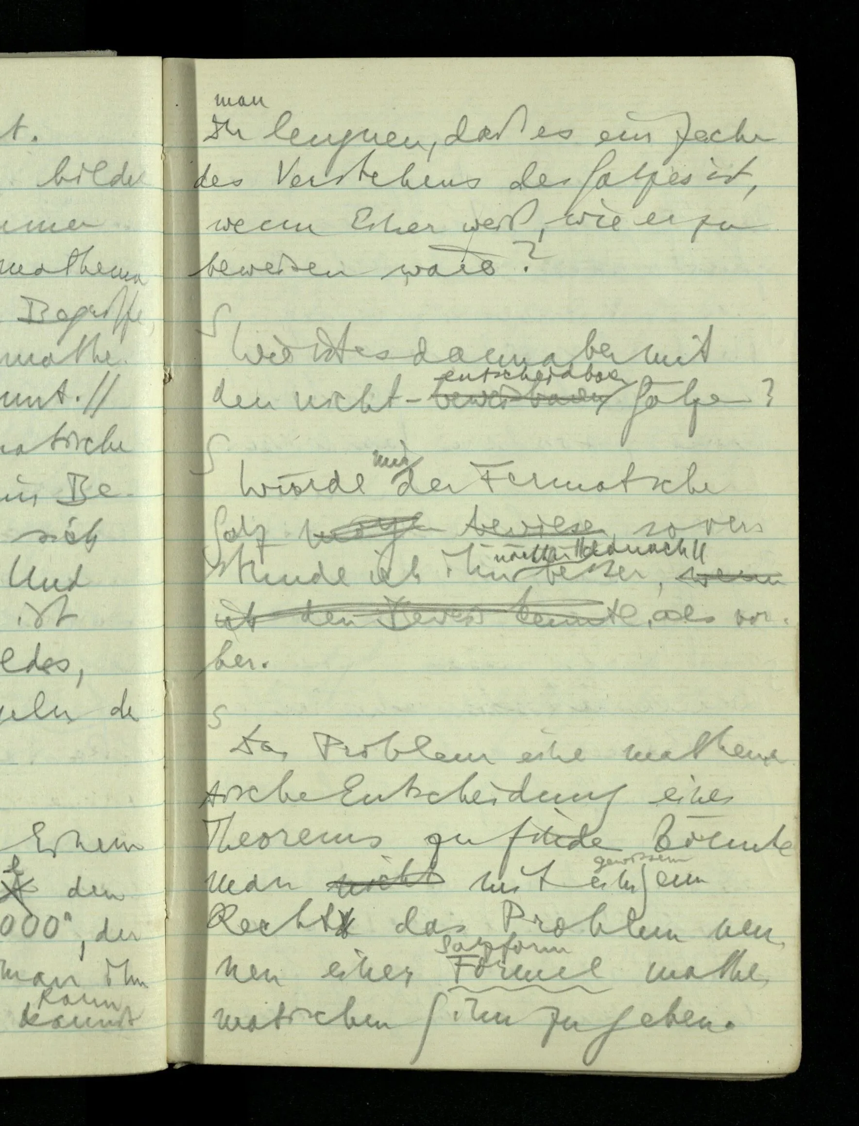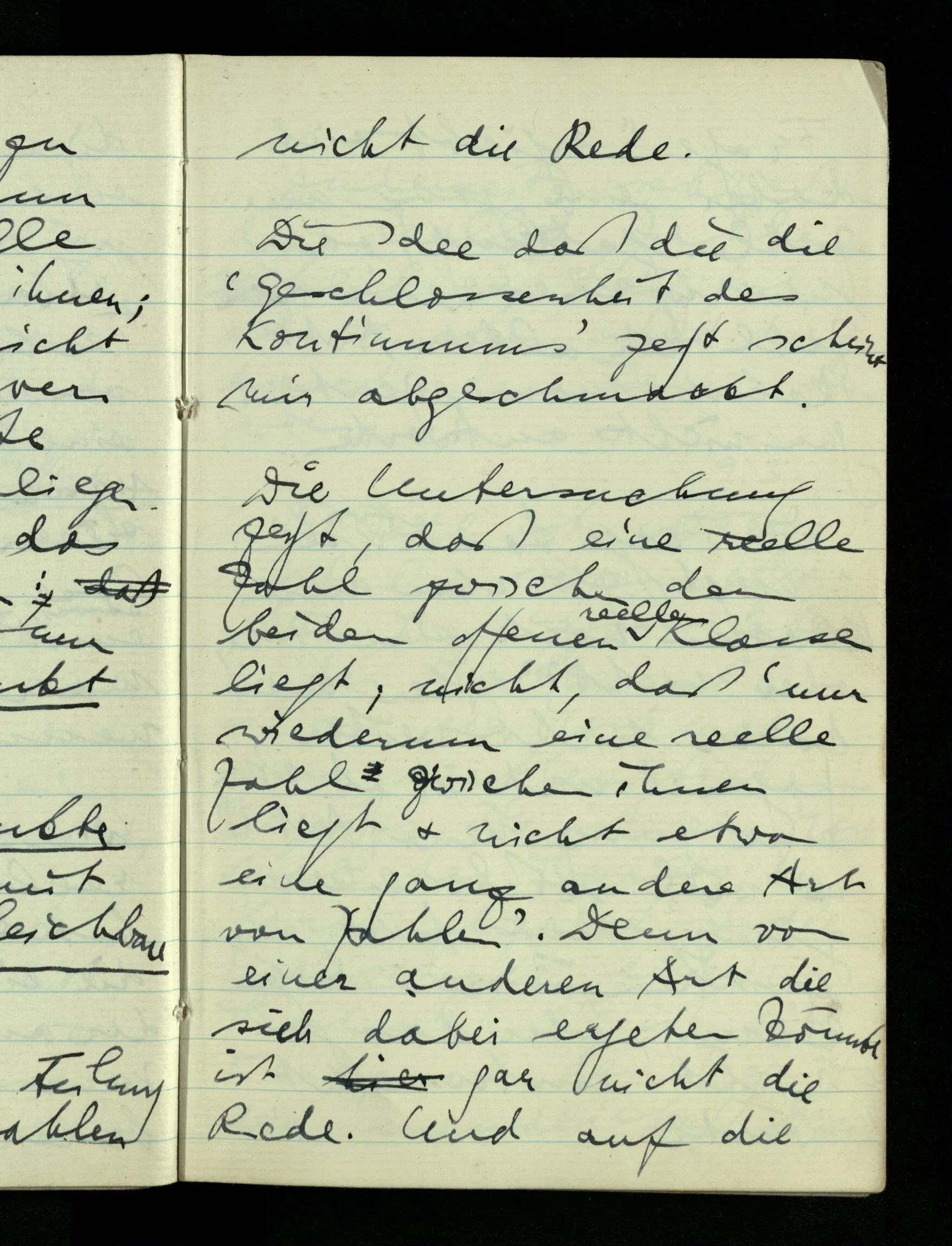 09.01.1943 Unsre Schwierigkeit fängt eigentlich schon mit der unendlichen Geraden an; obwohl wir schon als Knaben lernen, eine Gerade habe kein Ende, & ich weiß nicht, daß diese Idee irgend jemand Schwierigkeiten bereitet hätte. Wie, wenn ein Finitist versuchte diesen Begriff durch den einer geraden Strecke von bestimmter Länge zu ersetzen?!