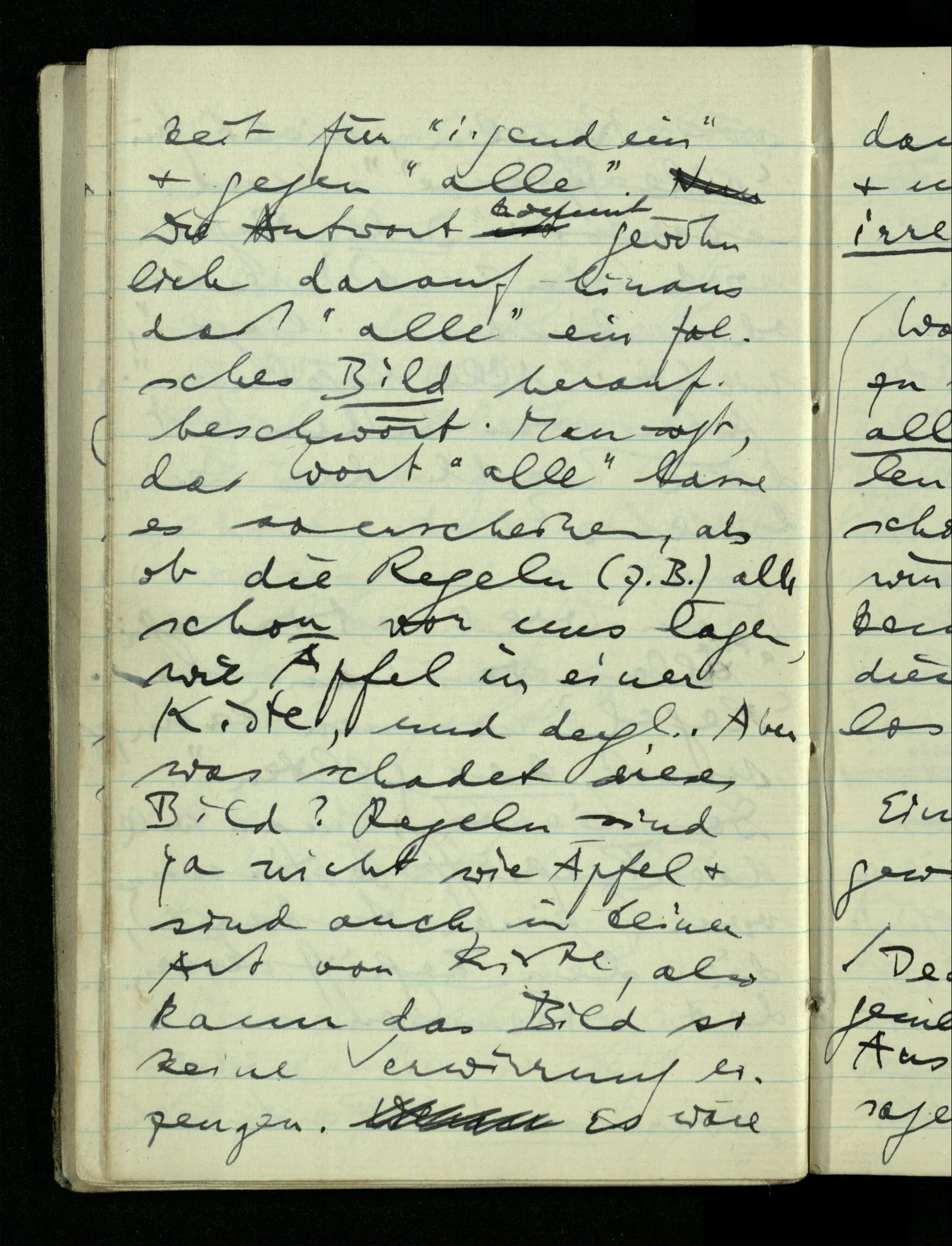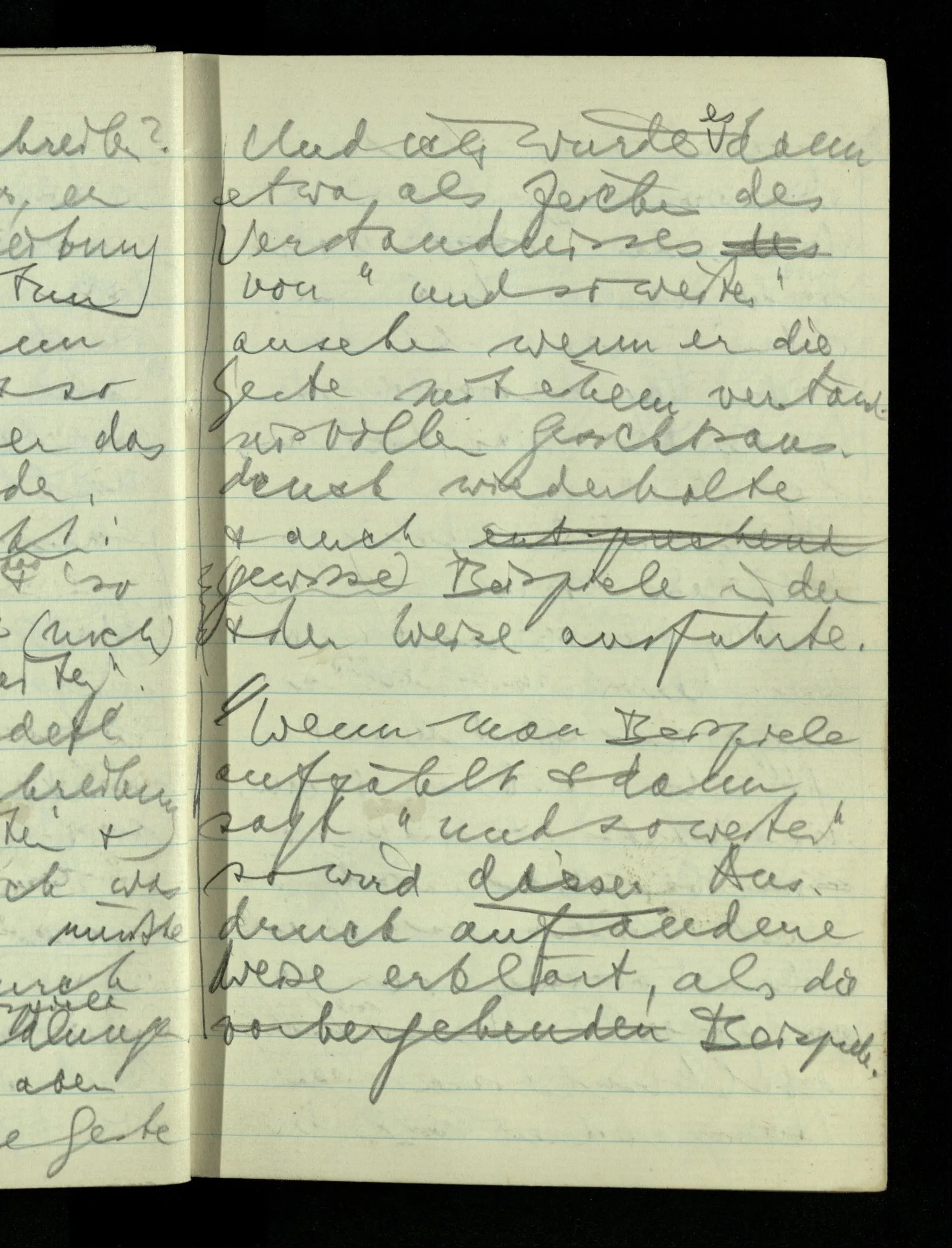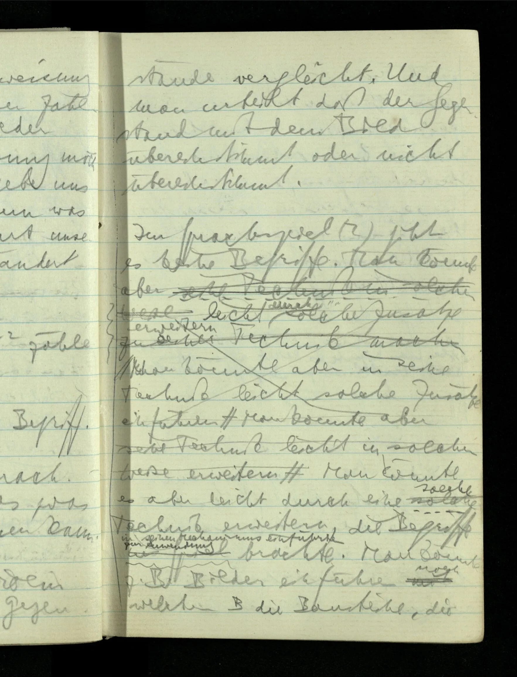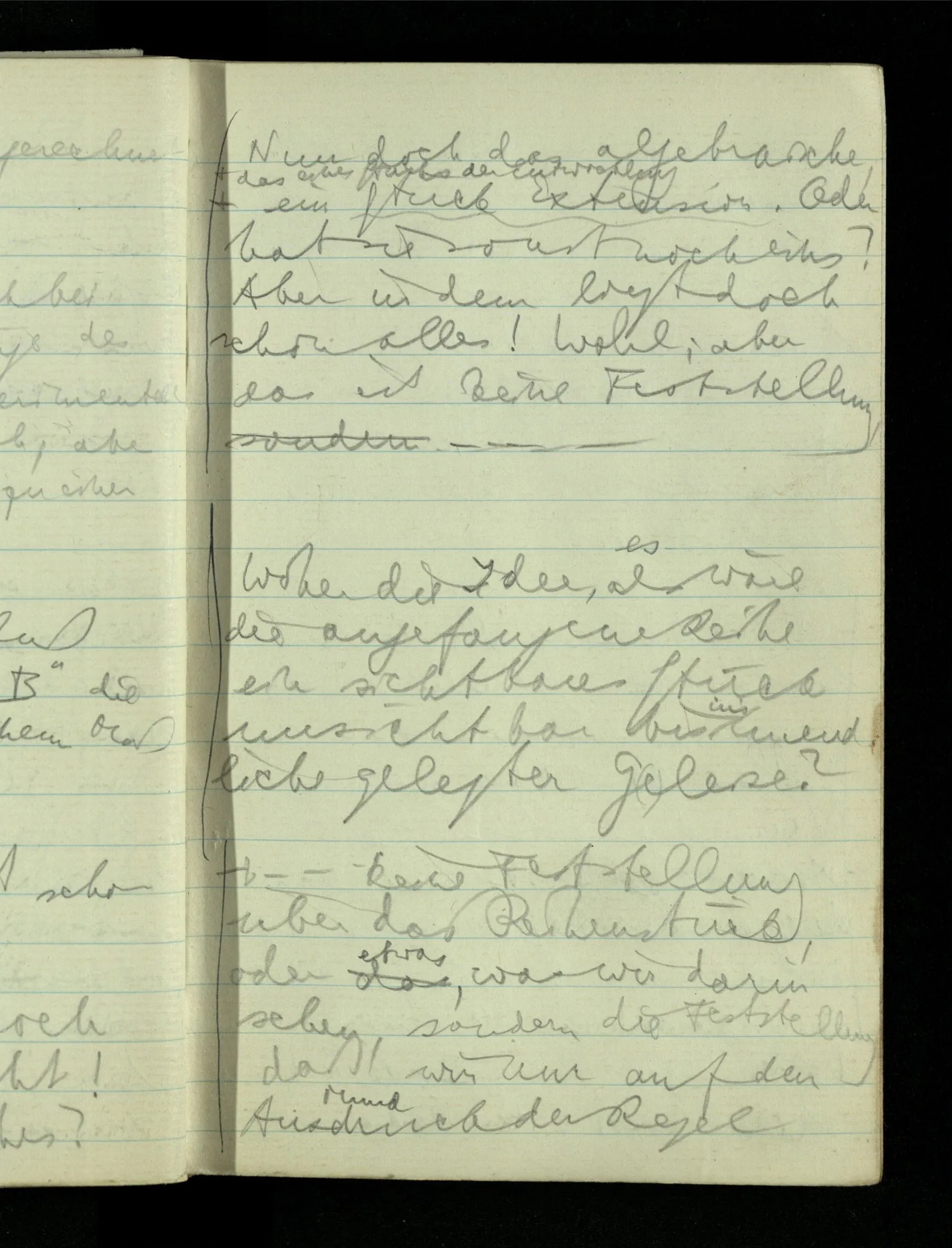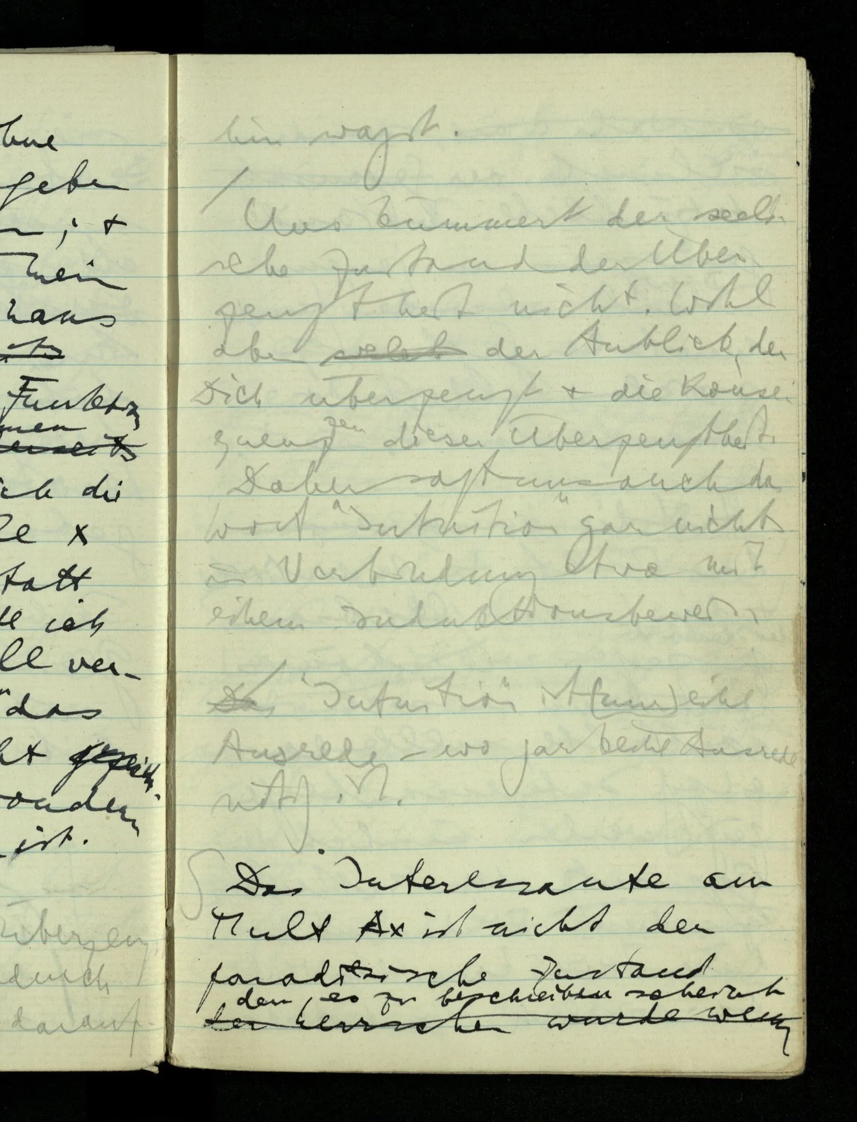 09.01.1943 Unsre Schwierigkeit fängt eigentlich schon mit der unendlichen Geraden an; obwohl wir schon als Knaben lernen, eine Gerade habe kein Ende, & ich weiß nicht, daß diese Idee irgend jemand Schwierigkeiten bereitet hätte. Wie, wenn ein Finitist versuchte diesen Begriff durch den einer geraden Strecke von bestimmter Länge zu ersetzen?!