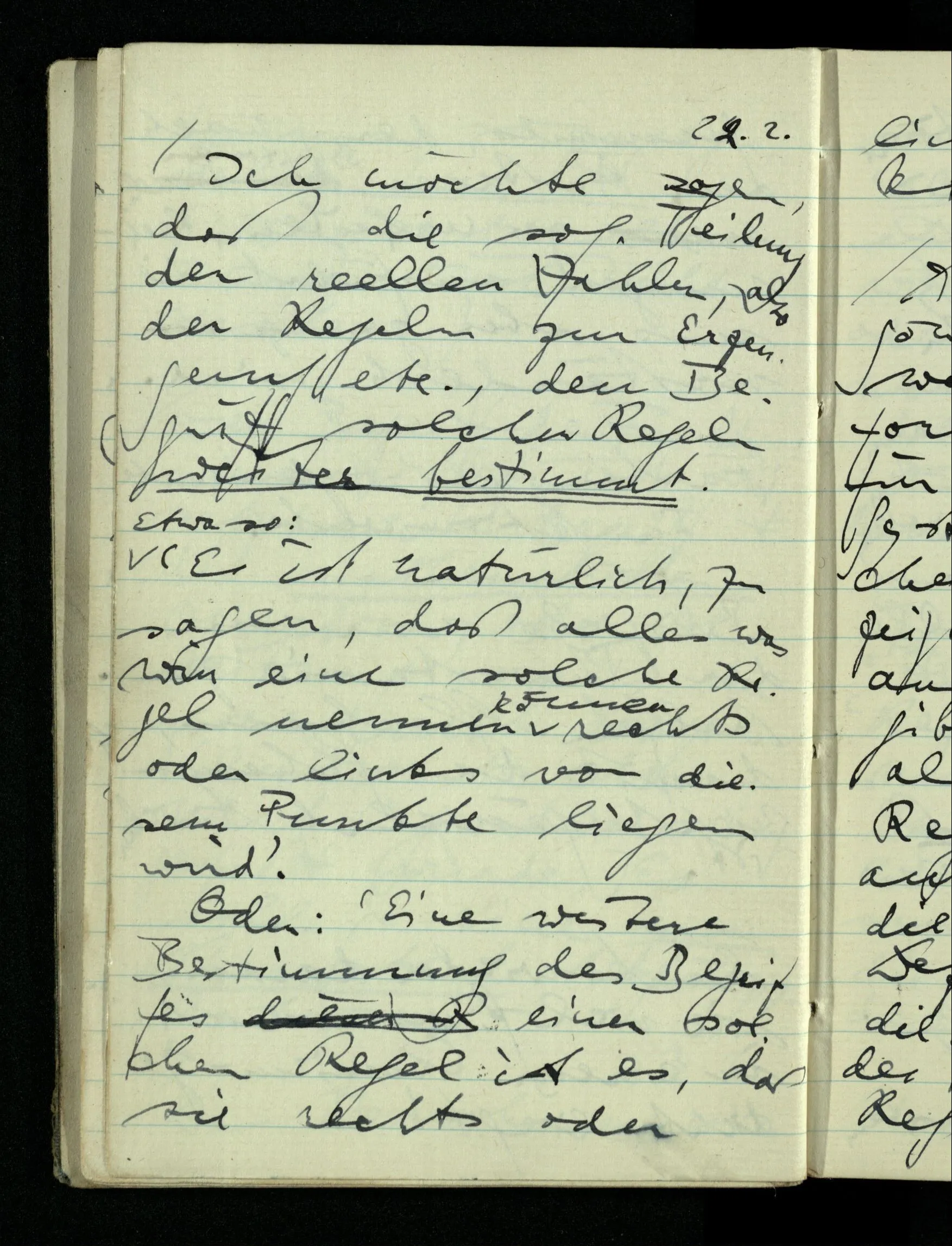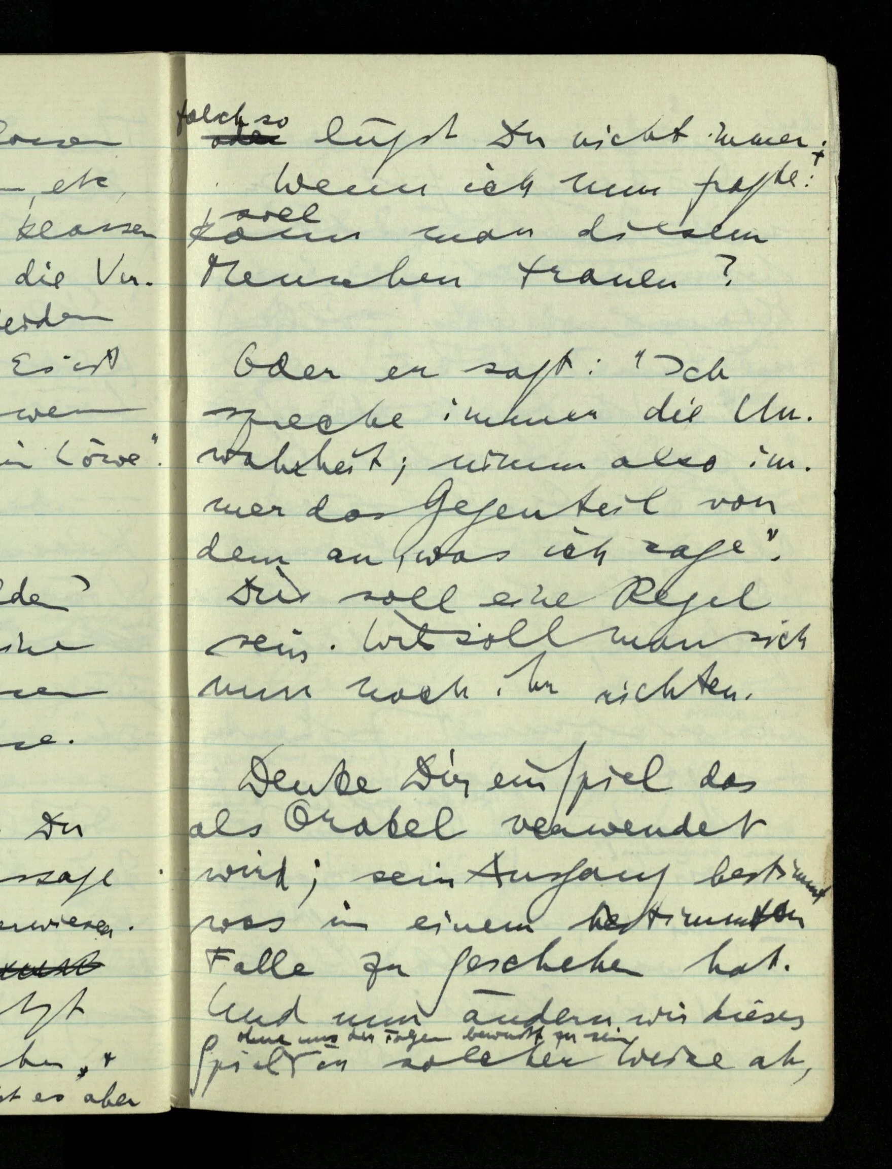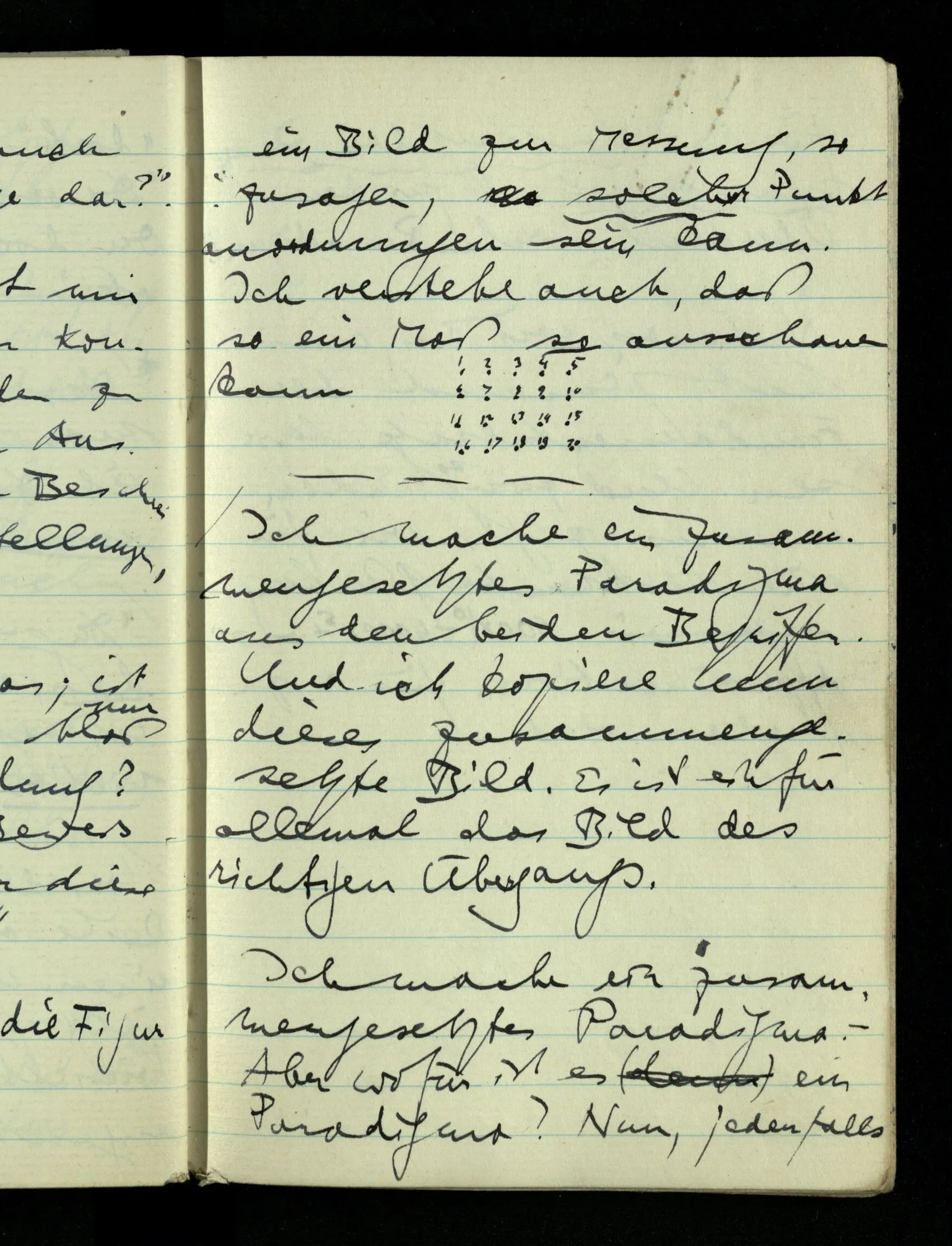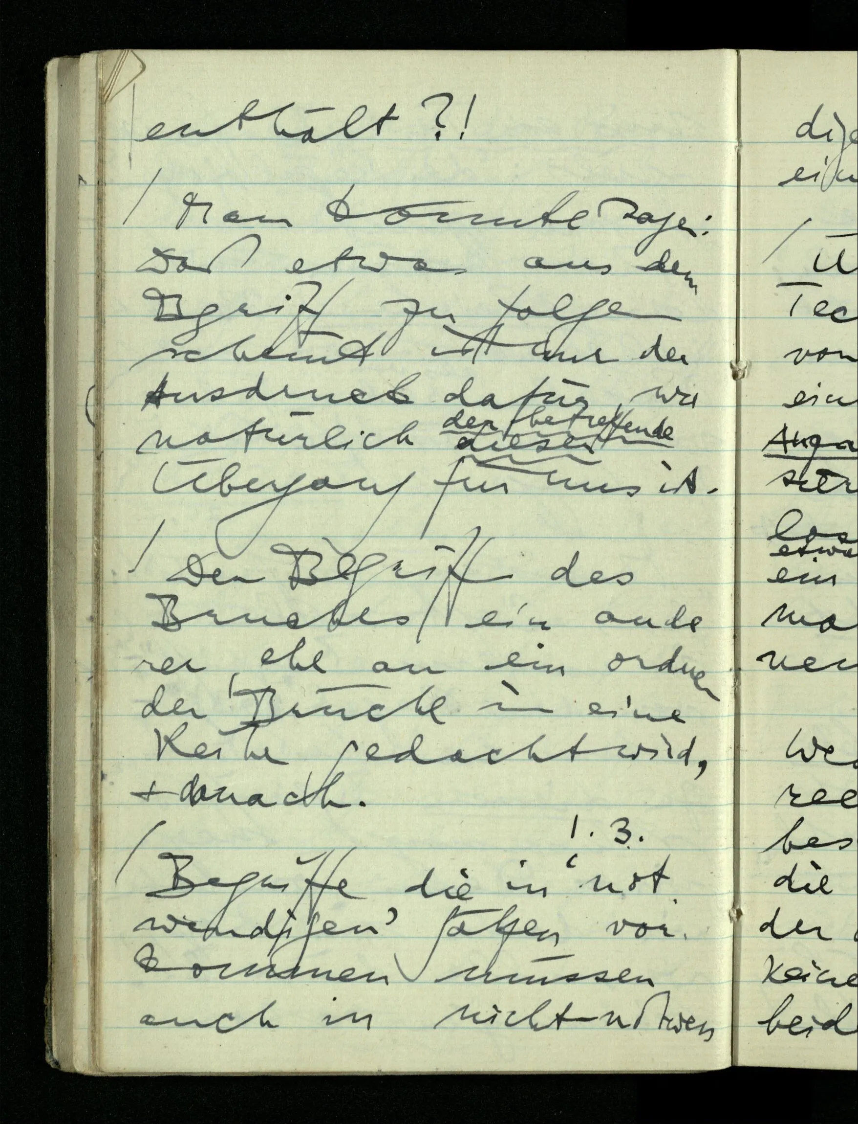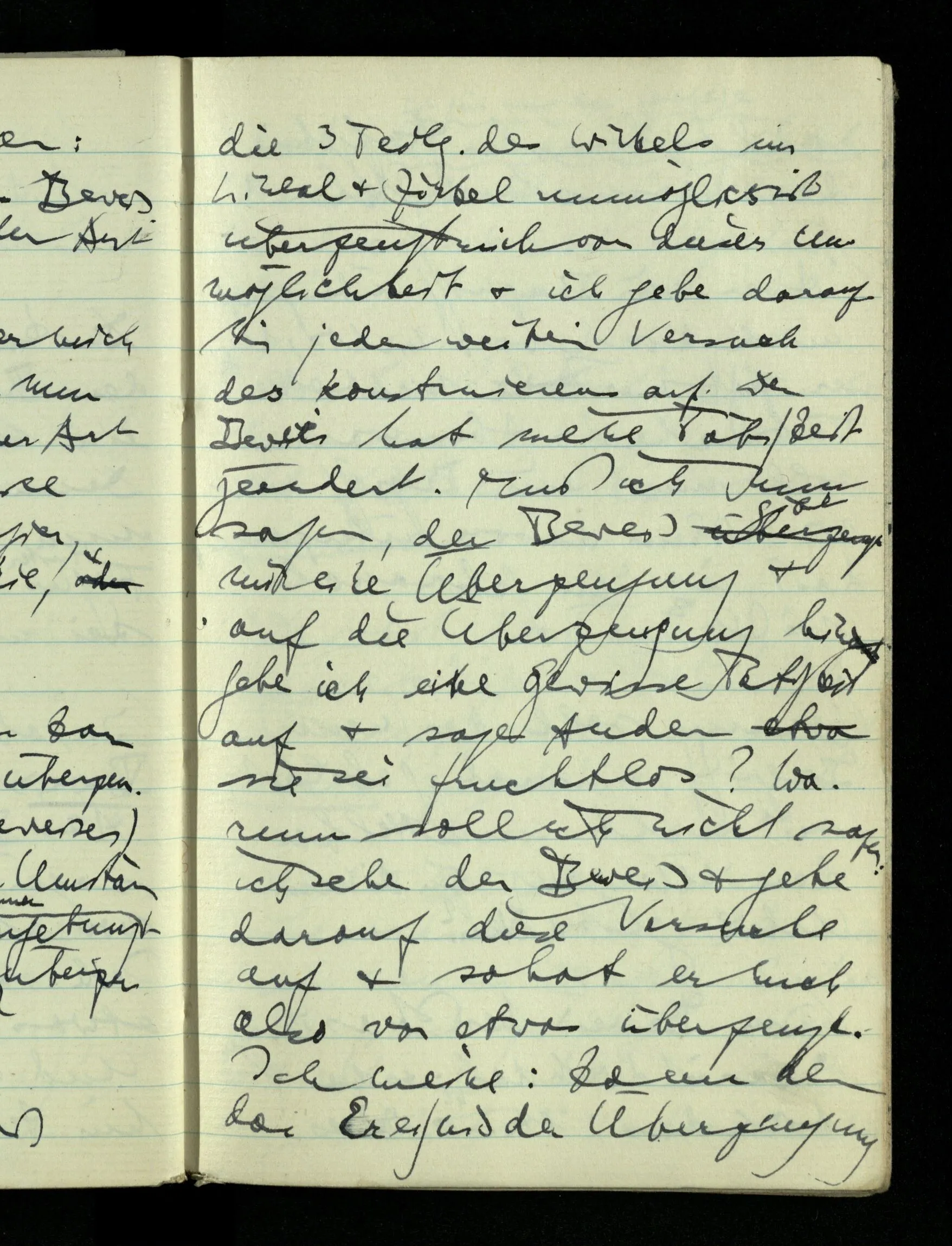09.01.1943 Unsre Schwierigkeit fängt eigentlich schon mit der unendlichen Geraden an; obwohl wir schon als Knaben lernen, eine Gerade habe kein Ende, & ich weiß nicht, daß diese Idee irgend jemand Schwierigkeiten bereitet hätte. Wie, wenn ein Finitist versuchte diesen Begriff durch den einer geraden Strecke von bestimmter Länge zu ersetzen?!