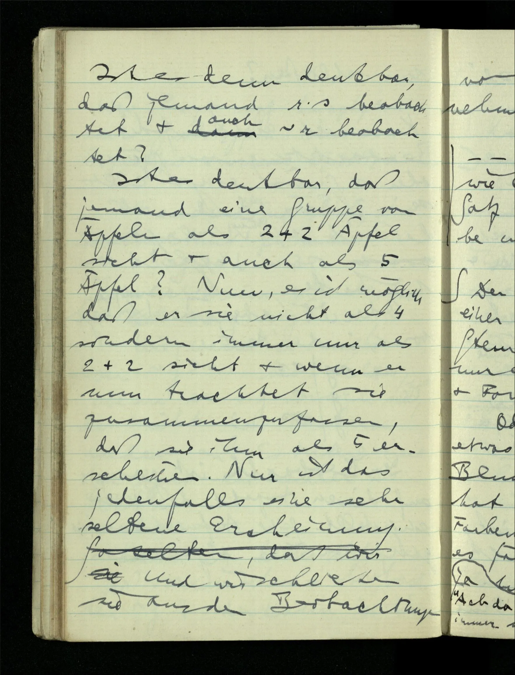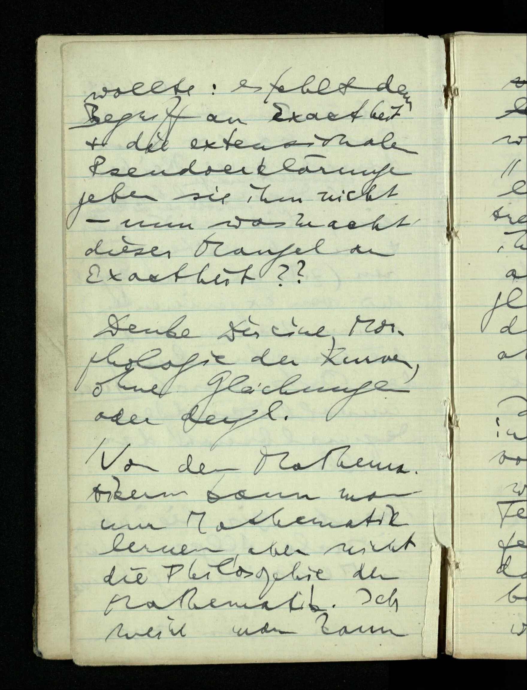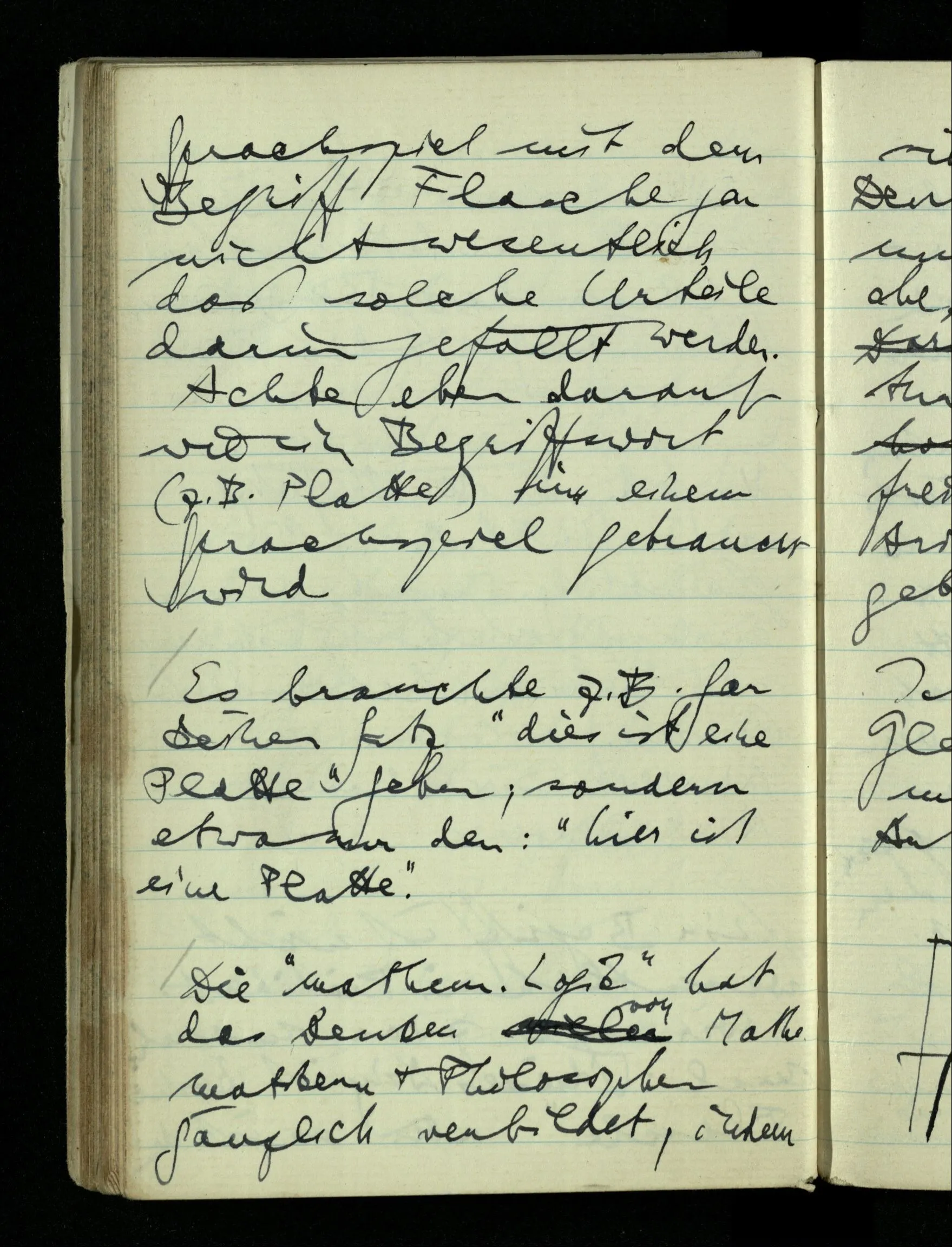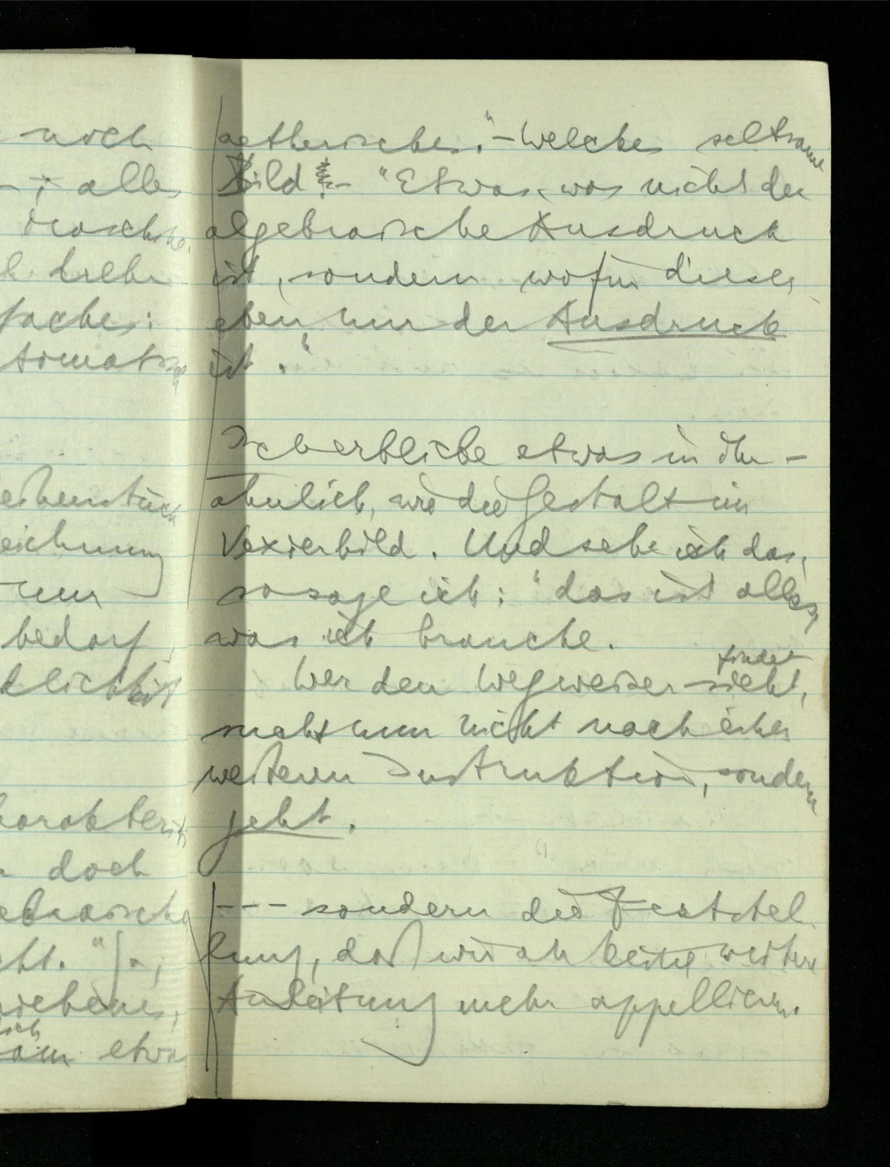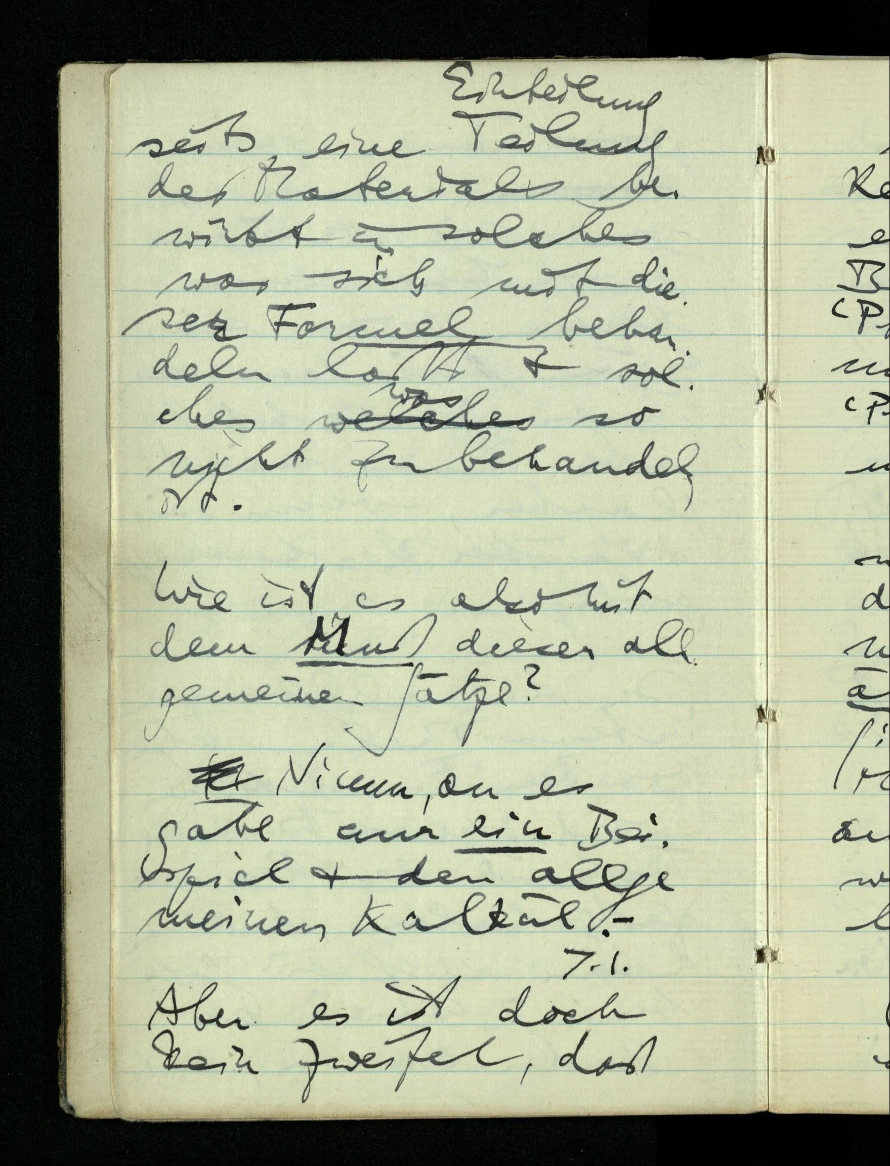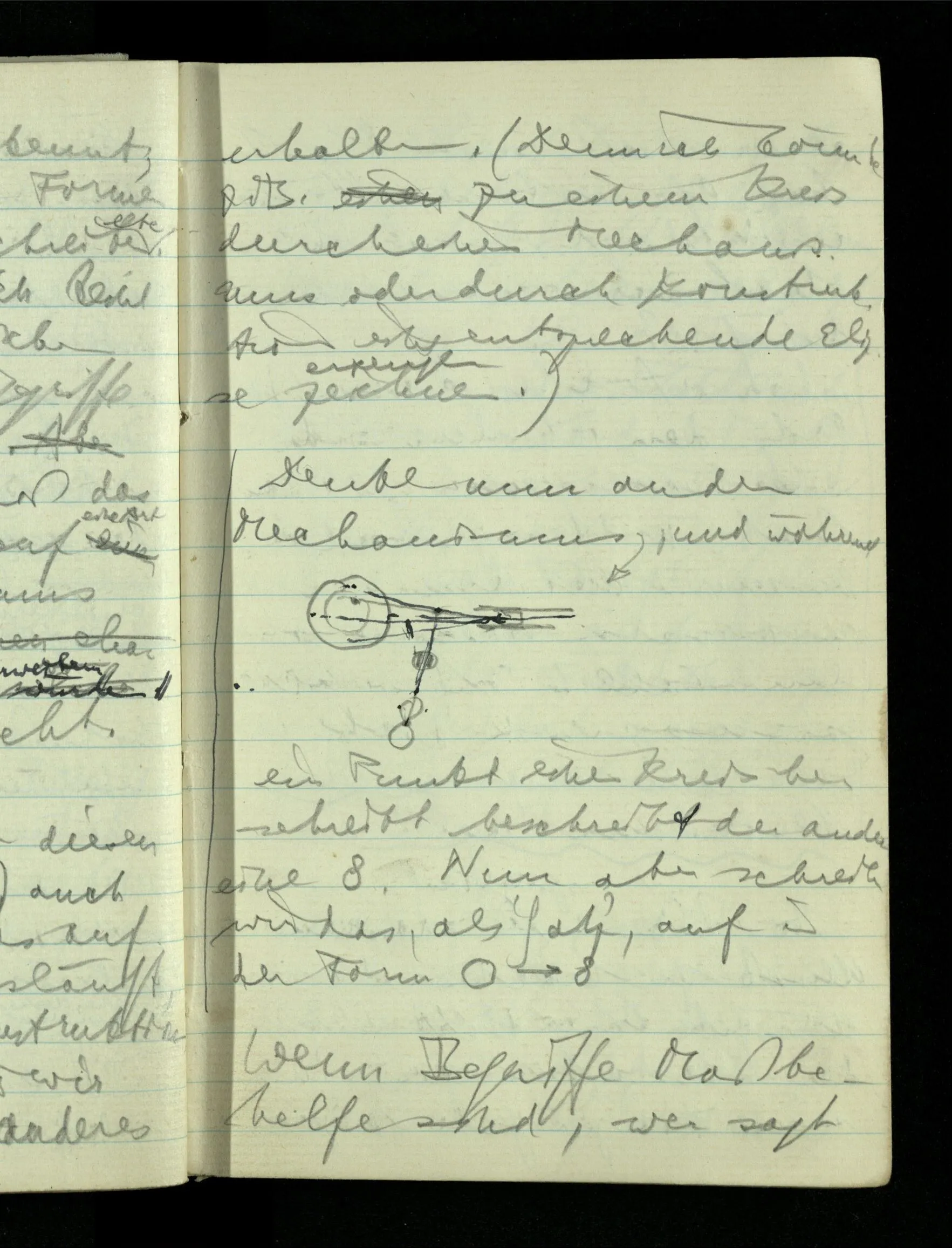 09.01.1943 Unsre Schwierigkeit fängt eigentlich schon mit der unendlichen Geraden an; obwohl wir schon als Knaben lernen, eine Gerade habe kein Ende, & ich weiß nicht, daß diese Idee irgend jemand Schwierigkeiten bereitet hätte. Wie, wenn ein Finitist versuchte diesen Begriff durch den einer geraden Strecke von bestimmter Länge zu ersetzen?!