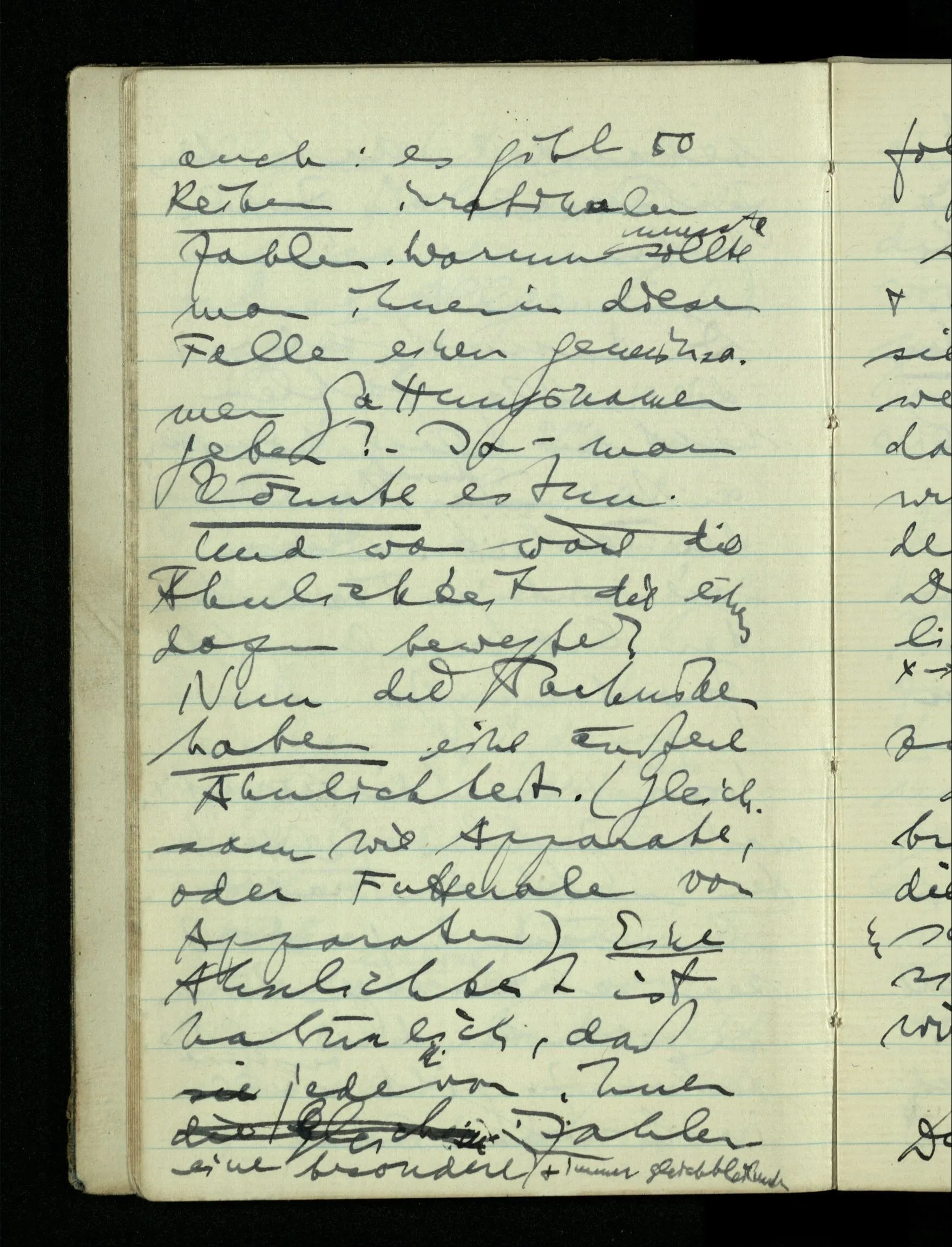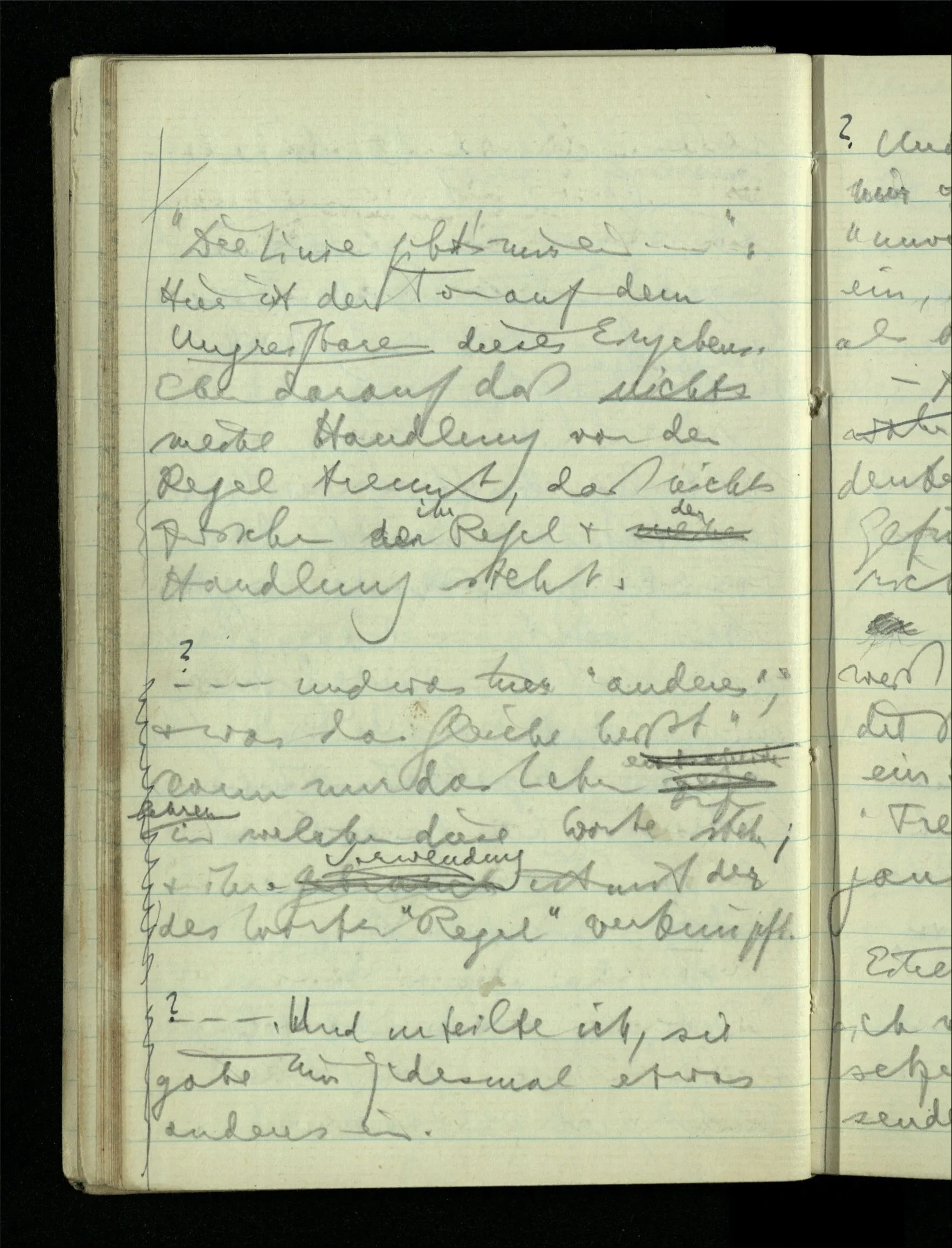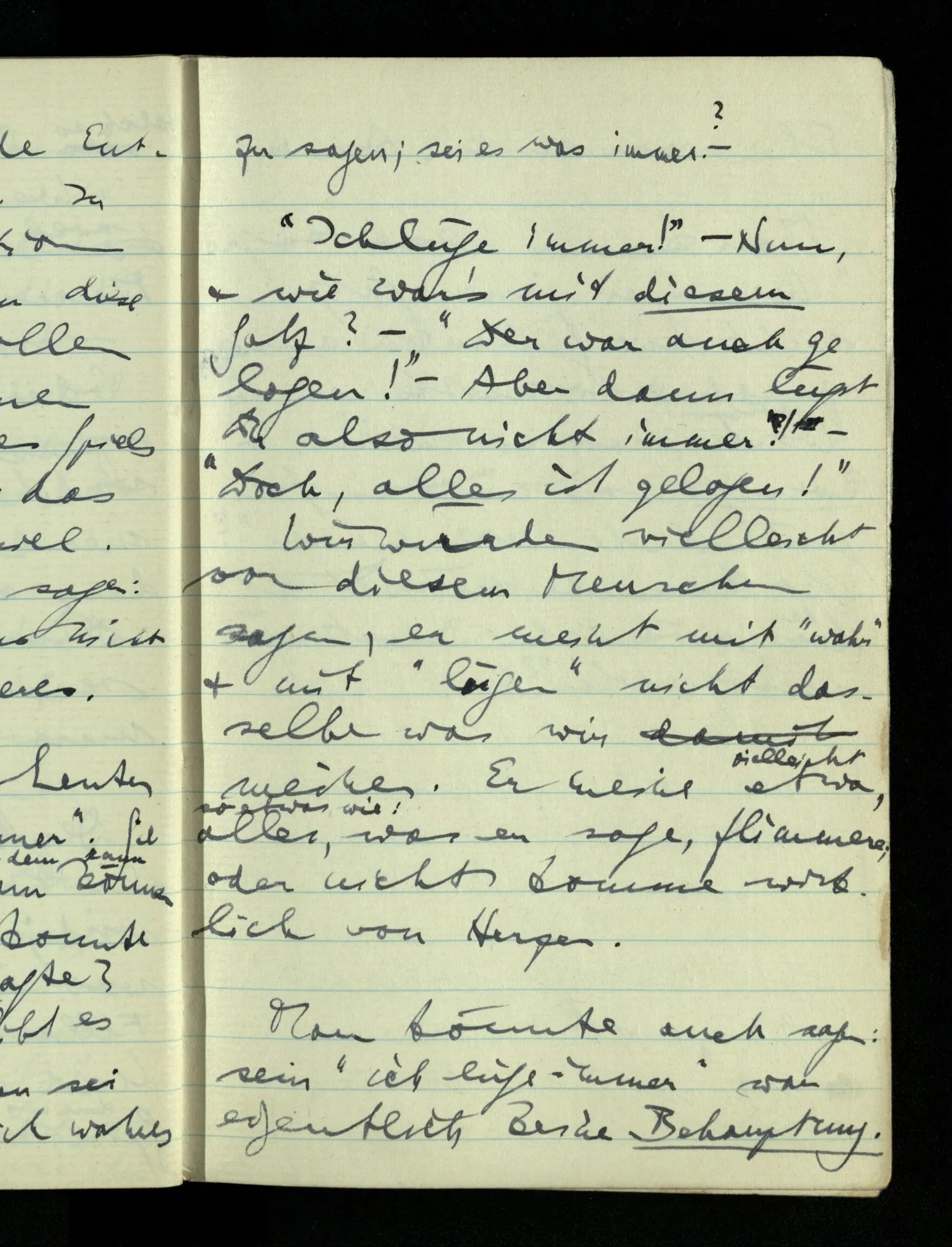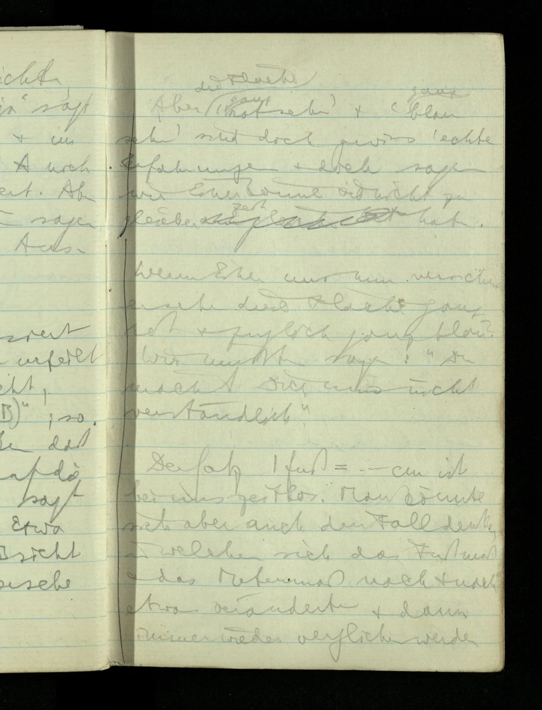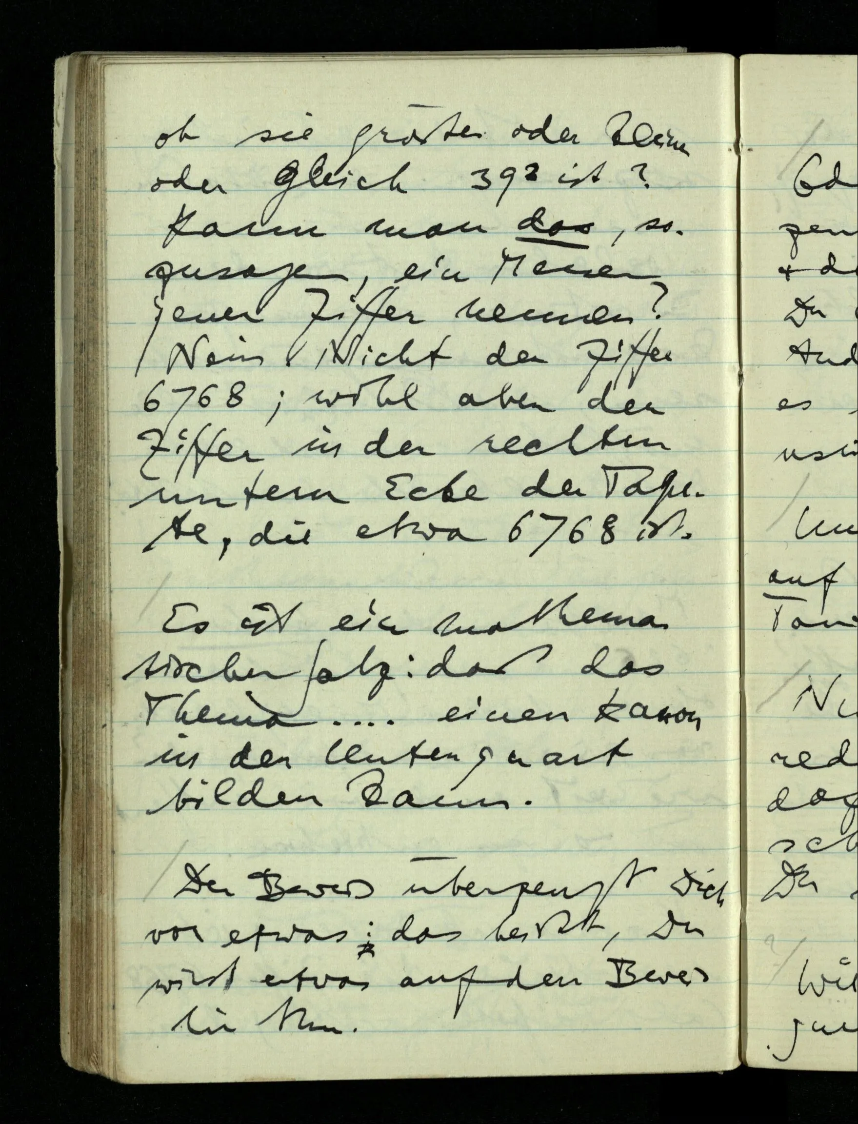 09.01.1943 Unsre Schwierigkeit fängt eigentlich schon mit der unendlichen Geraden an; obwohl wir schon als Knaben lernen, eine Gerade habe kein Ende, & ich weiß nicht, daß diese Idee irgend jemand Schwierigkeiten bereitet hätte. Wie, wenn ein Finitist versuchte diesen Begriff durch den einer geraden Strecke von bestimmter Länge zu ersetzen?!