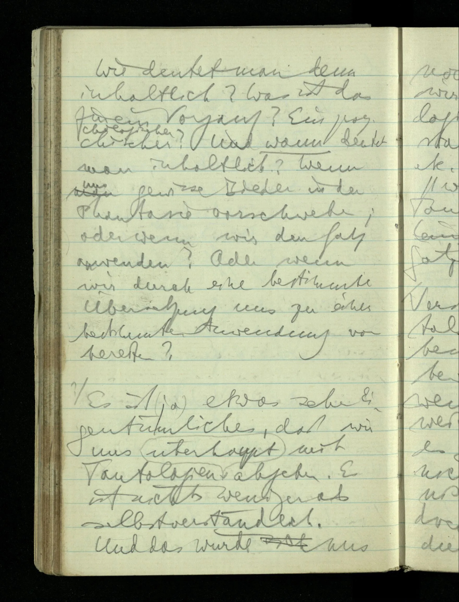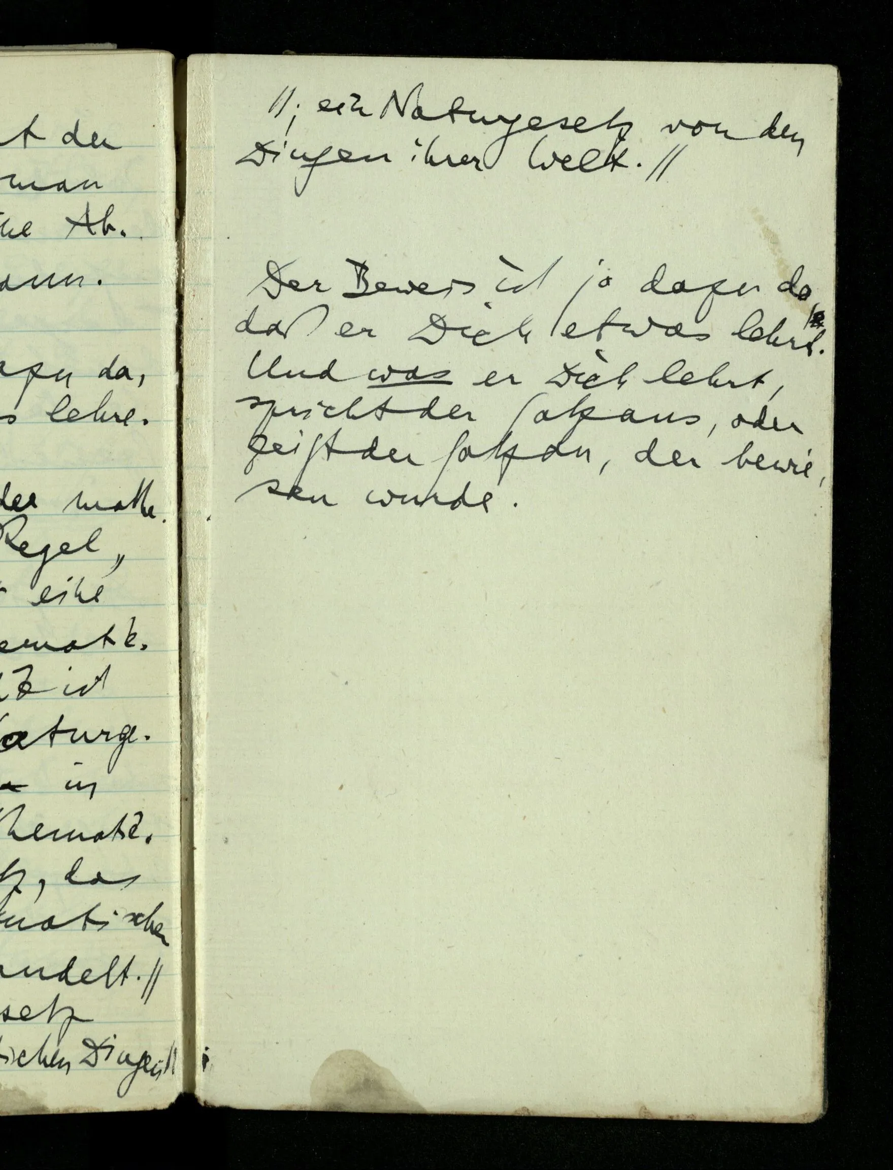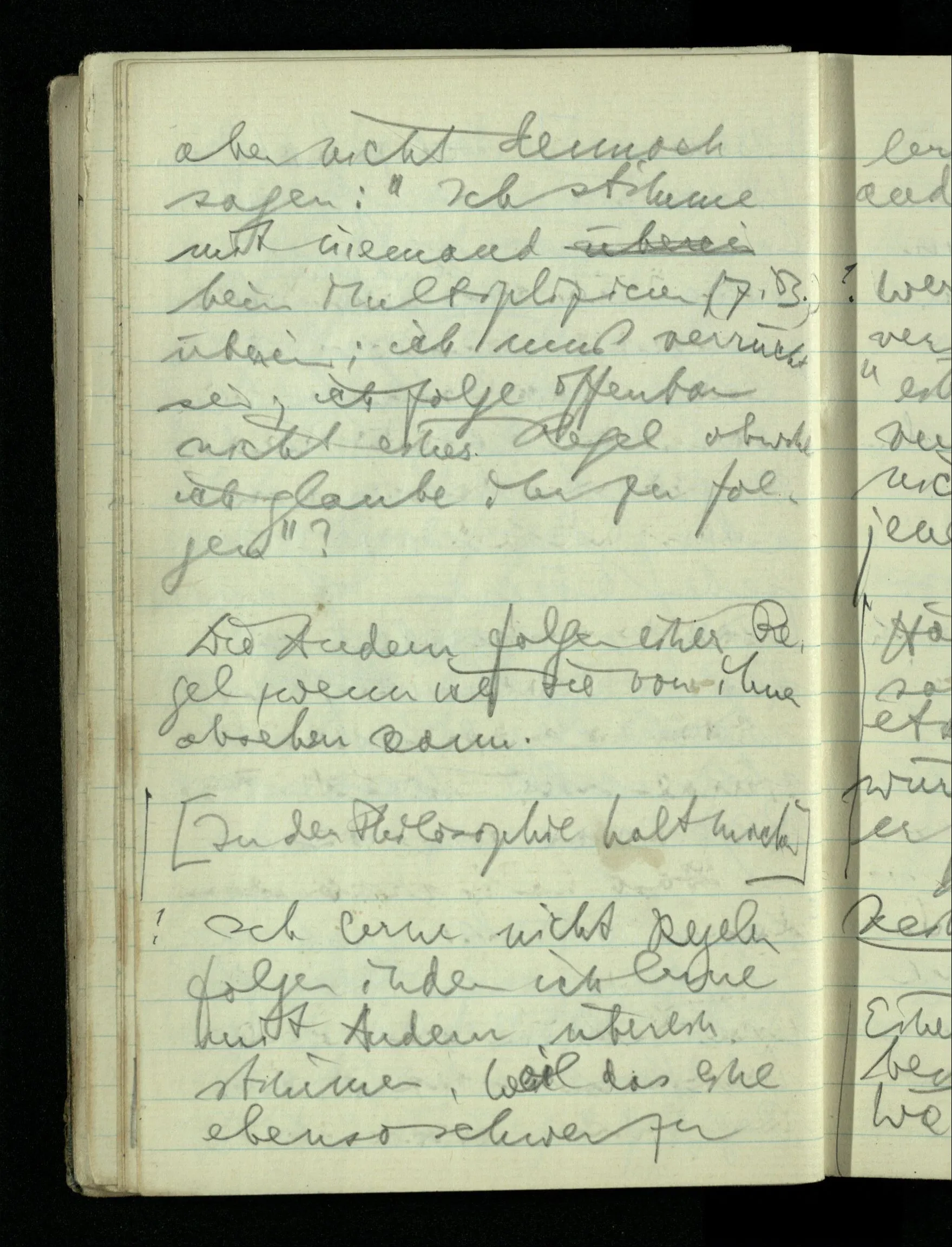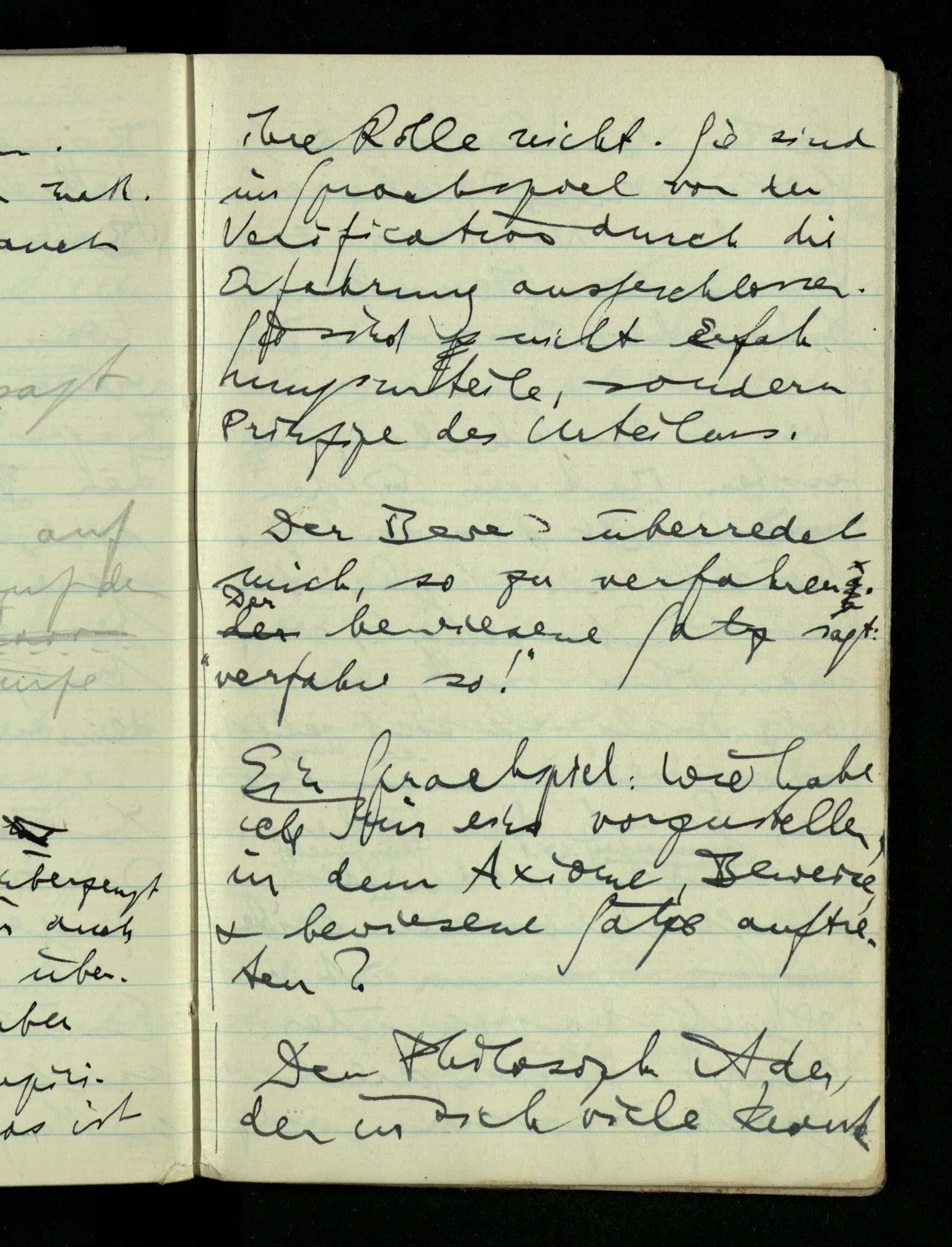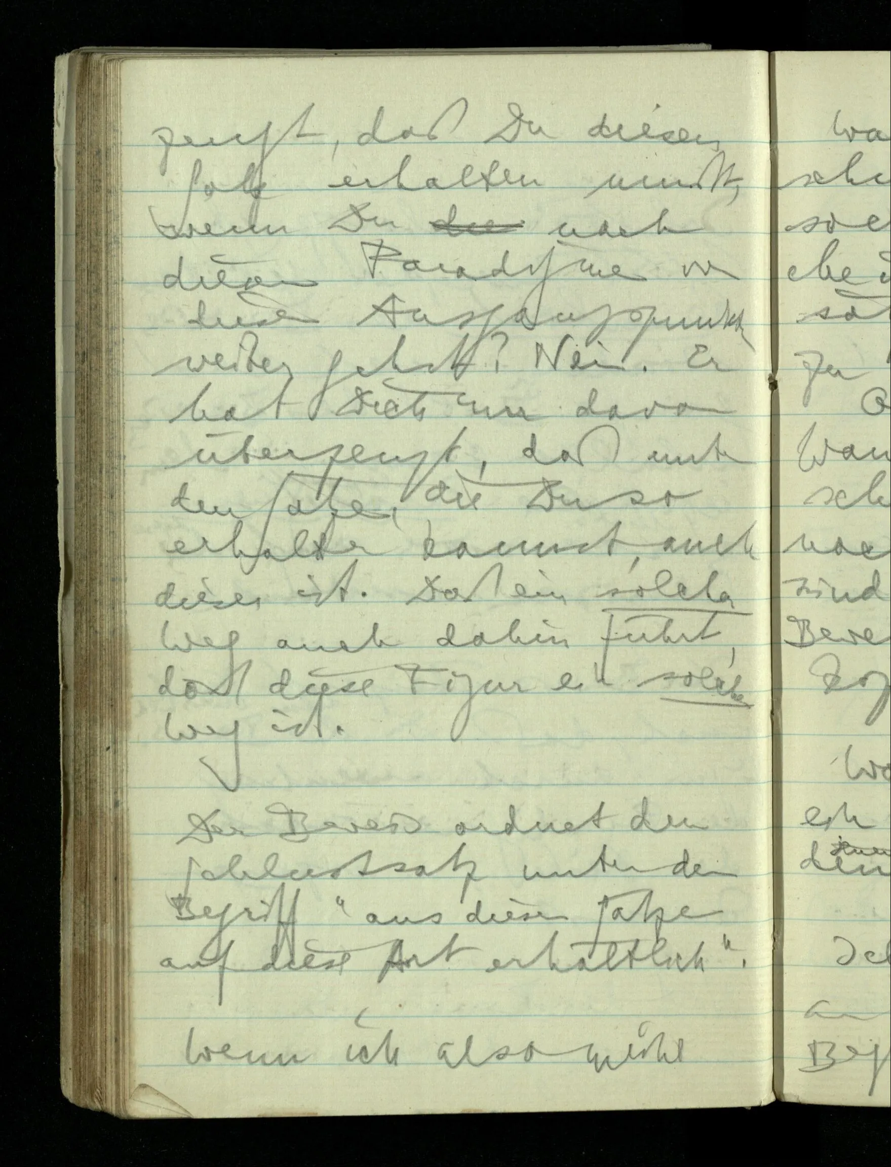 09.01.1943 Unsre Schwierigkeit fängt eigentlich schon mit der unendlichen Geraden an; obwohl wir schon als Knaben lernen, eine Gerade habe kein Ende, & ich weiß nicht, daß diese Idee irgend jemand Schwierigkeiten bereitet hätte. Wie, wenn ein Finitist versuchte diesen Begriff durch den einer geraden Strecke von bestimmter Länge zu ersetzen?!