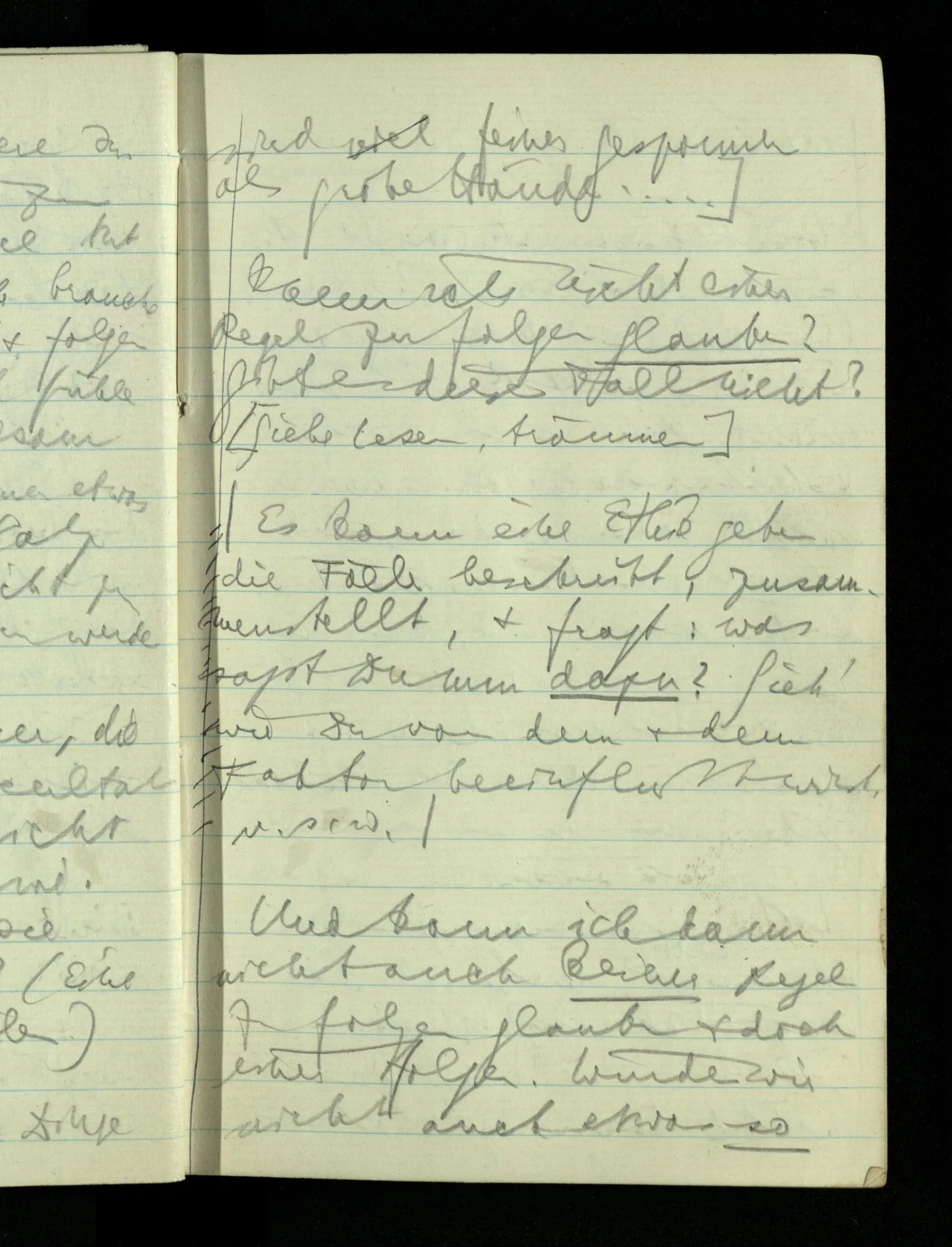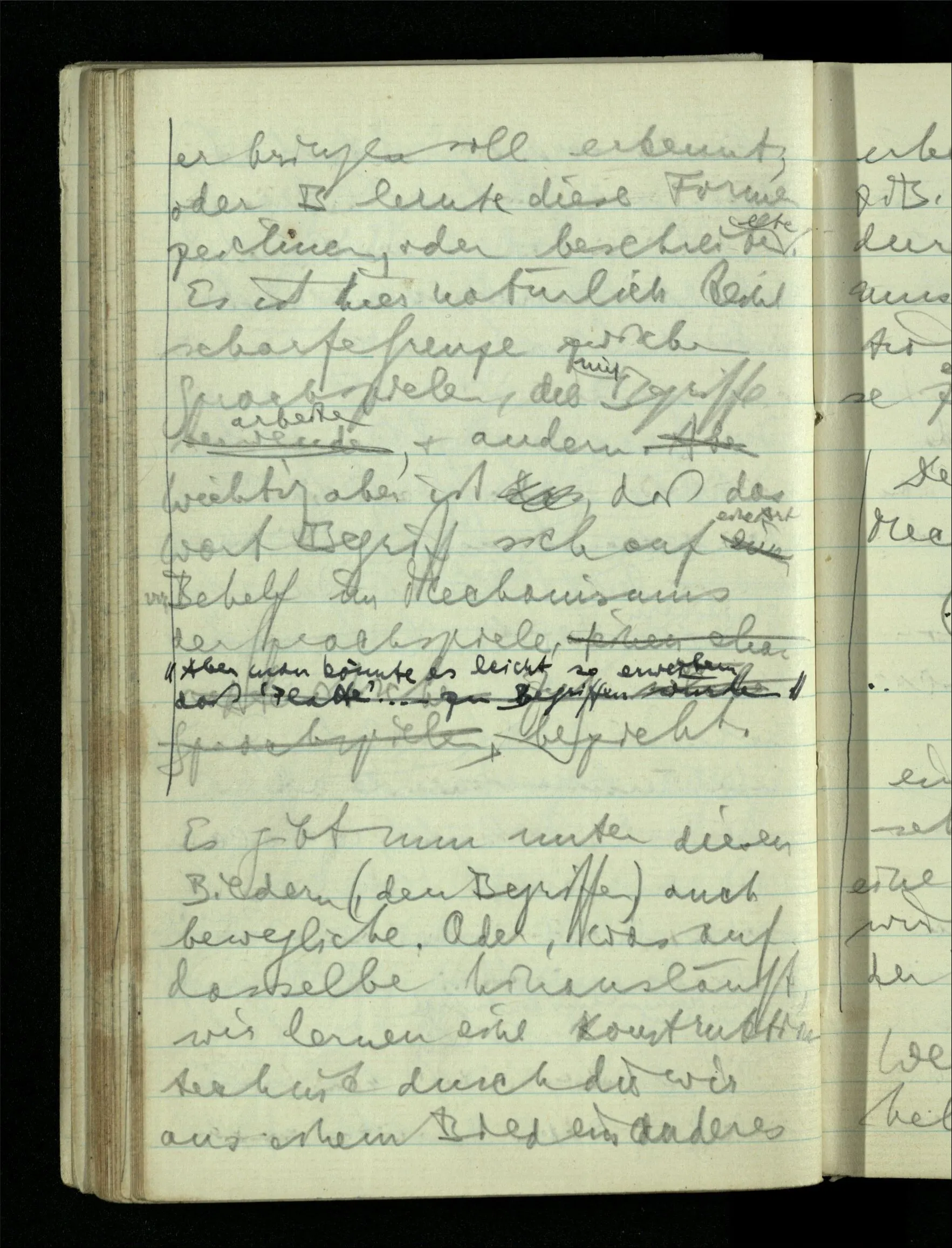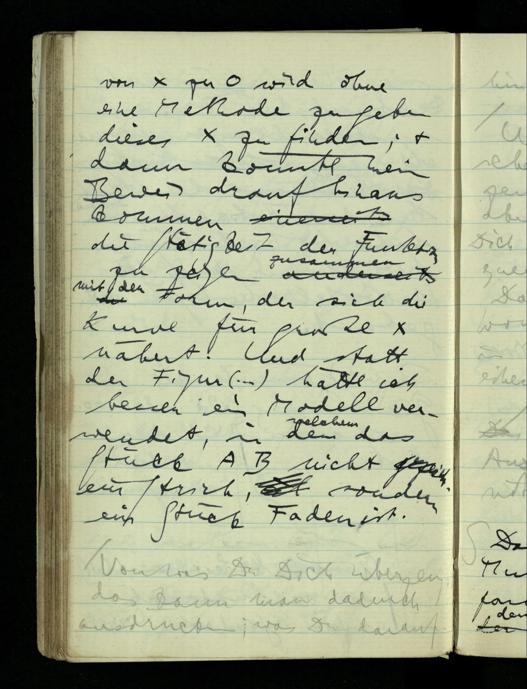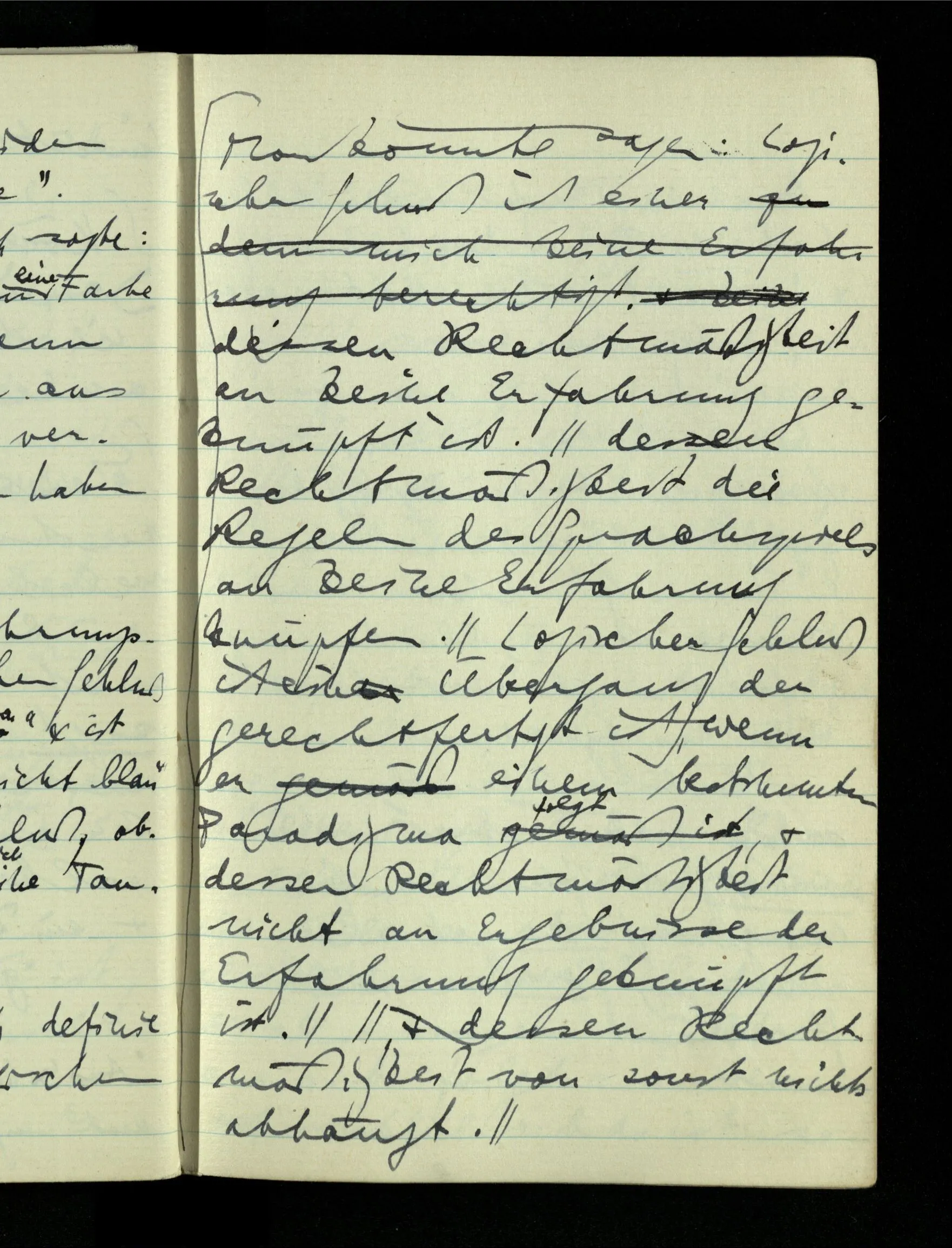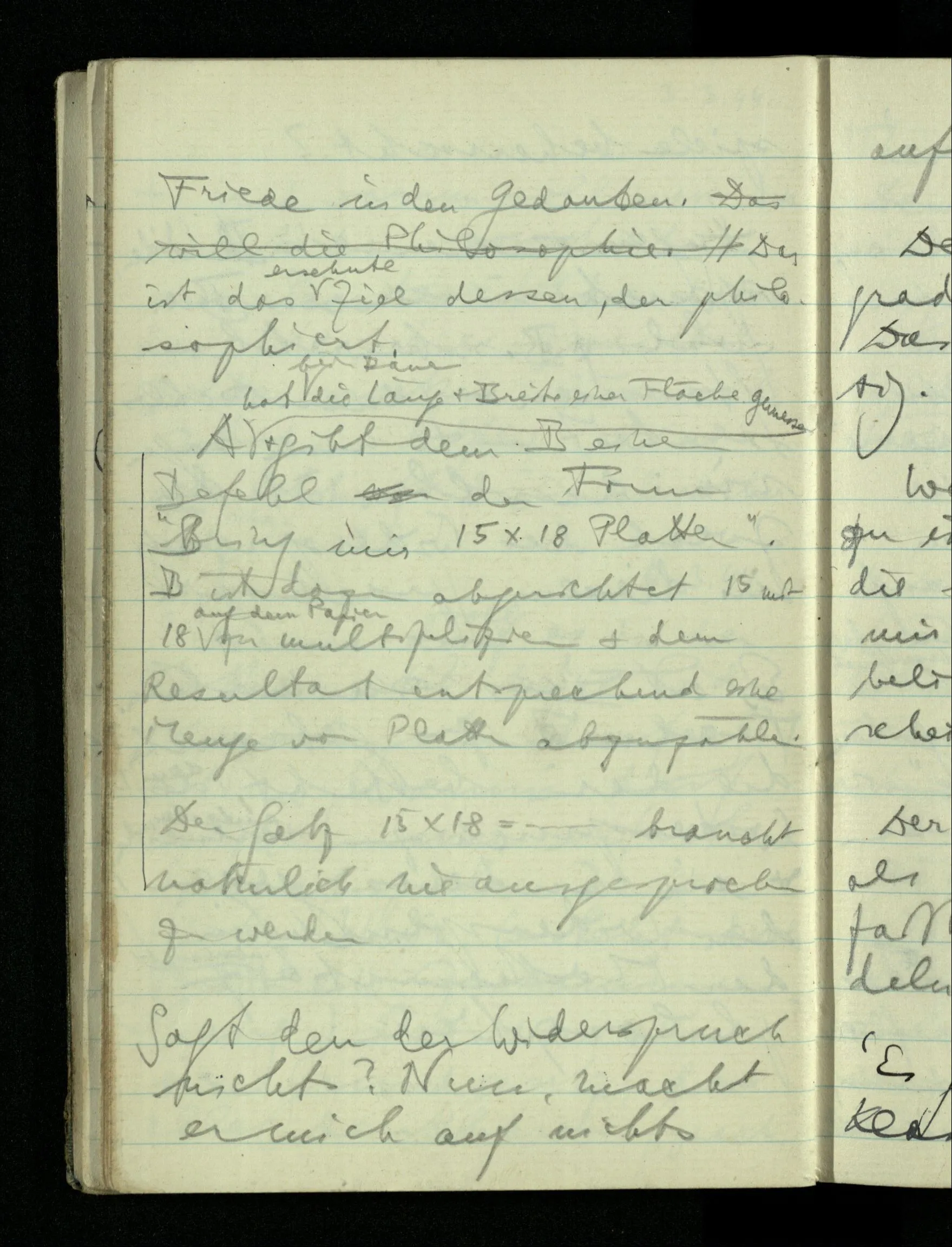 09.01.1943 Unsre Schwierigkeit fängt eigentlich schon mit der unendlichen Geraden an; obwohl wir schon als Knaben lernen, eine Gerade habe kein Ende, & ich weiß nicht, daß diese Idee irgend jemand Schwierigkeiten bereitet hätte. Wie, wenn ein Finitist versuchte diesen Begriff durch den einer geraden Strecke von bestimmter Länge zu ersetzen?!