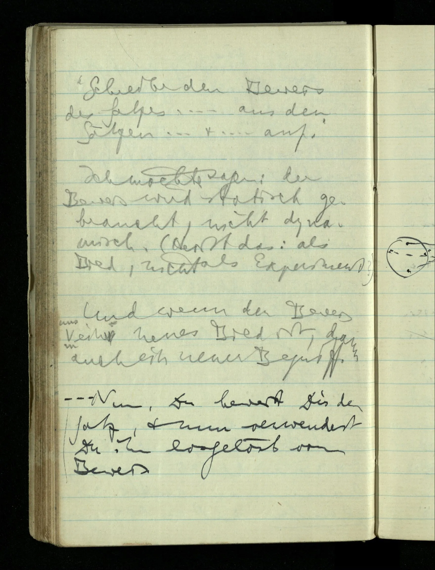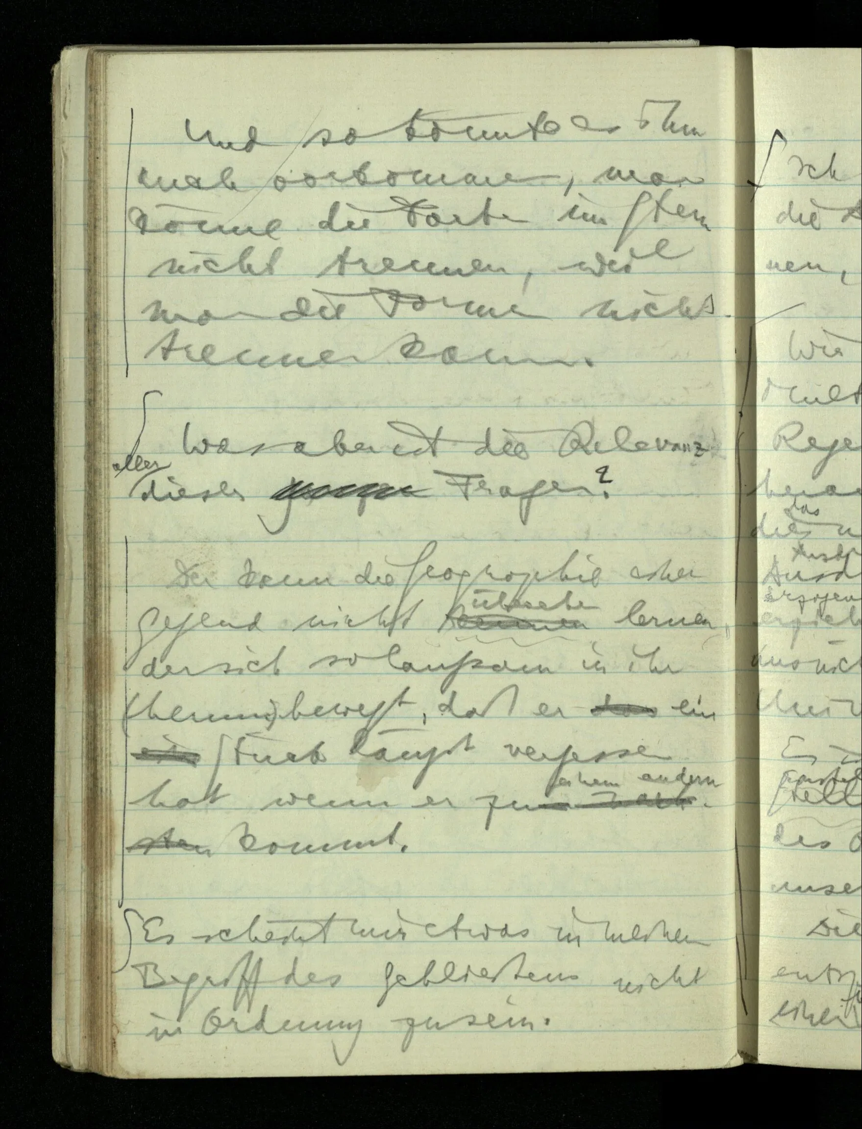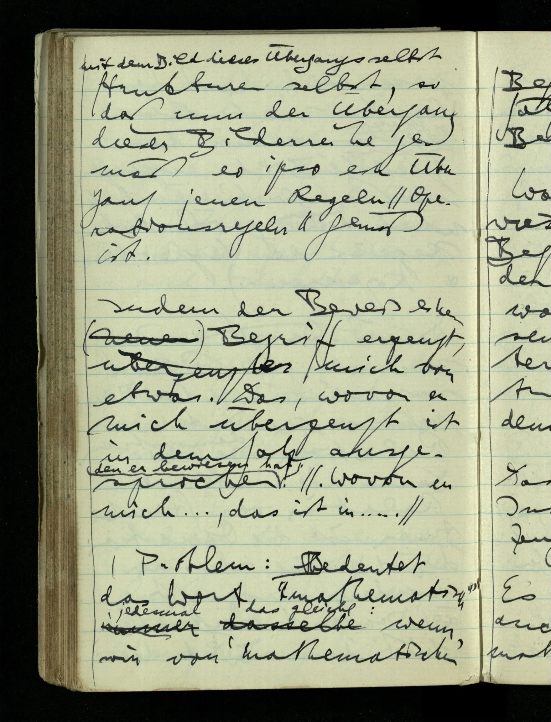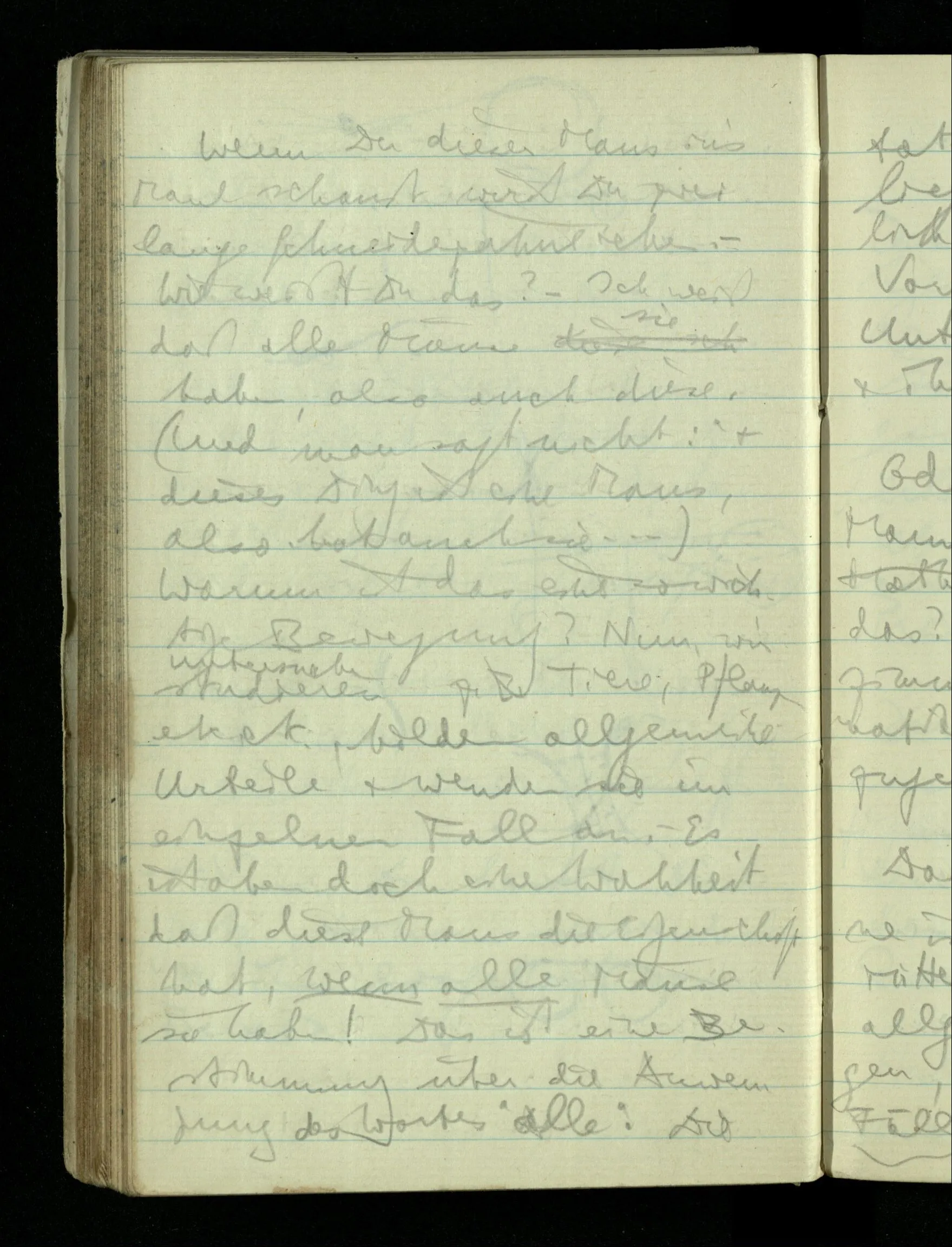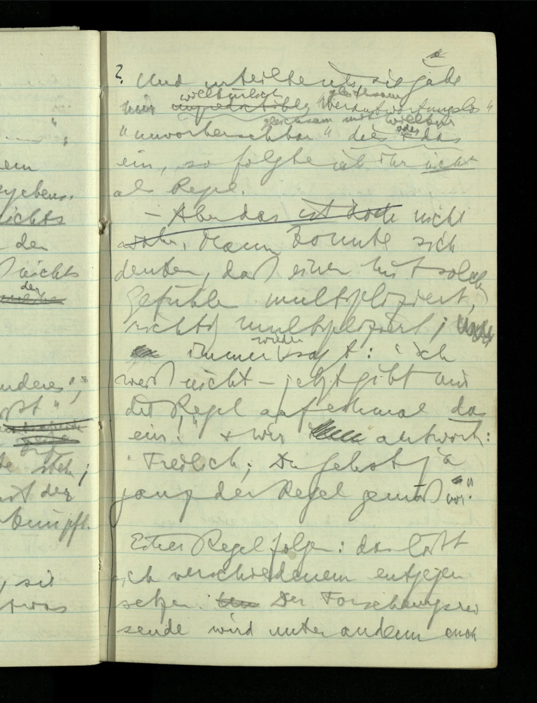09.01.1943 Unsre Schwierigkeit fängt eigentlich schon mit der unendlichen Geraden an; obwohl wir schon als Knaben lernen, eine Gerade habe kein Ende, & ich weiß nicht, daß diese Idee irgend jemand Schwierigkeiten bereitet hätte. Wie, wenn ein Finitist versuchte diesen Begriff durch den einer geraden Strecke von bestimmter Länge zu ersetzen?!