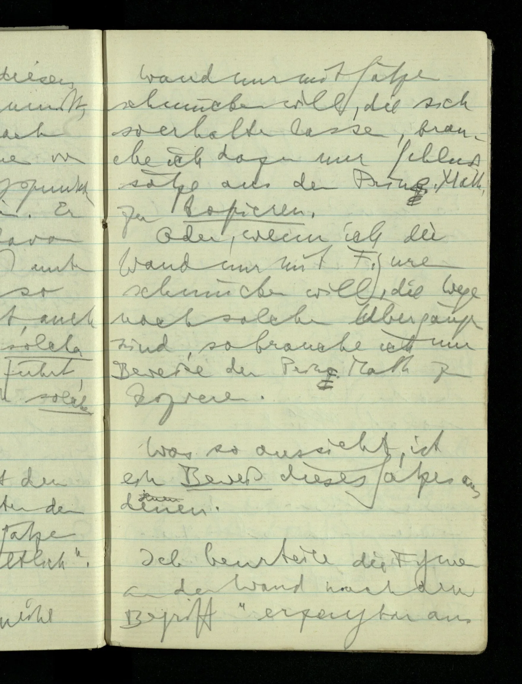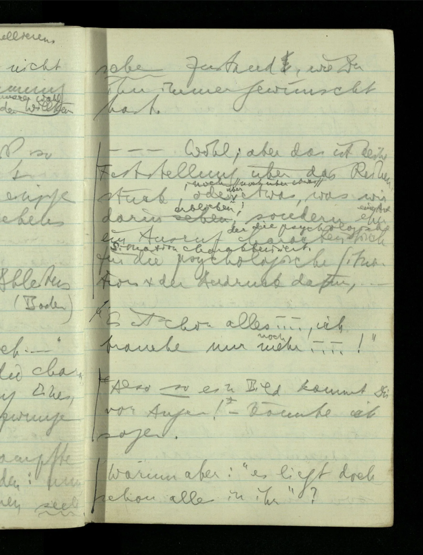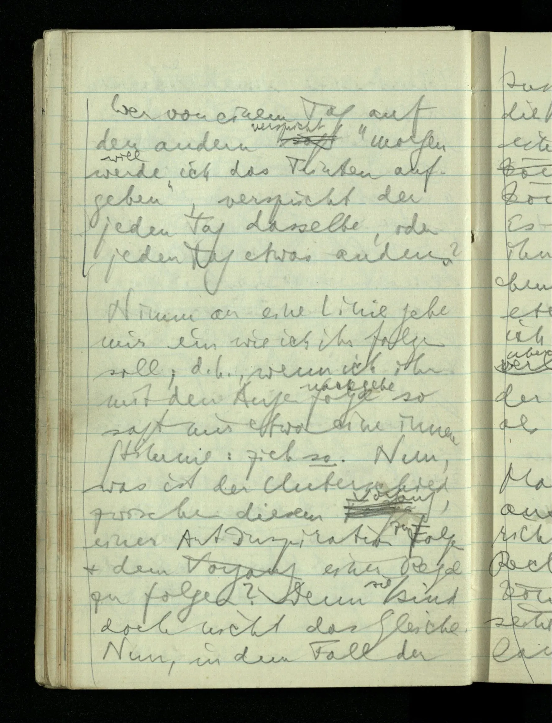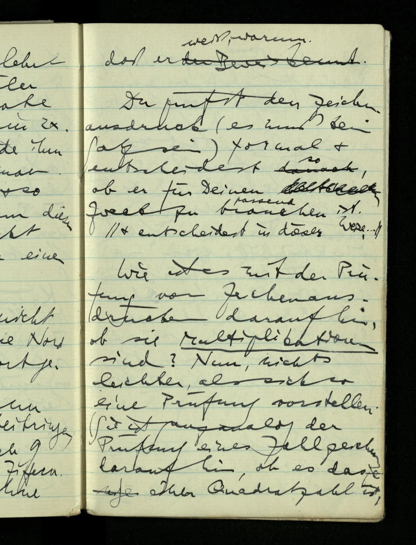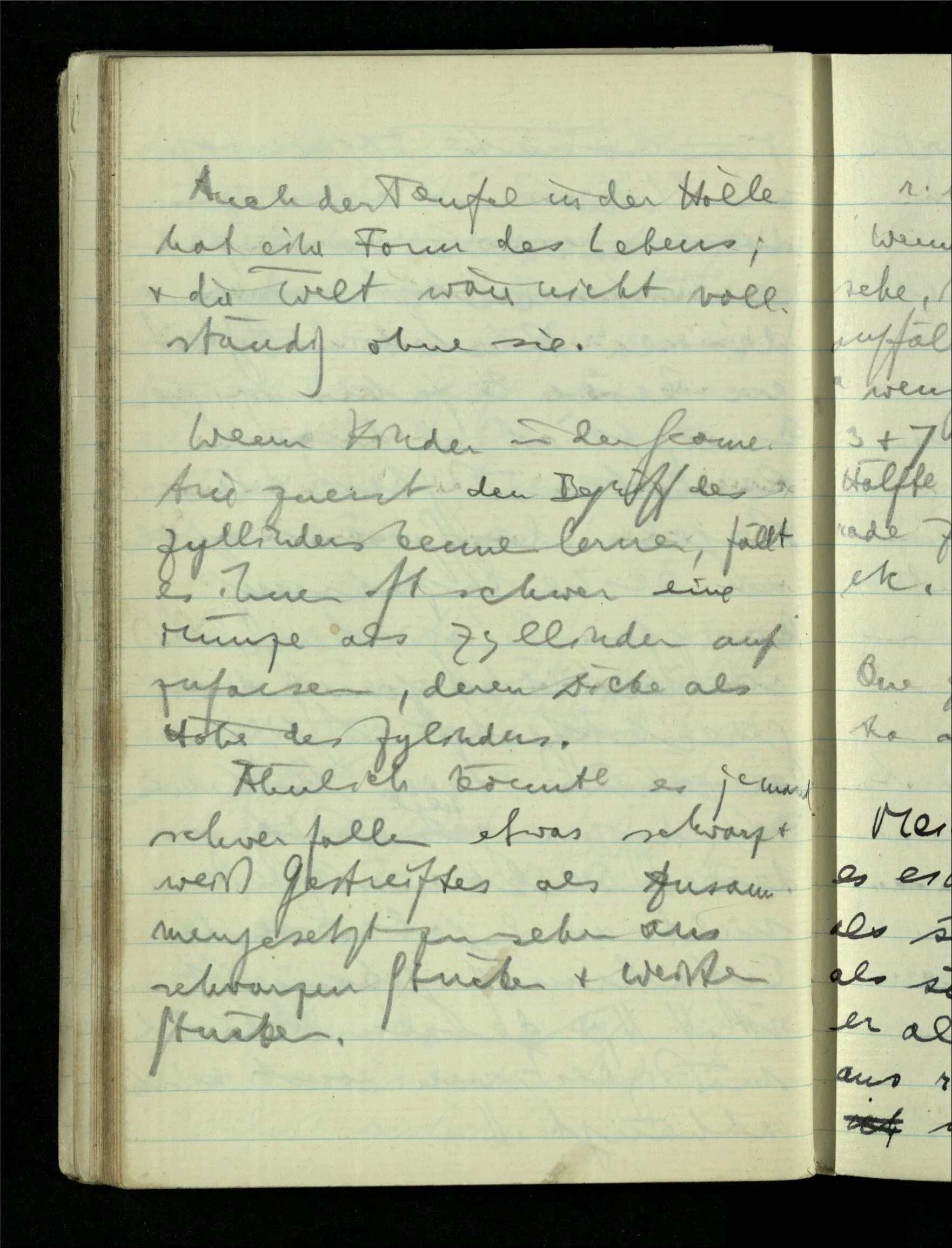 09.01.1943 Unsre Schwierigkeit fängt eigentlich schon mit der unendlichen Geraden an; obwohl wir schon als Knaben lernen, eine Gerade habe kein Ende, & ich weiß nicht, daß diese Idee irgend jemand Schwierigkeiten bereitet hätte. Wie, wenn ein Finitist versuchte diesen Begriff durch den einer geraden Strecke von bestimmter Länge zu ersetzen?!