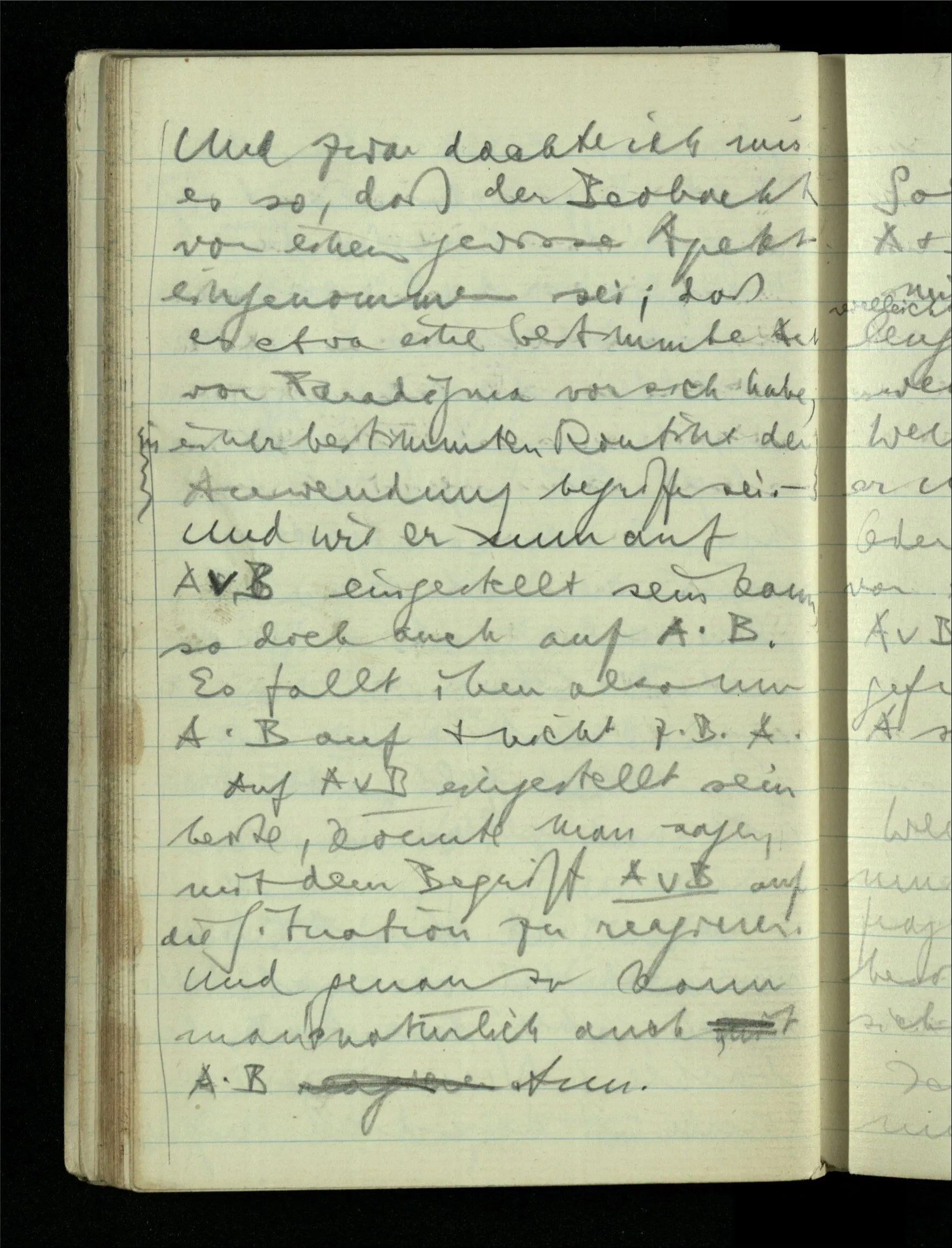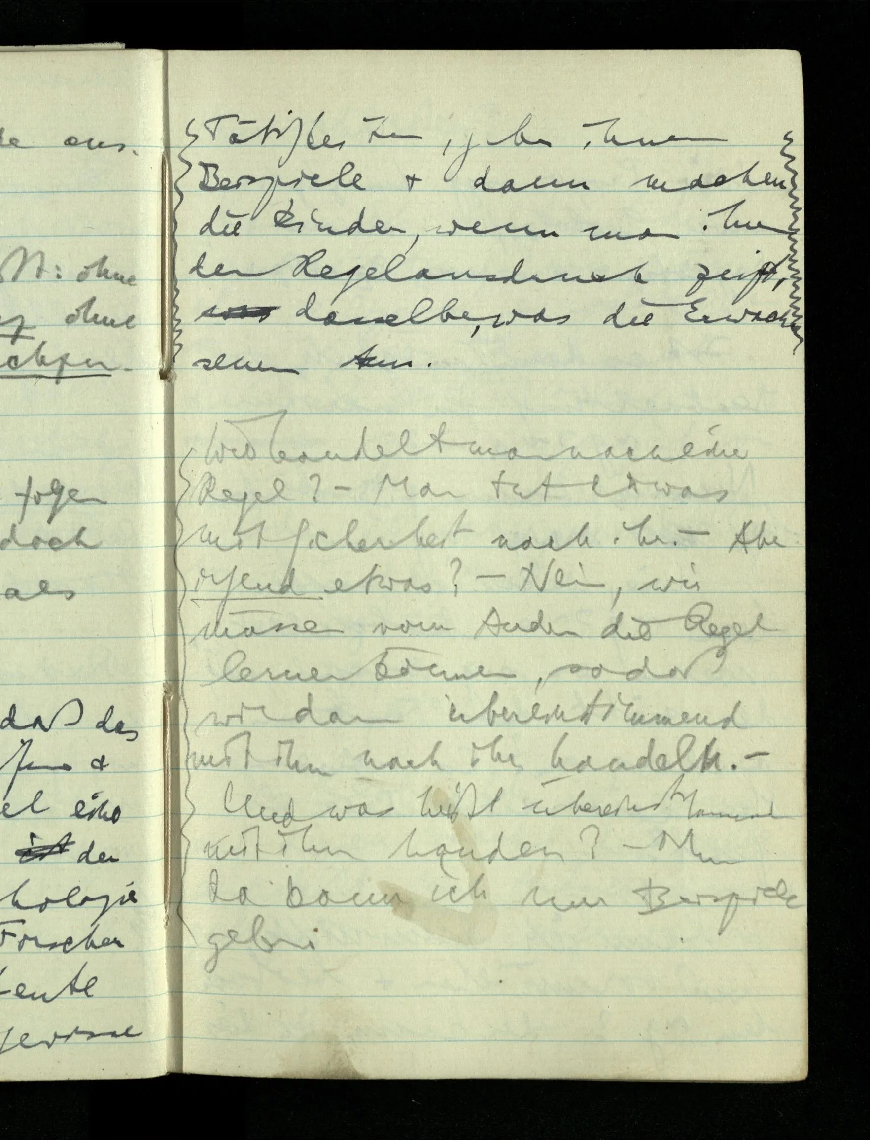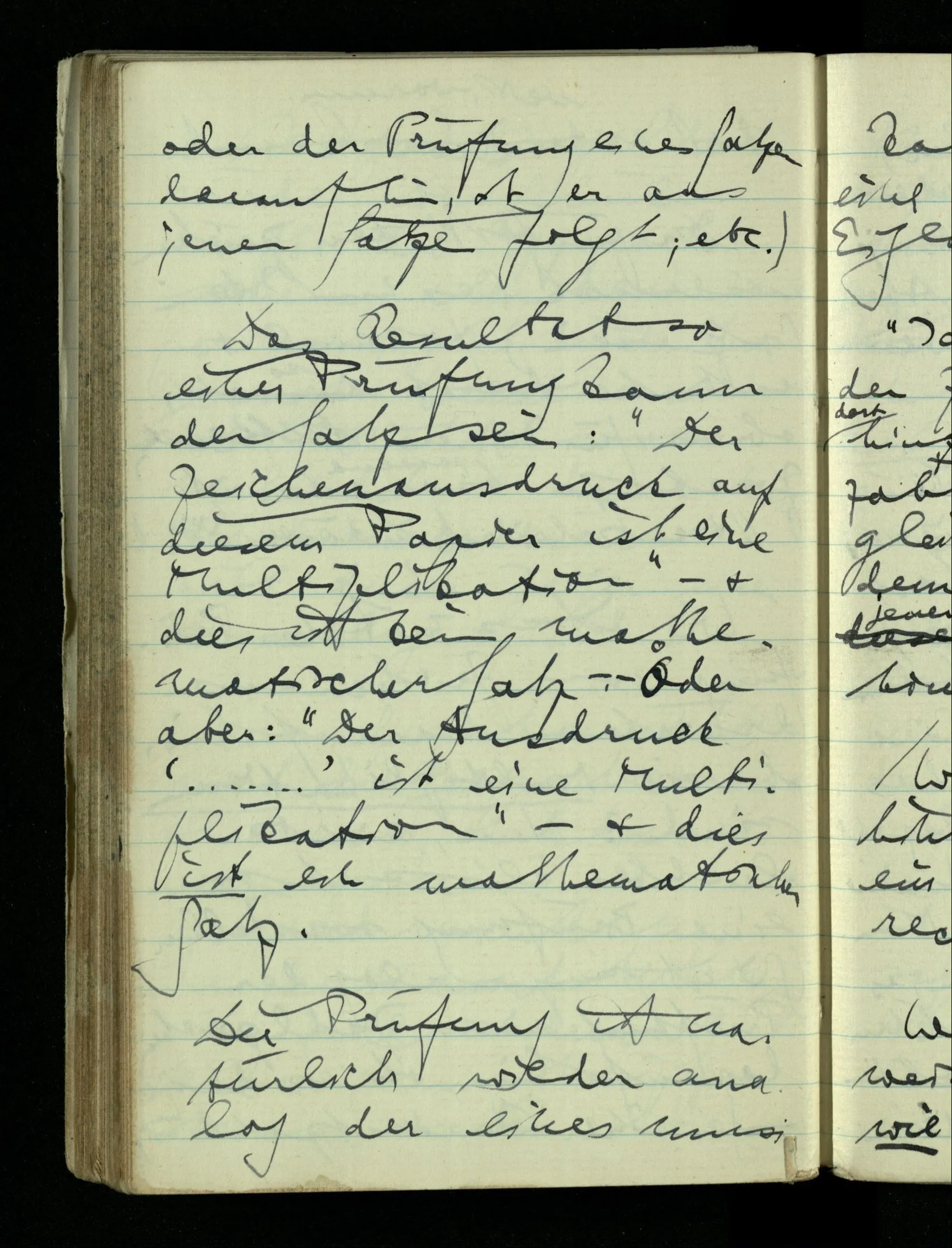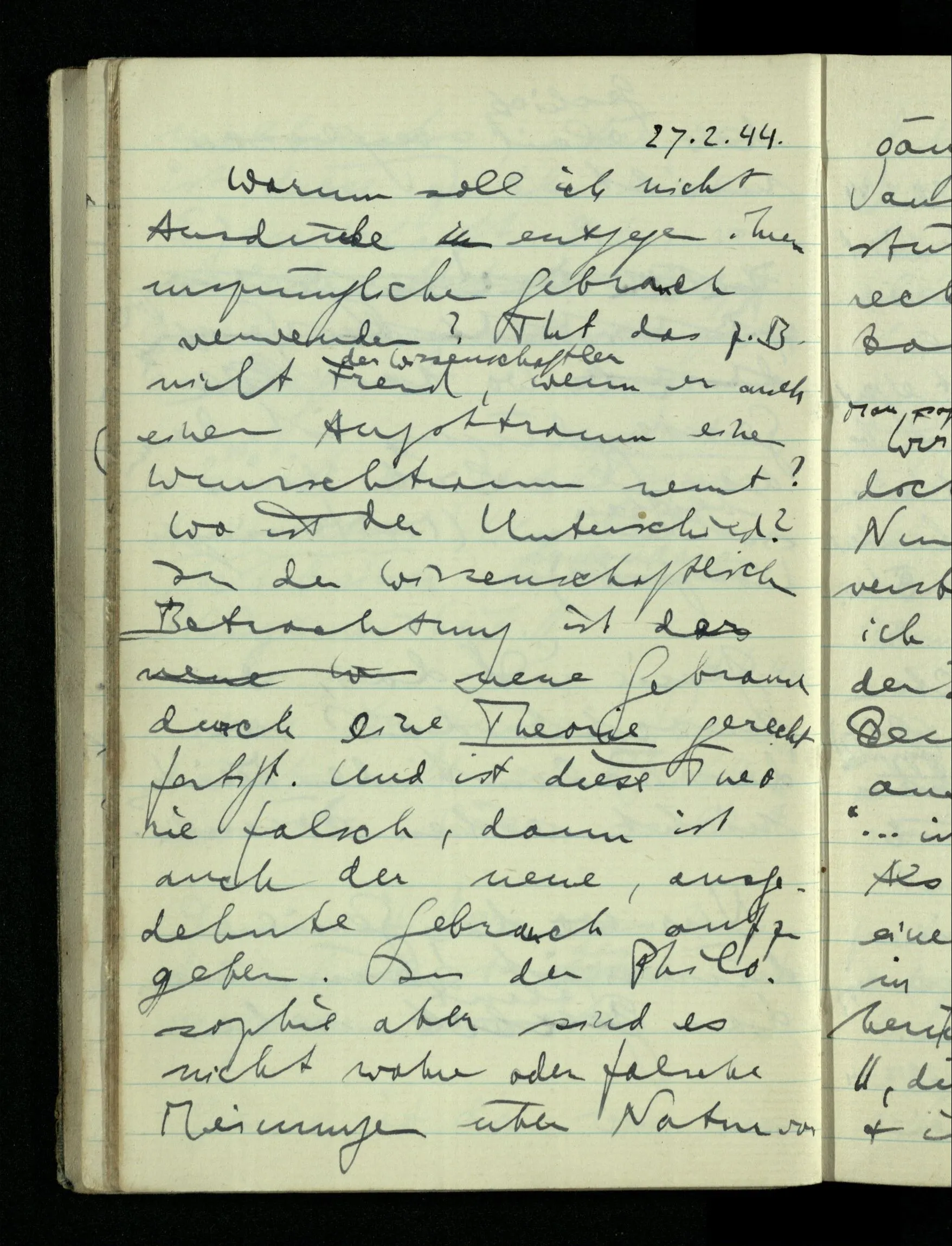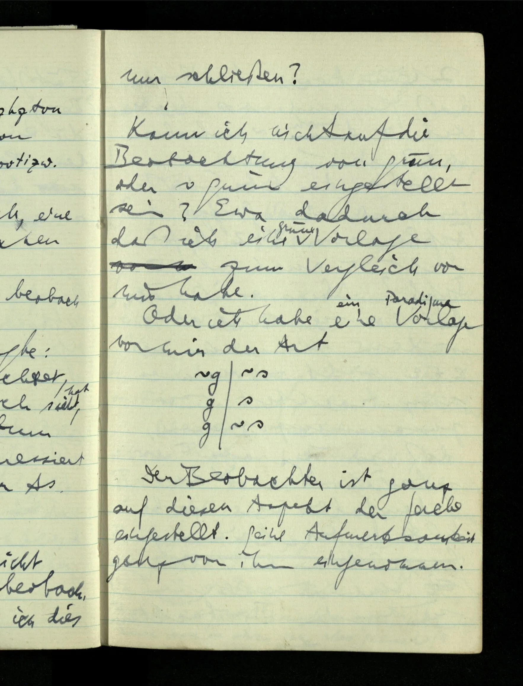 09.01.1943 Unsre Schwierigkeit fängt eigentlich schon mit der unendlichen Geraden an; obwohl wir schon als Knaben lernen, eine Gerade habe kein Ende, & ich weiß nicht, daß diese Idee irgend jemand Schwierigkeiten bereitet hätte. Wie, wenn ein Finitist versuchte diesen Begriff durch den einer geraden Strecke von bestimmter Länge zu ersetzen?!