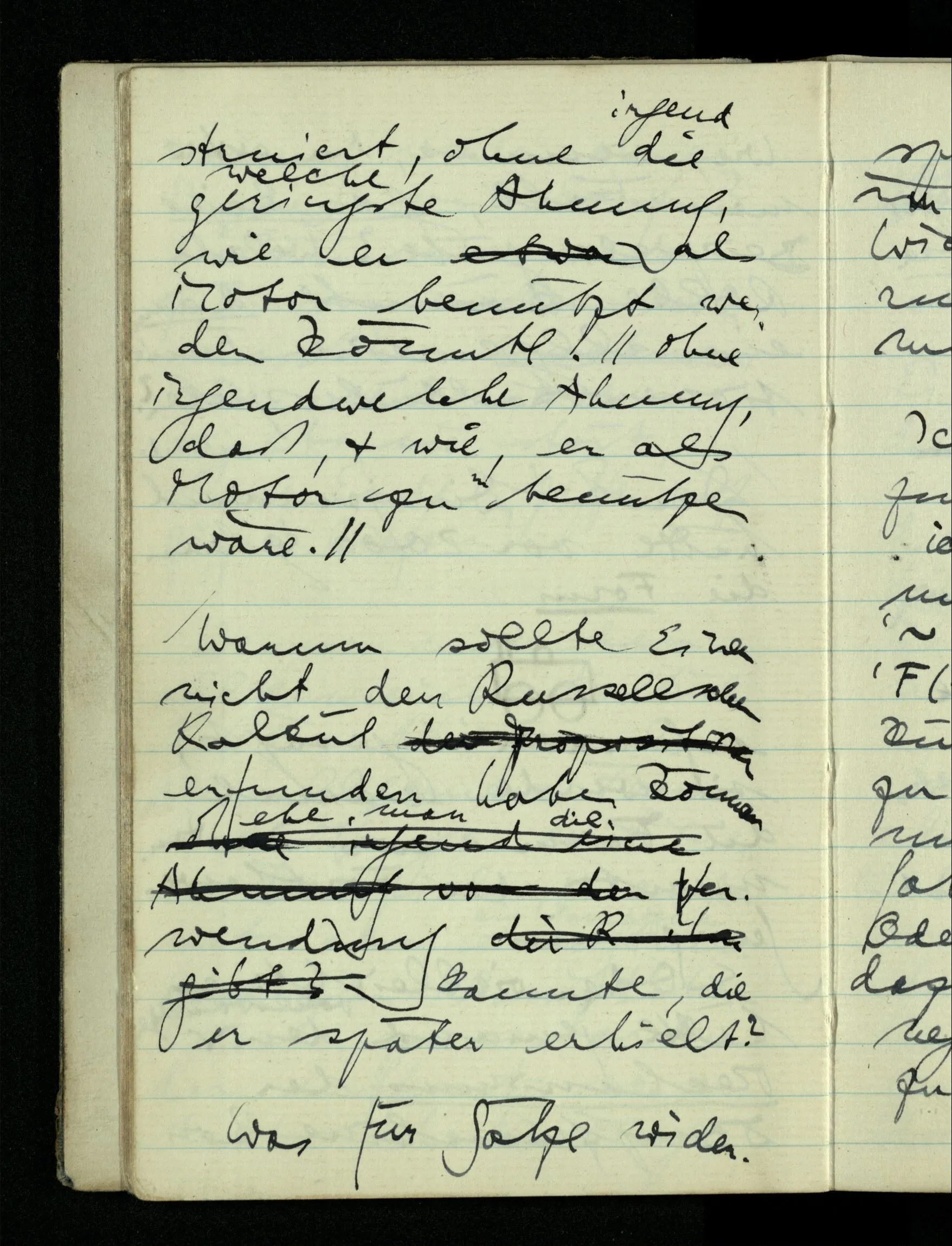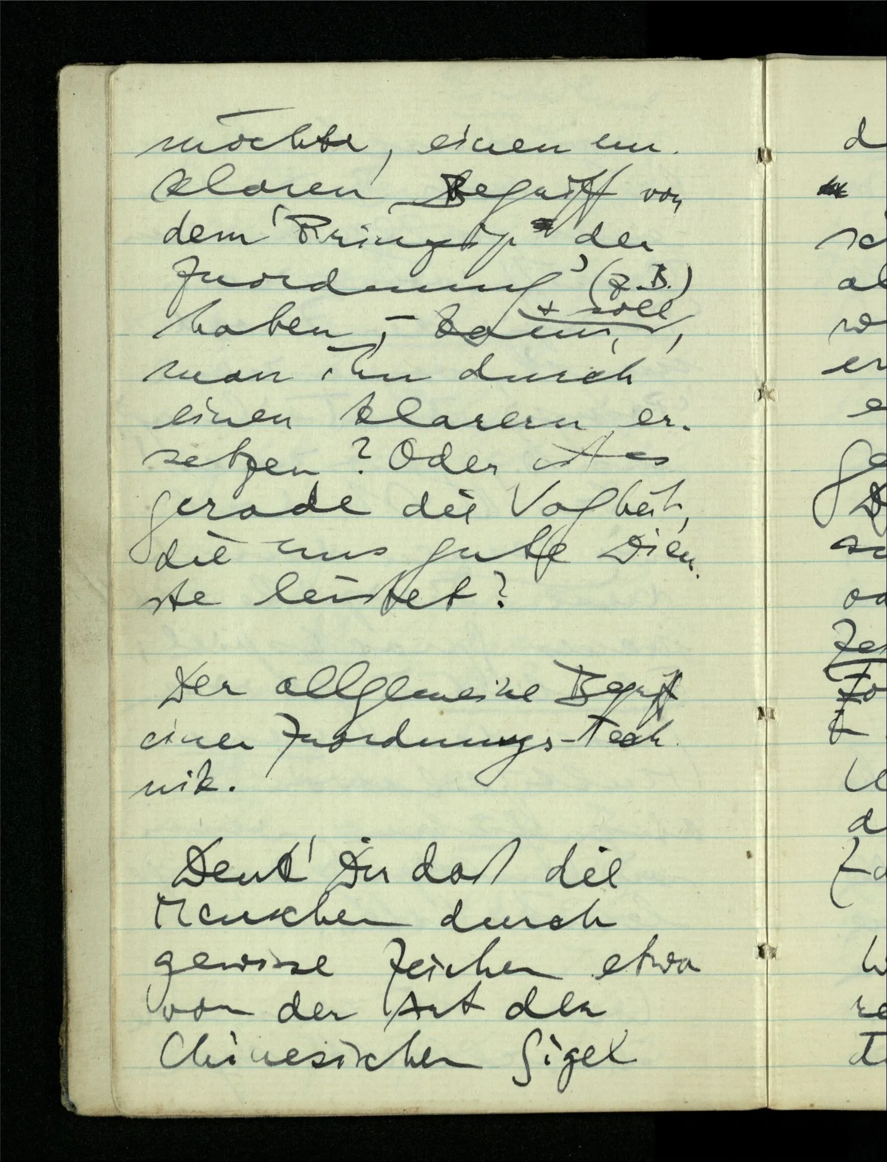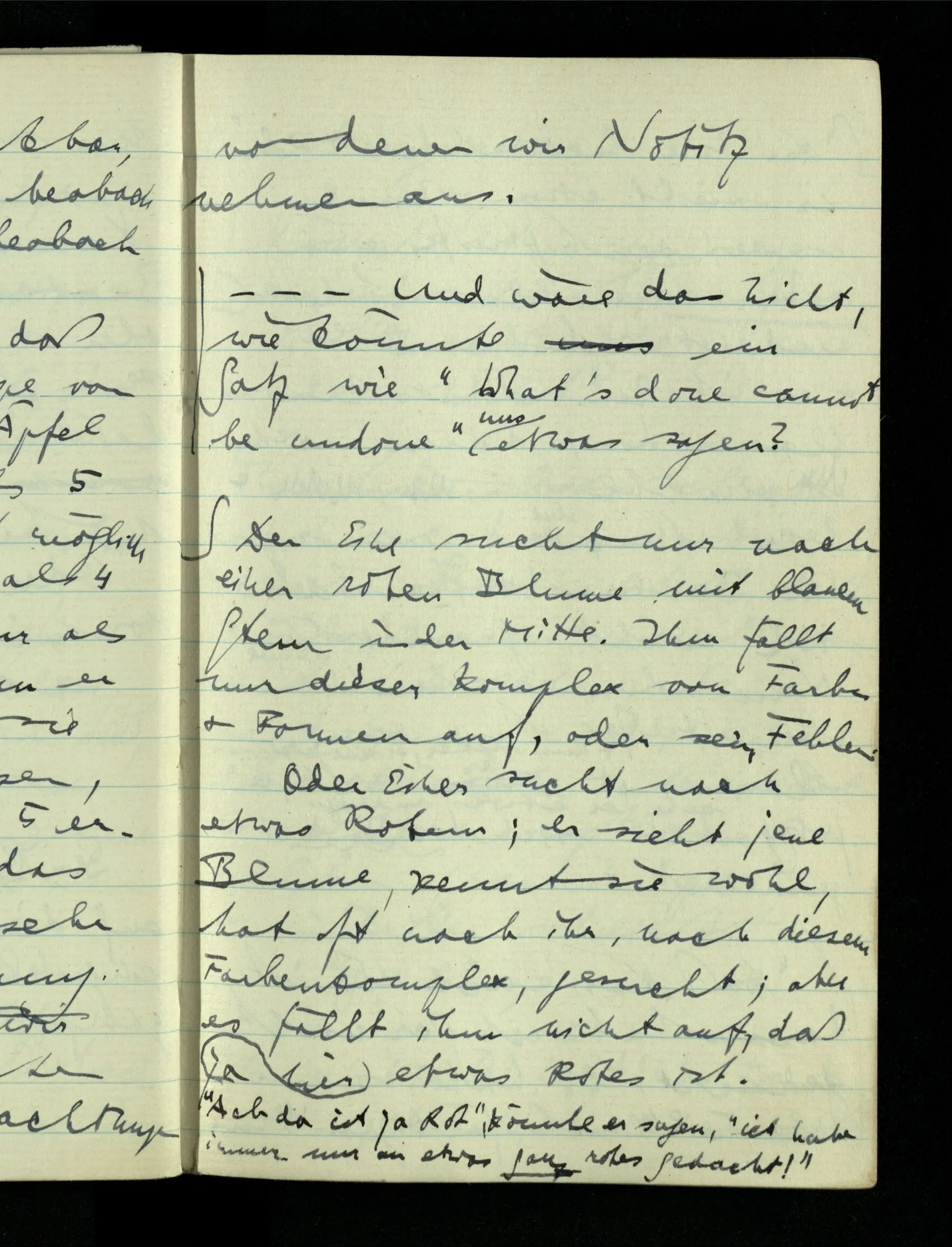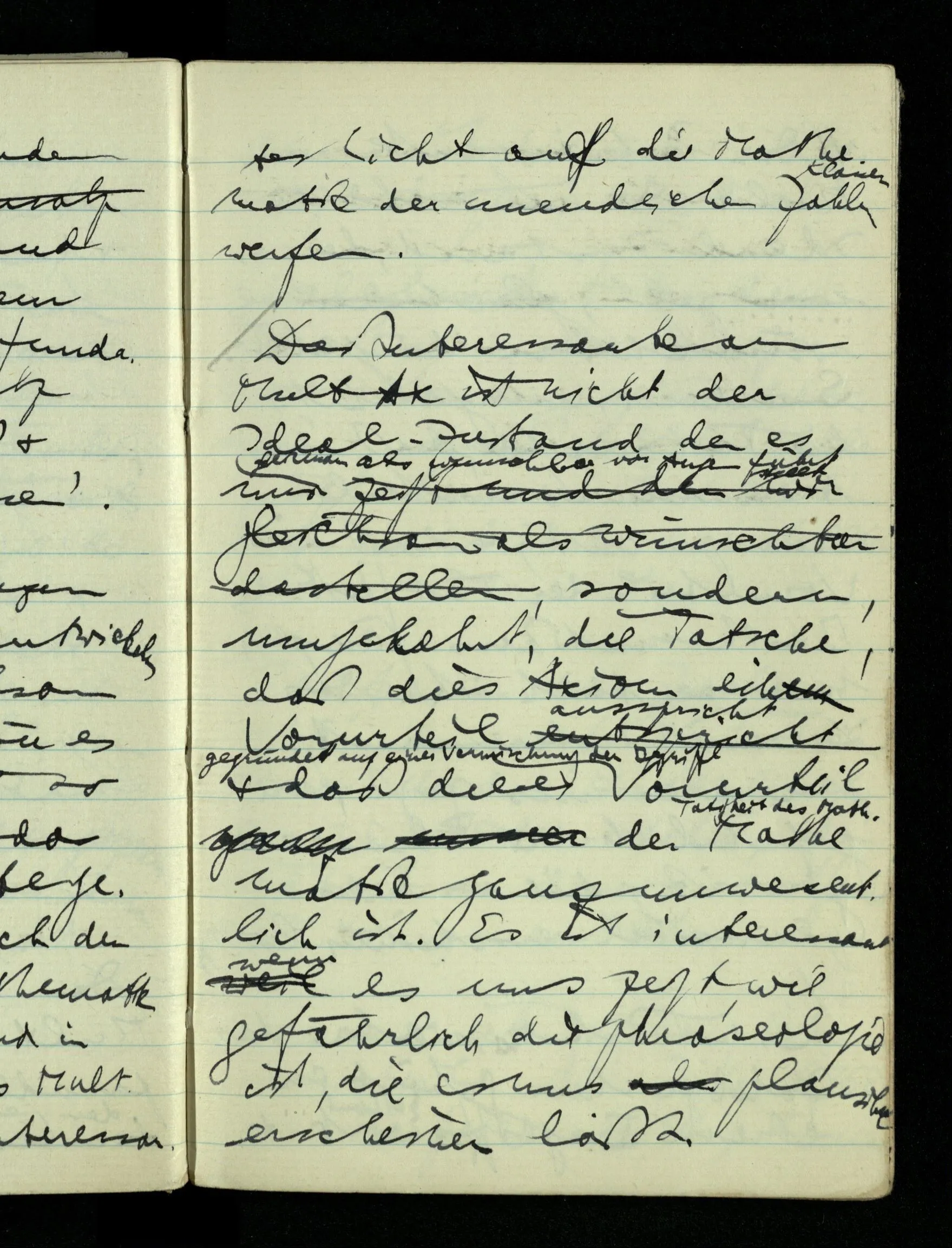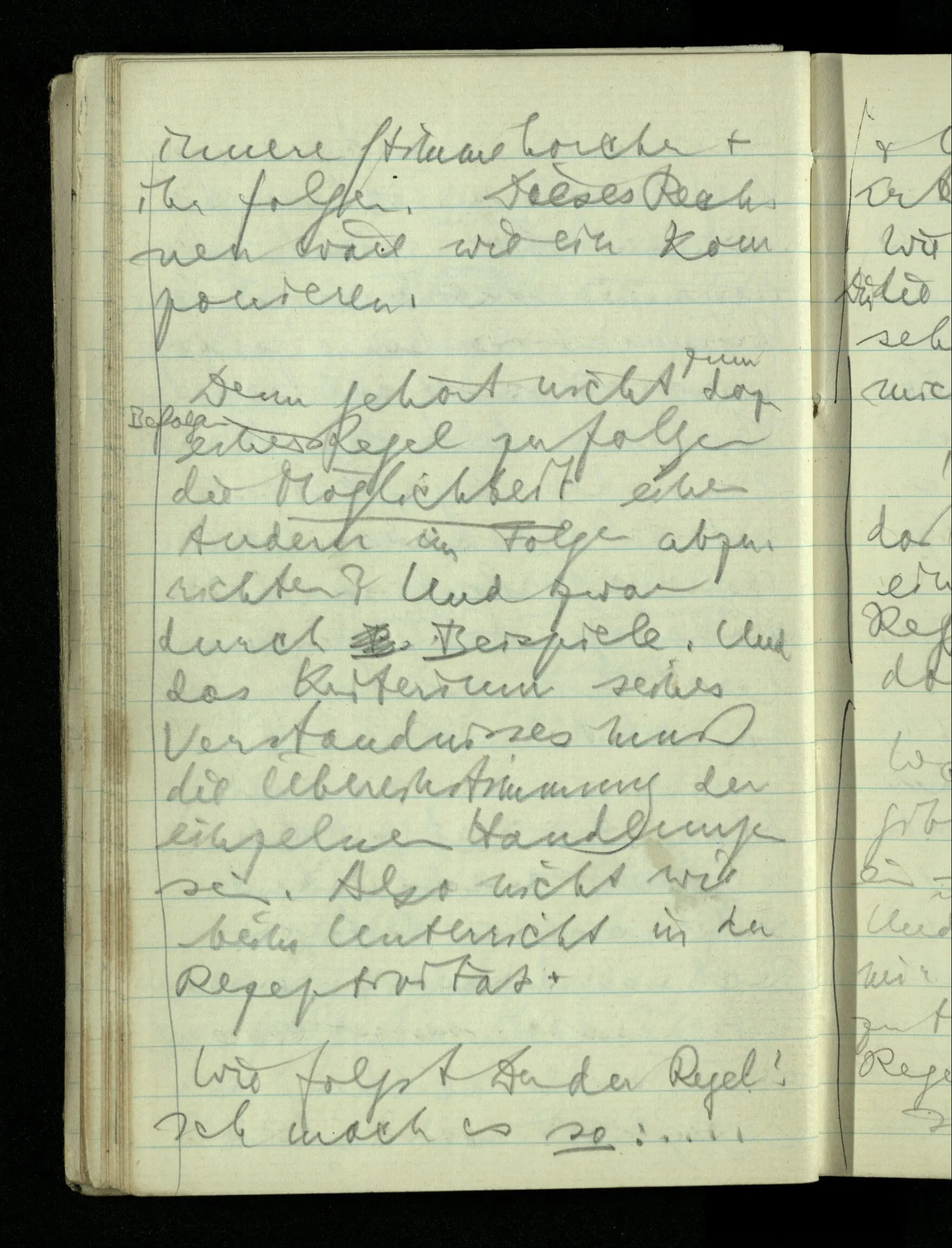 09.01.1943 Unsre Schwierigkeit fängt eigentlich schon mit der unendlichen Geraden an; obwohl wir schon als Knaben lernen, eine Gerade habe kein Ende, & ich weiß nicht, daß diese Idee irgend jemand Schwierigkeiten bereitet hätte. Wie, wenn ein Finitist versuchte diesen Begriff durch den einer geraden Strecke von bestimmter Länge zu ersetzen?!