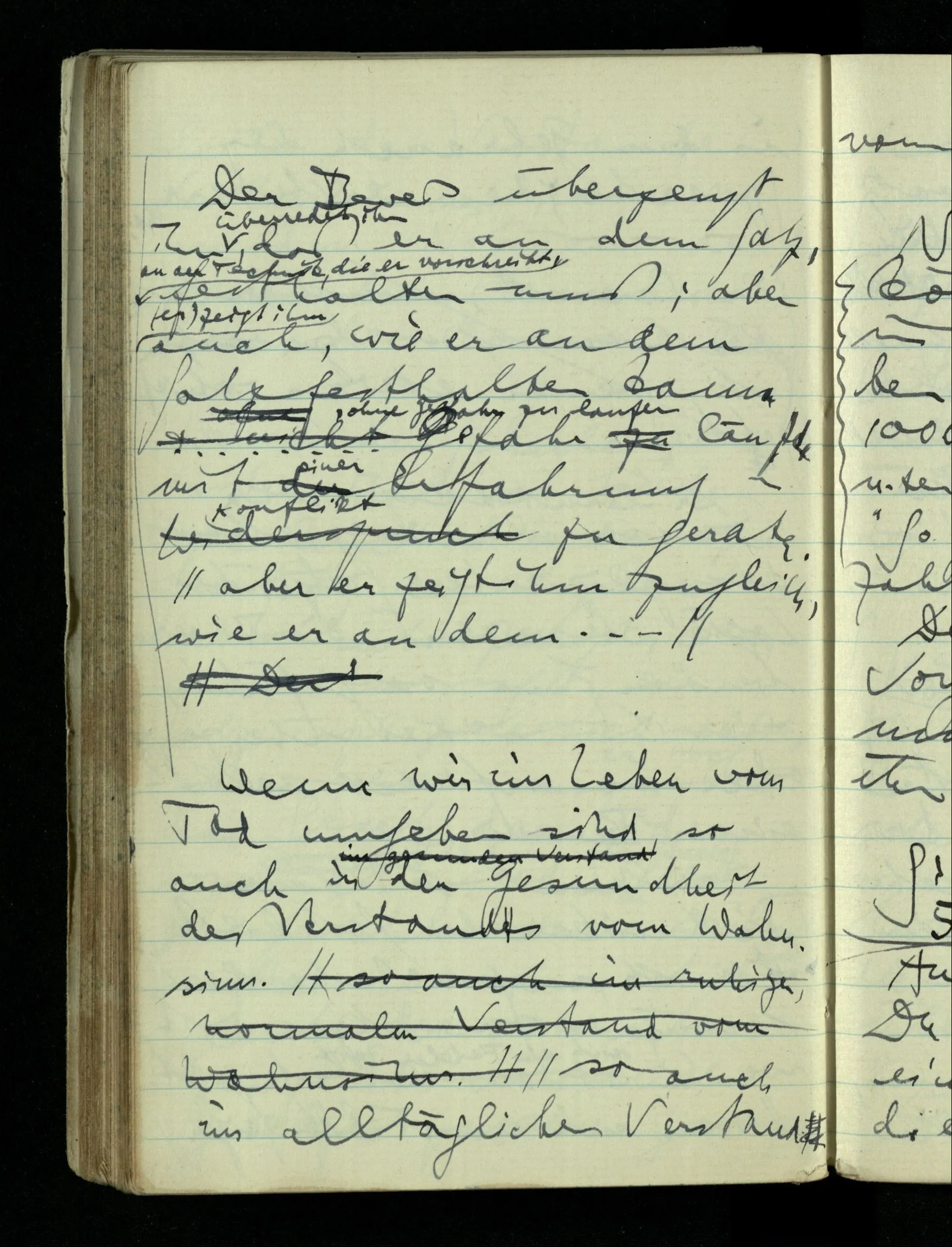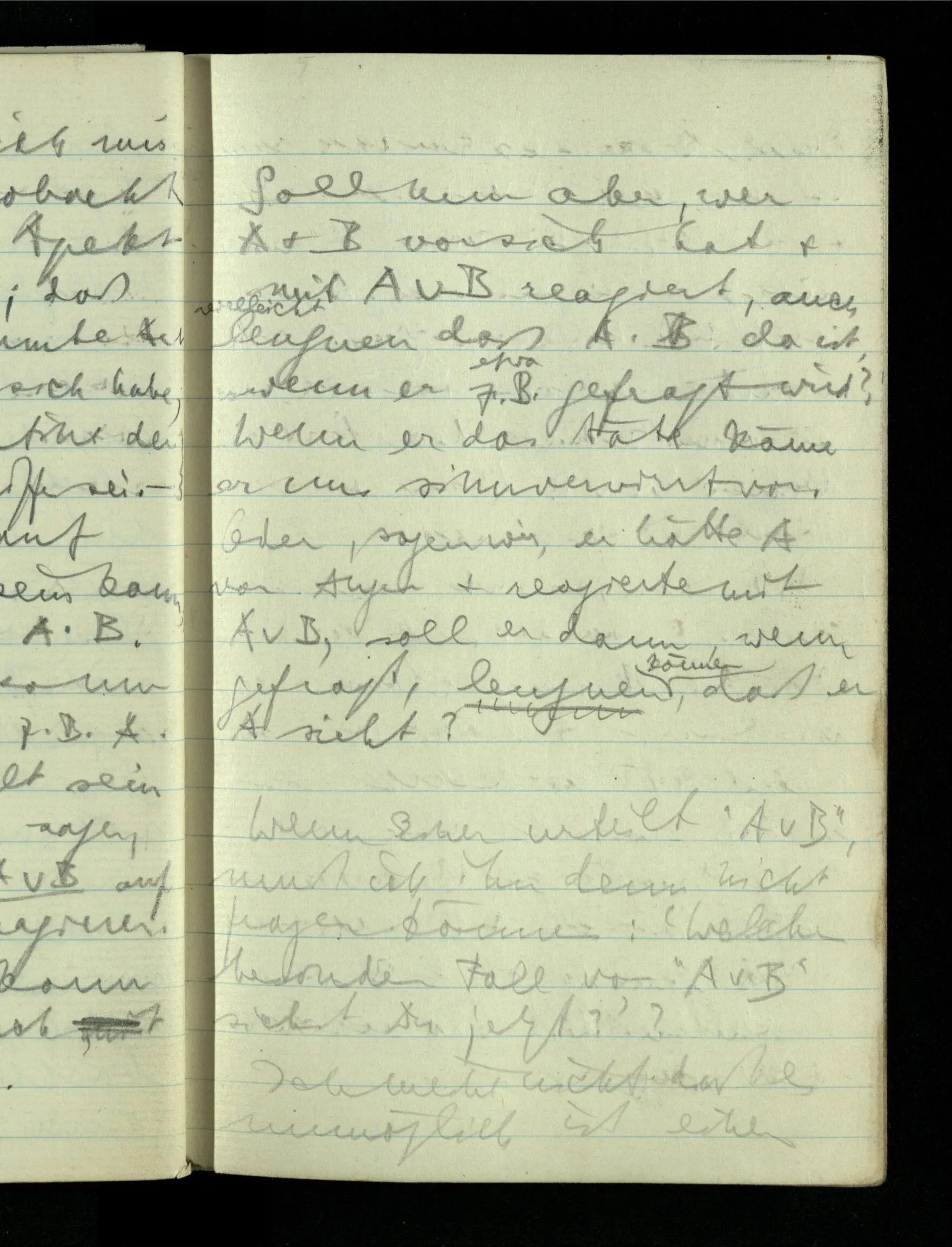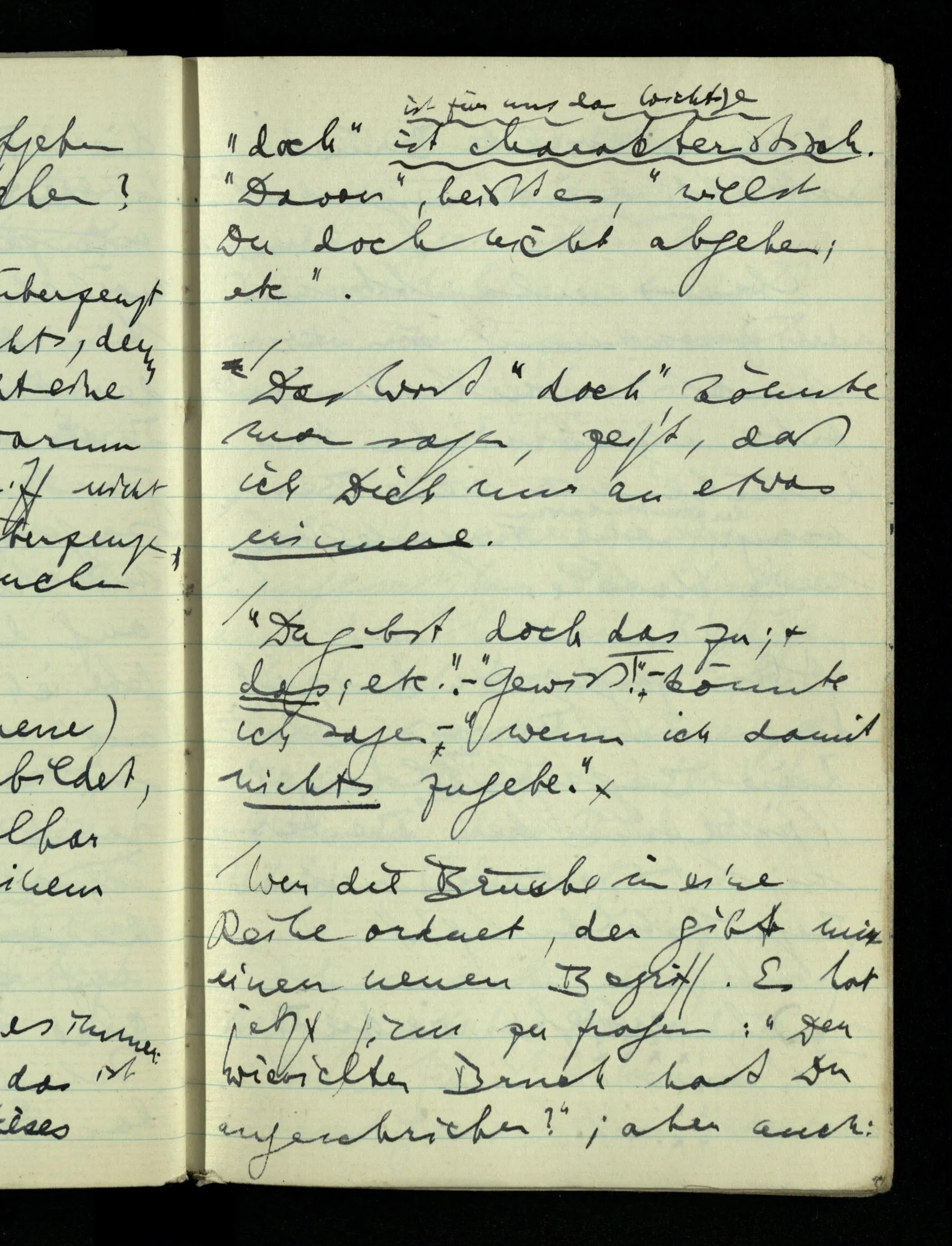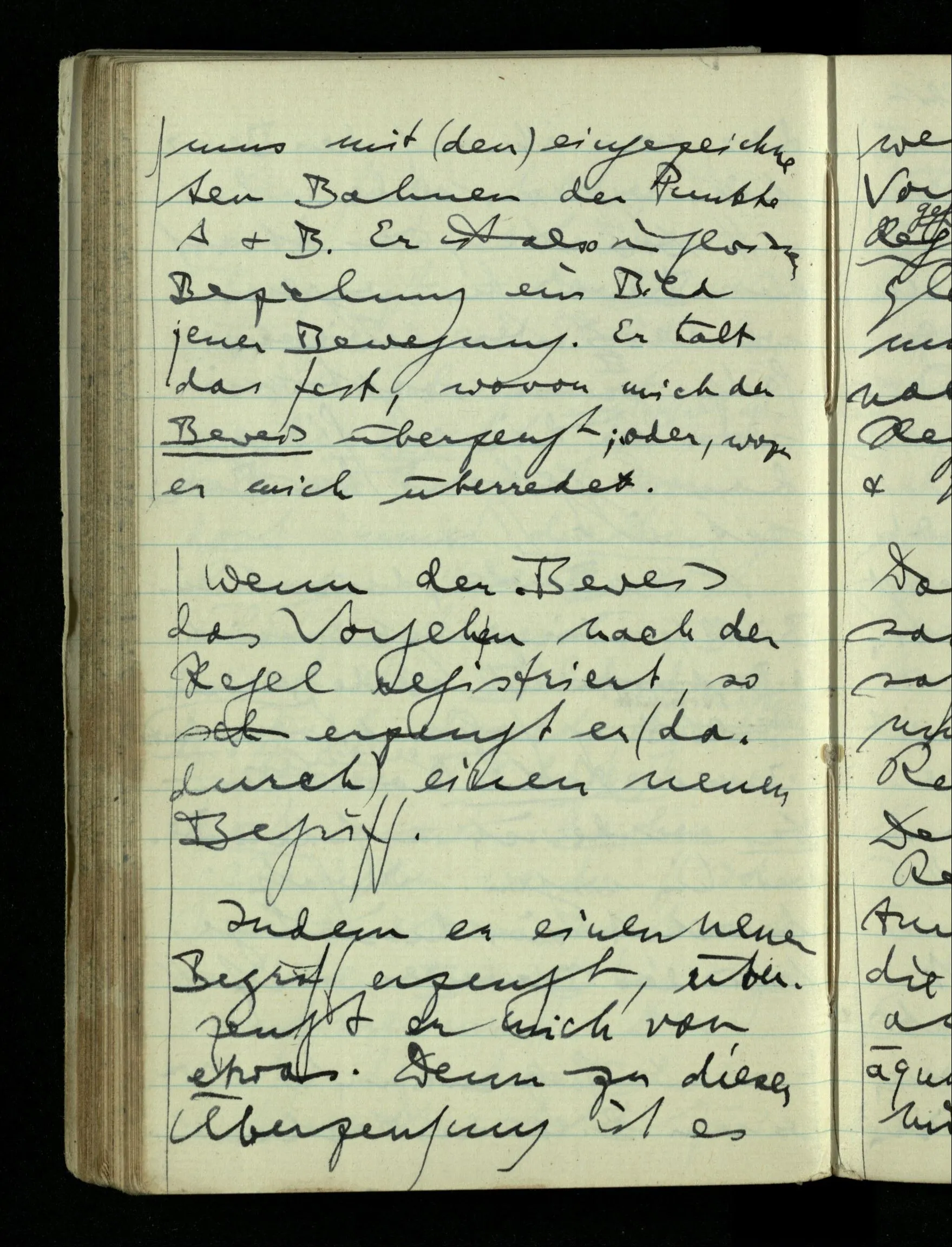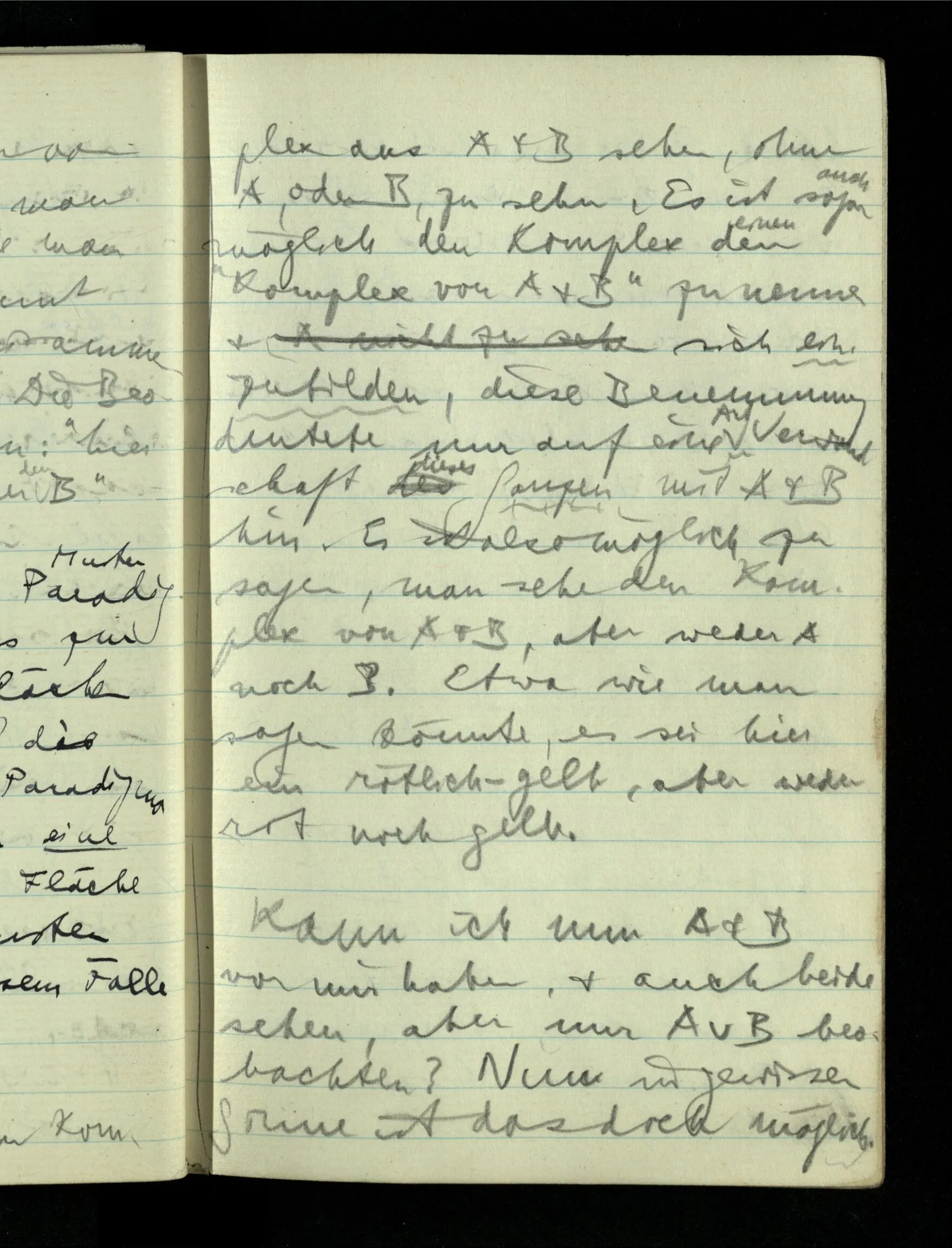 09.01.1943 Unsre Schwierigkeit fängt eigentlich schon mit der unendlichen Geraden an; obwohl wir schon als Knaben lernen, eine Gerade habe kein Ende, & ich weiß nicht, daß diese Idee irgend jemand Schwierigkeiten bereitet hätte. Wie, wenn ein Finitist versuchte diesen Begriff durch den einer geraden Strecke von bestimmter Länge zu ersetzen?!