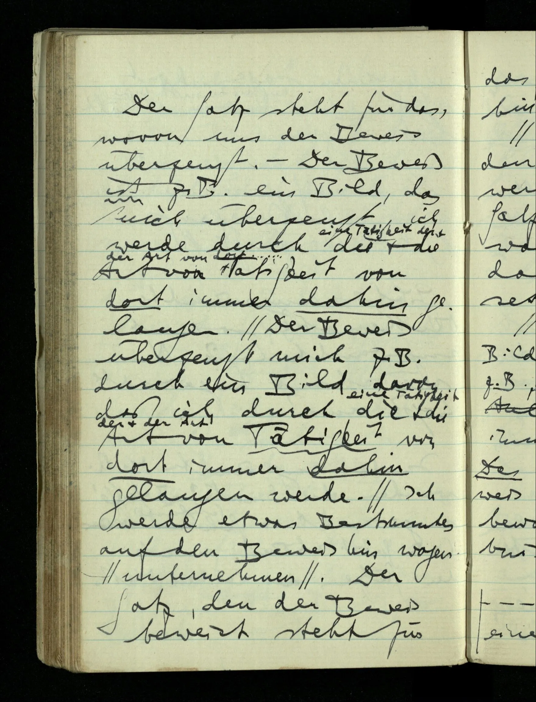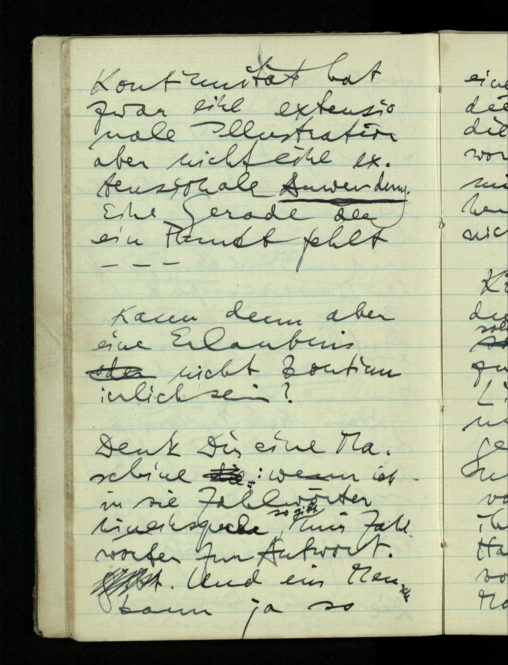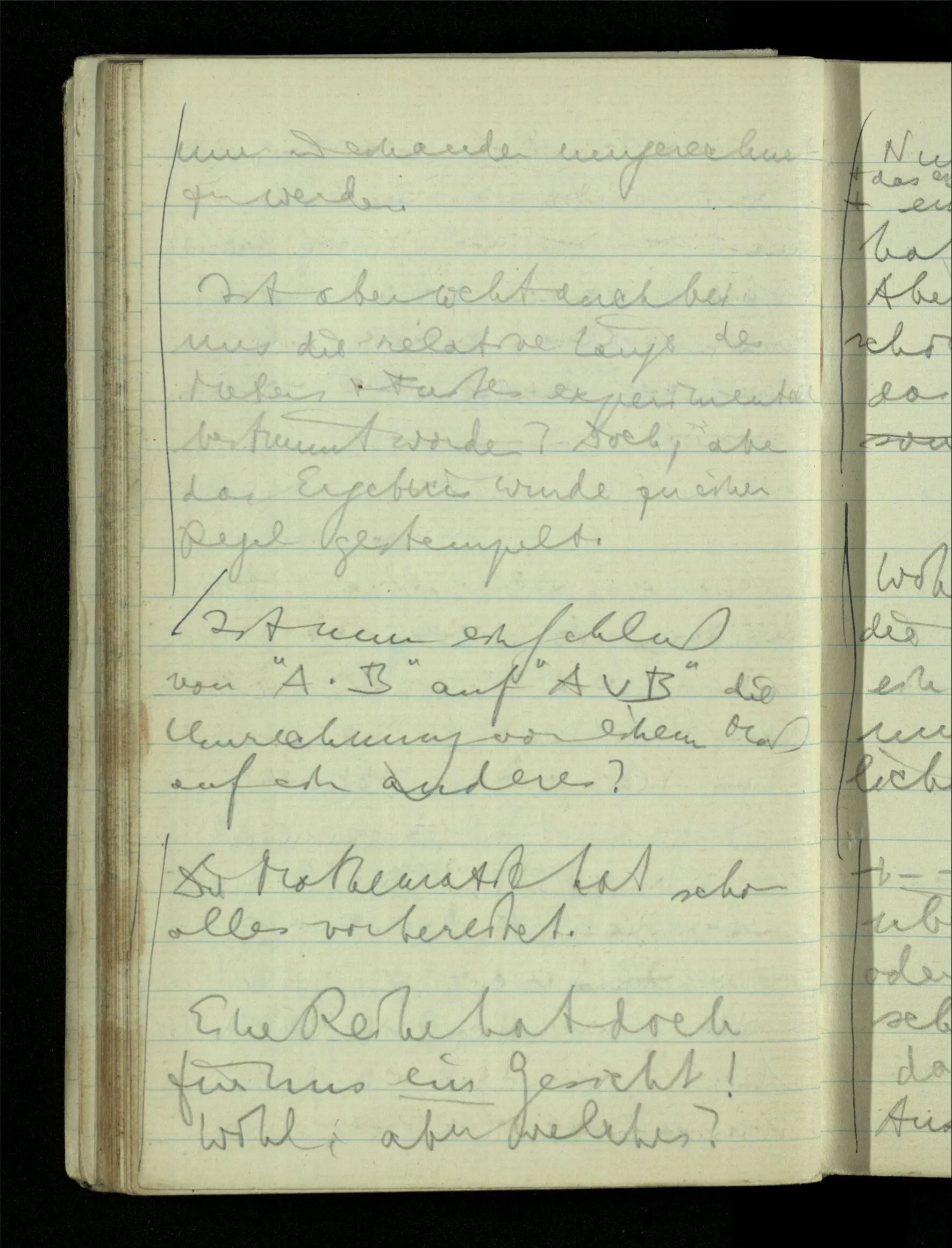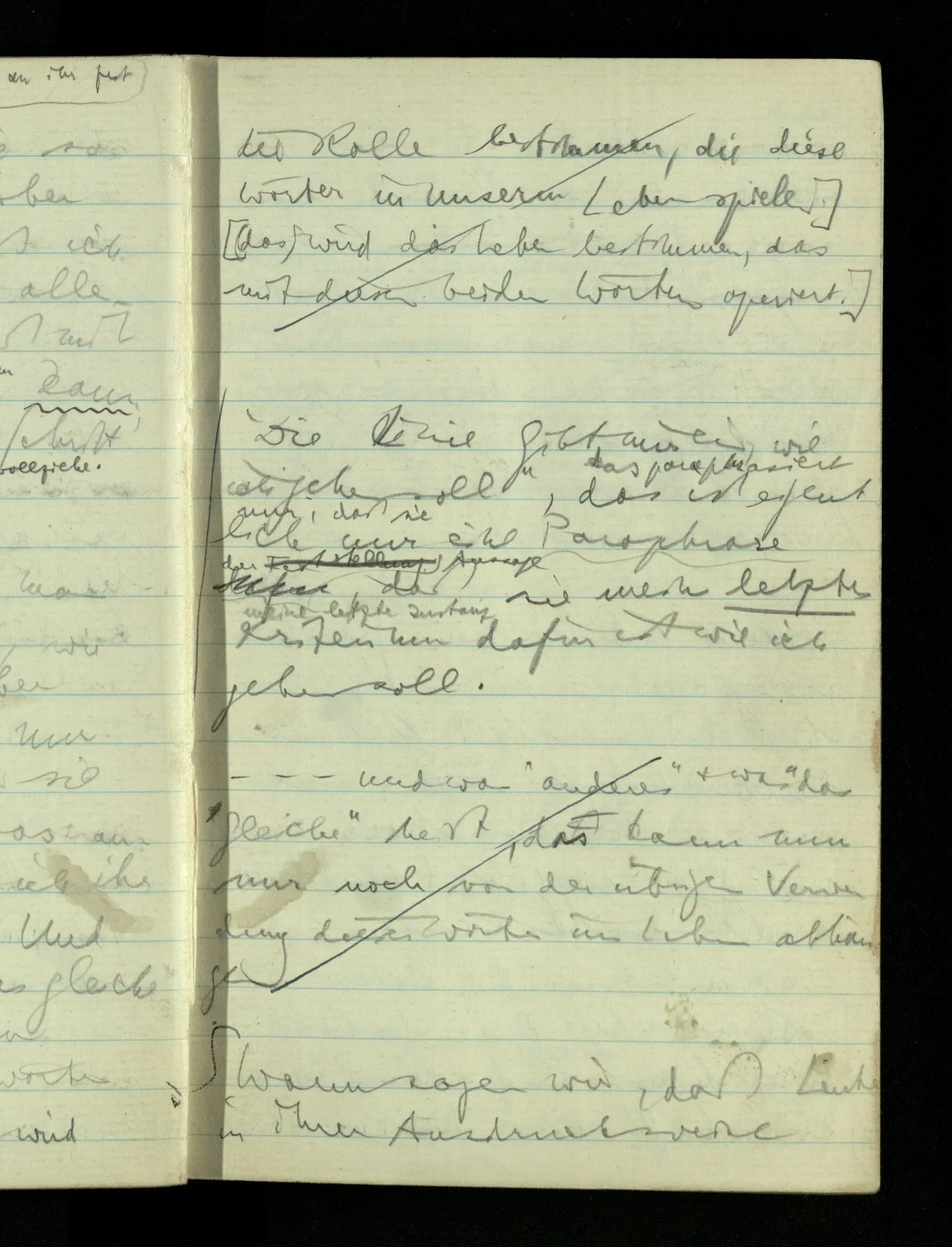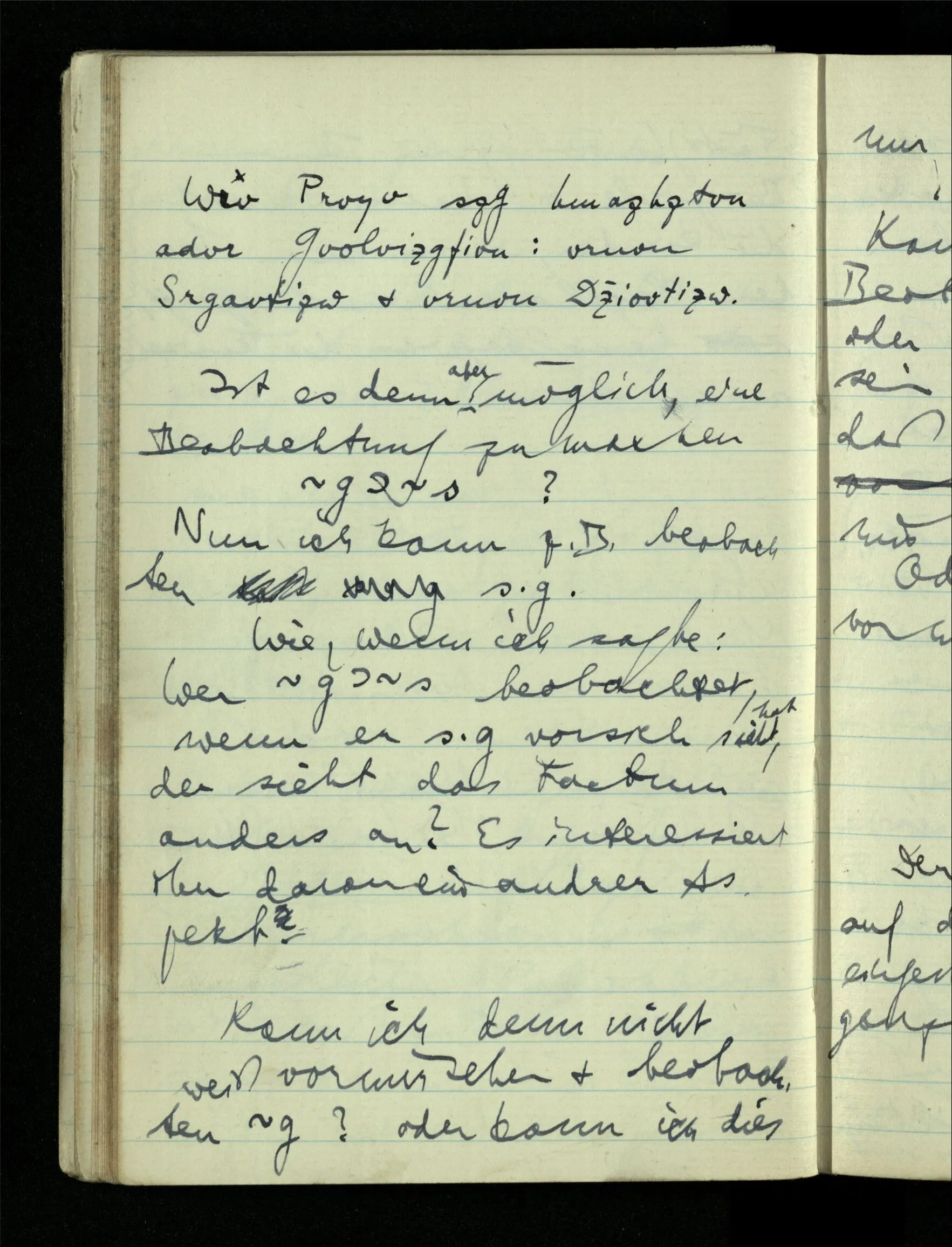 09.01.1943 Unsre Schwierigkeit fängt eigentlich schon mit der unendlichen Geraden an; obwohl wir schon als Knaben lernen, eine Gerade habe kein Ende, & ich weiß nicht, daß diese Idee irgend jemand Schwierigkeiten bereitet hätte. Wie, wenn ein Finitist versuchte diesen Begriff durch den einer geraden Strecke von bestimmter Länge zu ersetzen?!