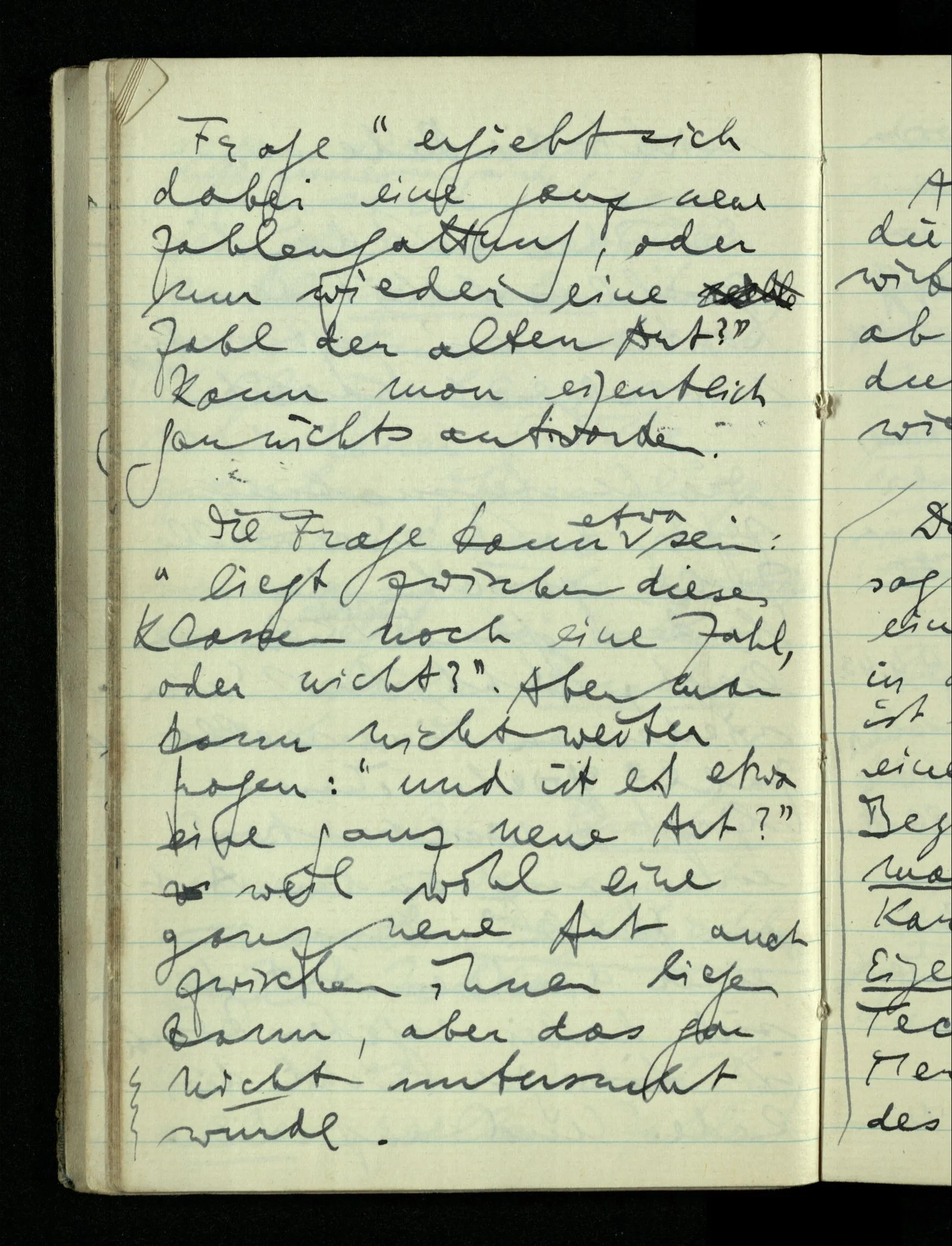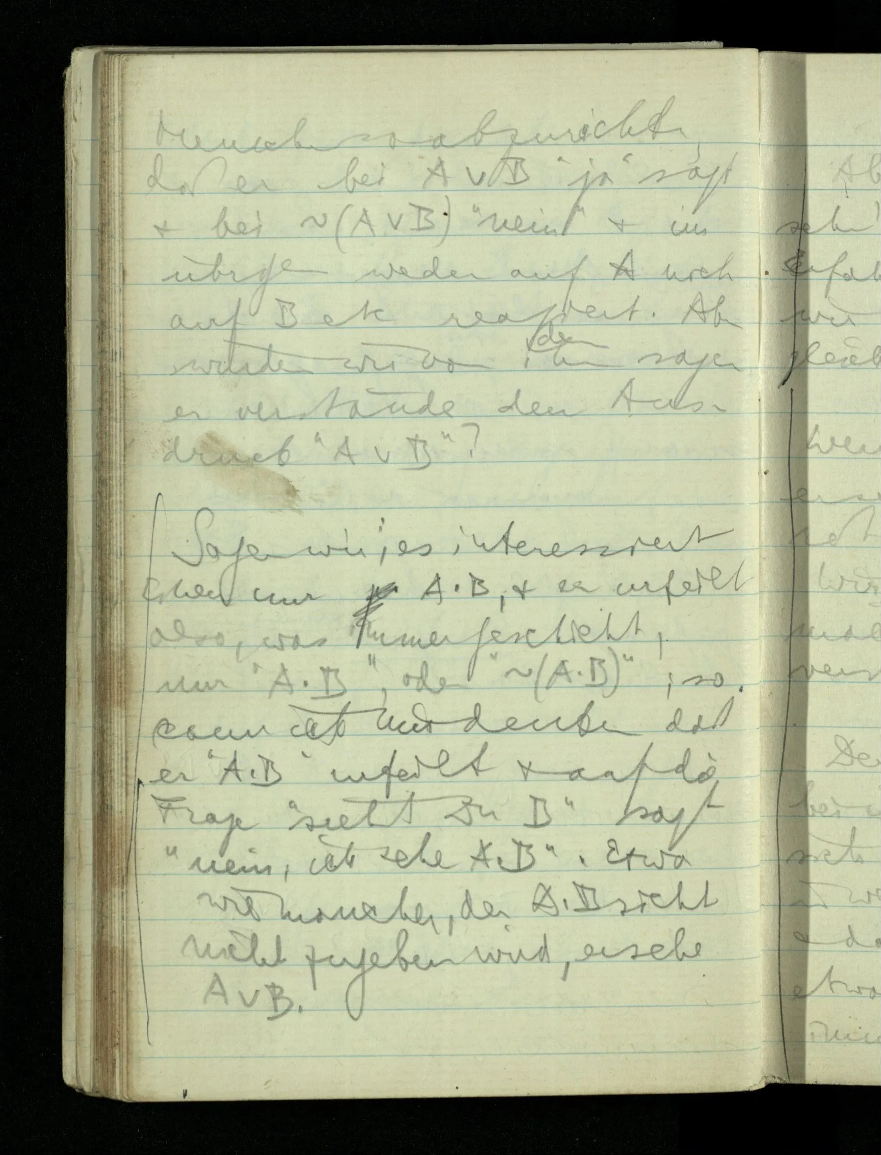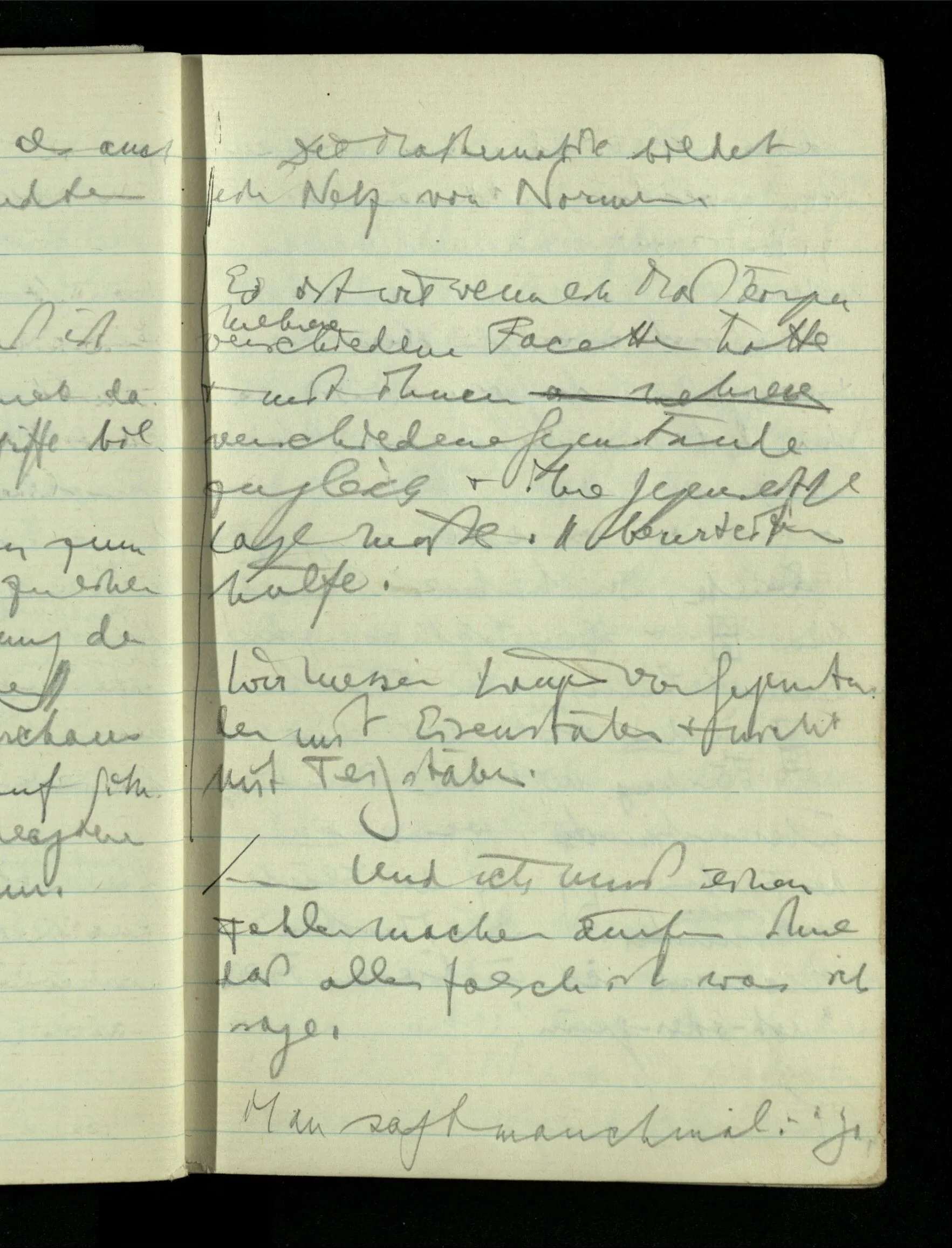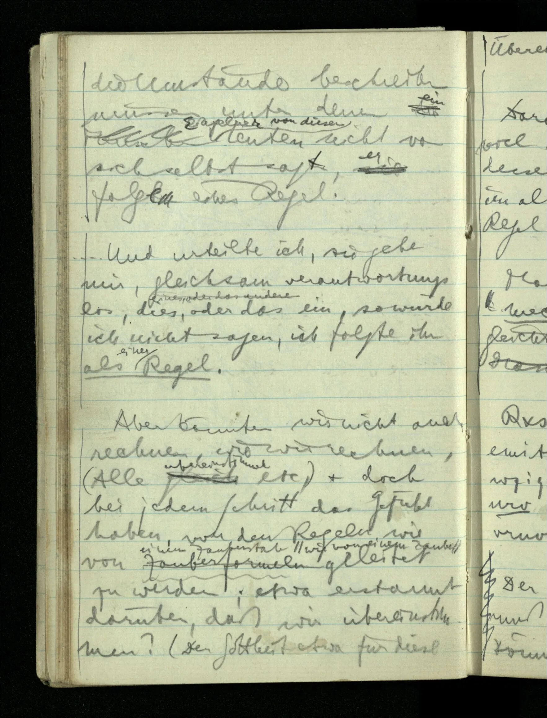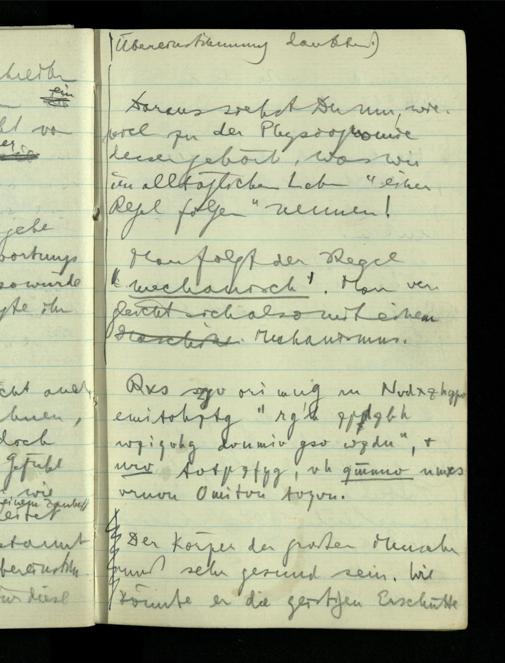 09.01.1943 Unsre Schwierigkeit fängt eigentlich schon mit der unendlichen Geraden an; obwohl wir schon als Knaben lernen, eine Gerade habe kein Ende, & ich weiß nicht, daß diese Idee irgend jemand Schwierigkeiten bereitet hätte. Wie, wenn ein Finitist versuchte diesen Begriff durch den einer geraden Strecke von bestimmter Länge zu ersetzen?!