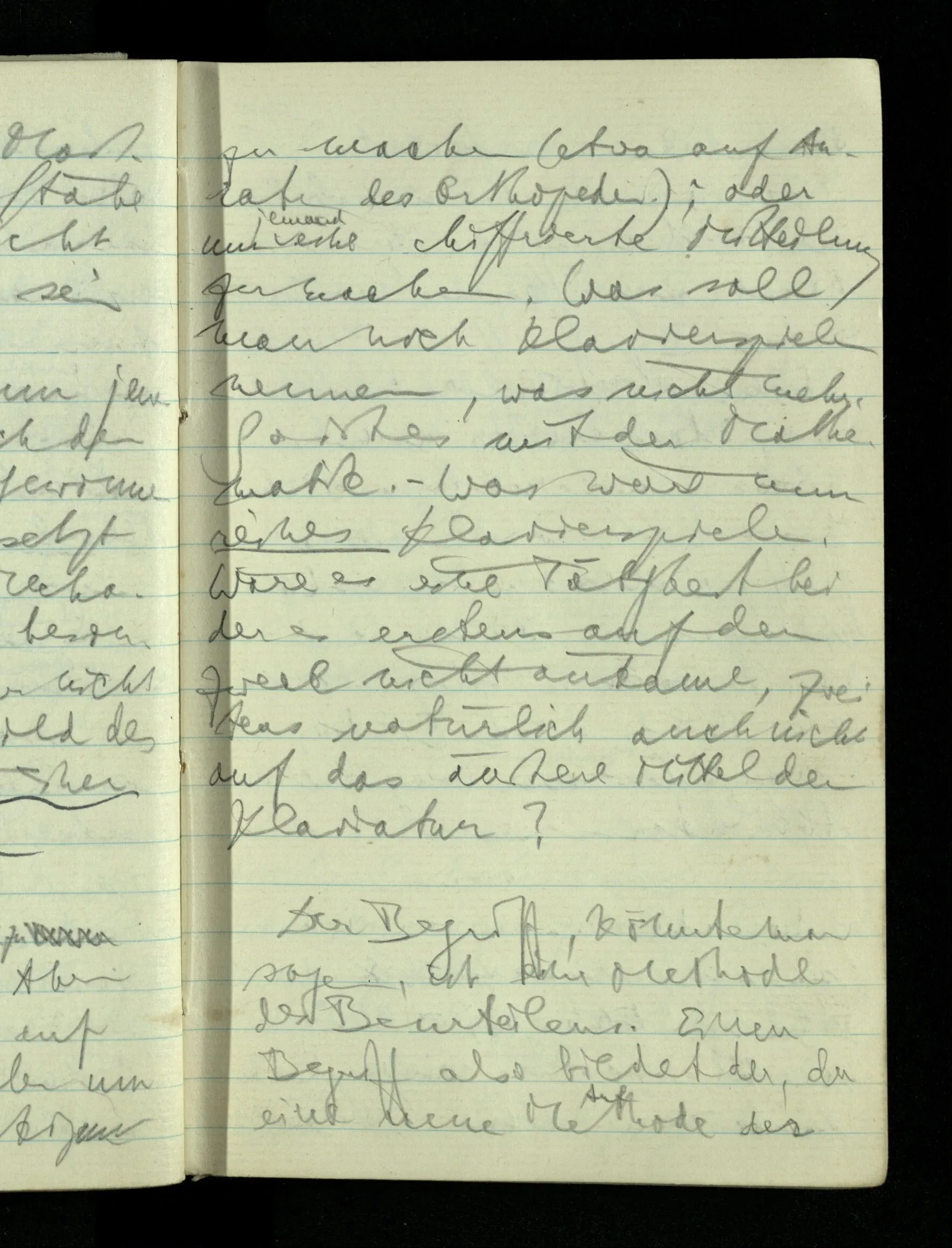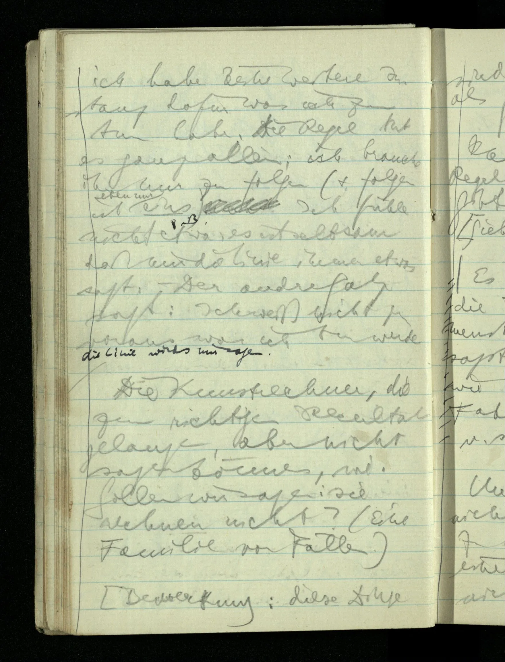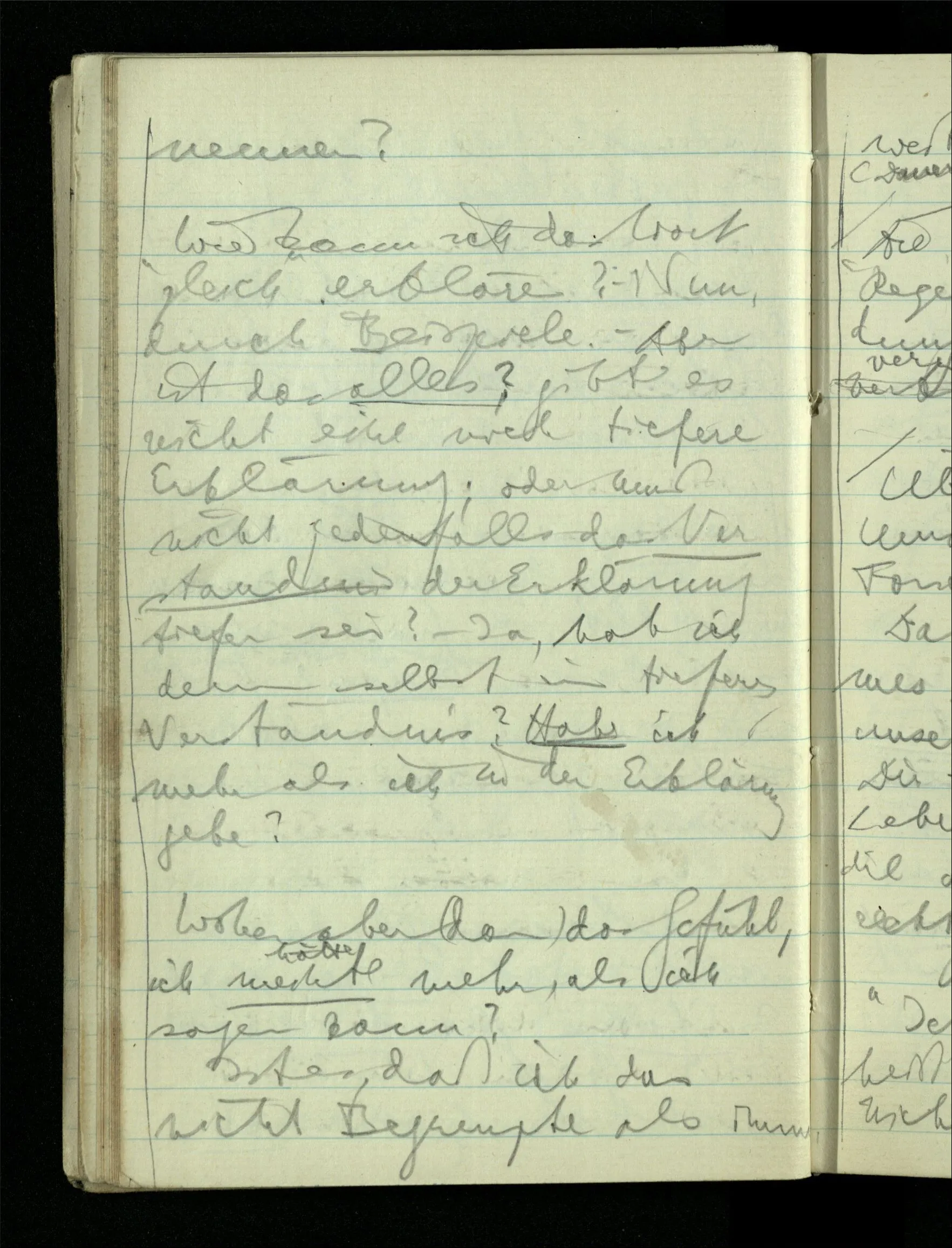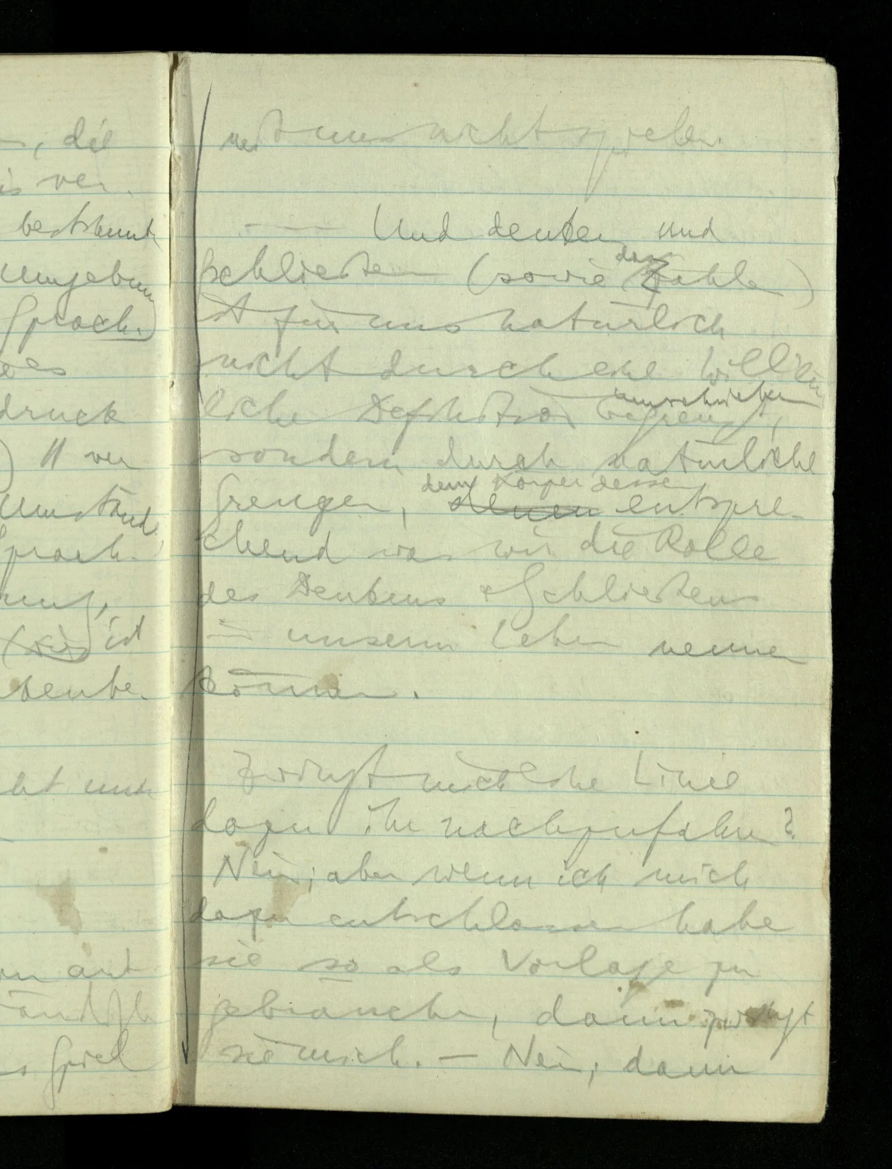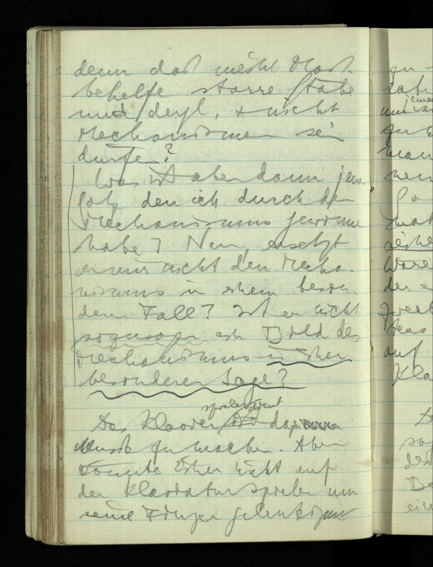 09.01.1943 Unsre Schwierigkeit fängt eigentlich schon mit der unendlichen Geraden an; obwohl wir schon als Knaben lernen, eine Gerade habe kein Ende, & ich weiß nicht, daß diese Idee irgend jemand Schwierigkeiten bereitet hätte. Wie, wenn ein Finitist versuchte diesen Begriff durch den einer geraden Strecke von bestimmter Länge zu ersetzen?!