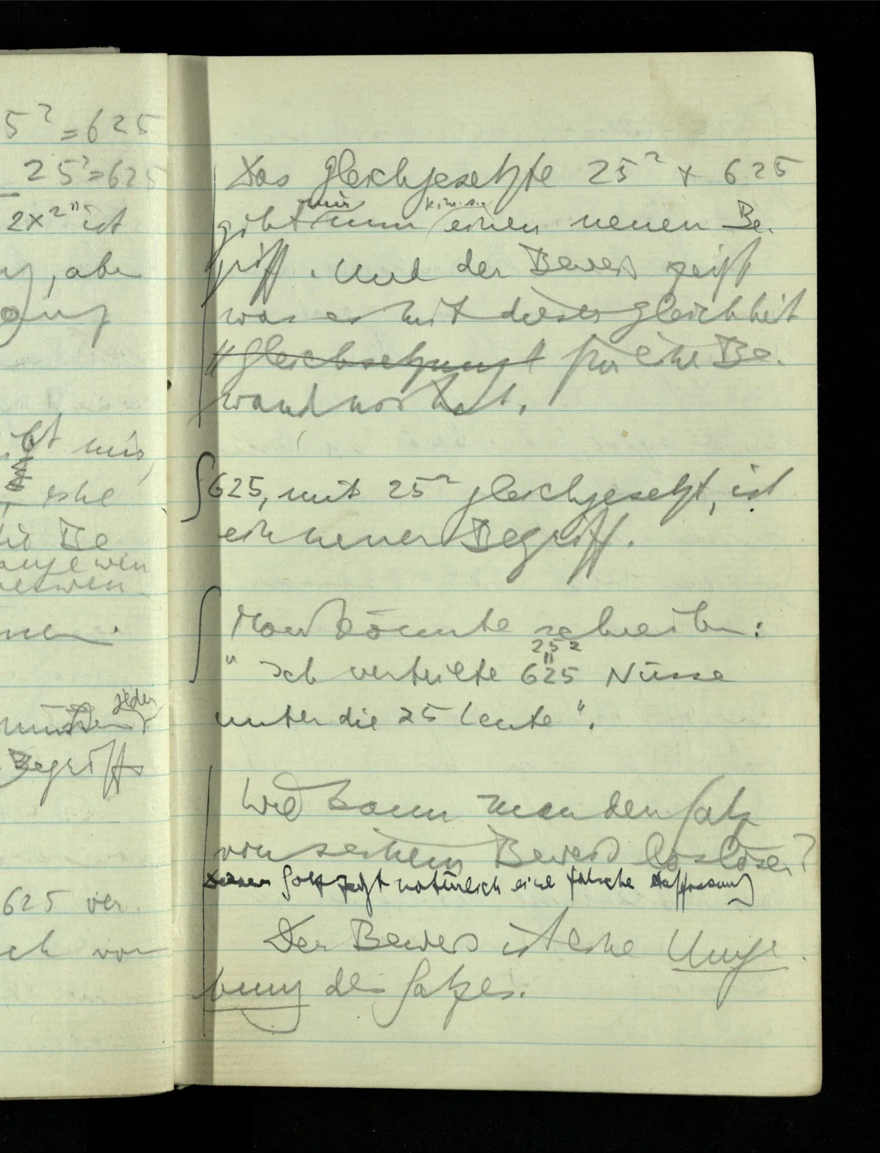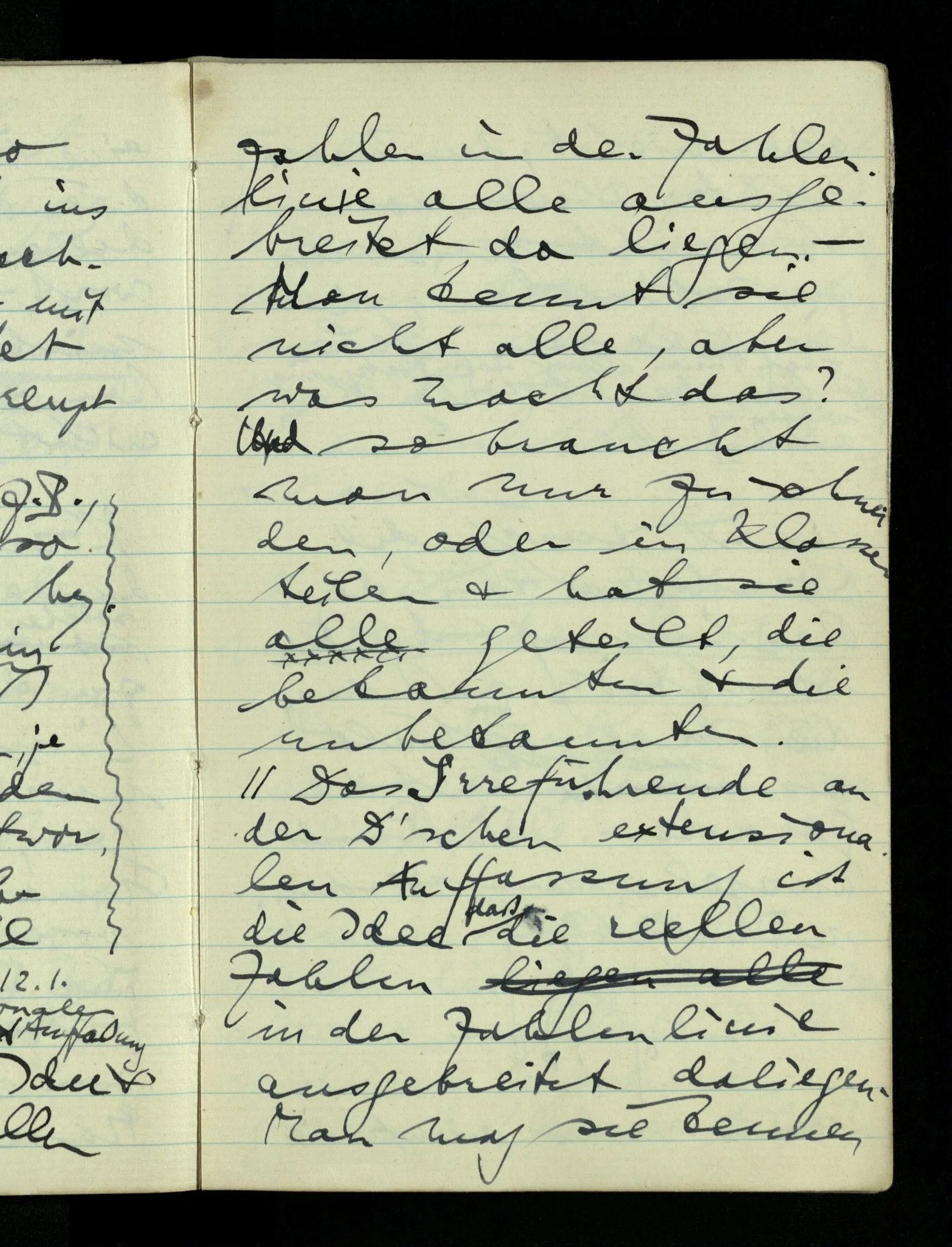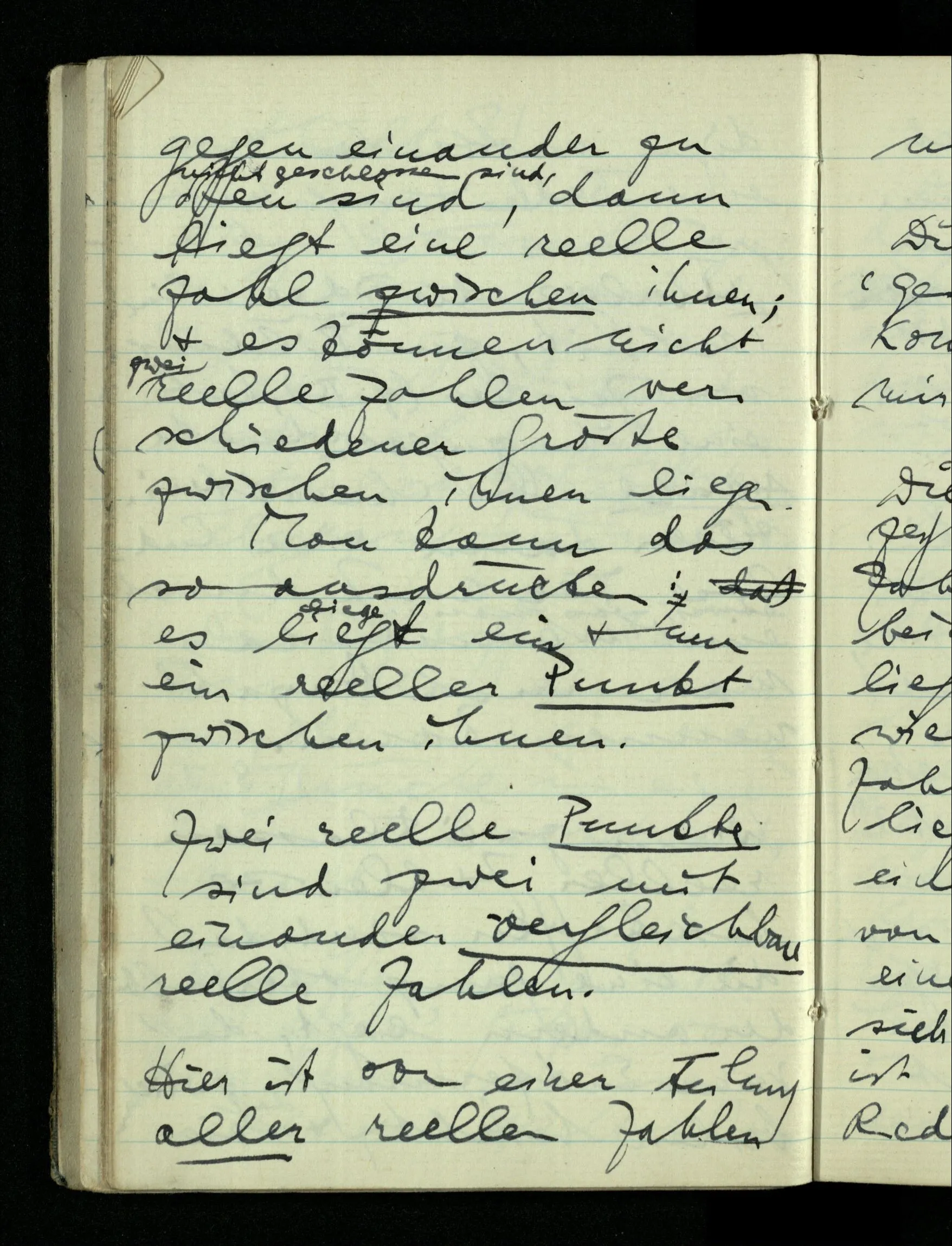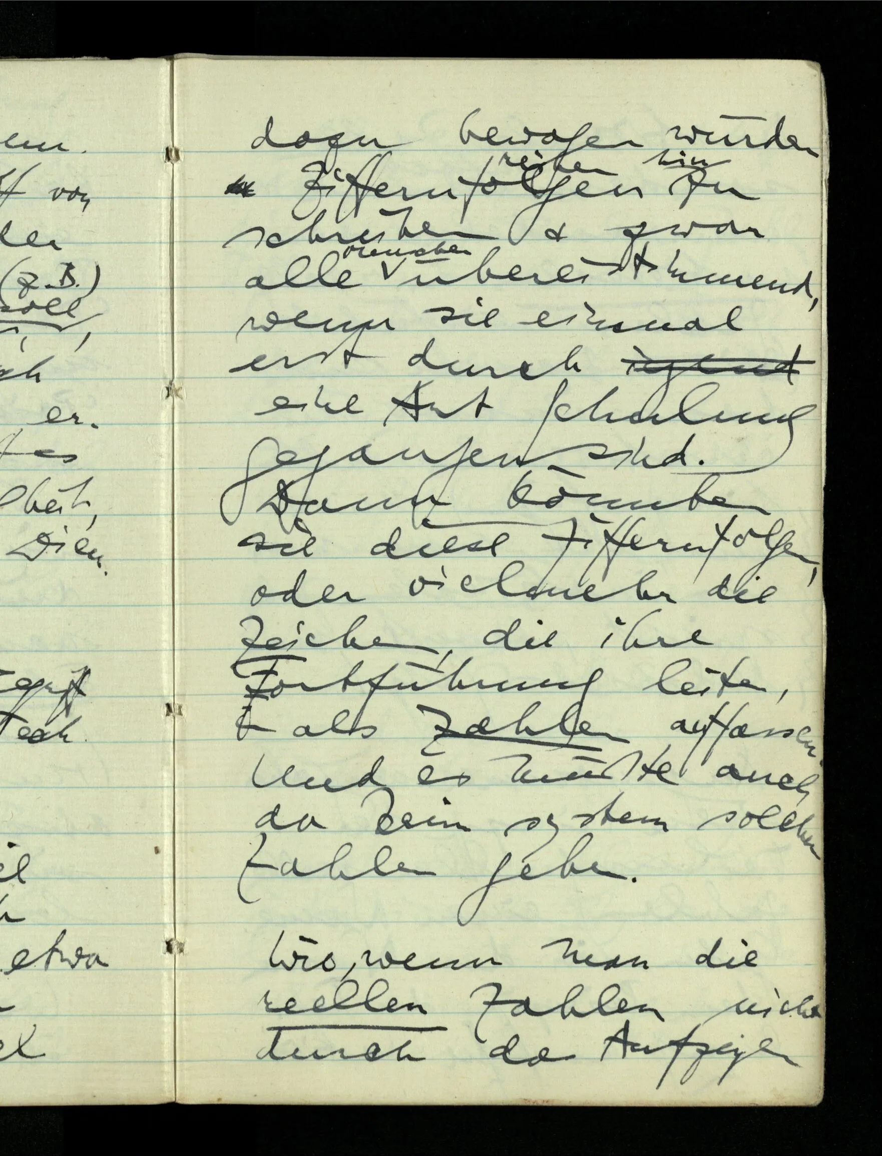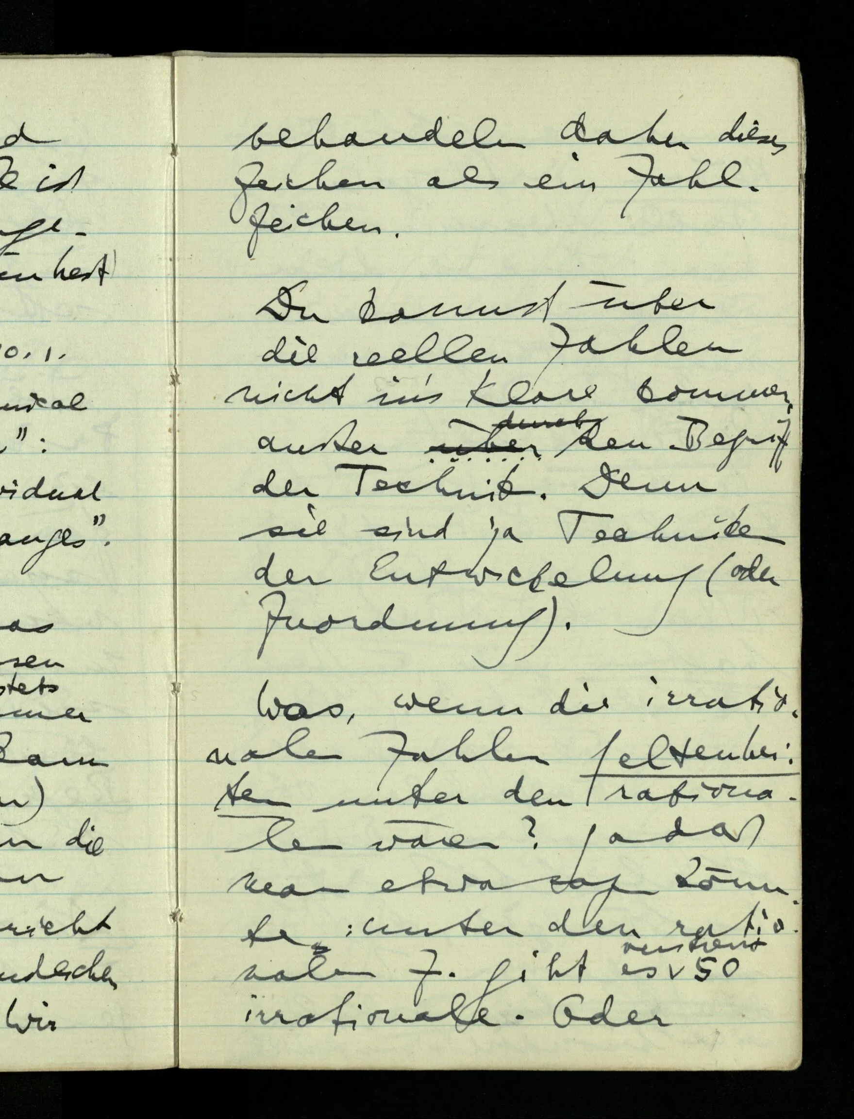 12.01.1943 Die irreführende Idee in der D’schen extensionalen Auffassung ist, daß die reellen Zahlen in der Zahlenlinie alle ausgebreitet da liegen. – Man kennt sie nicht alle, aber was macht das? Und so braucht man nur zu schneiden, oder in Klassen teilen & hat sie alle geteilt, die bekannten & die unbekannten.
