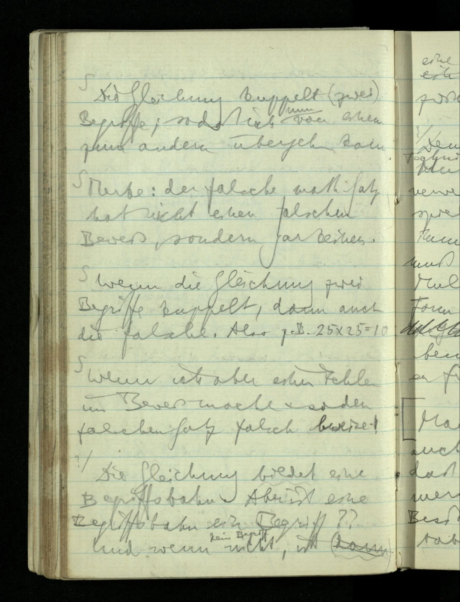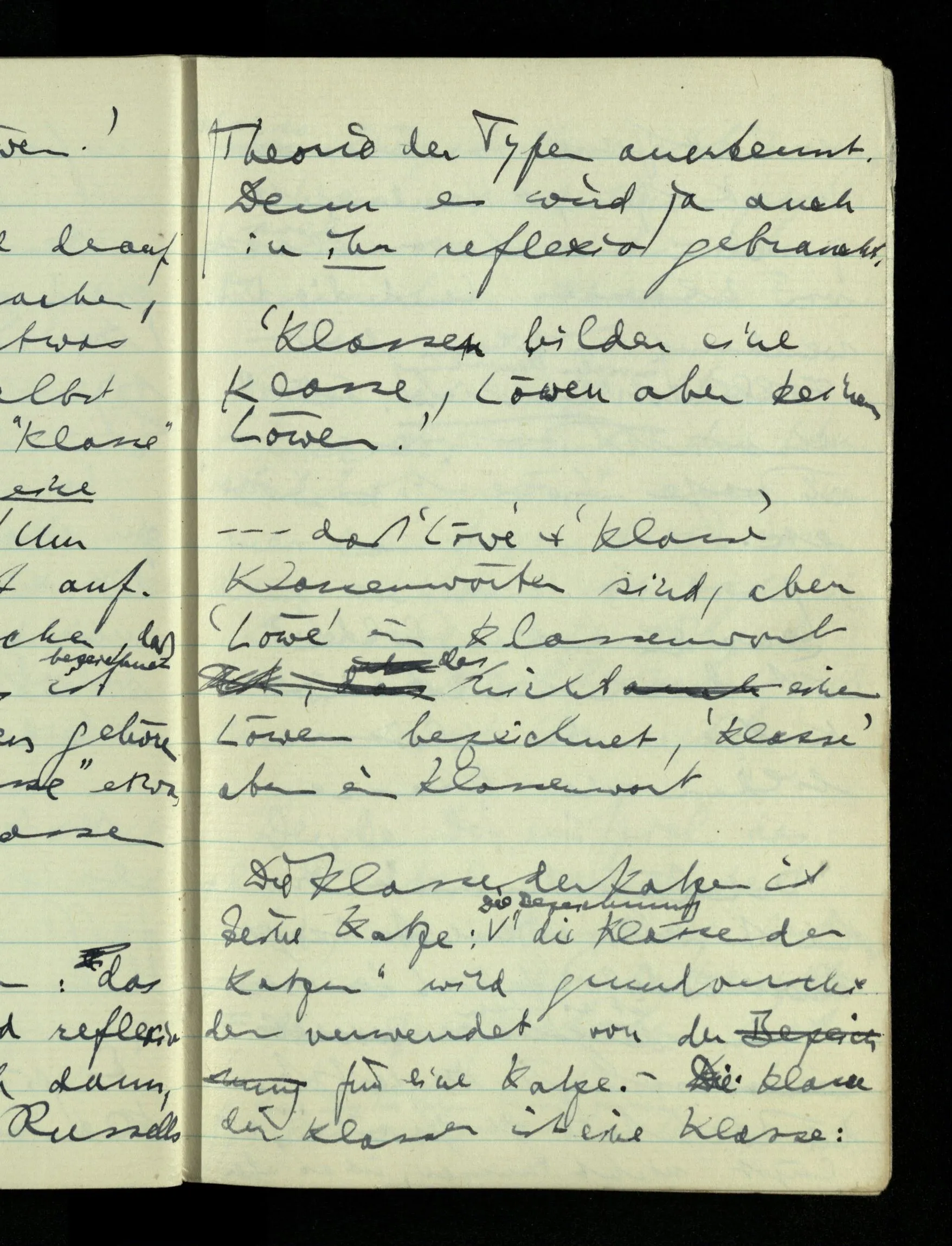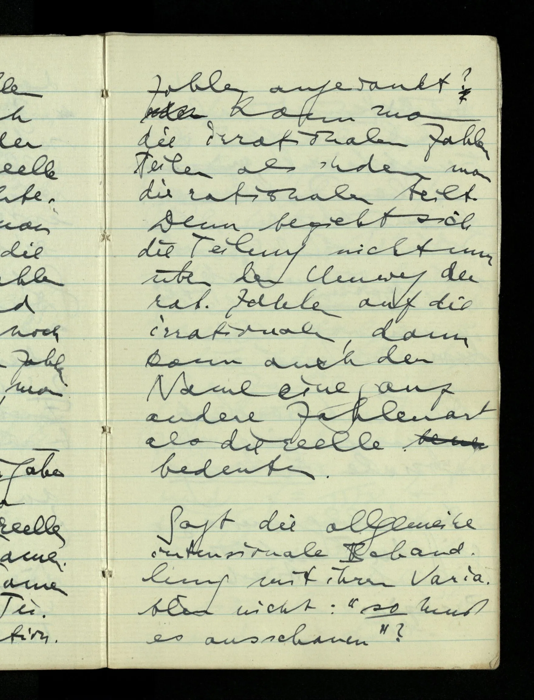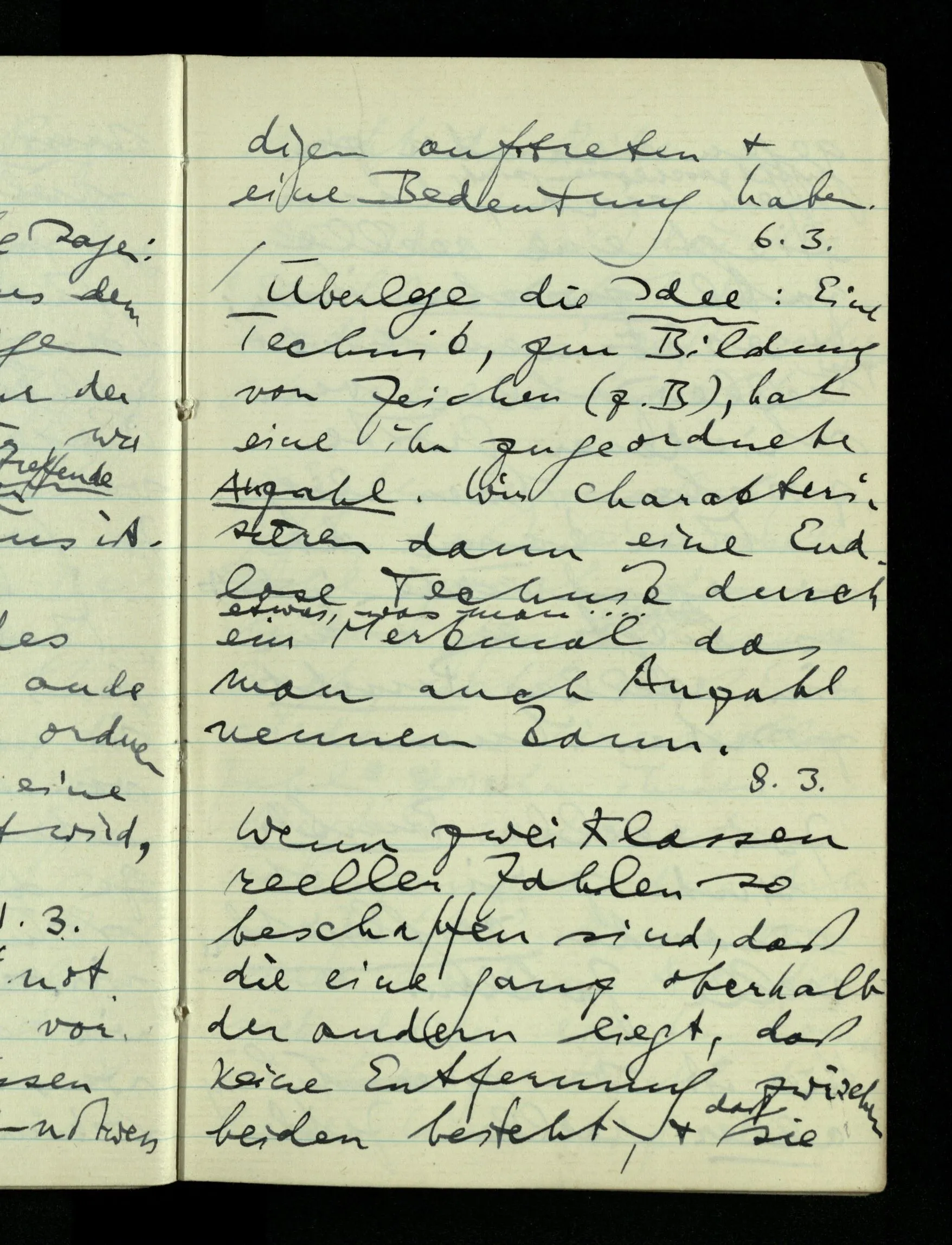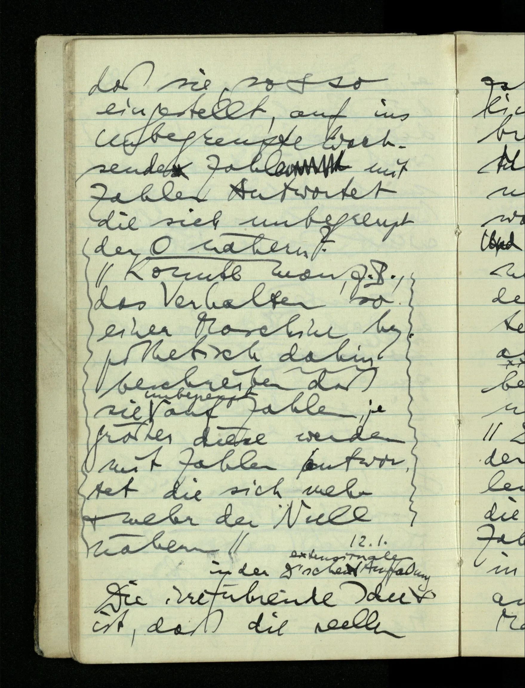 12.01.1943 Die irreführende Idee in der D’schen extensionalen Auffassung ist, daß die reellen Zahlen in der Zahlenlinie alle ausgebreitet da liegen. – Man kennt sie nicht alle, aber was macht das? Und so braucht man nur zu schneiden, oder in Klassen teilen & hat sie alle geteilt, die bekannten & die unbekannten.