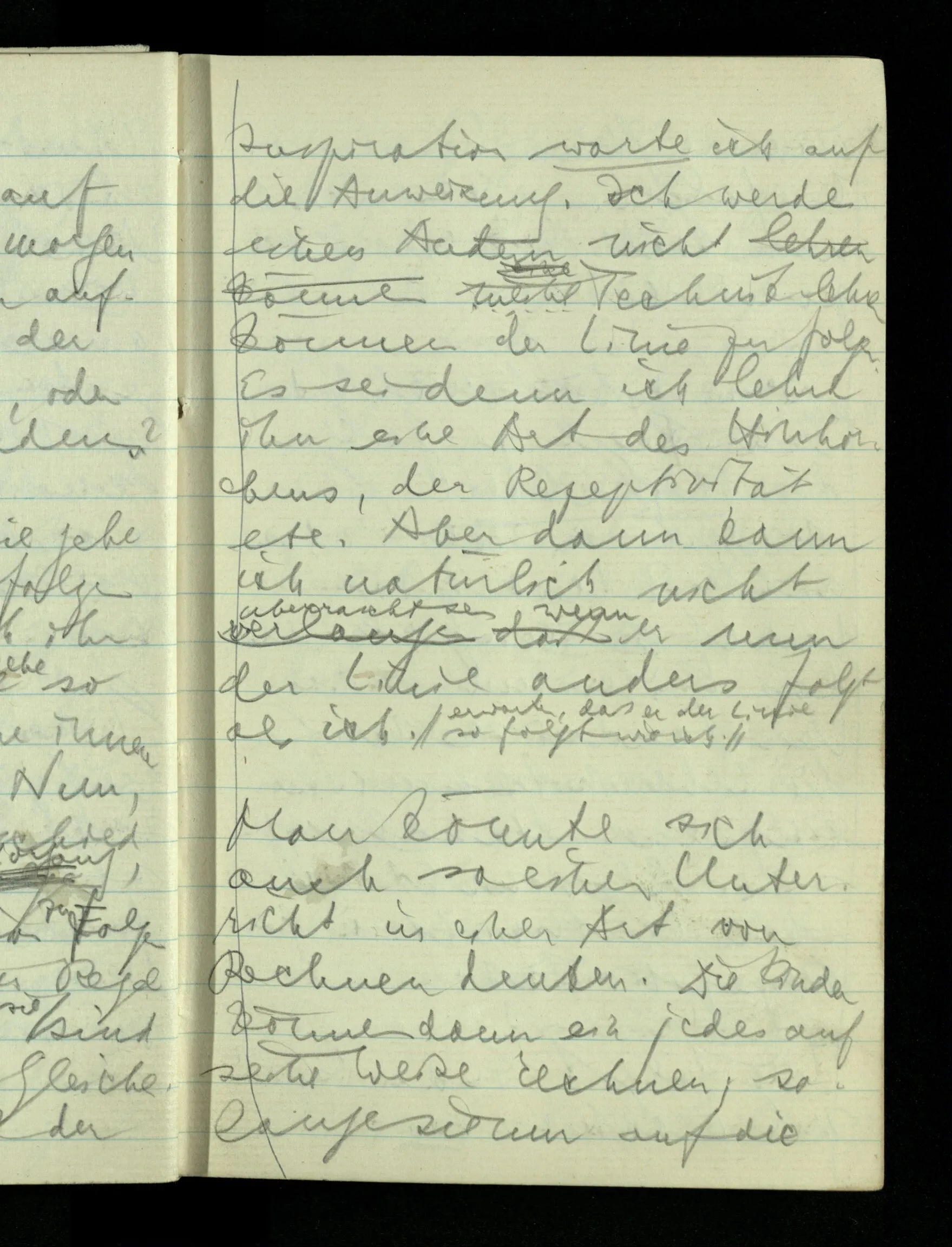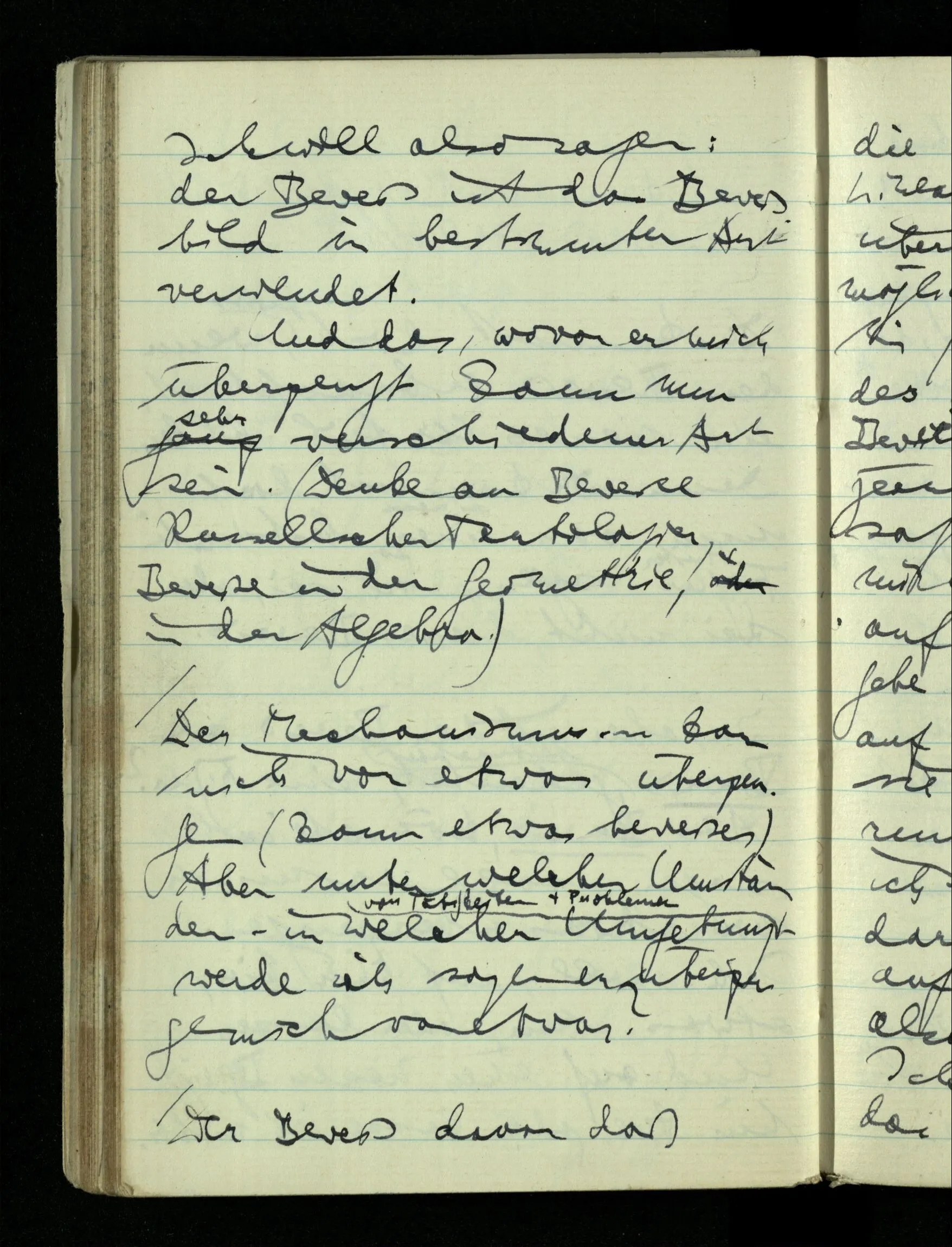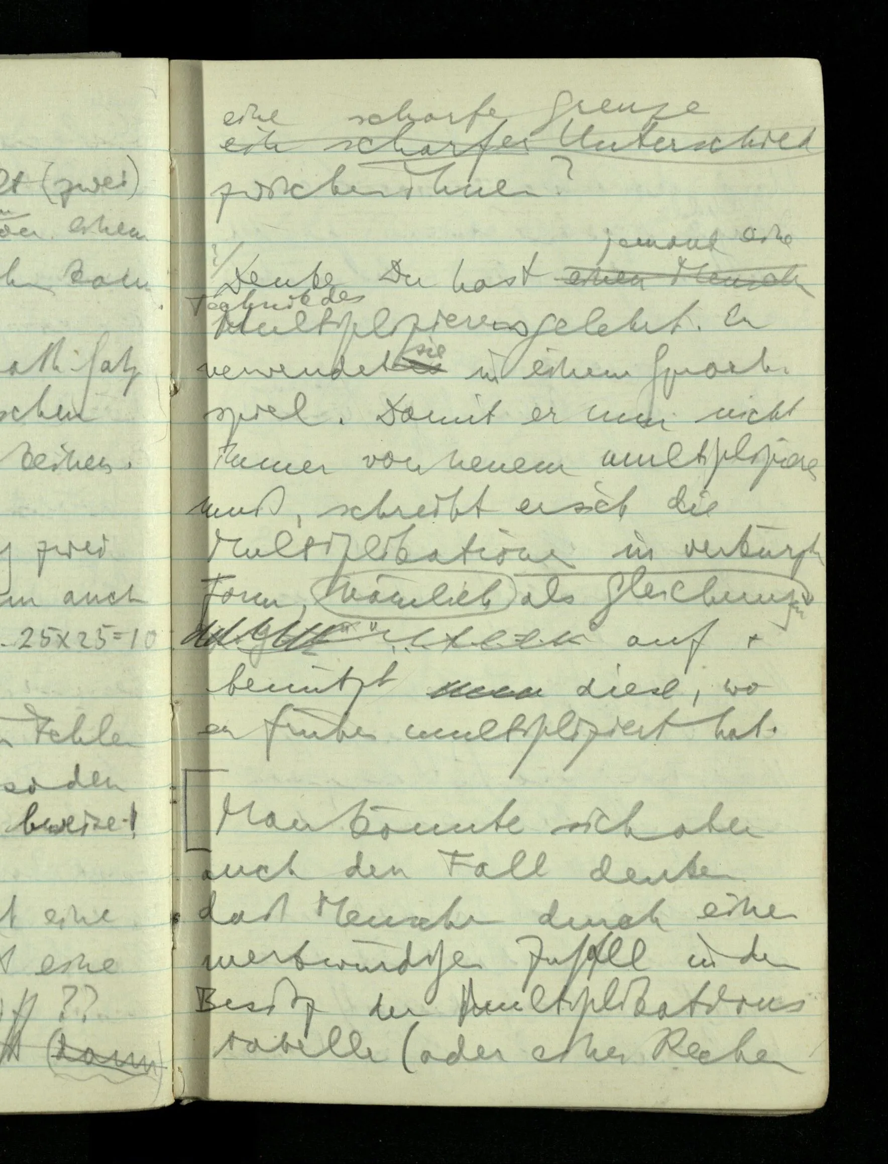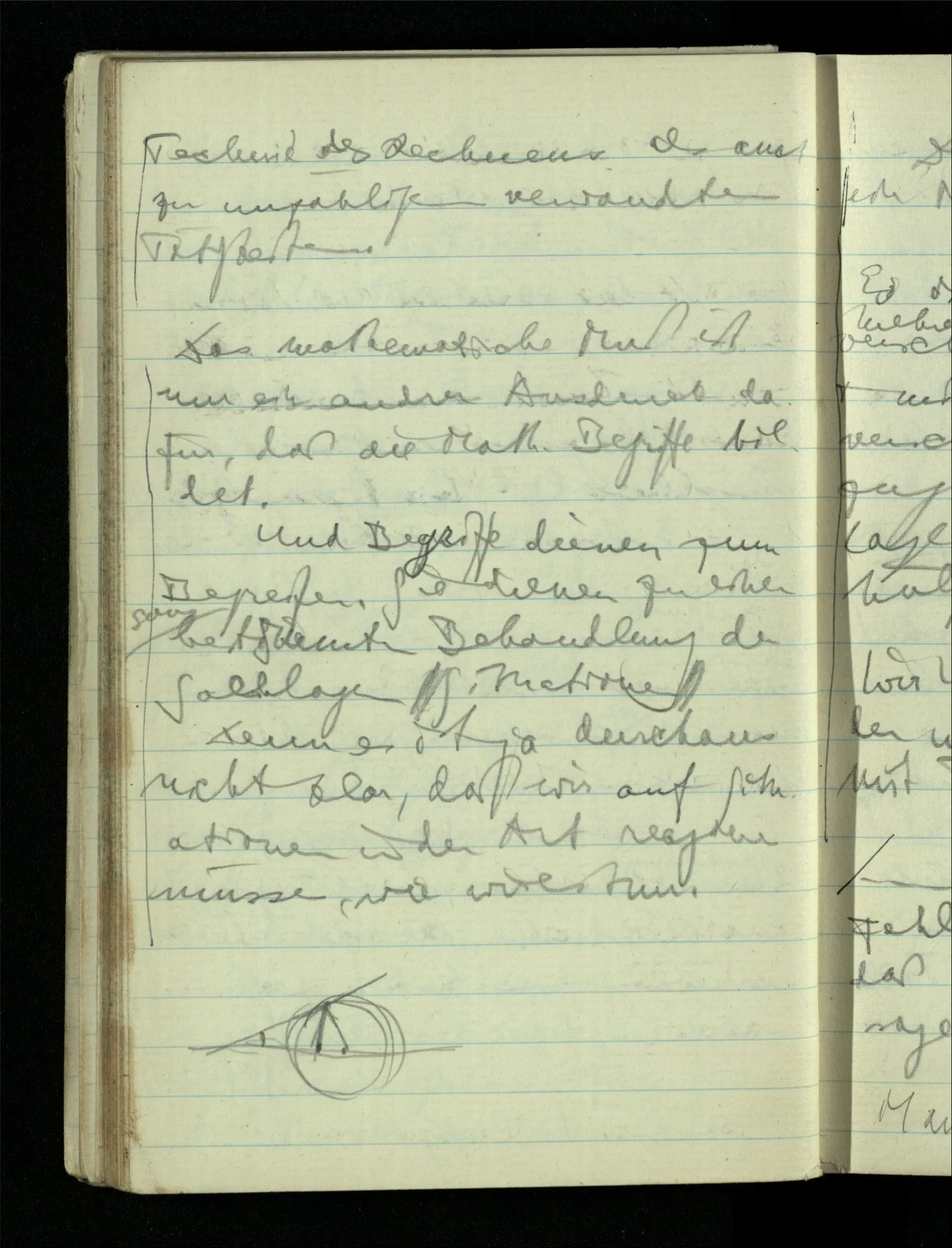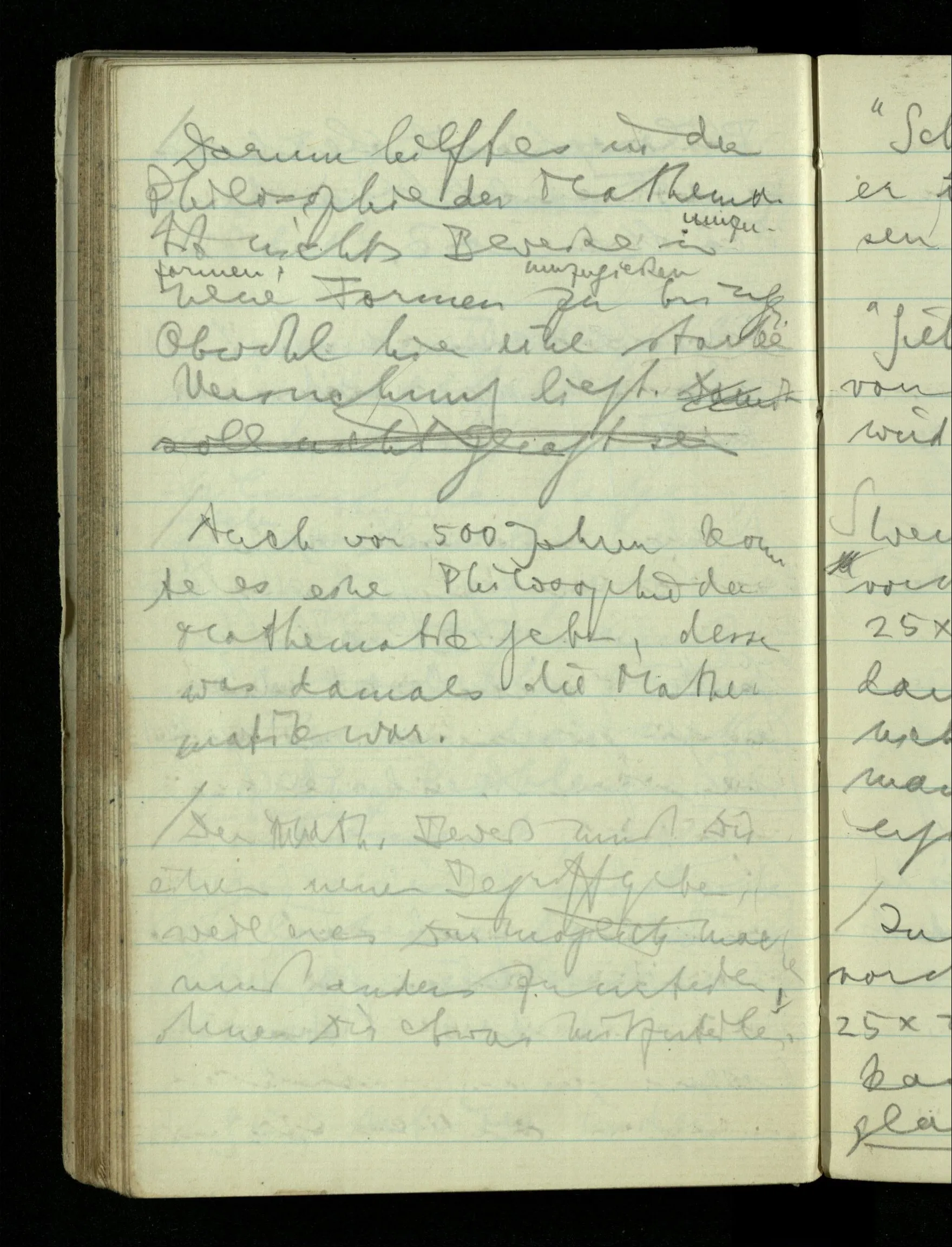 12.01.1943 Die irreführende Idee in der D’schen extensionalen Auffassung ist, daß die reellen Zahlen in der Zahlenlinie alle ausgebreitet da liegen. – Man kennt sie nicht alle, aber was macht das? Und so braucht man nur zu schneiden, oder in Klassen teilen & hat sie alle geteilt, die bekannten & die unbekannten.