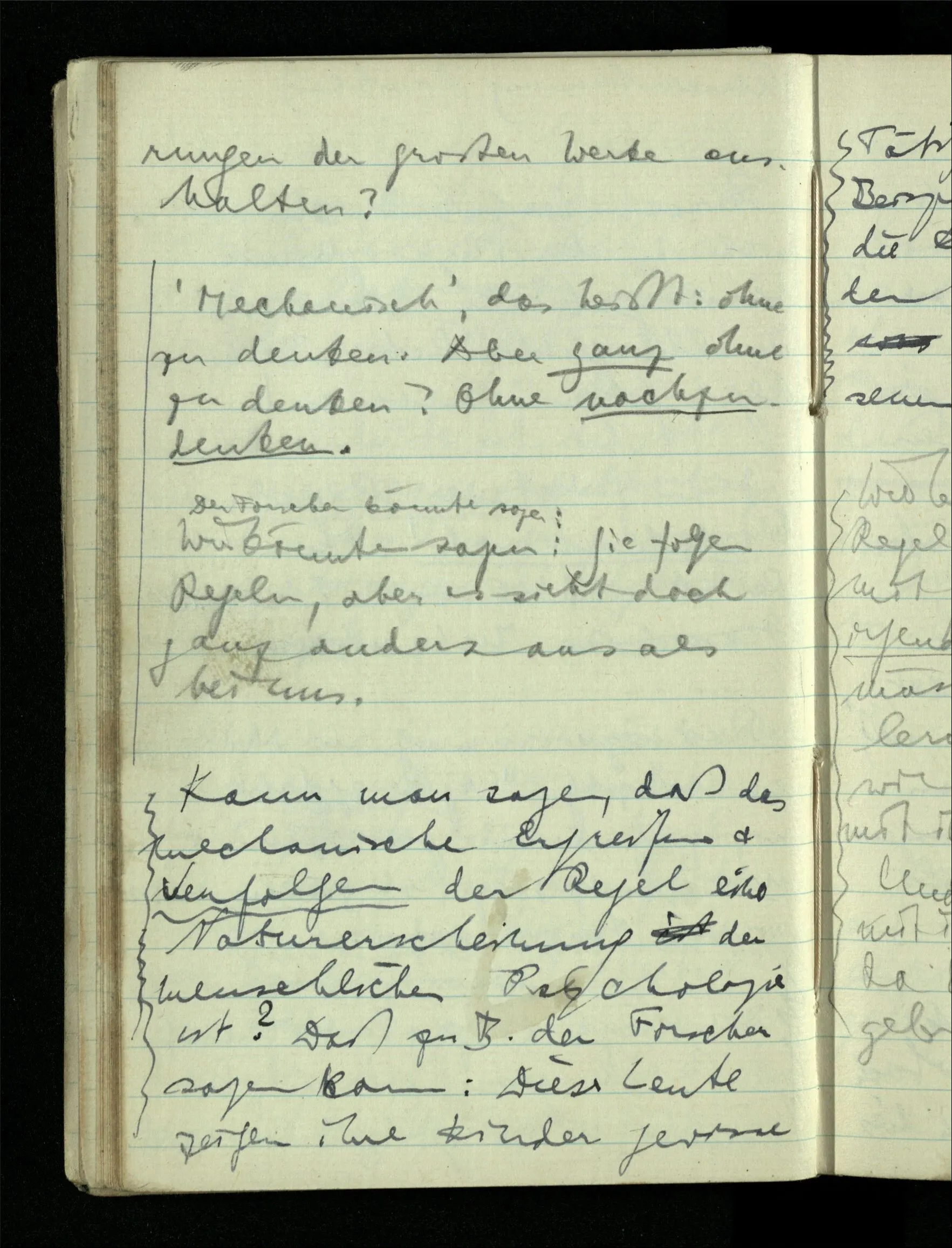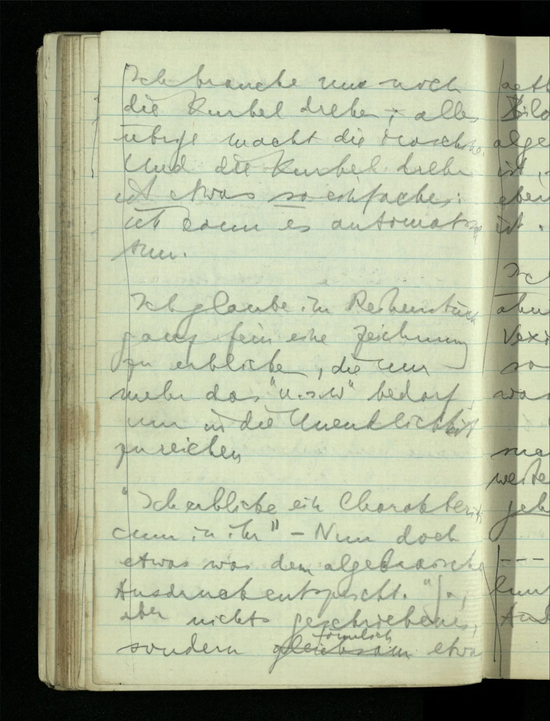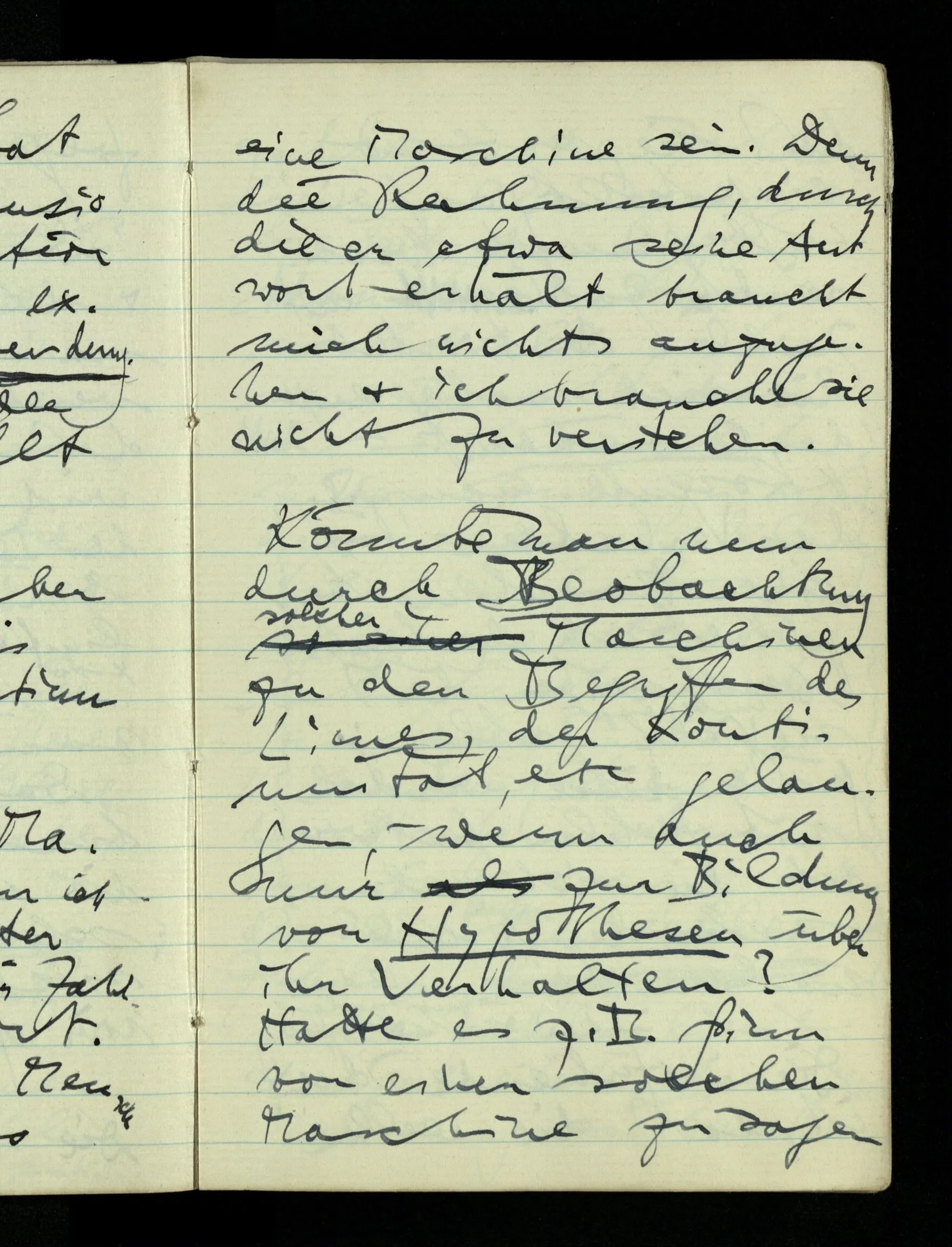 Könnte man nun durch Beobachtung solcher Maschinen zu den Begriffen des Limes, der Kontinuität etc. gelangen, – wenn auch nur, zur Bildung von Hypothesen über ihr Verhalten? Hätte es z.B. Sinn von einer solchen Maschine zu sagen daß sie, so & so eingestellt, auf ins Unbegrenzte wachsende Zahlen, mit Zahlen antwortet die sich unbegrenzt der 0 nähern.