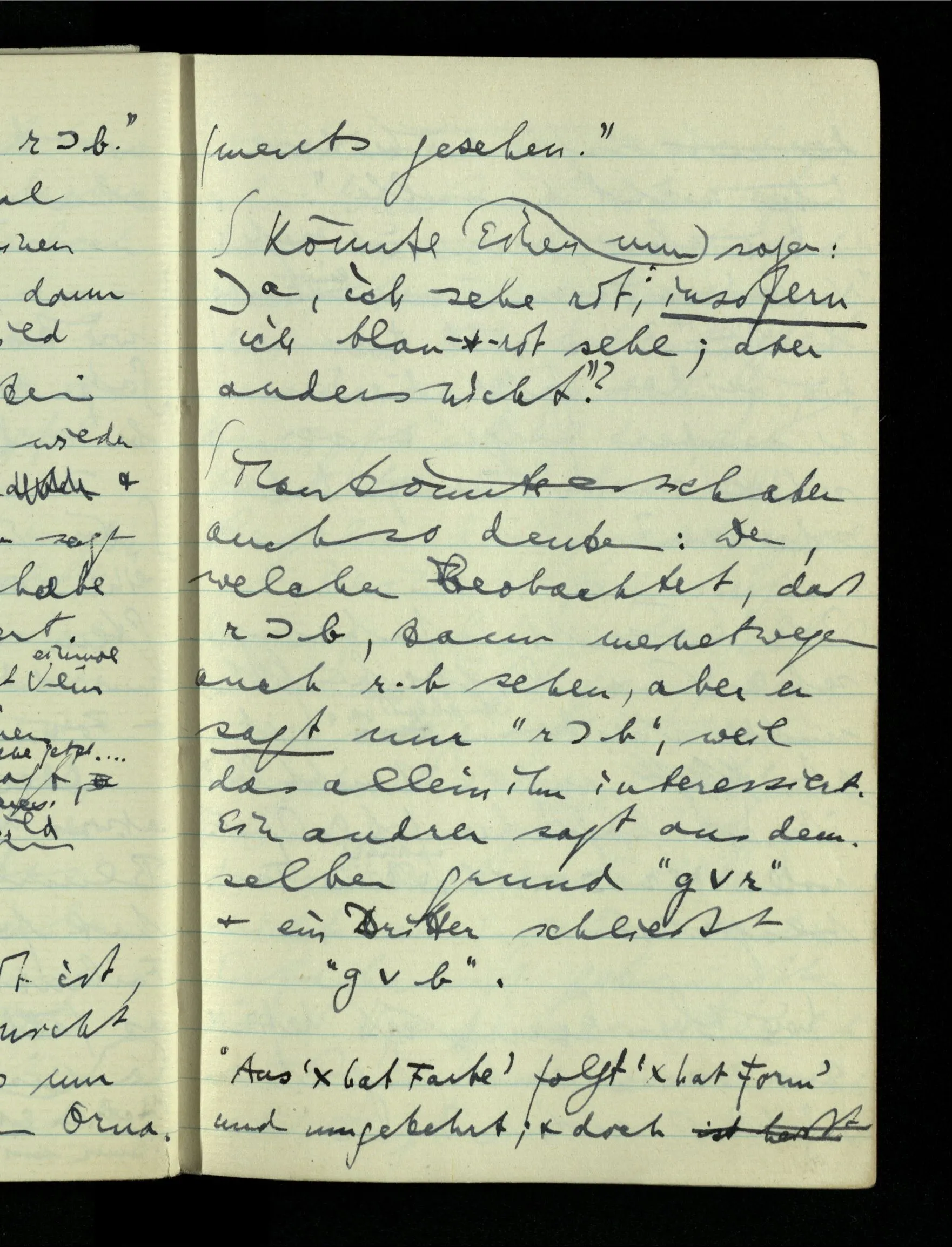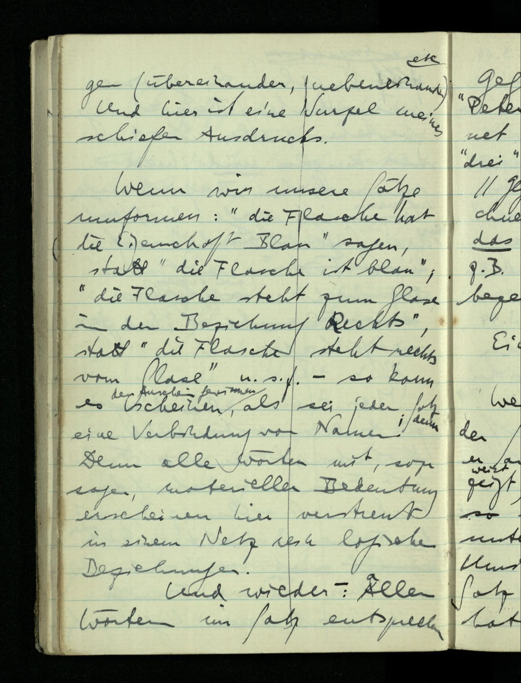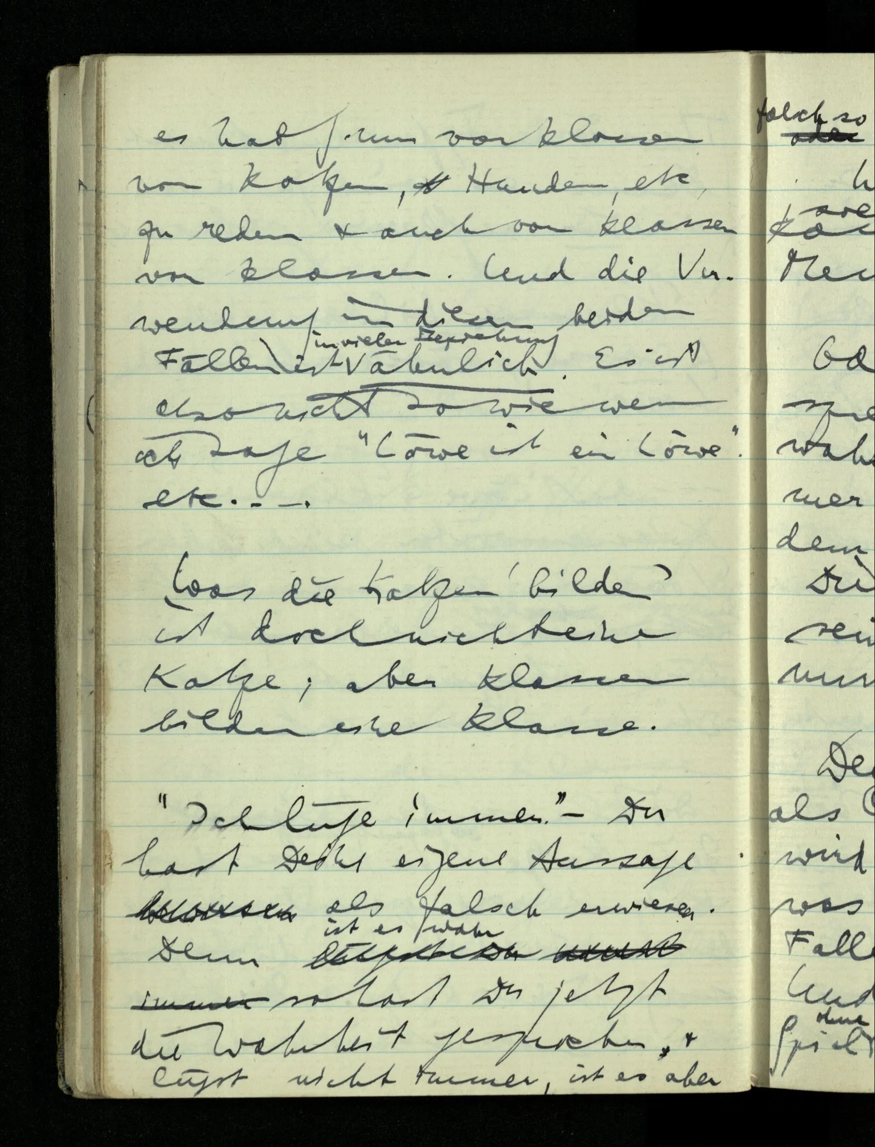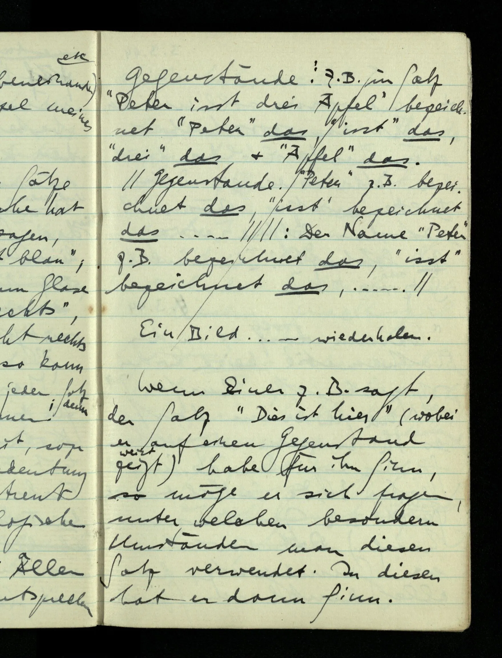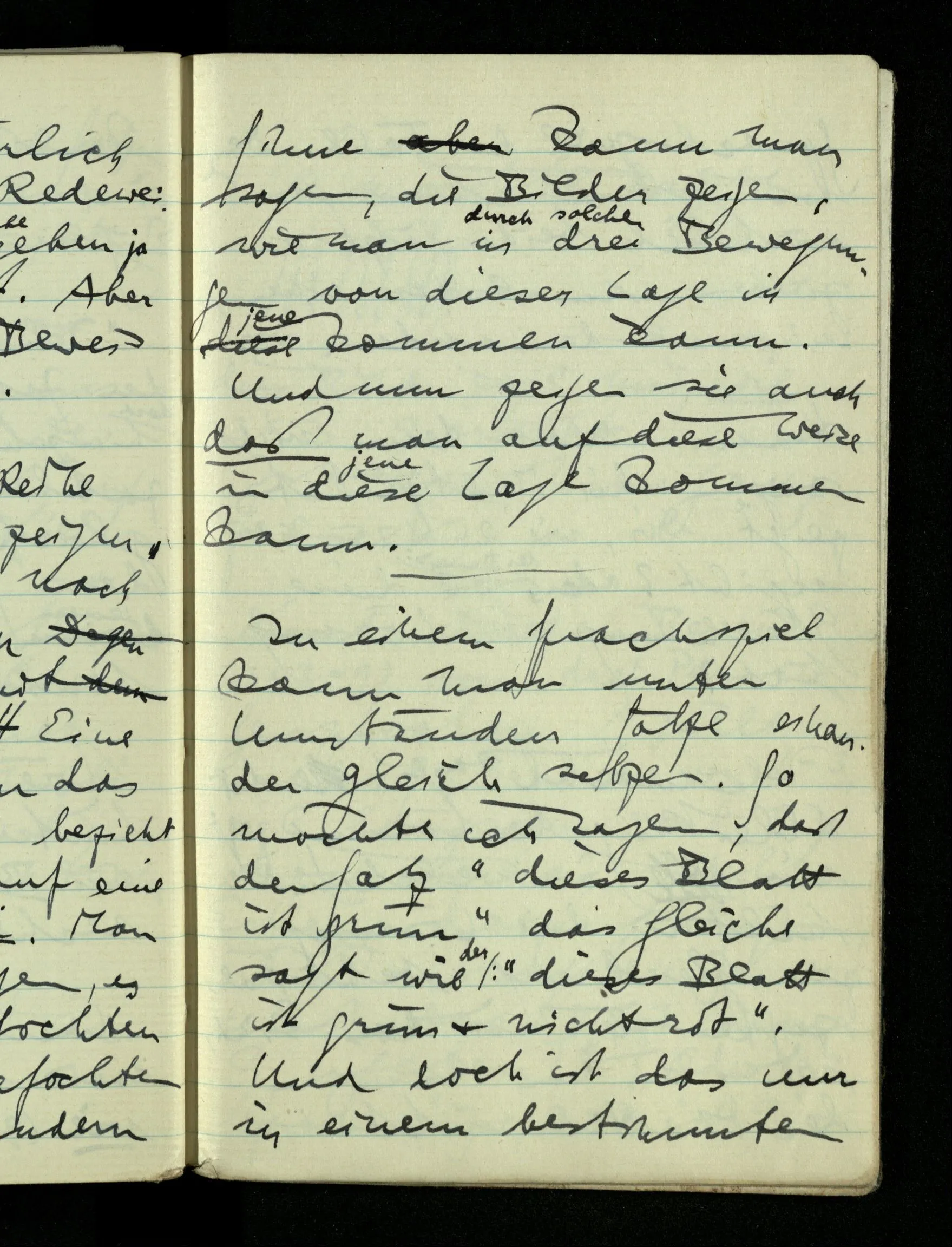 In einem Sprachspiel kann man unter Umständen Sätze einander gleich setzen. So möchte ich sagen, daß der Satz “dieses Blatt ist grün” das gleiche sagt wie der: “dieses Blatt ist grün & nicht rot”. Und doch ist das nur in einem bestimmten Sprachspiel der Fall. Denn wir gebrauchen ja wirklich beide Sätze & ziehen einmal den einen, einmal den andern vor.