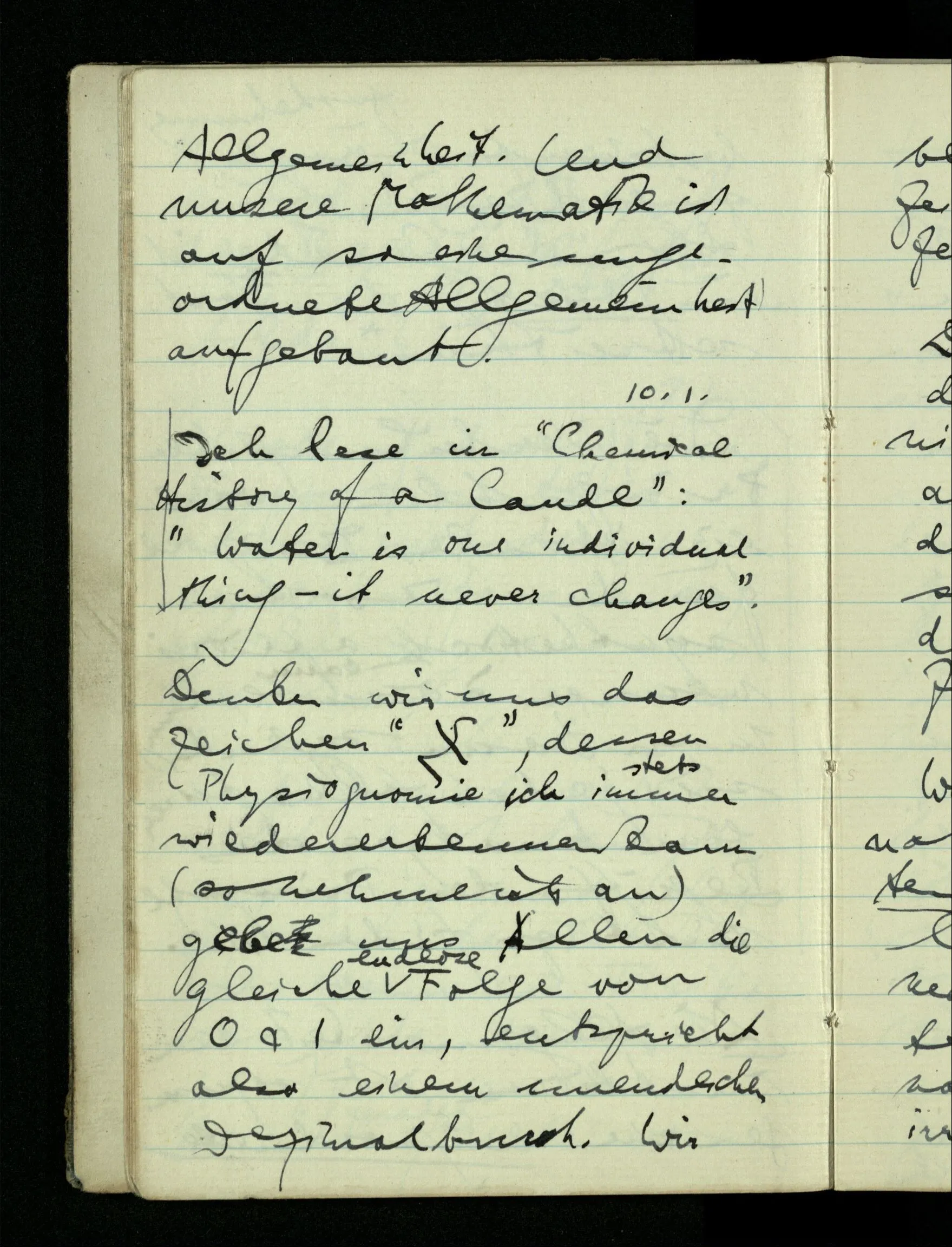 10.01.1943 Ich lese in “Chemical History of a Candle”: “Water is one individual thing – it never changes”.