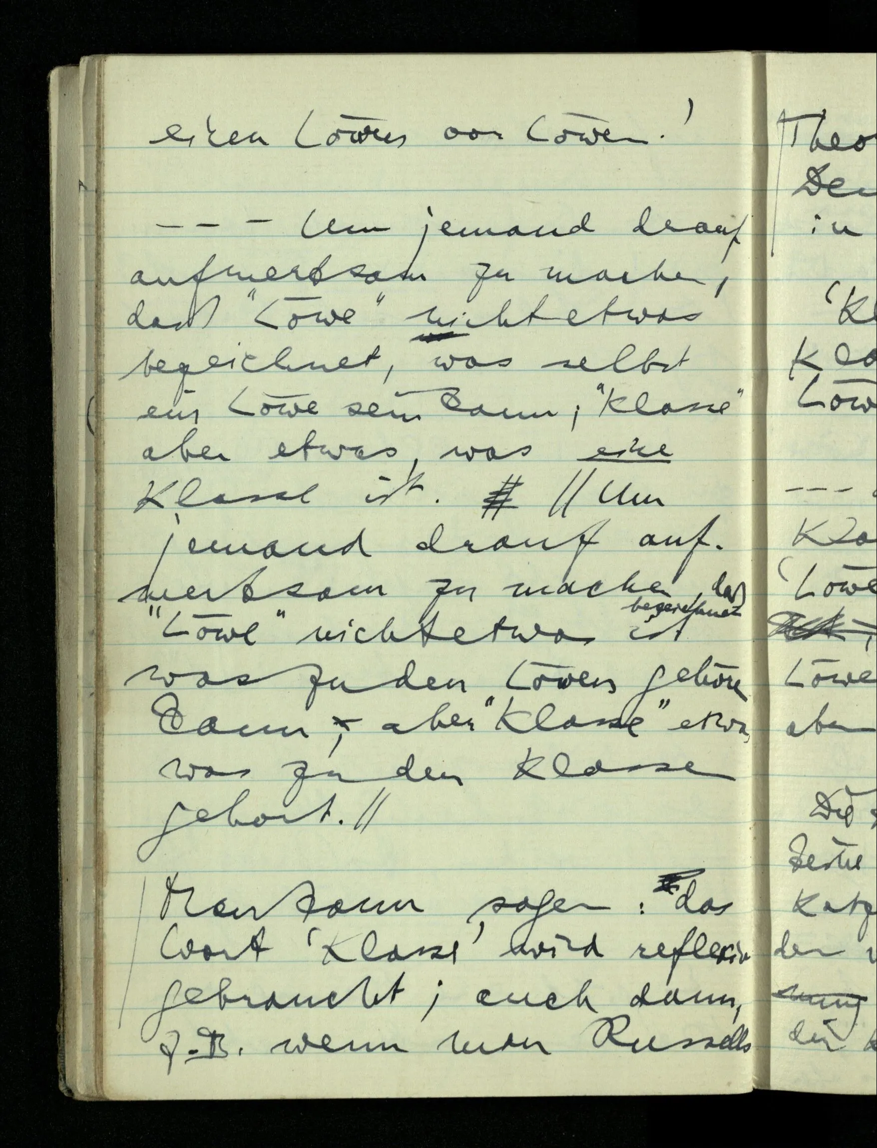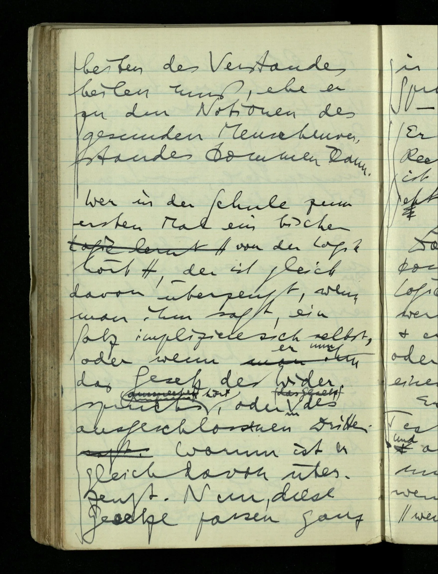 Wer in der Schule zum erstenmal ein bißchen von der Logik hört, der ist gleich davon überzeugt, wenn man ihm sagt, ein Satz impliziere sich selbst, oder wenn er nun das Gesetz des Widerspruchs aussprechen hört, oder das Gesetz des ausgeschlossenen Dritten. Warum ist er gleich davon überzeugt. Nun, diese Gesetze passen ganz in den Gebrauch der Sprache, den er ja beherrscht. – – –