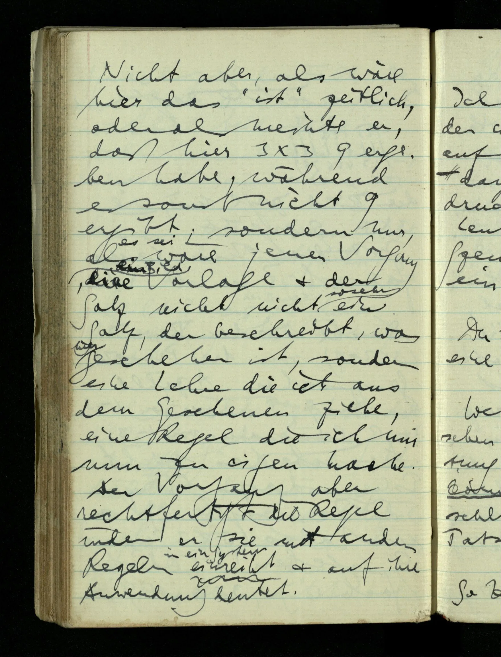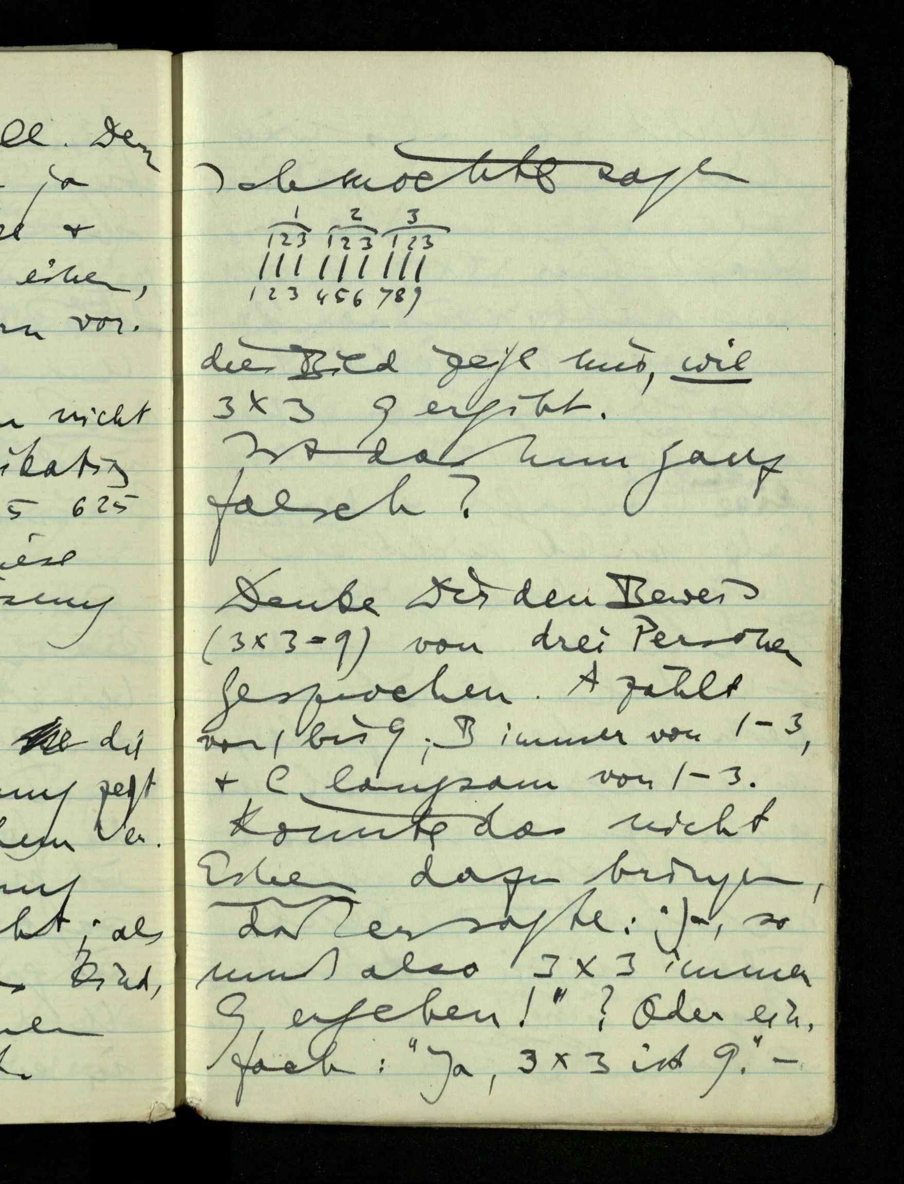 Denke Dir den Beweis (3 × 3 = 9) von drei Personen gesprochen. A zählt von 1 bis 9; B immer von 1 – 3, und C langsam von 1 – 3. Könnte das nicht Einen dazu bringen, daß er sagte: “Ja, so muß also 3 × 3 immer 9 ergeben!”? Oder einfach: “Ja, 3 × 3 ist 9.” – Nicht aber, als wäre hier das “ist” zeitlich, oder als meinte er, daß hier 3 × 3 9 ergeben habe, während es sonst nicht 9 ergibt; sondern nur, als wäre jener Vorgang ein Bild, eine Vorlage & der Satz nicht so sehr ein Satz, der beschreibt, was hier geschehen ist, sondern eine Lehre die ich aus dem Gesehenen ziehe, eine Regel die ich mir zu eigen mache. Der Vorgang aber rechtfertigt die Regel indem er sie mit andern Regeln in ein System einreiht & auf ihre Anwendung deutet.