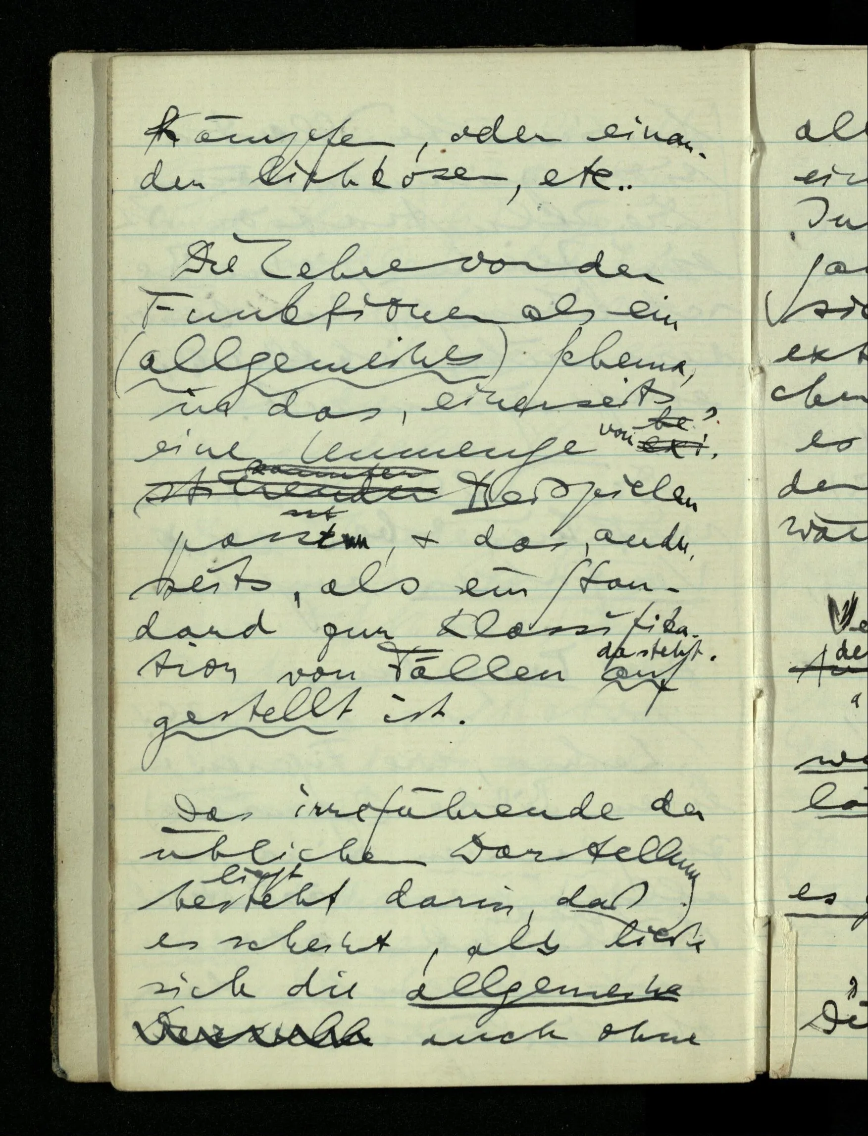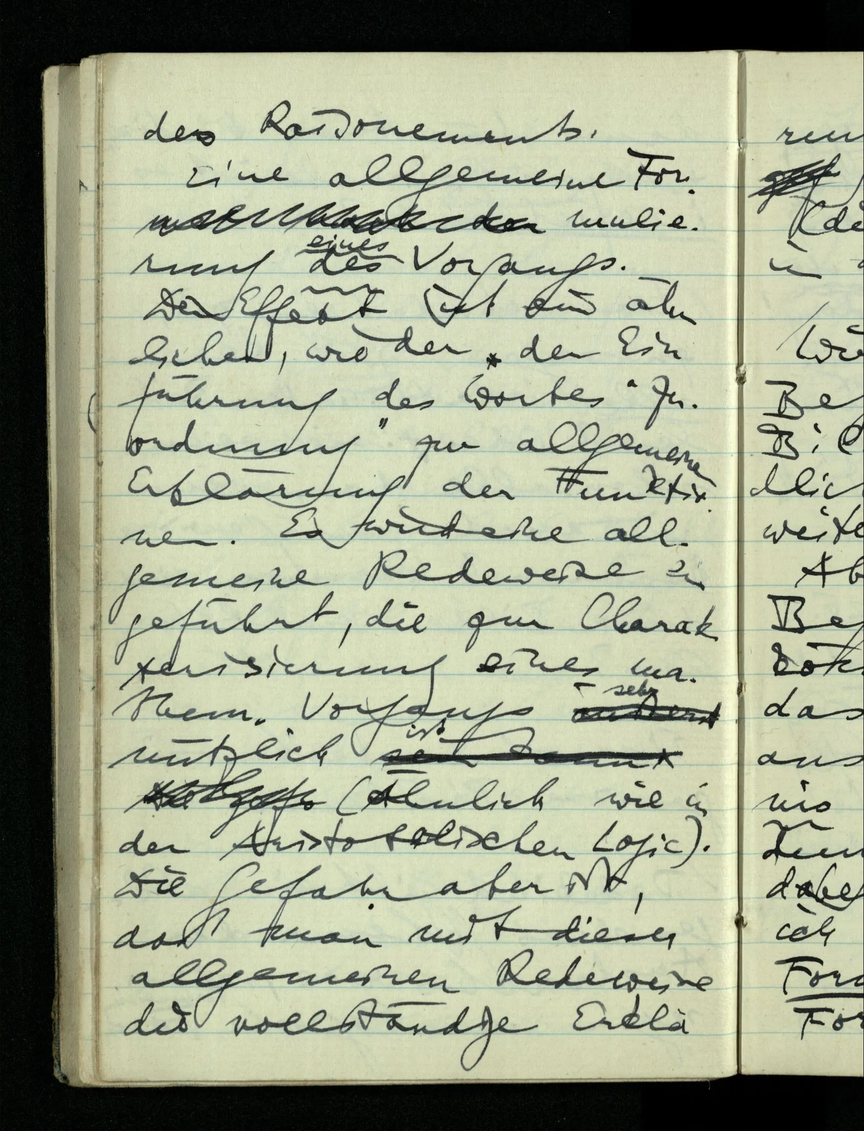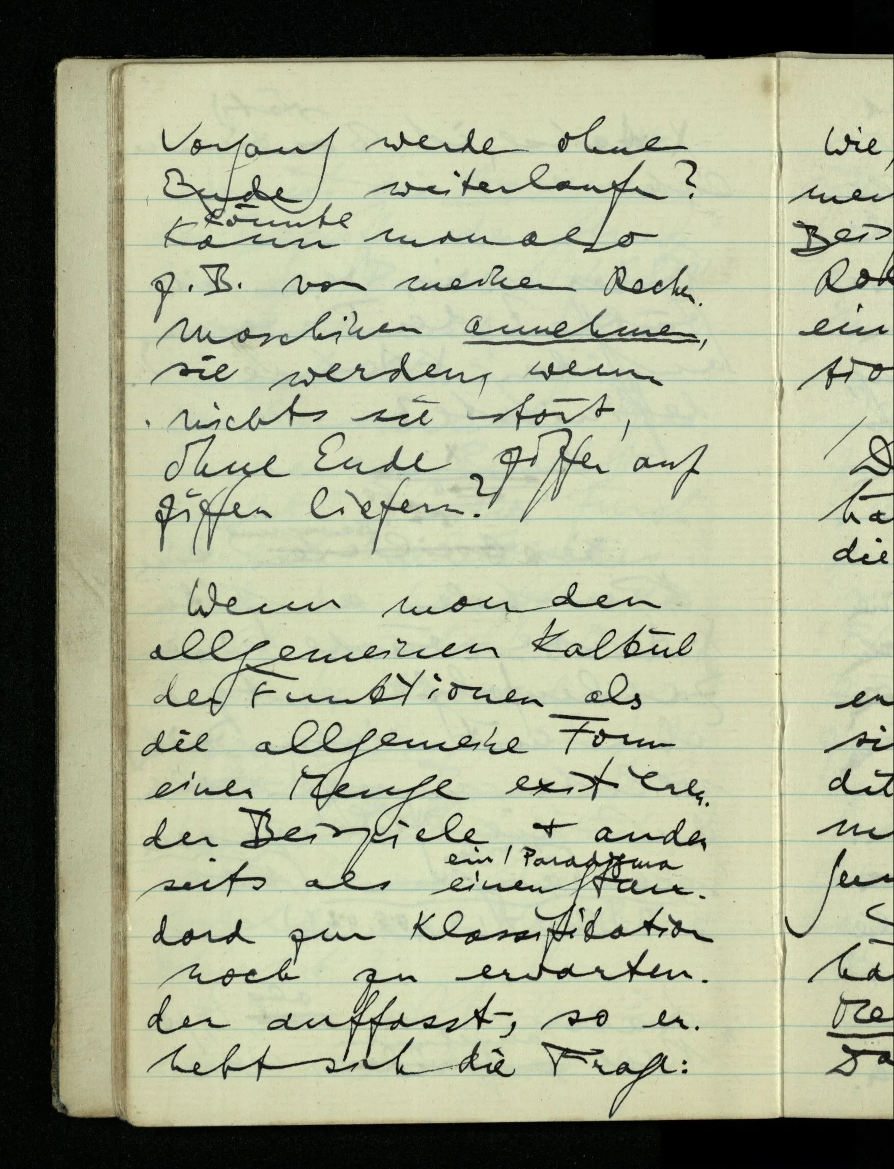 In den allgemeinen intensionalen Sätzen von den Funktionen wird einerseits eine Technik des Rechnens festgehalten, die man dann auf ein gegebenes Beispiel anwenden kann; anderseits eine Teilung des Materials bewirkt in solches was sich mit dieser Formel behandeln läßt & solches was so nicht zu behandeln ist.